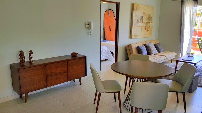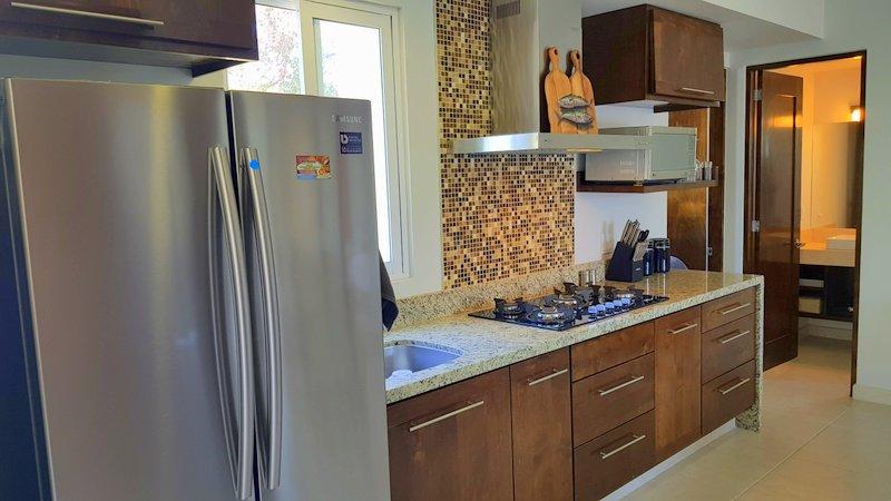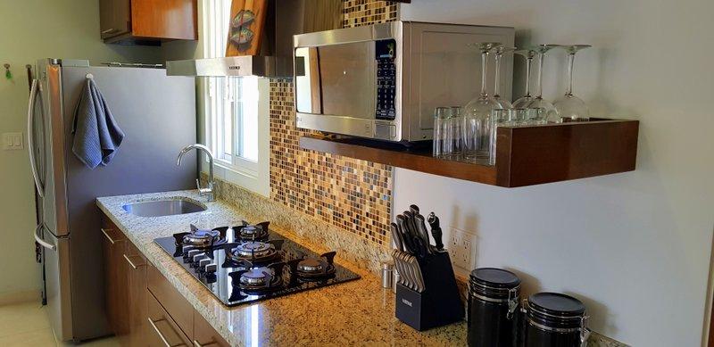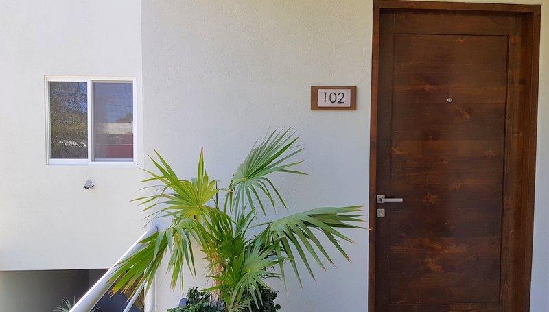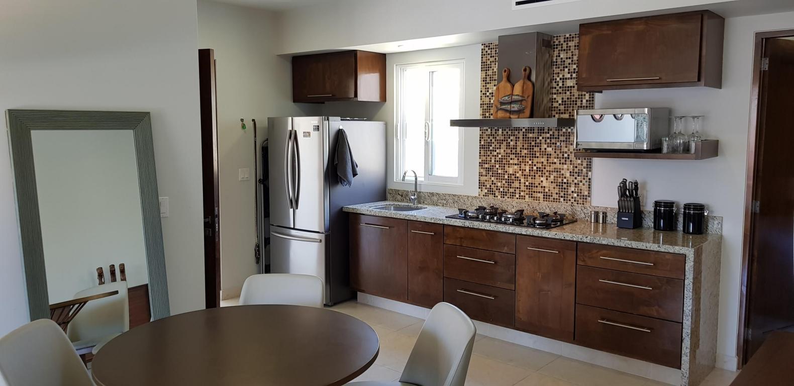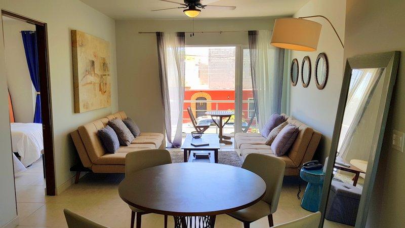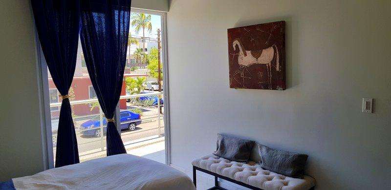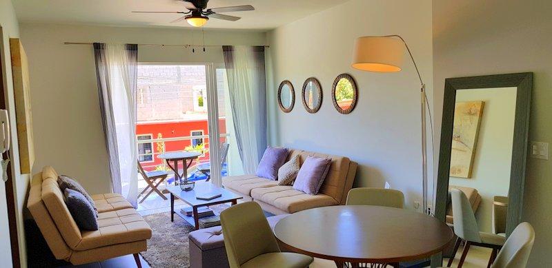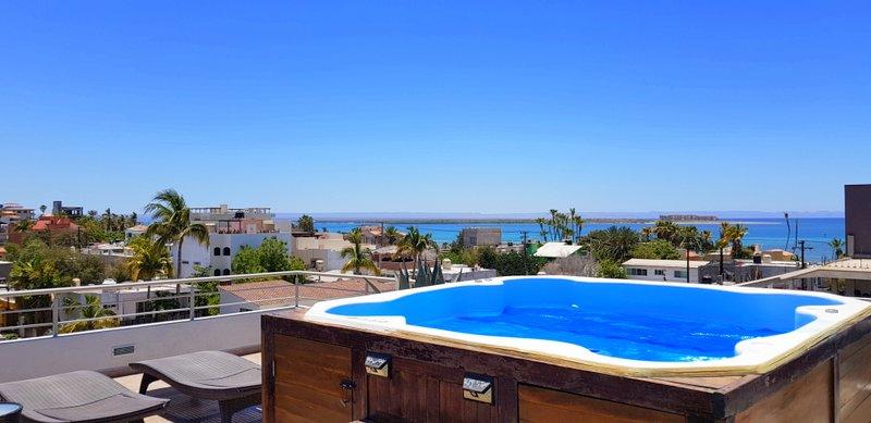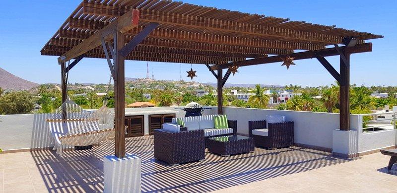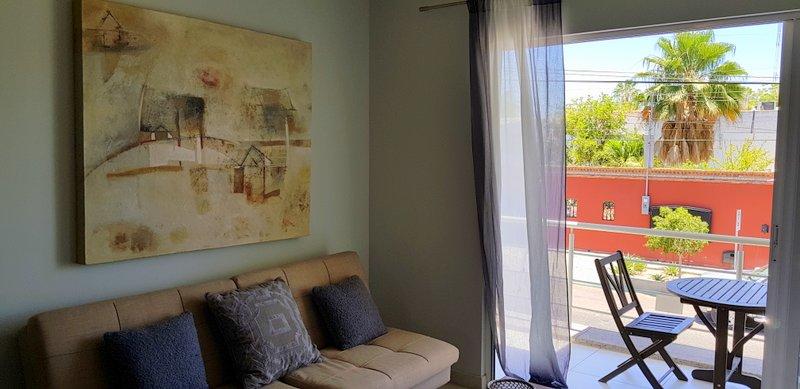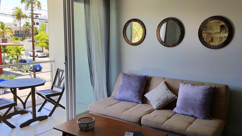 Fabulous brand new listing. A 2 bedroom 1 bathromm condominium unit just steps from La Paz malecon (boardwalk by the ocean) and its wonderful lifestyle. Well appointed, furnished, TURN KEY, decorated in neutral colors to easily make it your own and start making money renting it on a long or short term basis. It has a water pump for excellent pressure and a gas stove. There is 1 car parking space exclusively for this unit. The building is only 2 years old and it has a unique common roof top terrace offering stunning 360 degree views of the city and ocean. The area offers an outdoor living room under a shaded area, a hamac and lounge chairs. A jacuzzi to enjoy the cool nights and a bar and bbq area. It has it all.