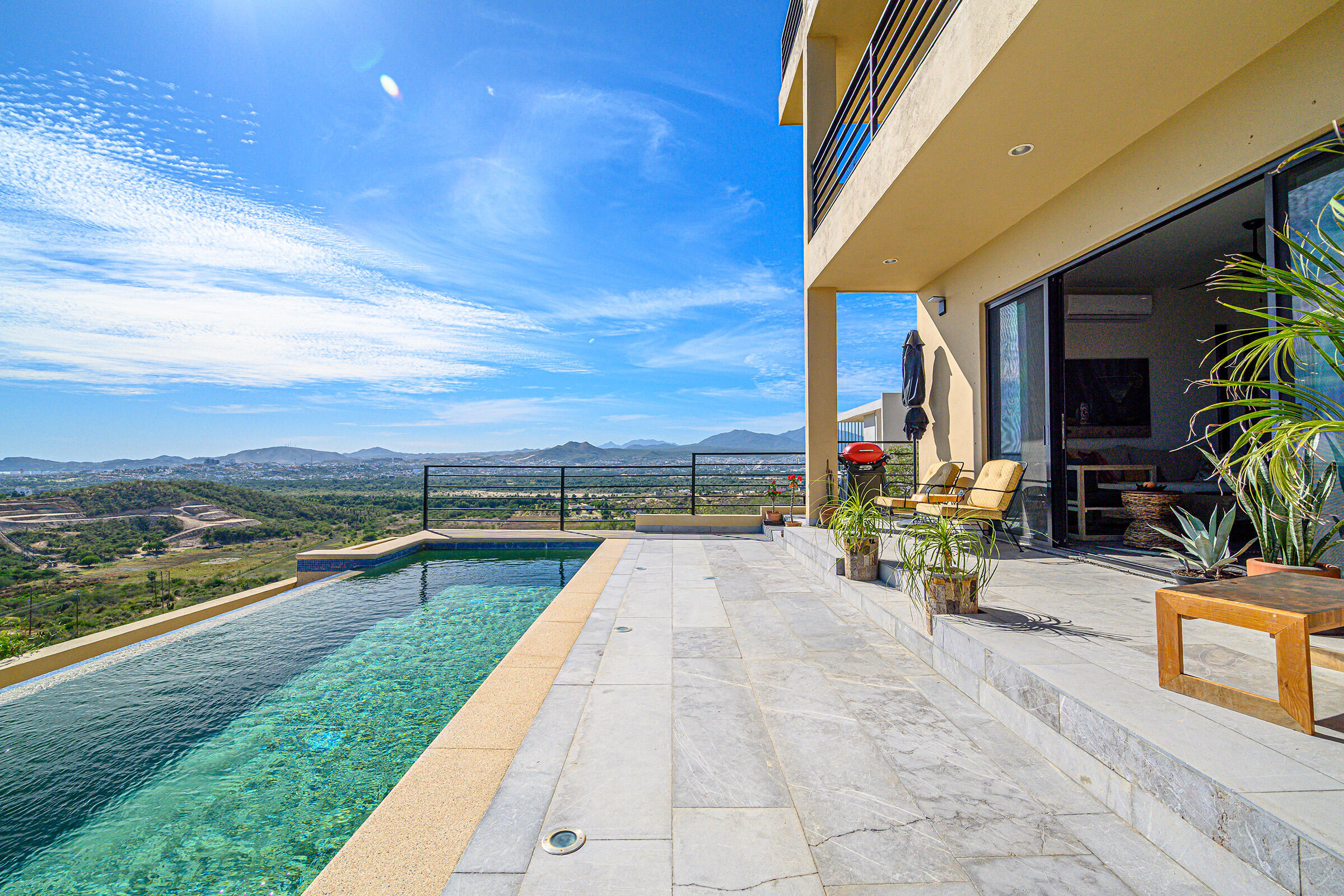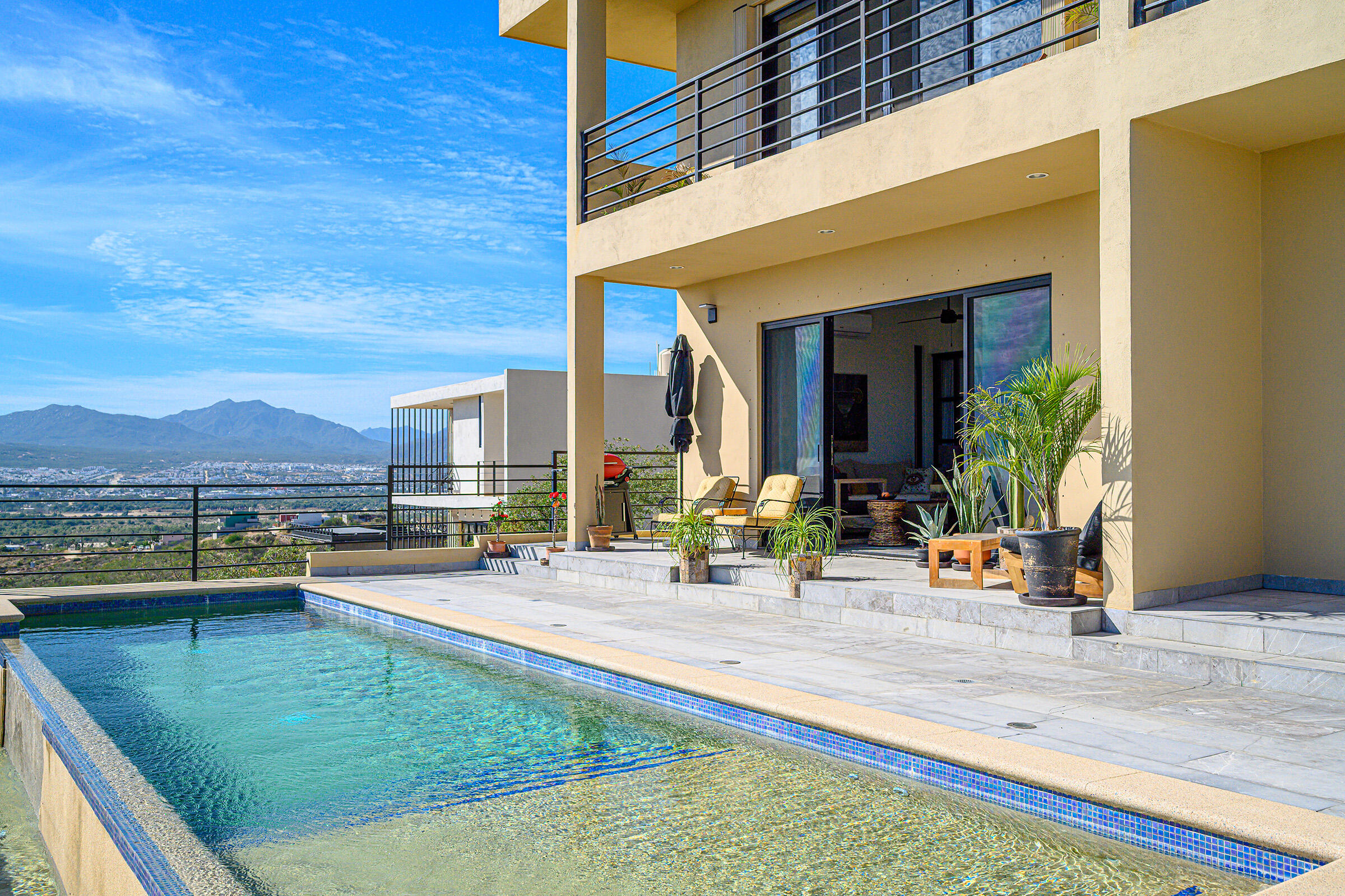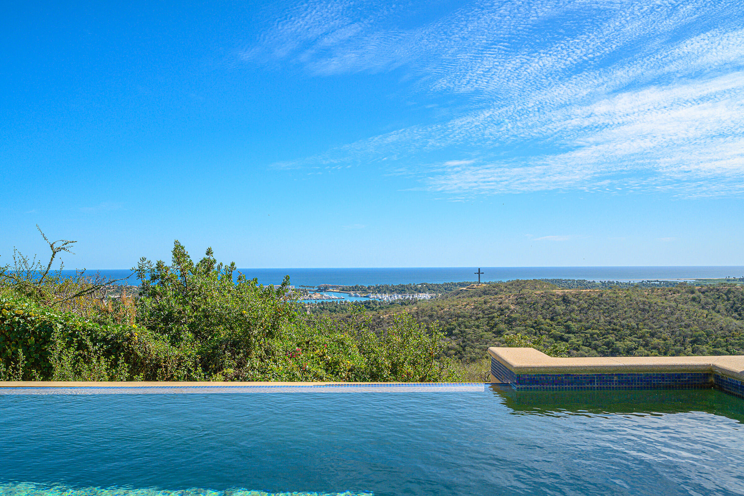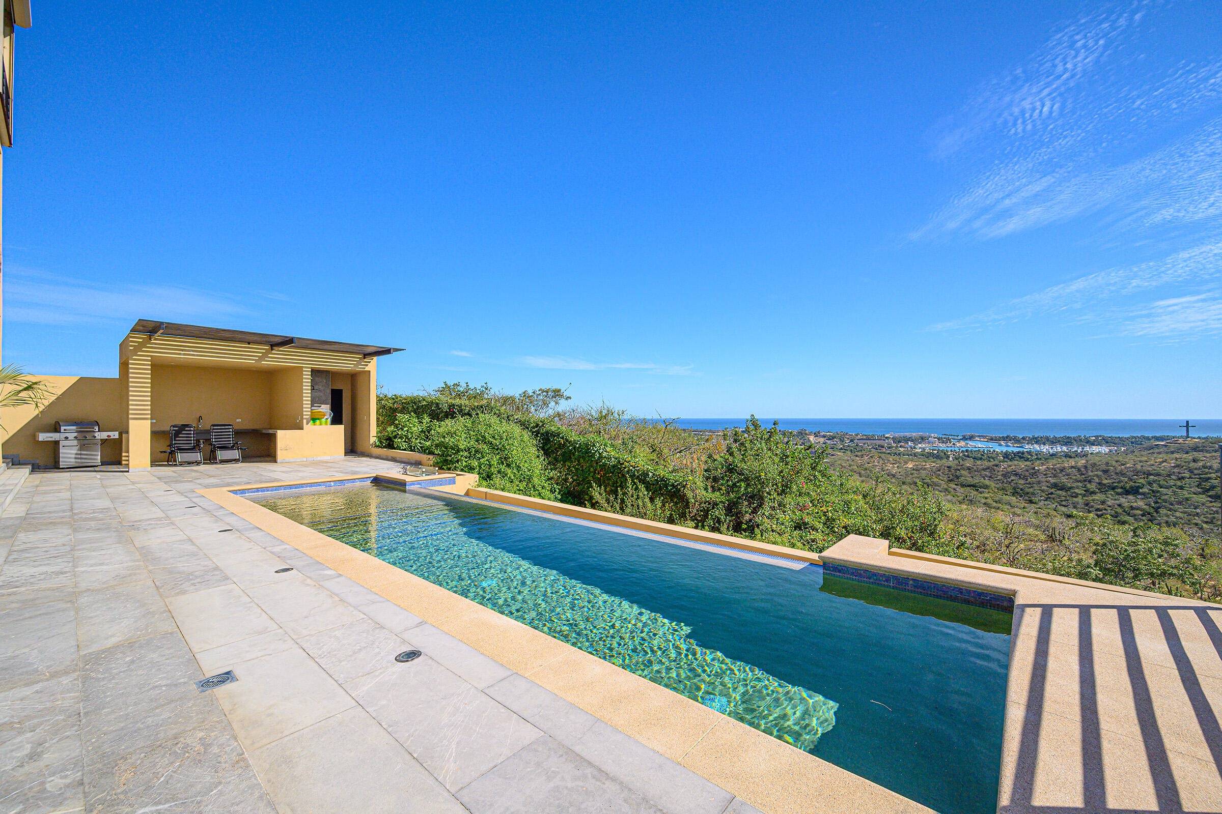 Perched on a hilltop in Las Animas, this ground-floor condo offers expansive views over the Sea of Cortez, the San Jose del Cabo marina, Puerto Los Cabos, downtown, and surrounding mountain terrain. Every room enjoys a view, creating a strong sense of openness and connection to the landscape.The condo features three bedrooms and two and a half bathrooms. Two guest bedrooms share a Jack-and-Jill bathroom and overlook downtown San Jose, where the city lights create a striking nighttime backdrop. The primary bedroom includes generous built-in cabinetry and sweeping views toward the marina and ocean. The open-concept kitchen and living area is bright and airy, with views of the marina and the pool just beyond.