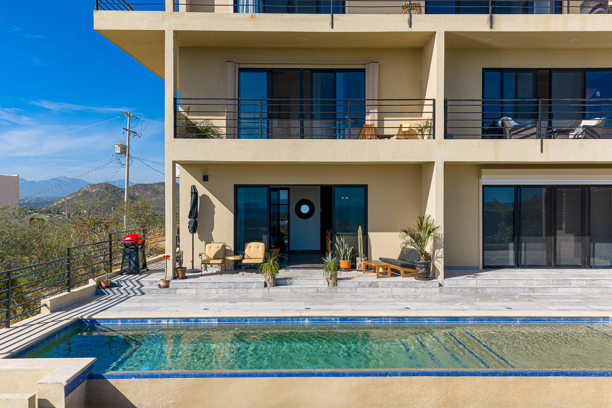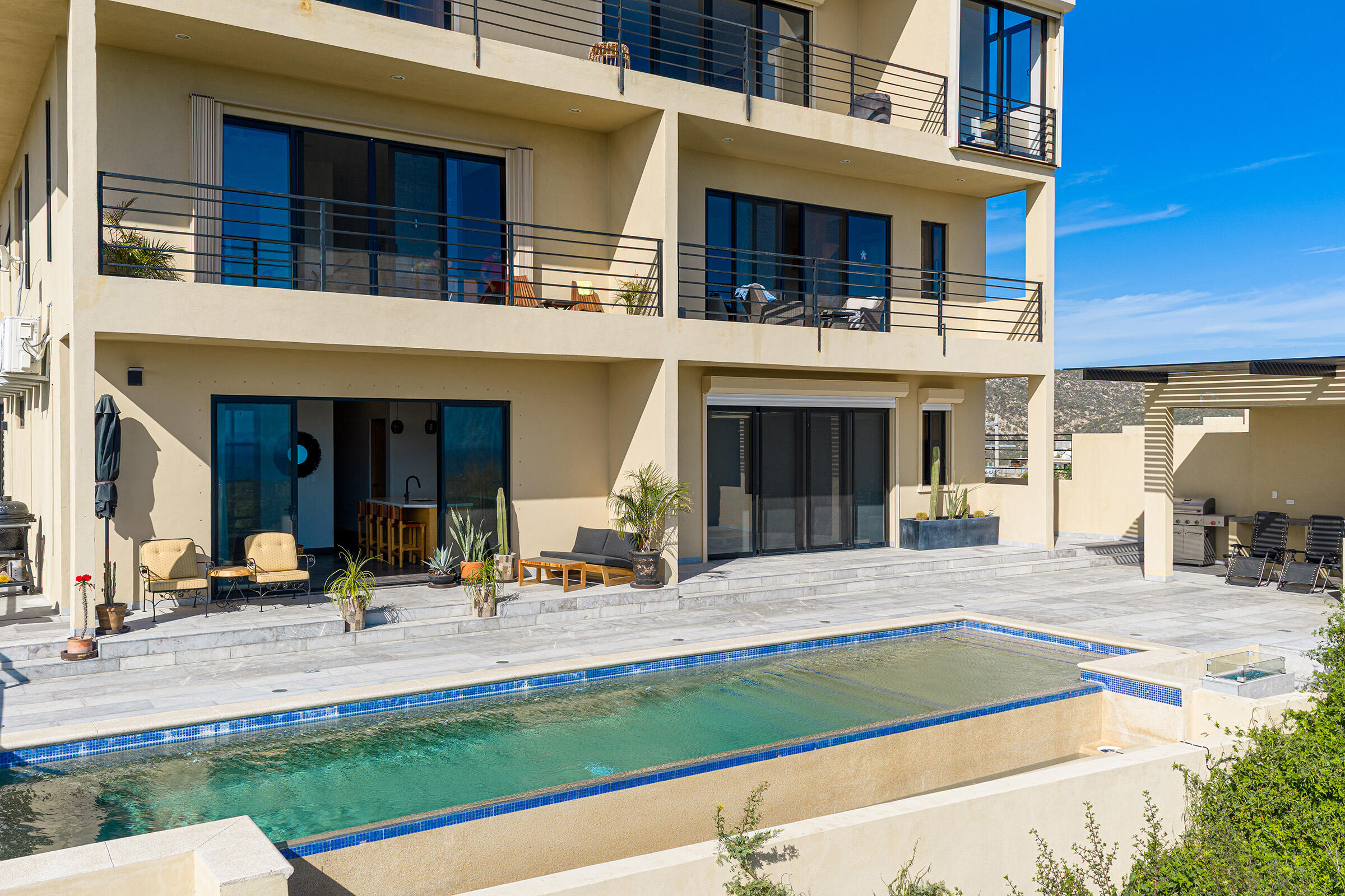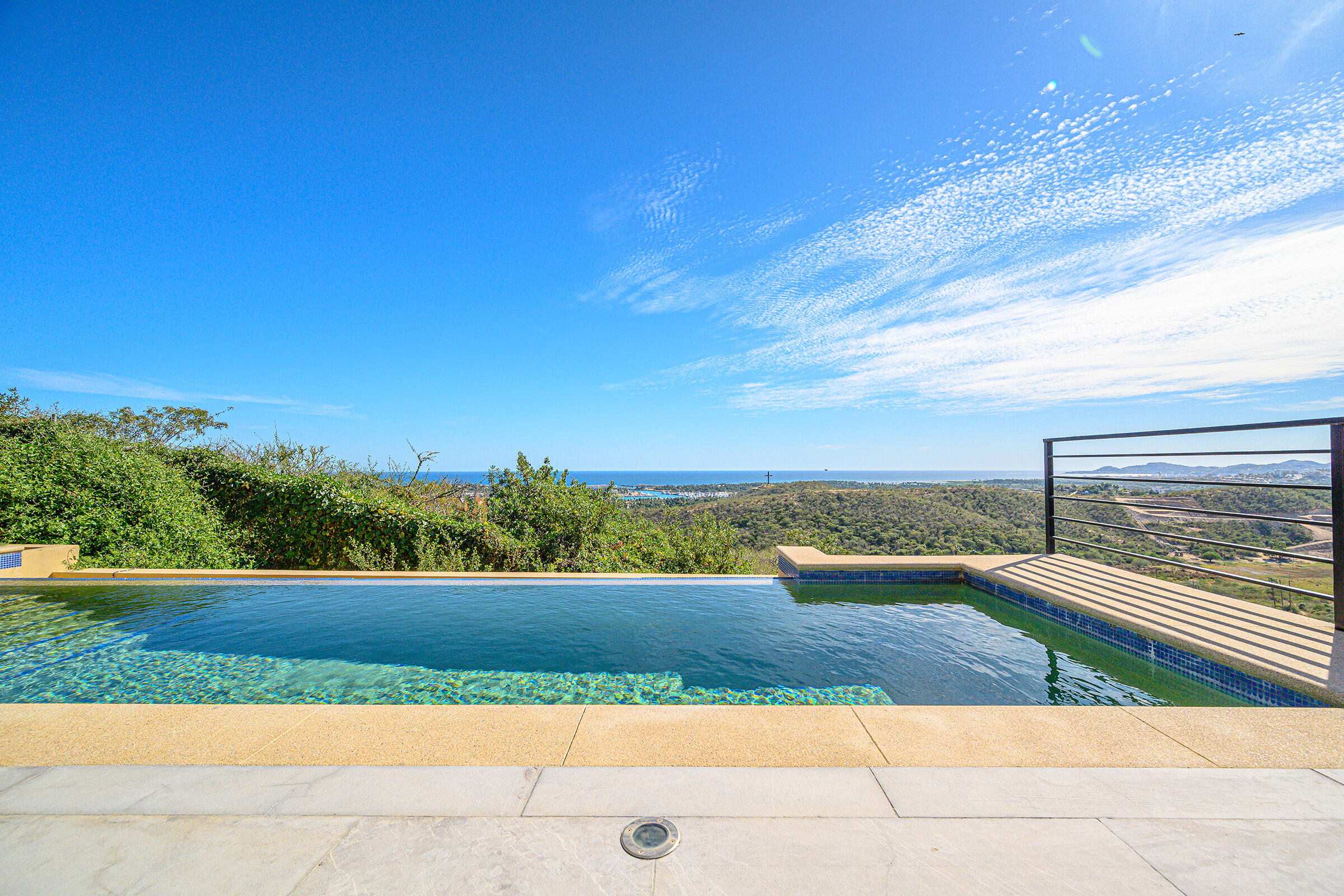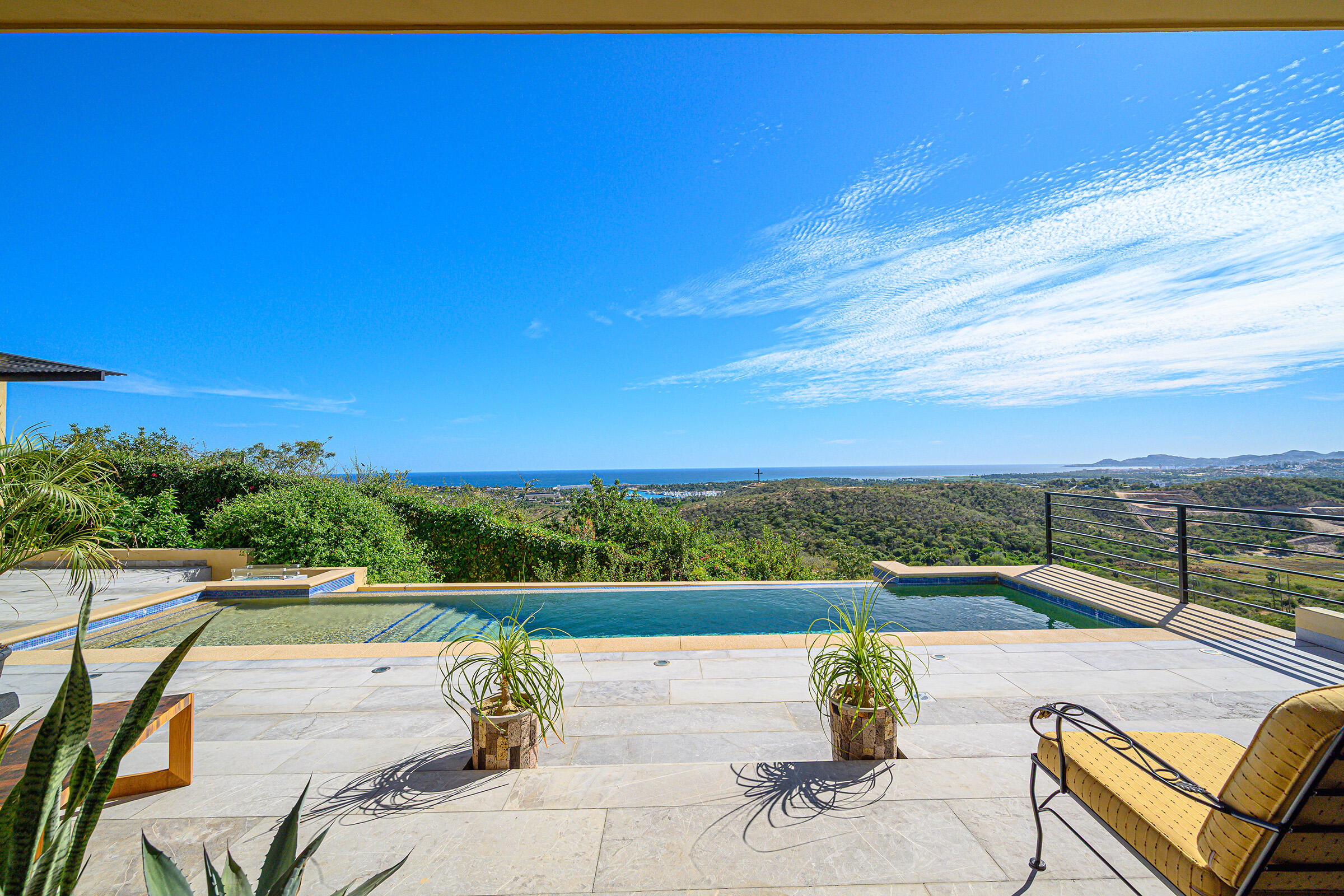 Perched on a hilltop in Las Animas, this ground-floor condo offers expansive views over the Sea of Cortez, the San Jose del Cabo marina, Puerto Los Cabos, downtown, and surrounding mountain terrain. Every room enjoys a view, creating a strong sense of openness and connection to the landscape.The condo features three bedrooms and two and a half bathrooms. Two guest bedrooms share a Jack-and-Jill bathroom and overlook downtown San Jose, where the city lights create a striking nighttime backdrop. The primary bedroom includes generous built-in cabinetry and sweeping views toward the marina and ocean. The open-concept kitchen and living area is bright and airy, with views of the marina and the pool just beyond.