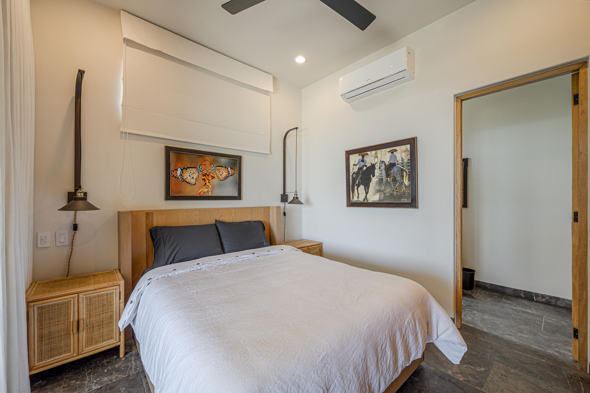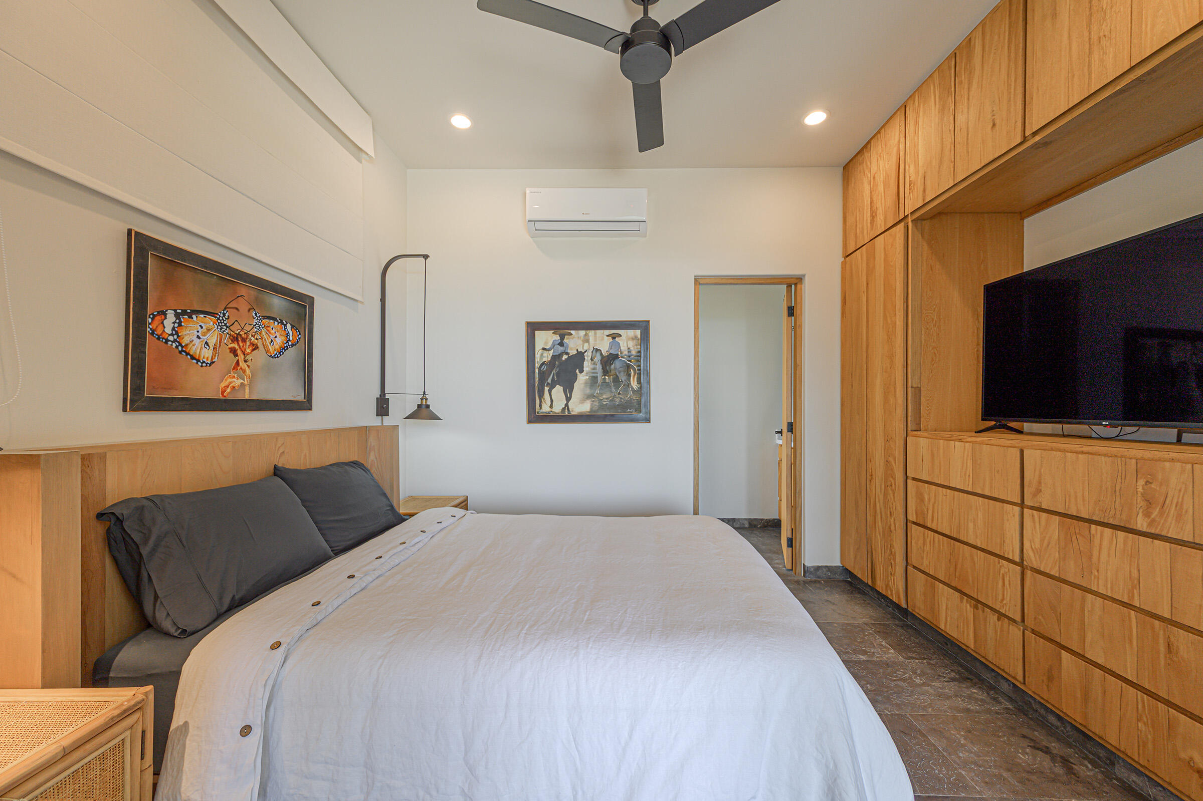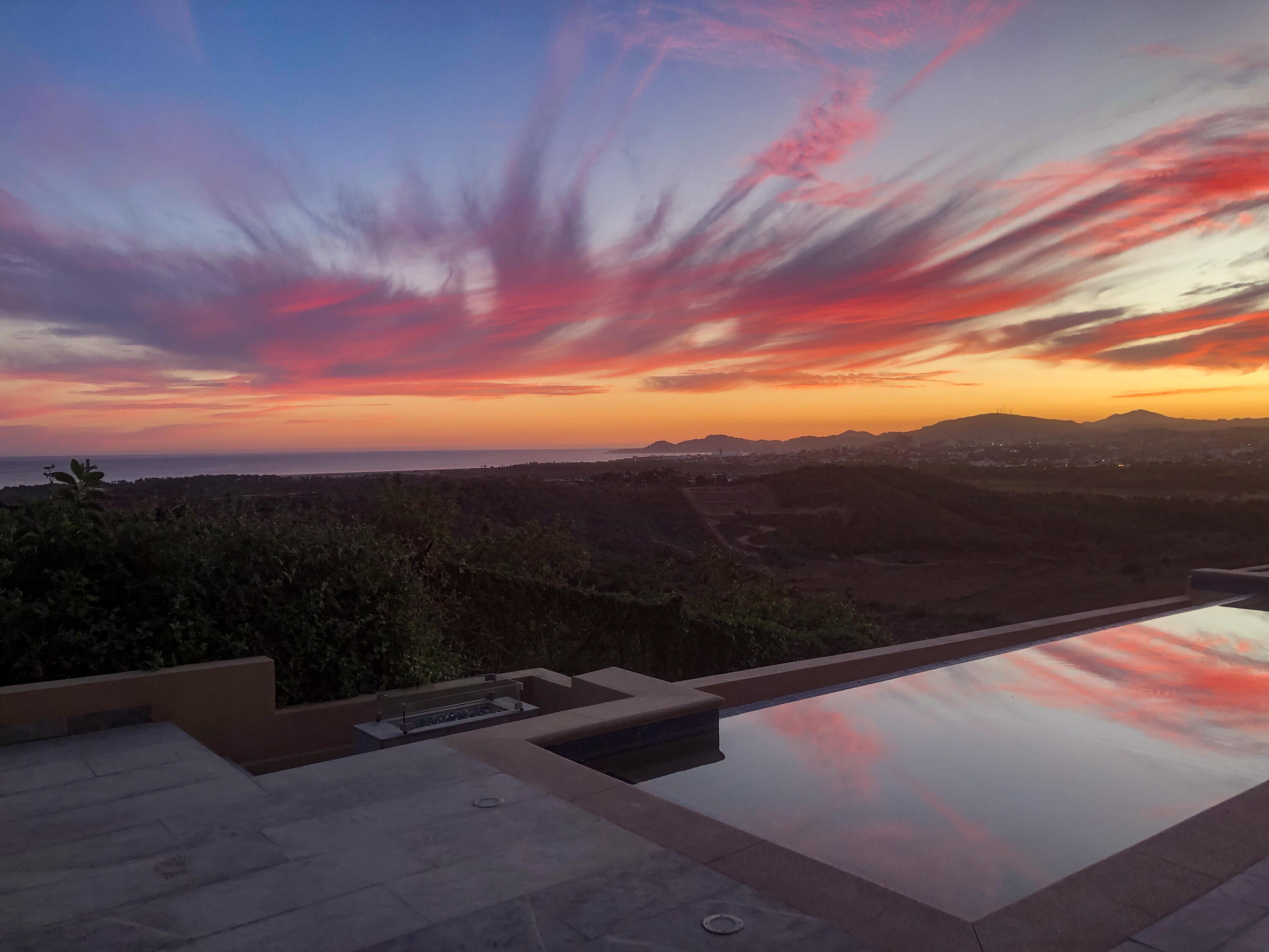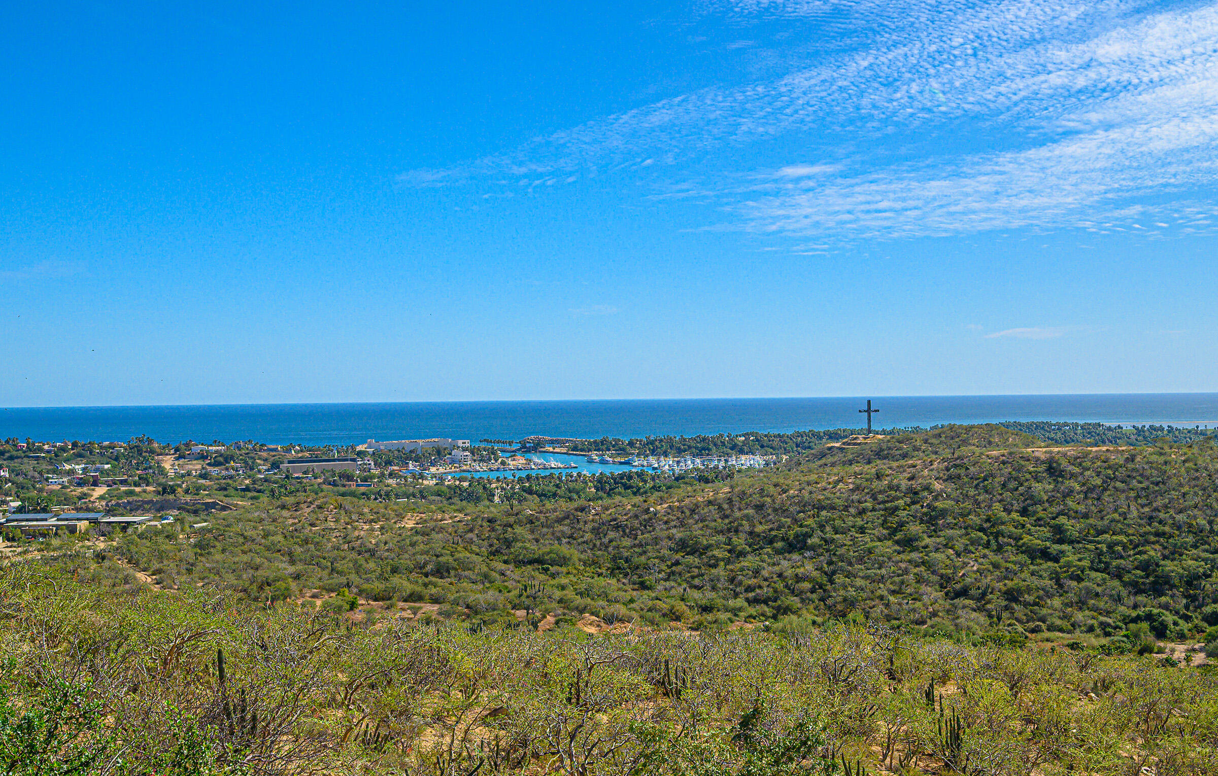 Perched on a hilltop in Las Animas, this ground-floor condo offers expansive views over the Sea of Cortez, the San Jose del Cabo marina, Puerto Los Cabos, downtown, and surrounding mountain terrain. Every room enjoys a view, creating a strong sense of openness and connection to the landscape.The condo features three bedrooms and two and a half bathrooms. Two guest bedrooms share a Jack-and-Jill bathroom and overlook downtown San Jose, where the city lights create a striking nighttime backdrop. The primary bedroom includes generous built-in cabinetry and sweeping views toward the marina and ocean. The open-concept kitchen and living area is bright and airy, with views of the marina and the pool just beyond.