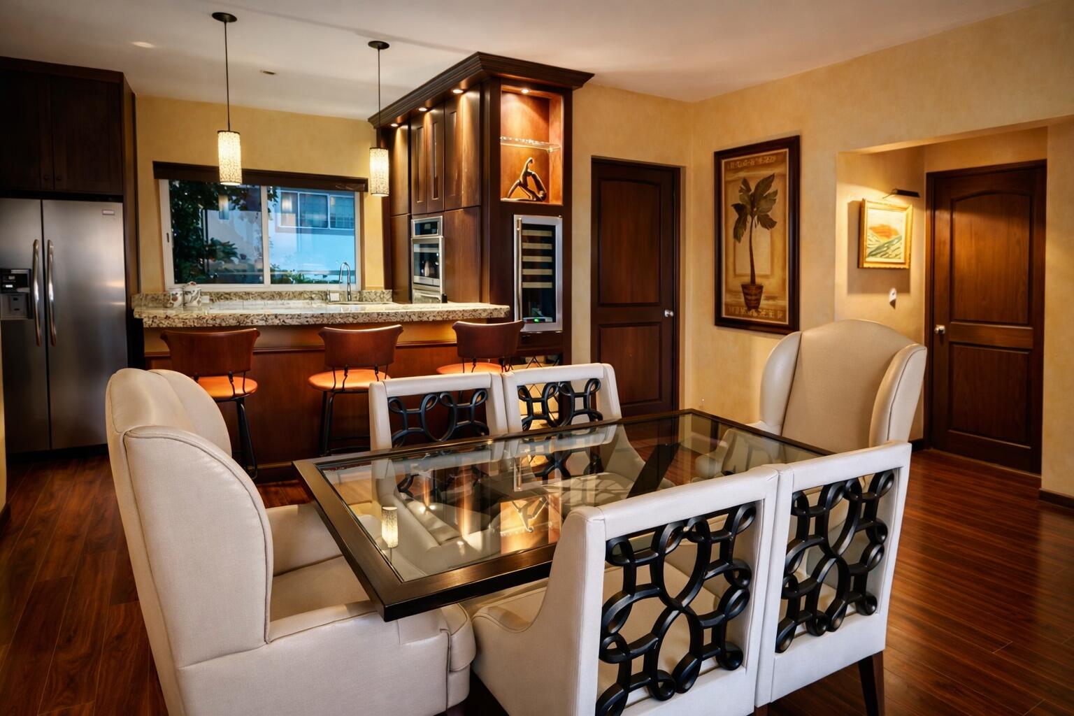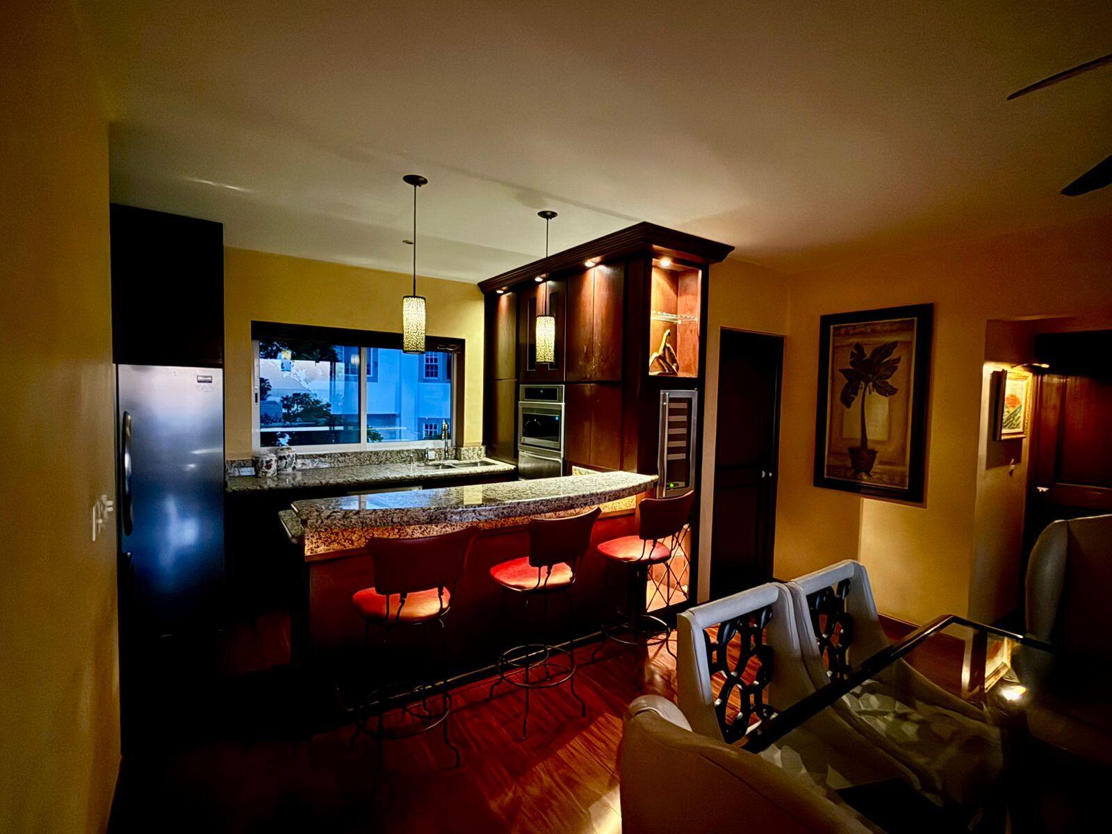 Elegant 3-Bedroom Retreat in Exclusive Puerta de HierroThis beautifully appointed 3-bedroom, 2-bath residence in Puerta de Hierro offers timeless luxury with thoughtful details throughout. Originally remodeled with high-quality craftsmanship, the home features rich, dark wood floors and custom cabinetry in every room–creating a warm, refined contrast to the abundant natural Cabo sunlight that fills the space all day long.The gourmet kitchen is designed for both style and convenience, complete with a built-in bread-warming drawer, a sleek wall-integrated wine cooler, and generous storage. Subtle evening lighting, including strategically placed nightlights and architectural accents, creates an inviting ambiance the moment the sun sets.