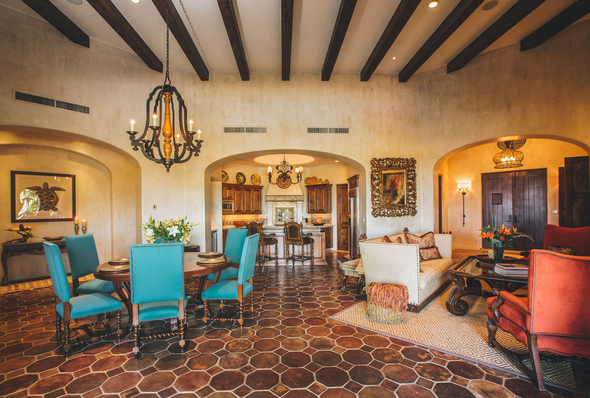 This single-story Mexican-style entrada in Villas Del Mar in Los Cabos is impeccably designed, both inside and out. Enter through a lushly landscaped courtyard and find yourself in a richly designed and decorated great room. Flanking the great room is the gourmet kitchen, formal dining area and the lush and private outdoor space. Designed to seamlessly flow from inside to out, the terrace features a separate dining area, infinity edge pool and spa, cooking area and more. Entrada 69 is one of the few entradas that features an ocean view. This four bedroom, 4.5 bath home also features a media room and multiple wine cavas. With too many extras to list, Entrada 69 is a must see.Club 96 and Espiritu membership included in the sale subject to the club’s acceptance