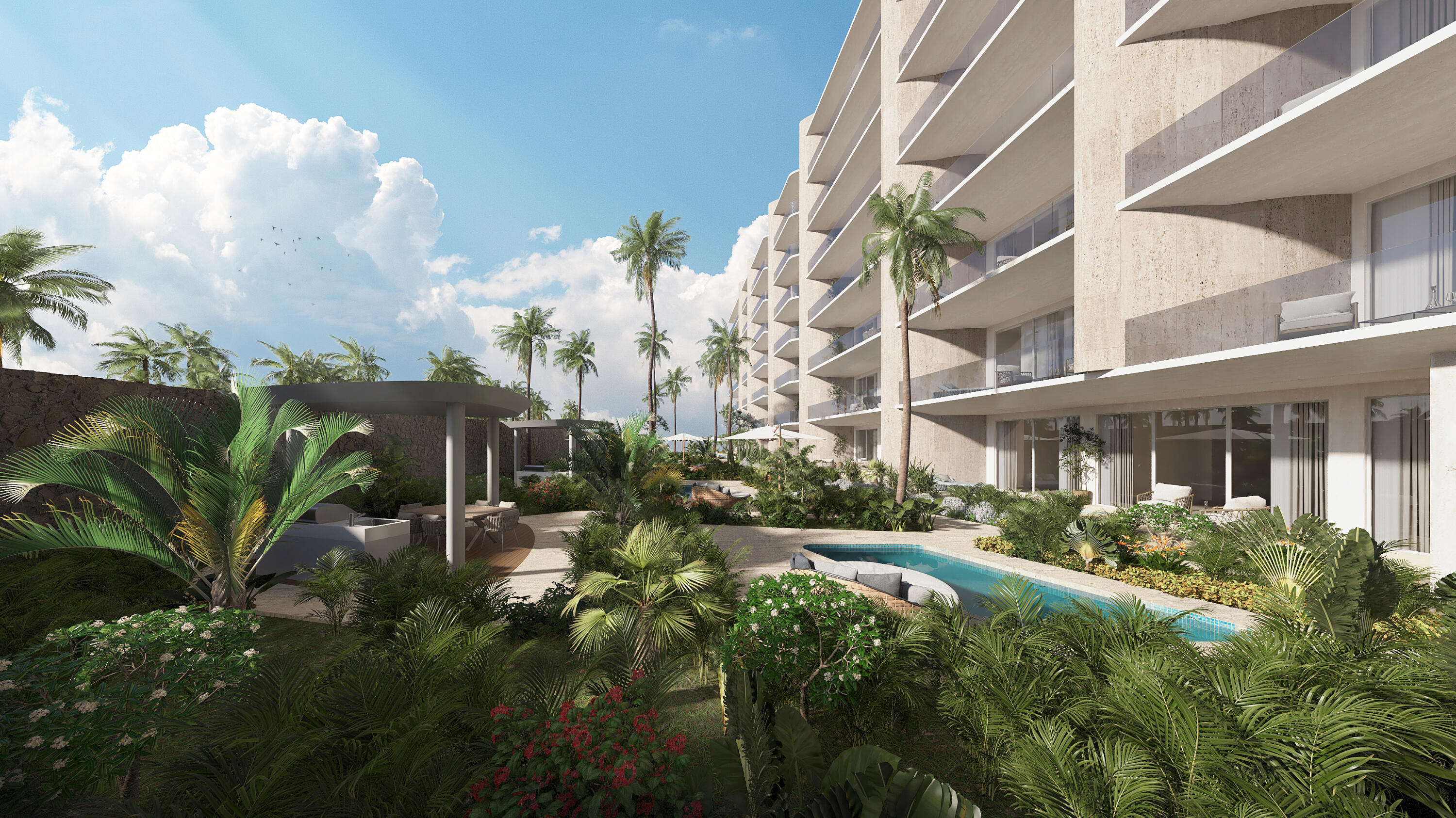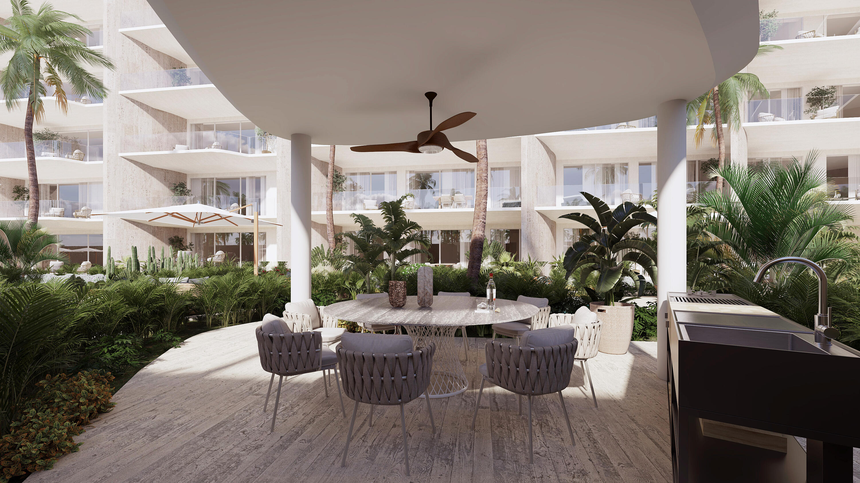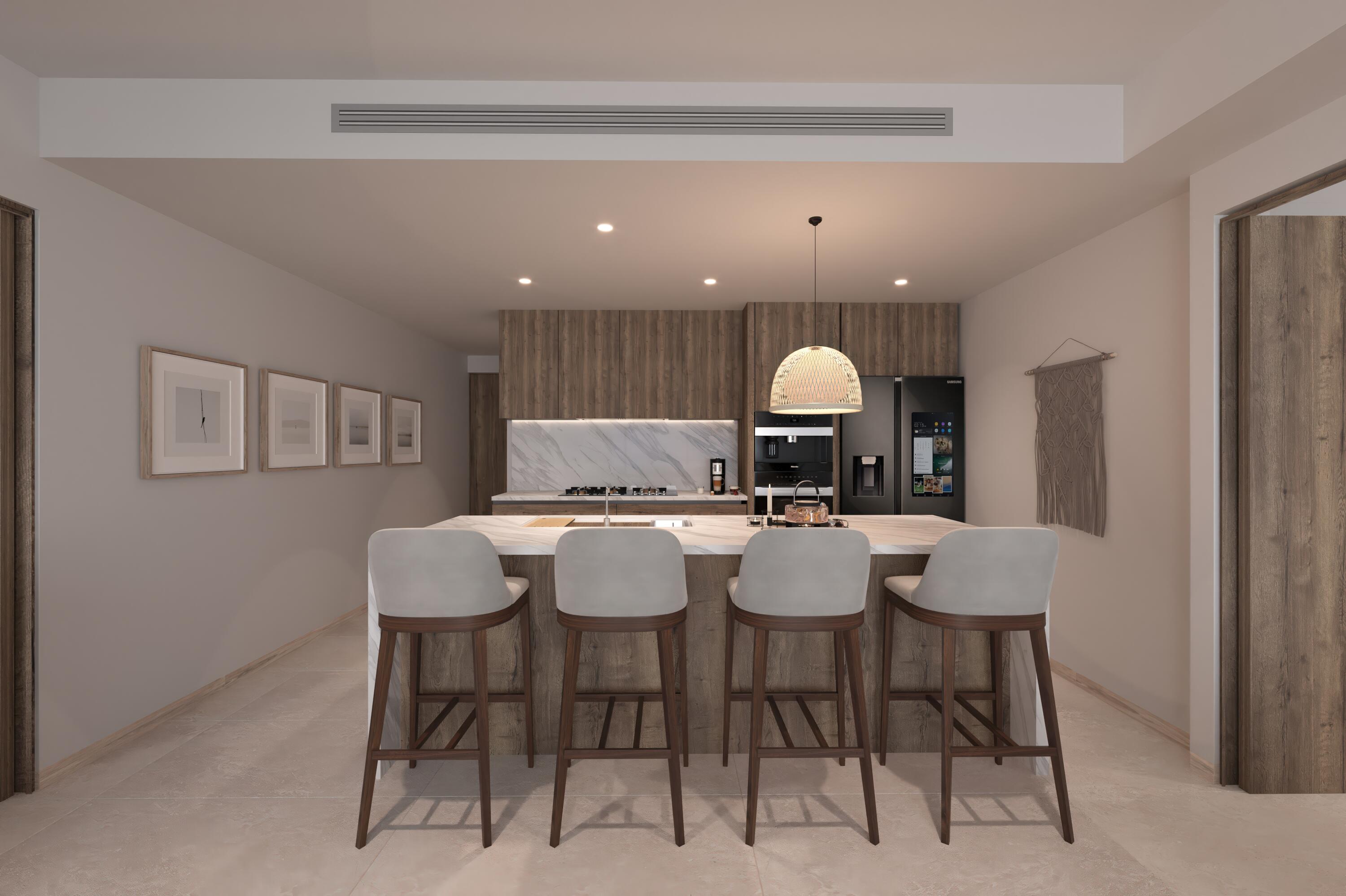 This is the smallest residence in the entire development, designed to offer an exceptional opportunity to own a two-bedroom home within 100 m (1,071 sqft) of interior space, plus a terrace, one parking space, and a small storage unit. It represents the best entry-level price–the most affordable option to acquire a new, modern, beachfront property.