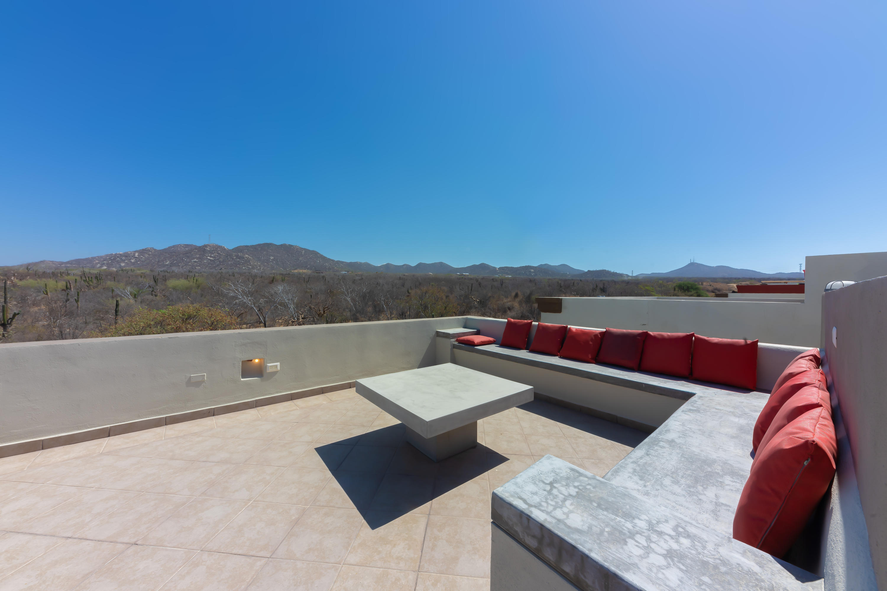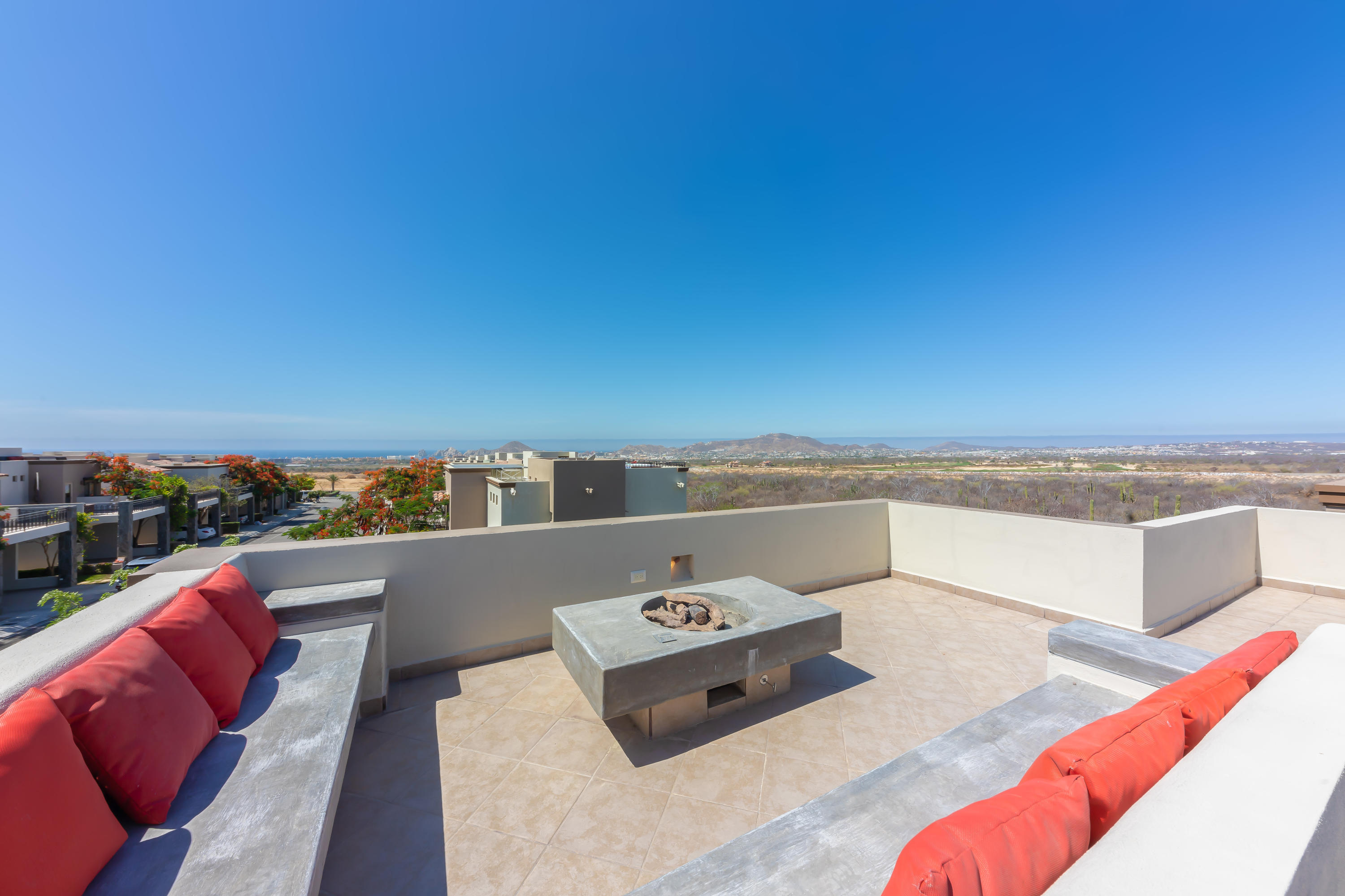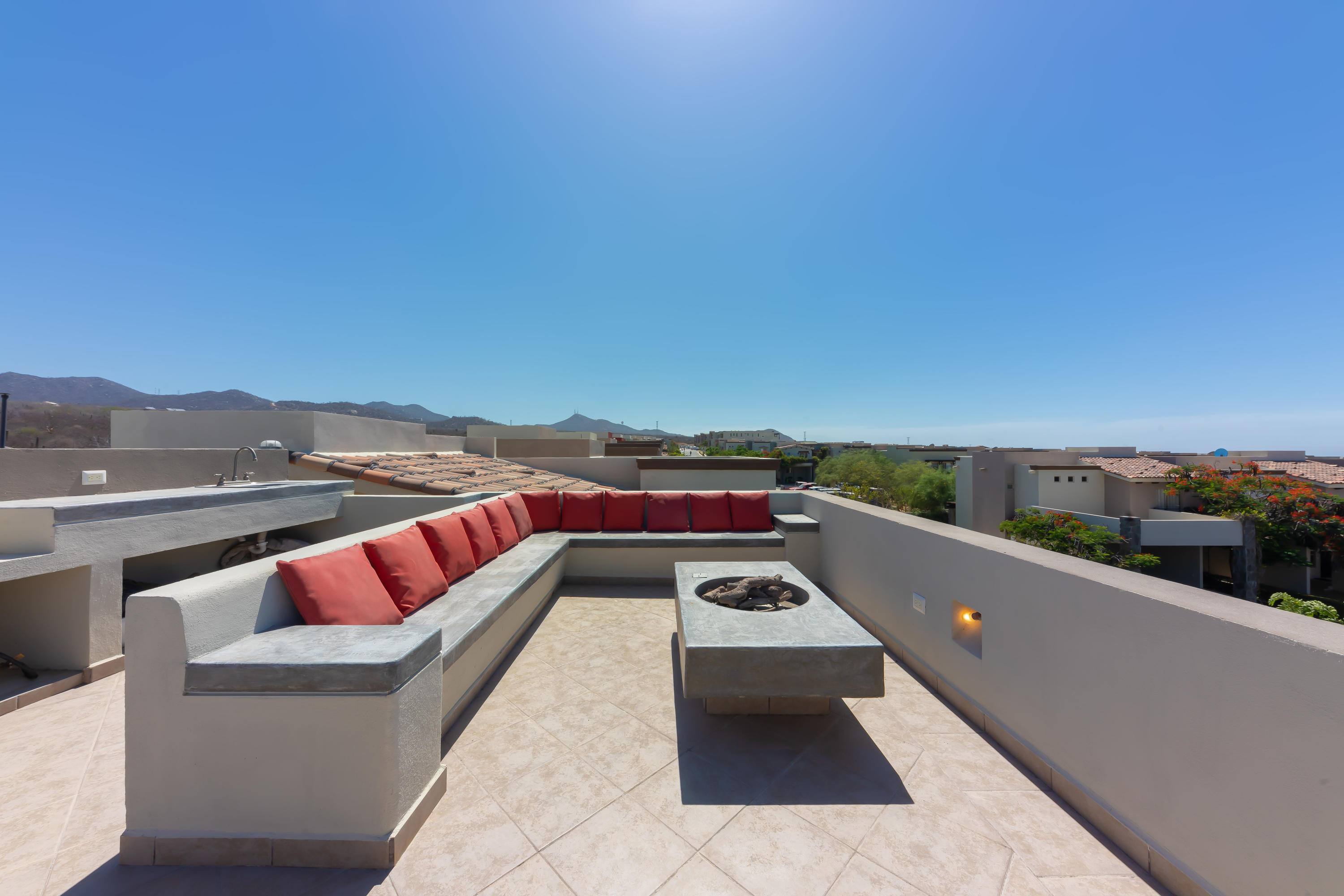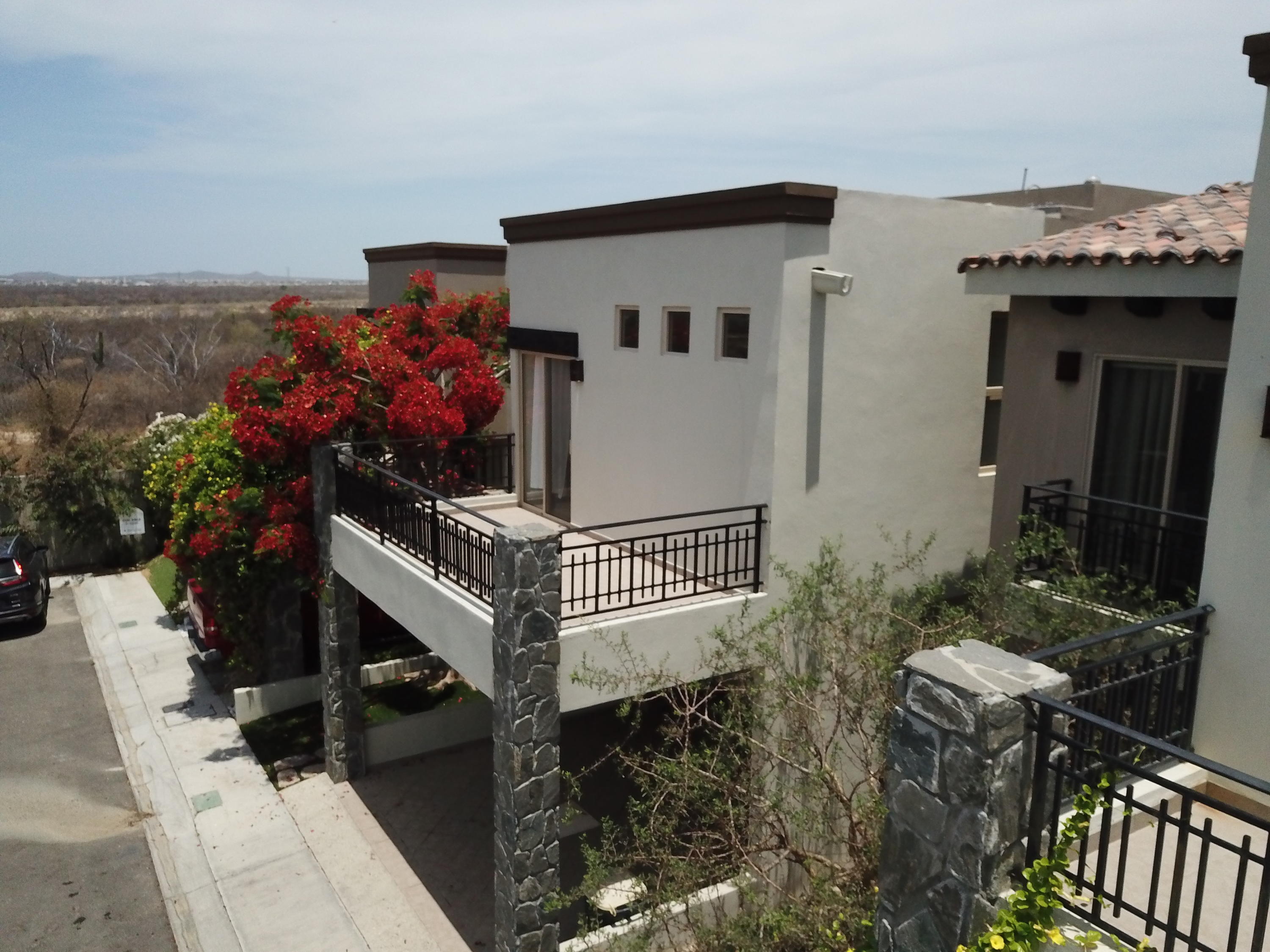 Beautifully appointed and furnished 3 Bedroom 2 1/2 Bath home in Cabo Del Mar. Upgraded cabinets, high end major appliances. Living room opens to splash pool and outdoor kitchen. Outside storage access from laundry room. Extended master bedroom with adjoining media room and patio. Large master bath and large closet. Remaining two bedrooms have terraces. Rooftop includes beautiful mountain views and ocean/arch views. Spectacular sunsets from the rooftop with outdoor kitchen and two separate seating areas. Outdoor fire pit included on the rooftop. Covered parking for two vehicles. Amenities: Pool, community center,Cabo del Mar School, kids parks, gym, 24/7 security and controlled access. Live and invest in one of Cabo’s most complete communities.