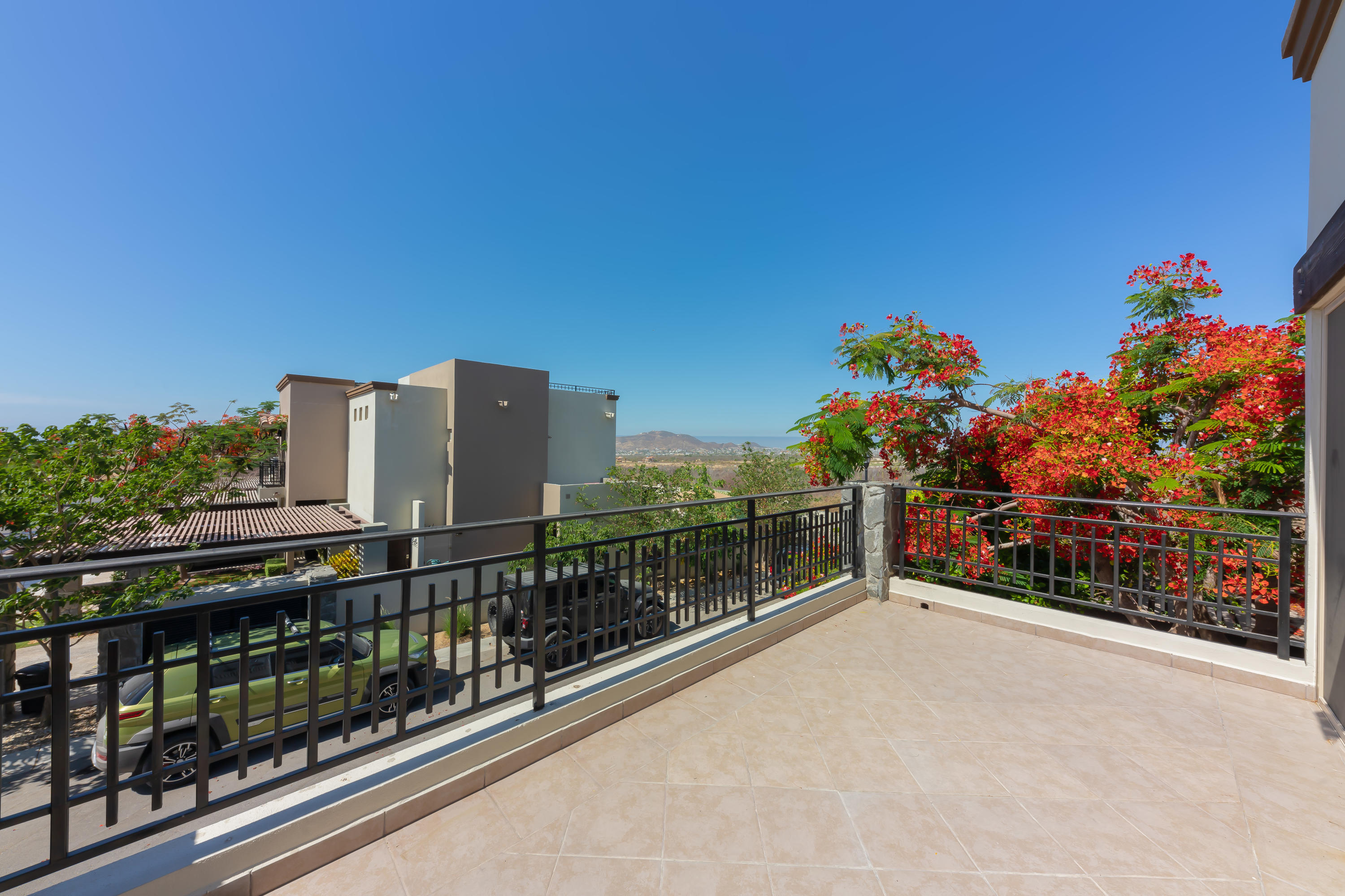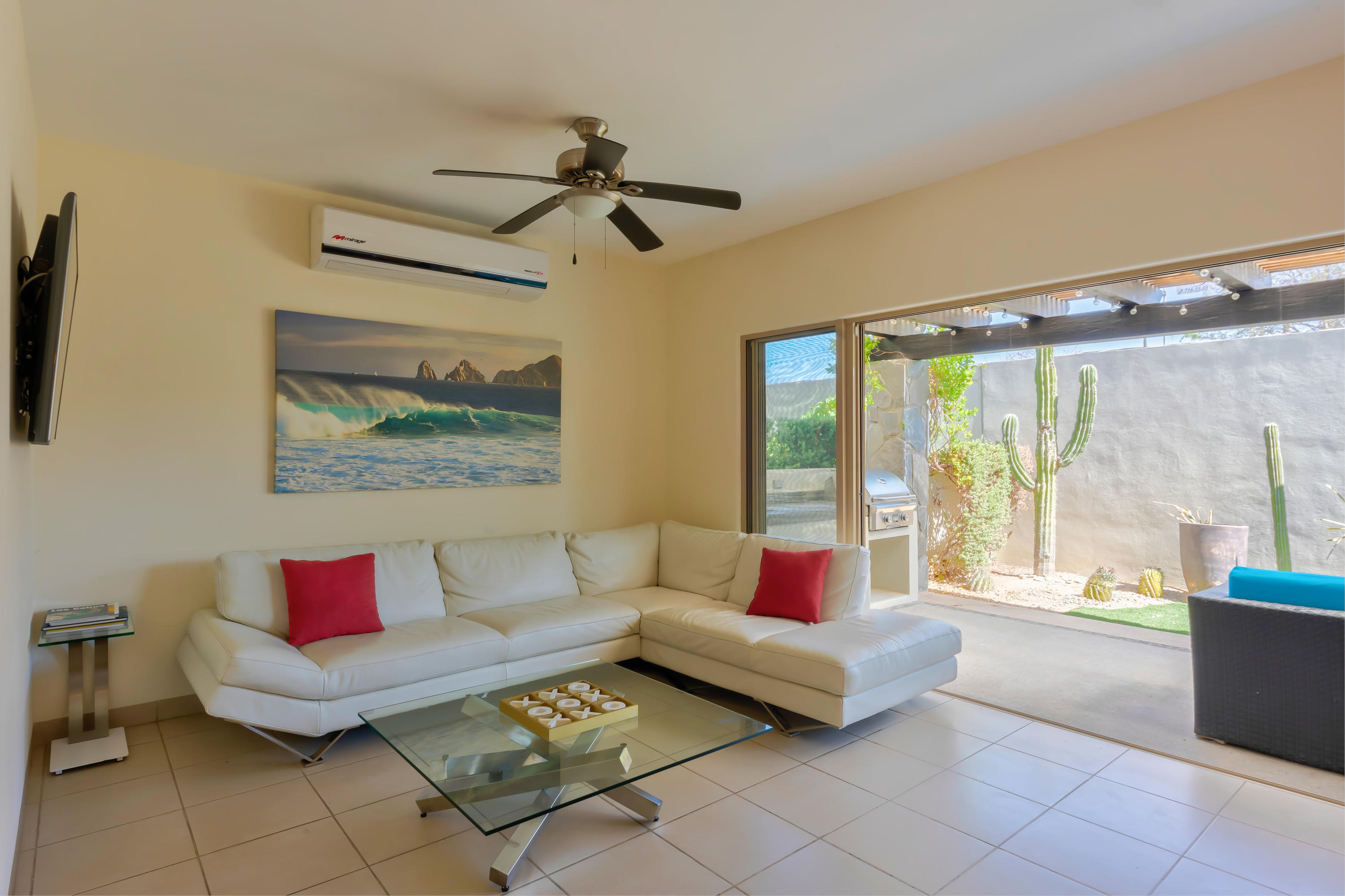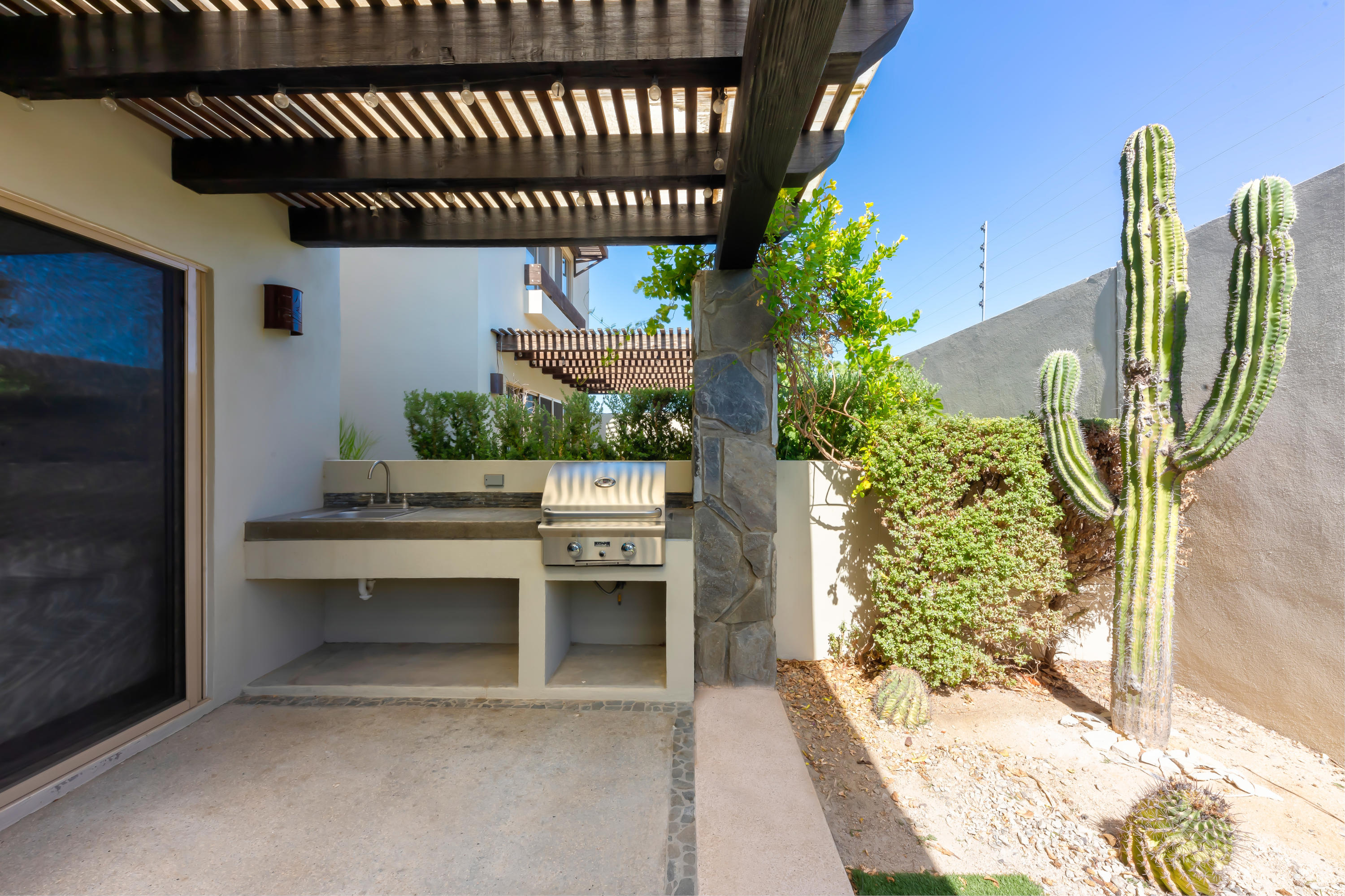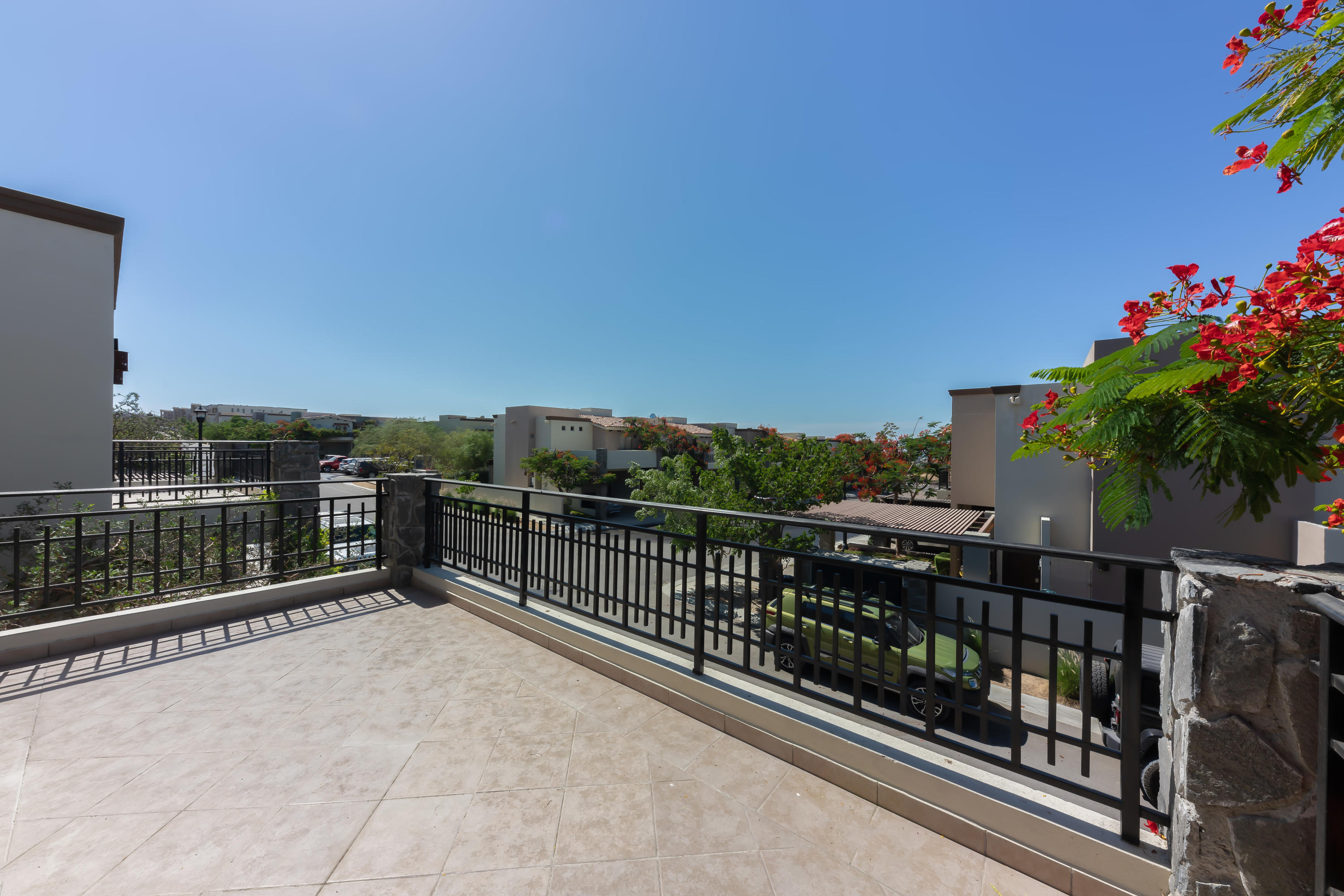 Beautifully appointed and furnished 3 Bedroom 2 1/2 Bath home in Cabo Del Mar. Upgraded cabinets, high end major appliances. Living room opens to splash pool and outdoor kitchen. Outside storage access from laundry room. Extended master bedroom with adjoining media room and patio. Large master bath and large closet. Remaining two bedrooms have terraces. Rooftop includes beautiful mountain views and ocean/arch views. Spectacular sunsets from the rooftop with outdoor kitchen and two separate seating areas. Outdoor fire pit included on the rooftop. Covered parking for two vehicles. Amenities: Pool, community center,Cabo del Mar School, kids parks, gym, 24/7 security and controlled access. Live and invest in one of Cabo’s most complete communities.