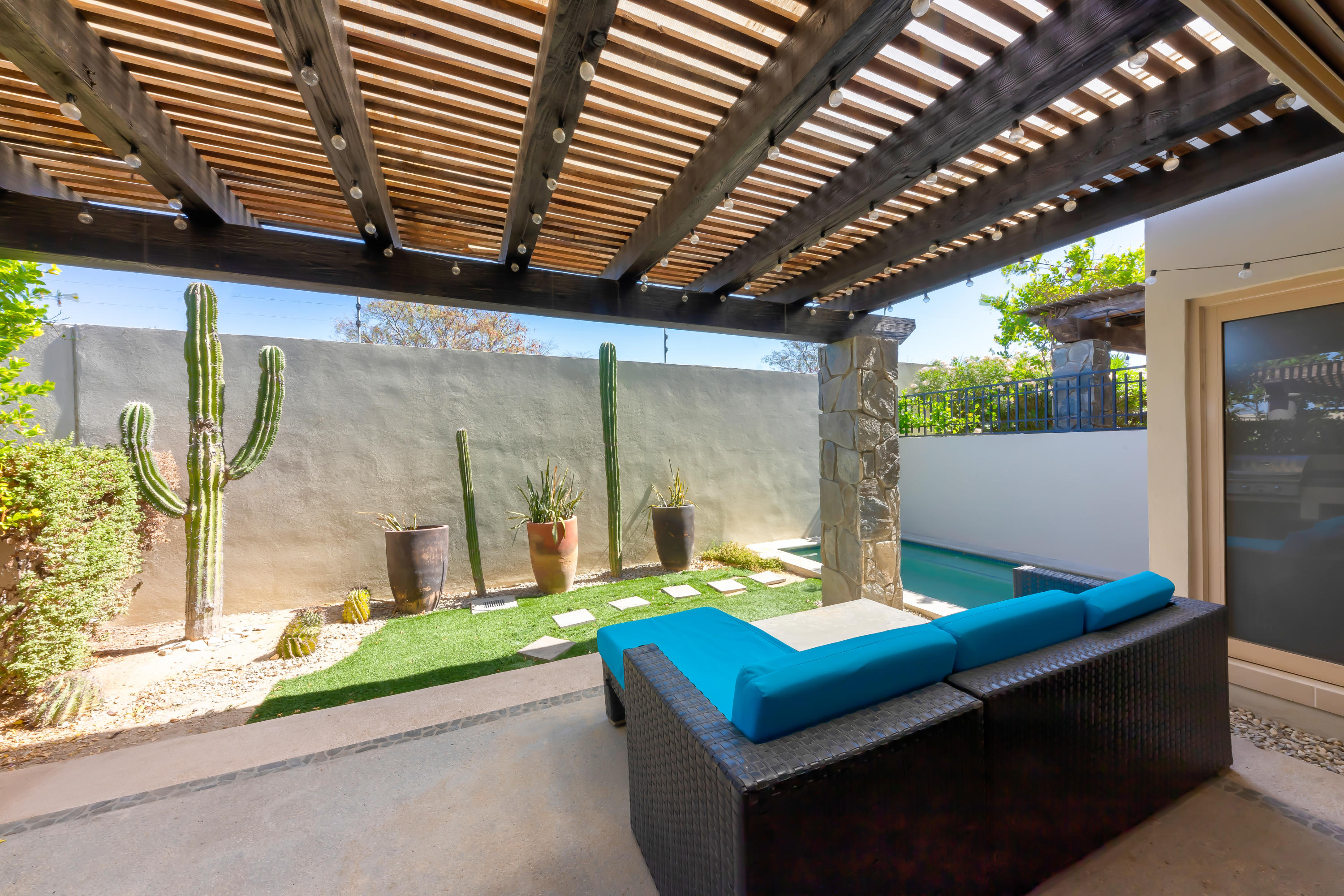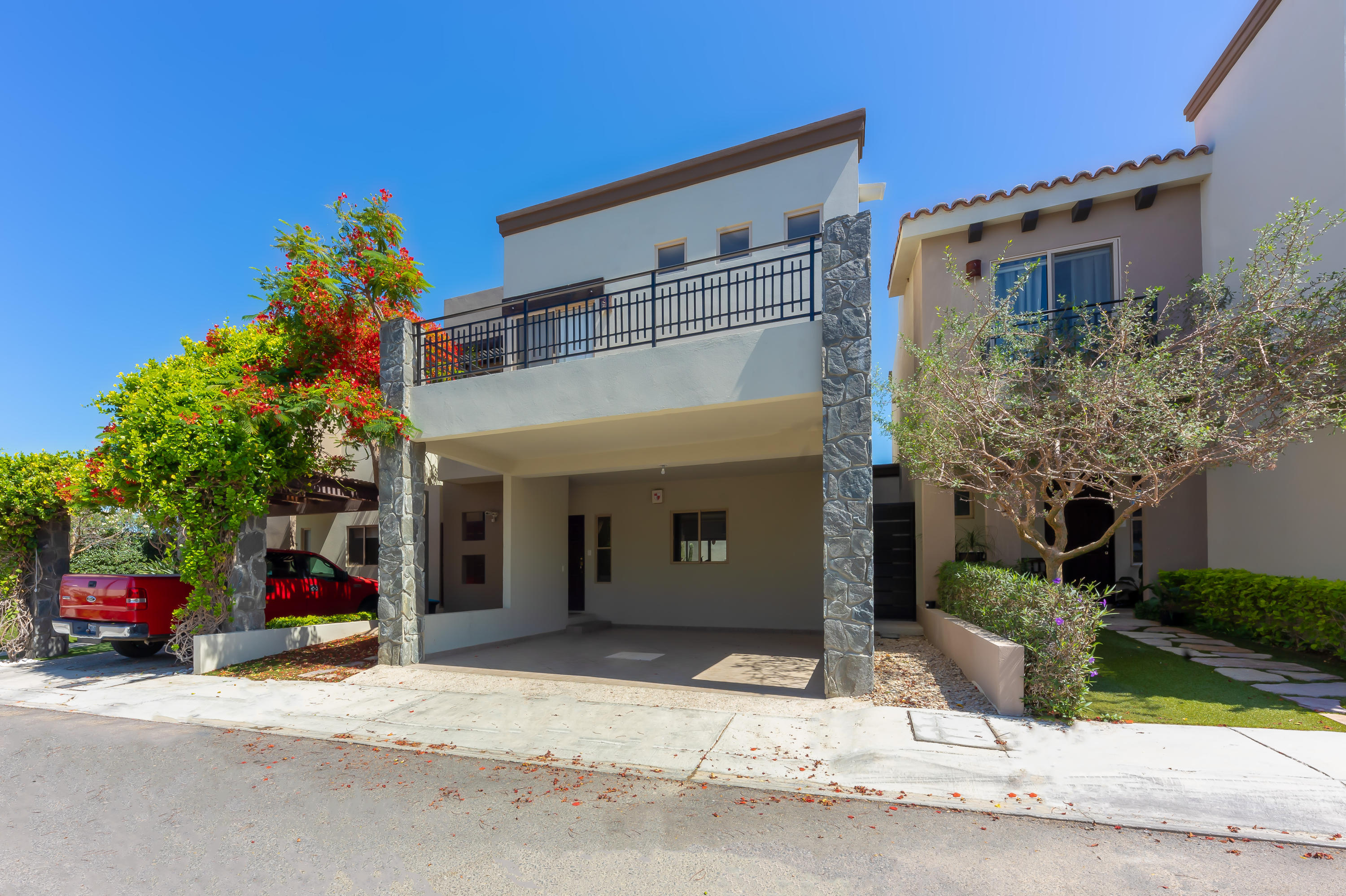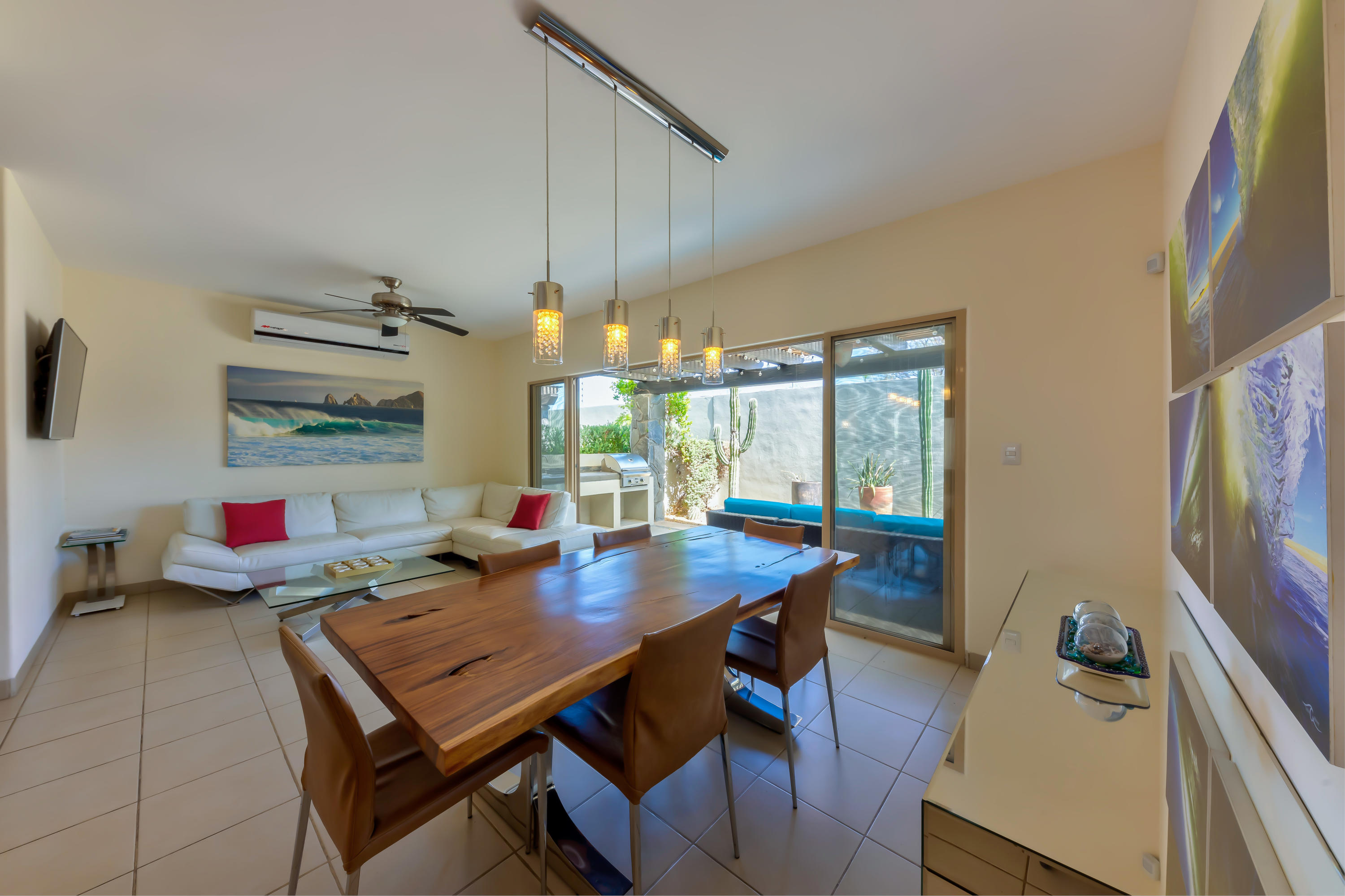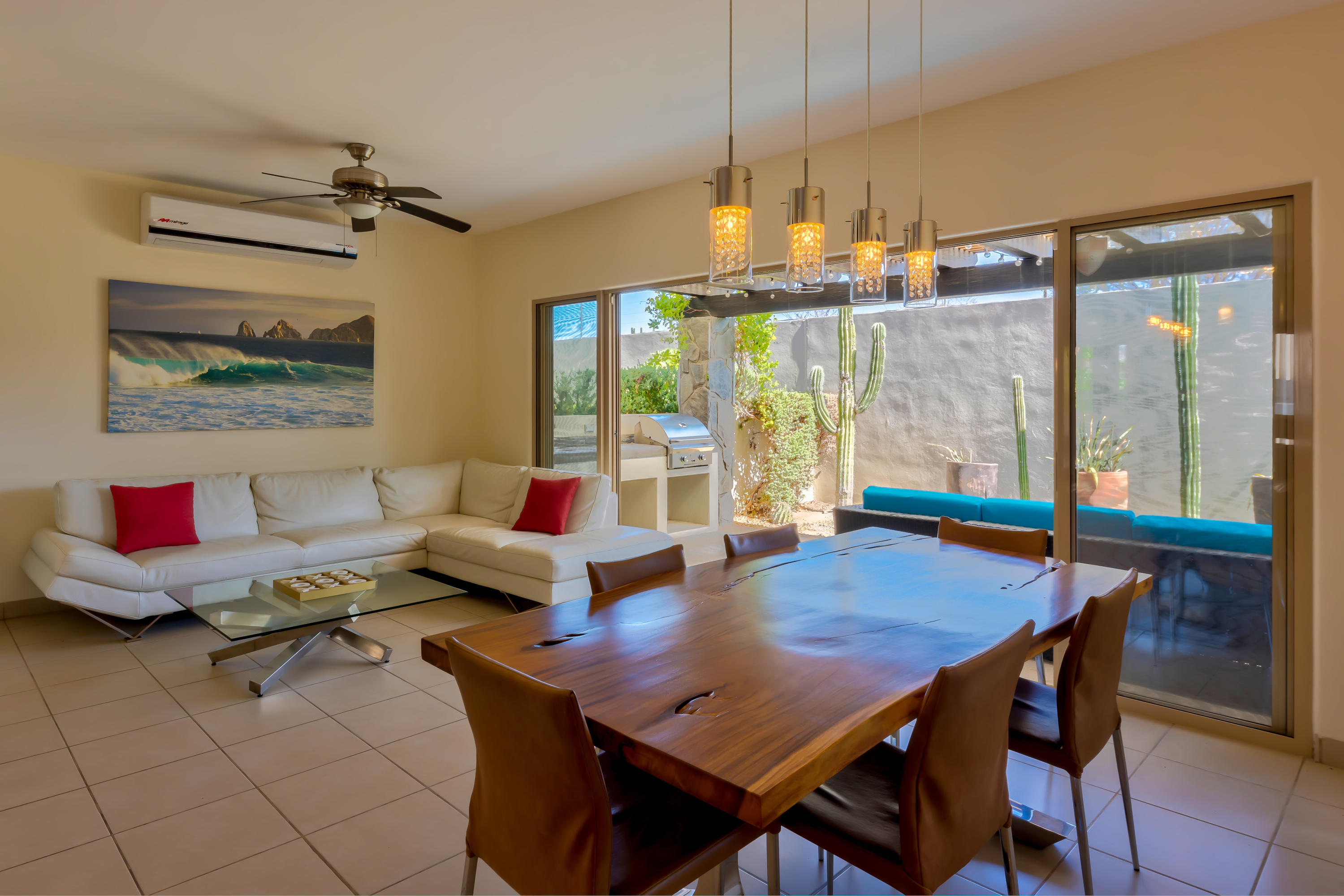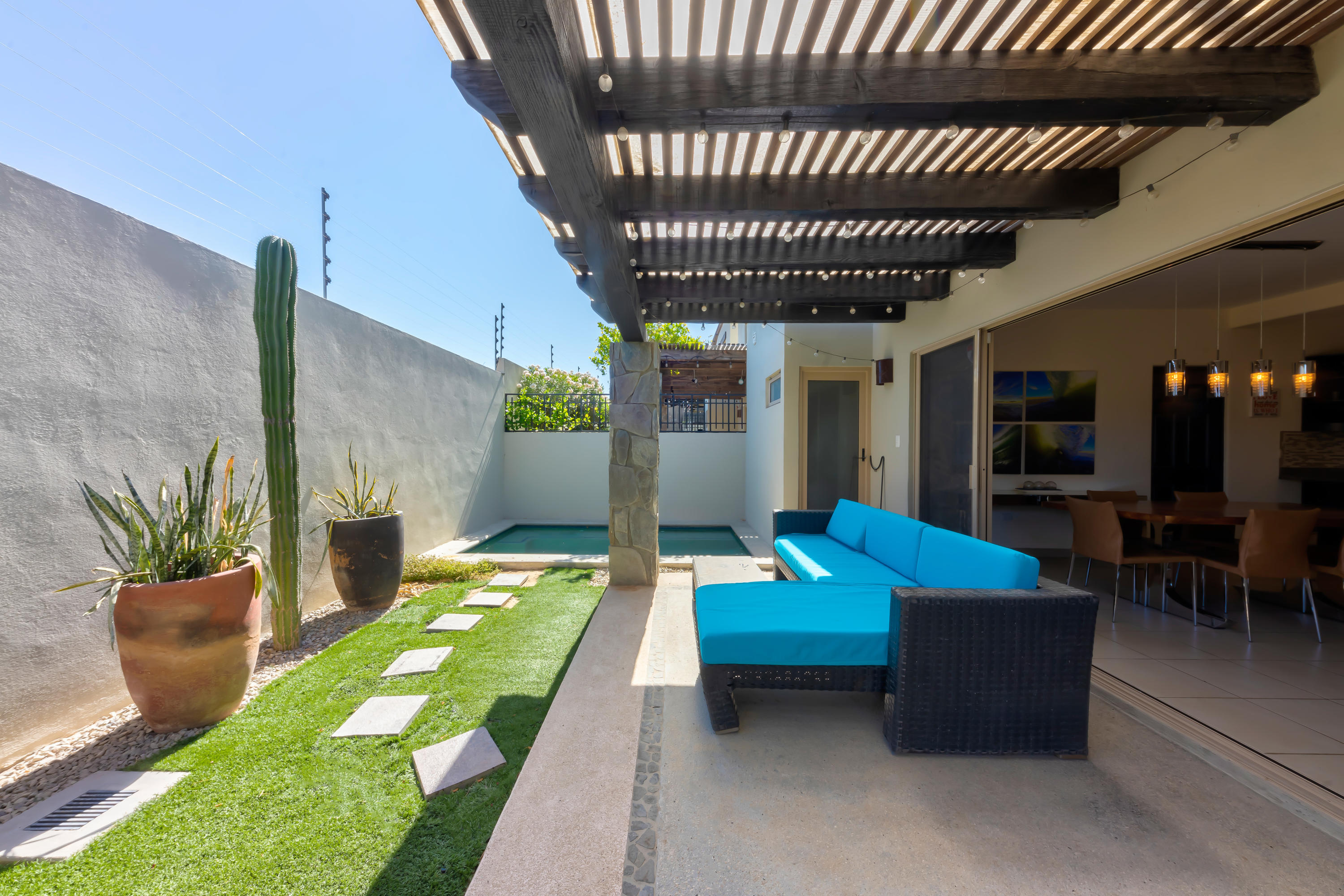 Beautifully appointed and furnished 3 Bedroom 2 1/2 Bath home in Cabo Del Mar. Upgraded cabinets, high end major appliances. Living room opens to splash pool and outdoor kitchen. Outside storage access from laundry room. Extended master bedroom with adjoining media room and patio. Large master bath and large closet. Remaining two bedrooms have terraces. Rooftop includes beautiful mountain views and ocean/arch views. Spectacular sunsets from the rooftop with outdoor kitchen and two separate seating areas. Outdoor fire pit included on the rooftop. Covered parking for two vehicles. Amenities: Pool, community center,Cabo del Mar School, kids parks, gym, 24/7 security and controlled access. Live and invest in one of Cabo’s most complete communities.