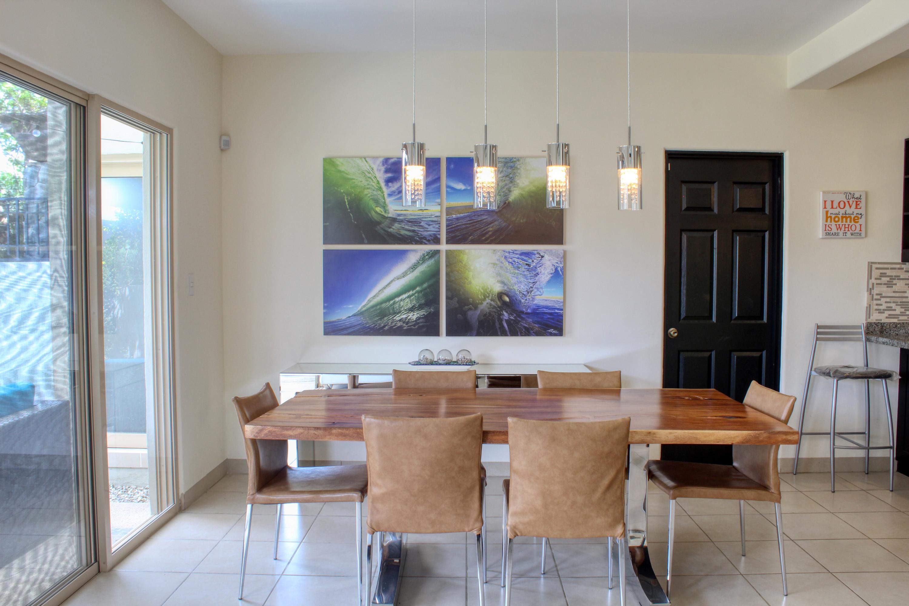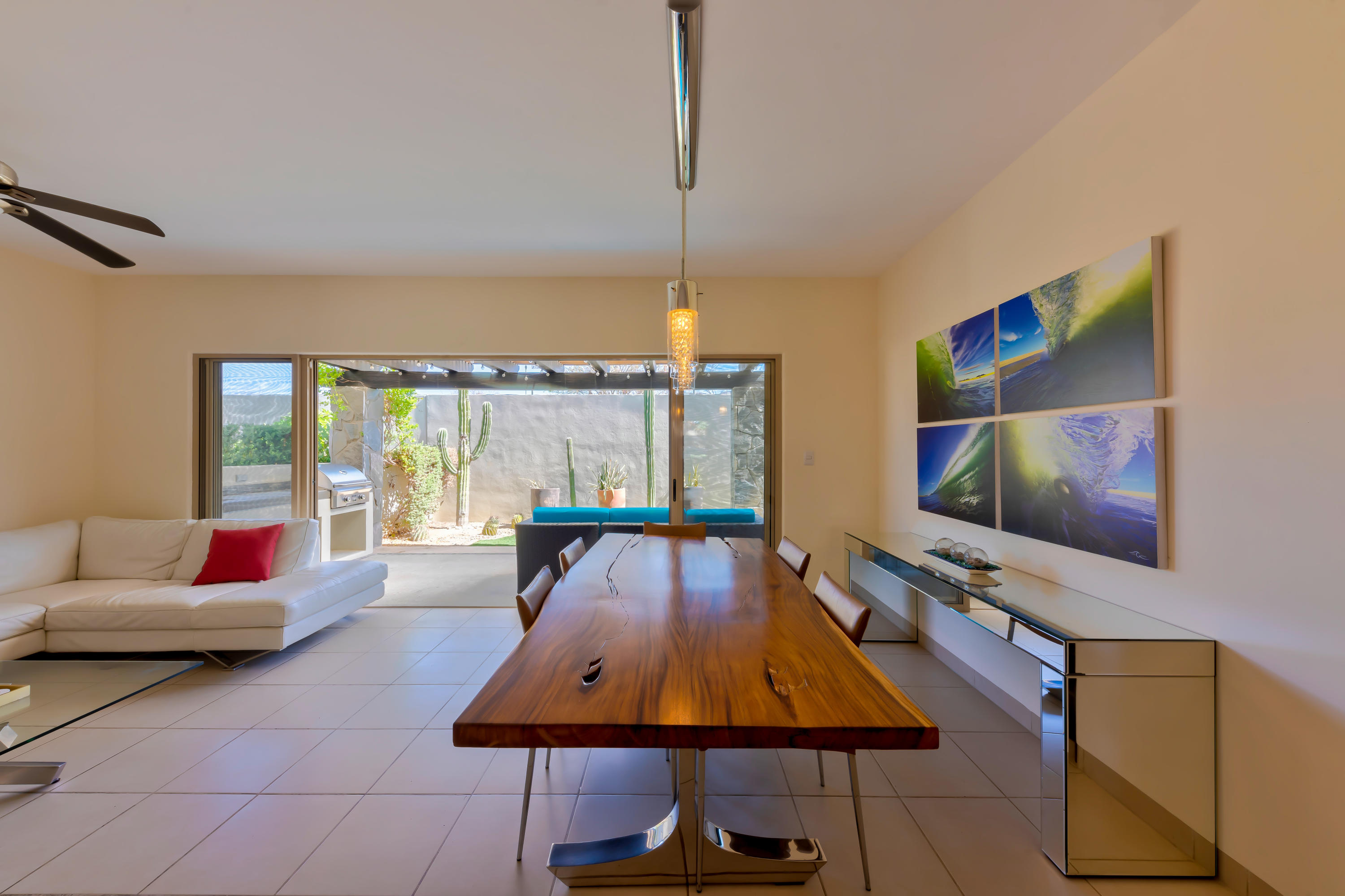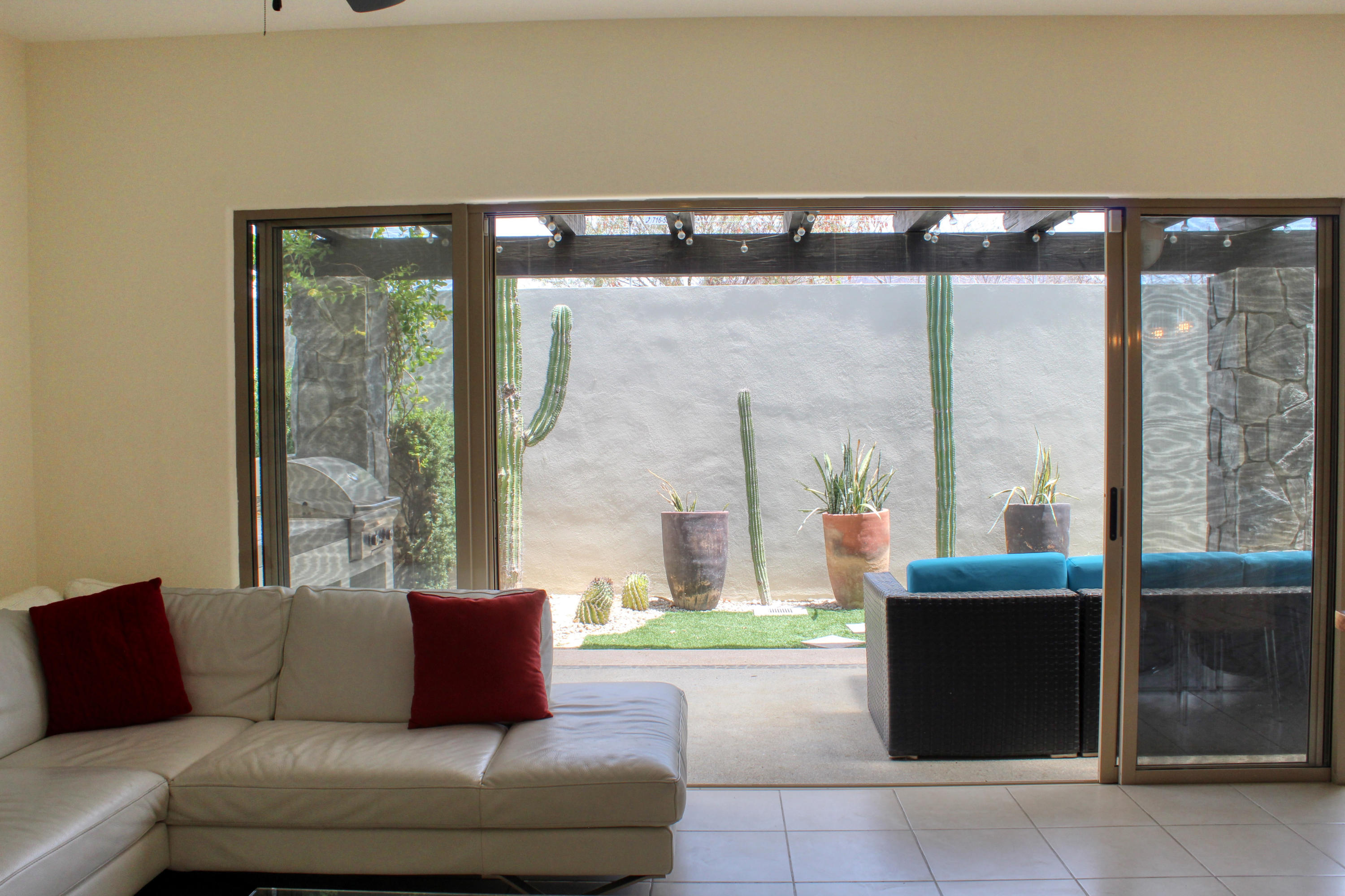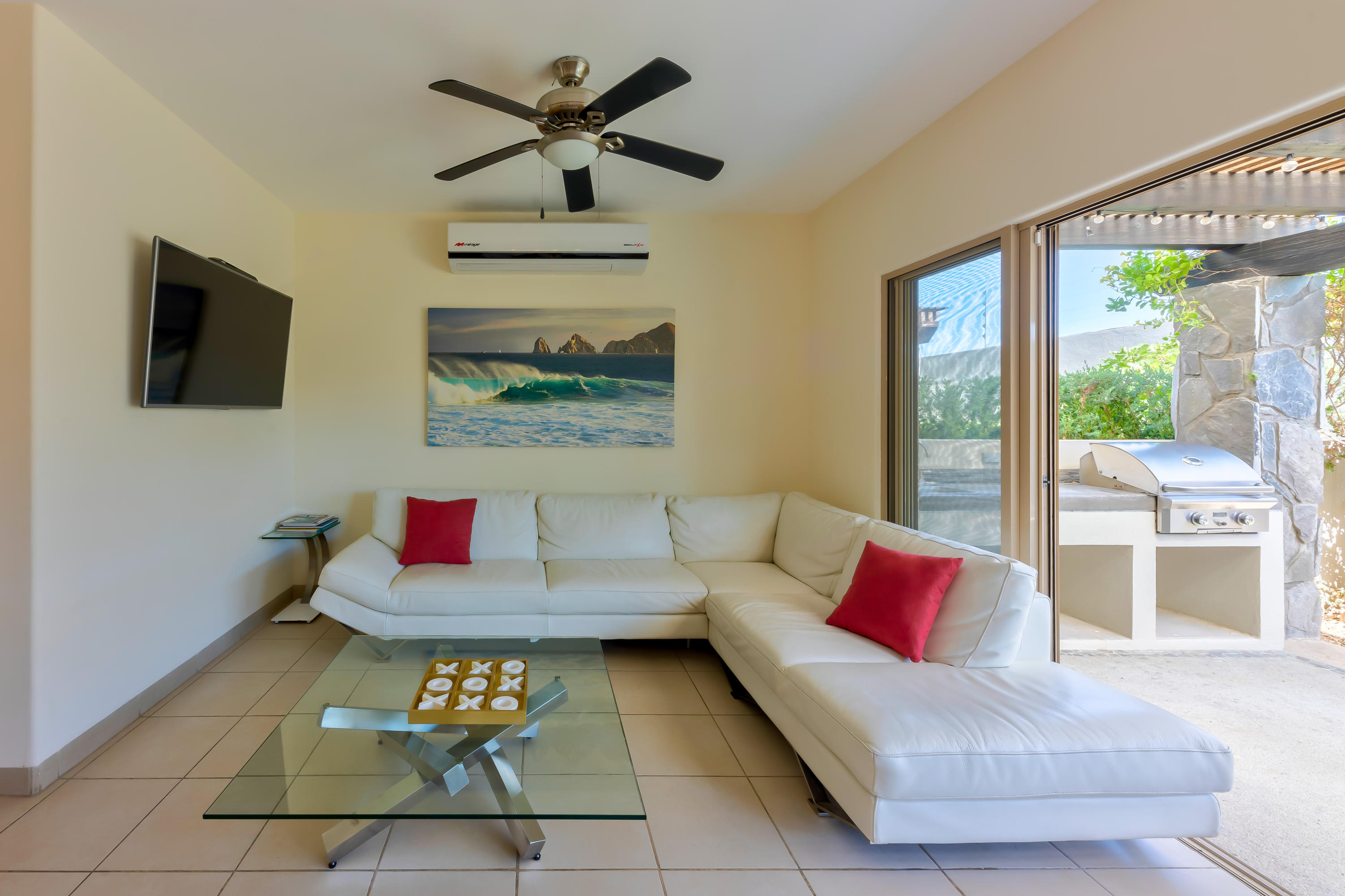Beautifully appointed and furnished 3 Bedroom 2 1/2 Bath home in Cabo Del Mar. Upgraded cabinets, high end major appliances. Living room opens to splash pool and outdoor kitchen. Outside storage access from laundry room. Extended master bedroom with adjoining media room and patio. Large master bath and large closet. Remaining two bedrooms have terraces. Rooftop includes beautiful mountain views and ocean/arch views. Spectacular sunsets from the rooftop with outdoor kitchen and two separate seating areas. Outdoor fire pit included on the rooftop. Covered parking for two vehicles. Amenities: Pool, community center,Cabo del Mar School, kids parks, gym, 24/7 security and controlled access. Live and invest in one of Cabo’s most complete communities.