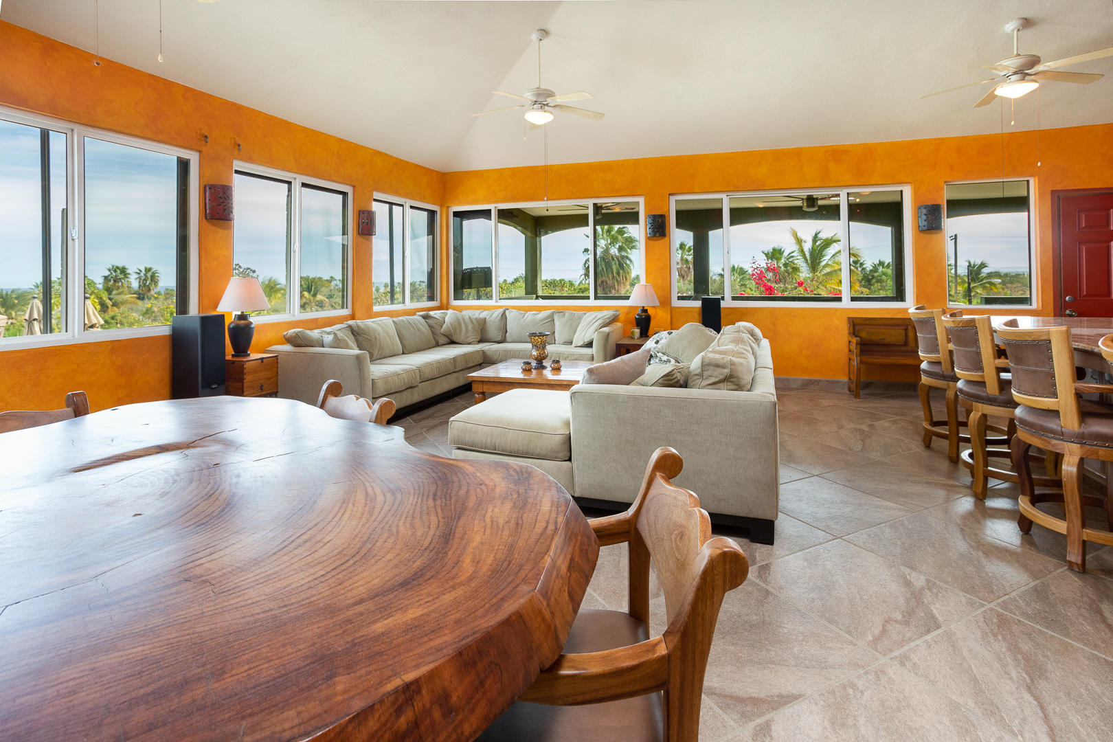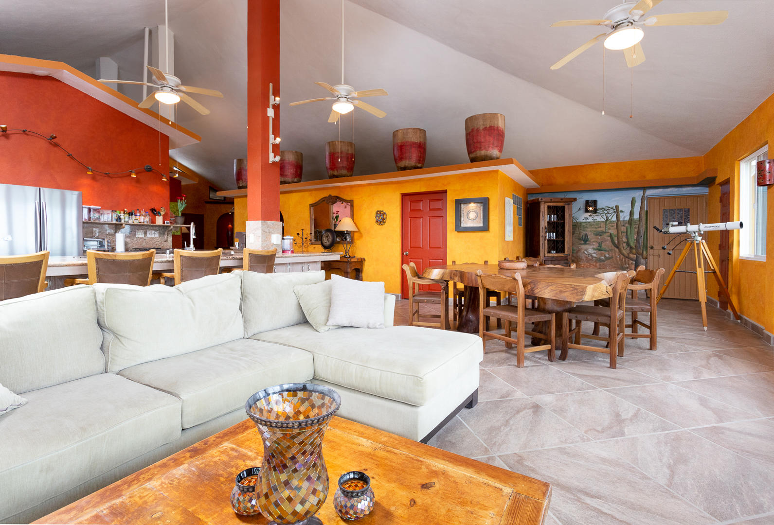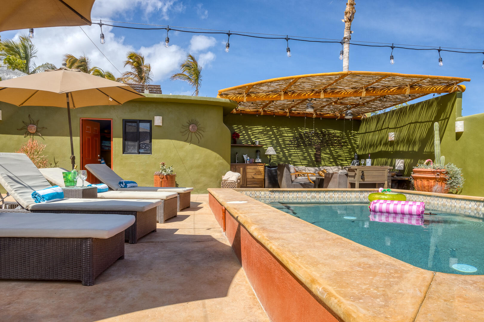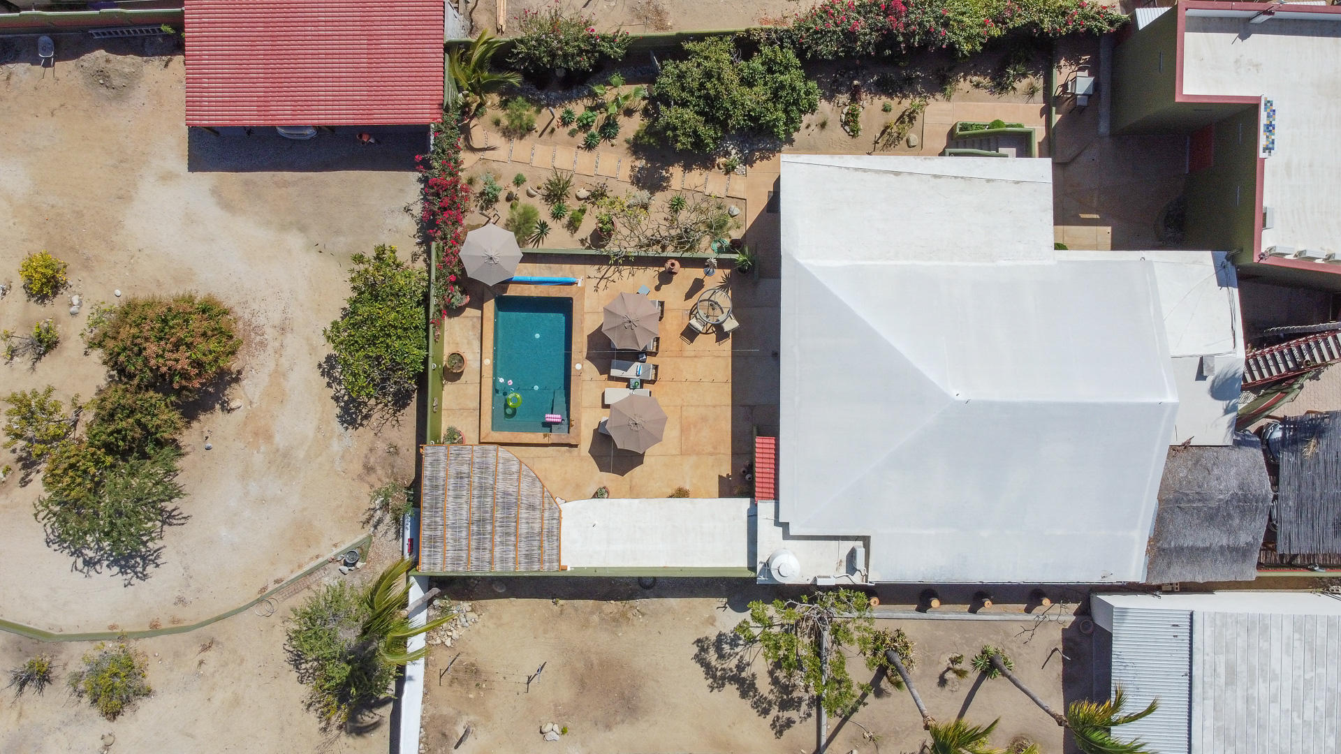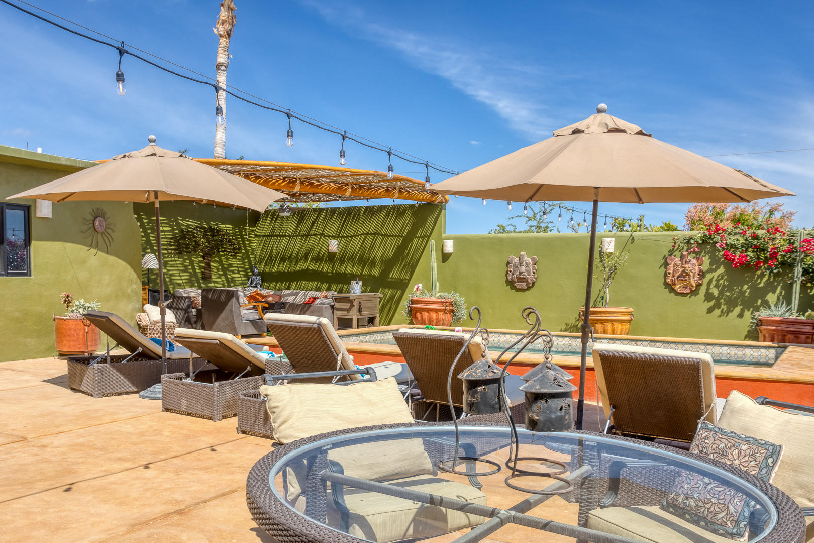 Casa Brisas is the perfect family or entertainment home perched on a hill and benefiting from stunning views of the ocean and mountains all around. Located in central Los Barriles in a much sought-after quiet neighborhood, the views from the house resemble those of Hawaii rather than a desert thanks to the myriad of palm trees. This four bedroom house has been lovingly expanded since it was bought to include a well-designed open plan main living area with more than three separate decks and patios as well as an expansive pool patio with outdoor kitchen and sitting area as well as heated pool. Gardens are designed by well-known local expert Christine Edge (Edge of the Sea). A large garage can accommodate a boat or several ‘toys’ and cars. A garage roof terrace delivers even better views!