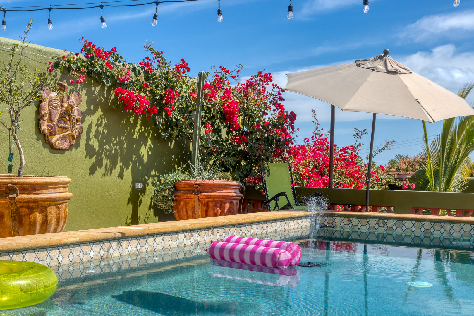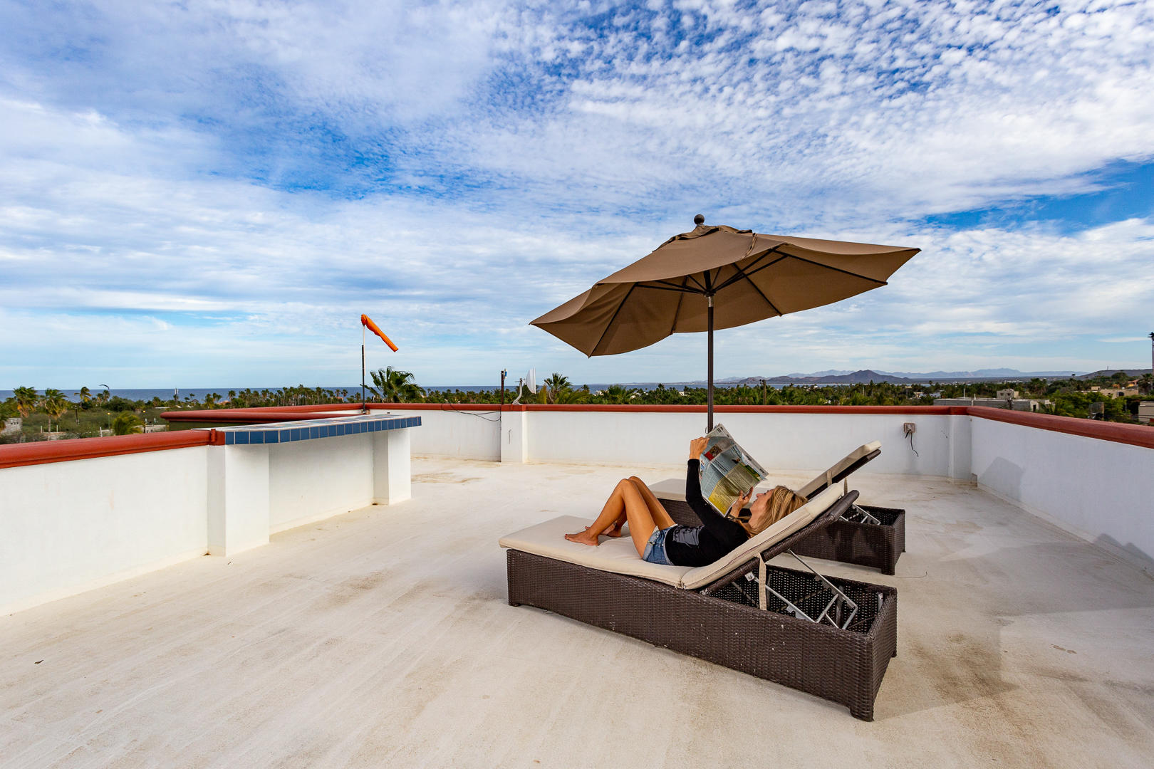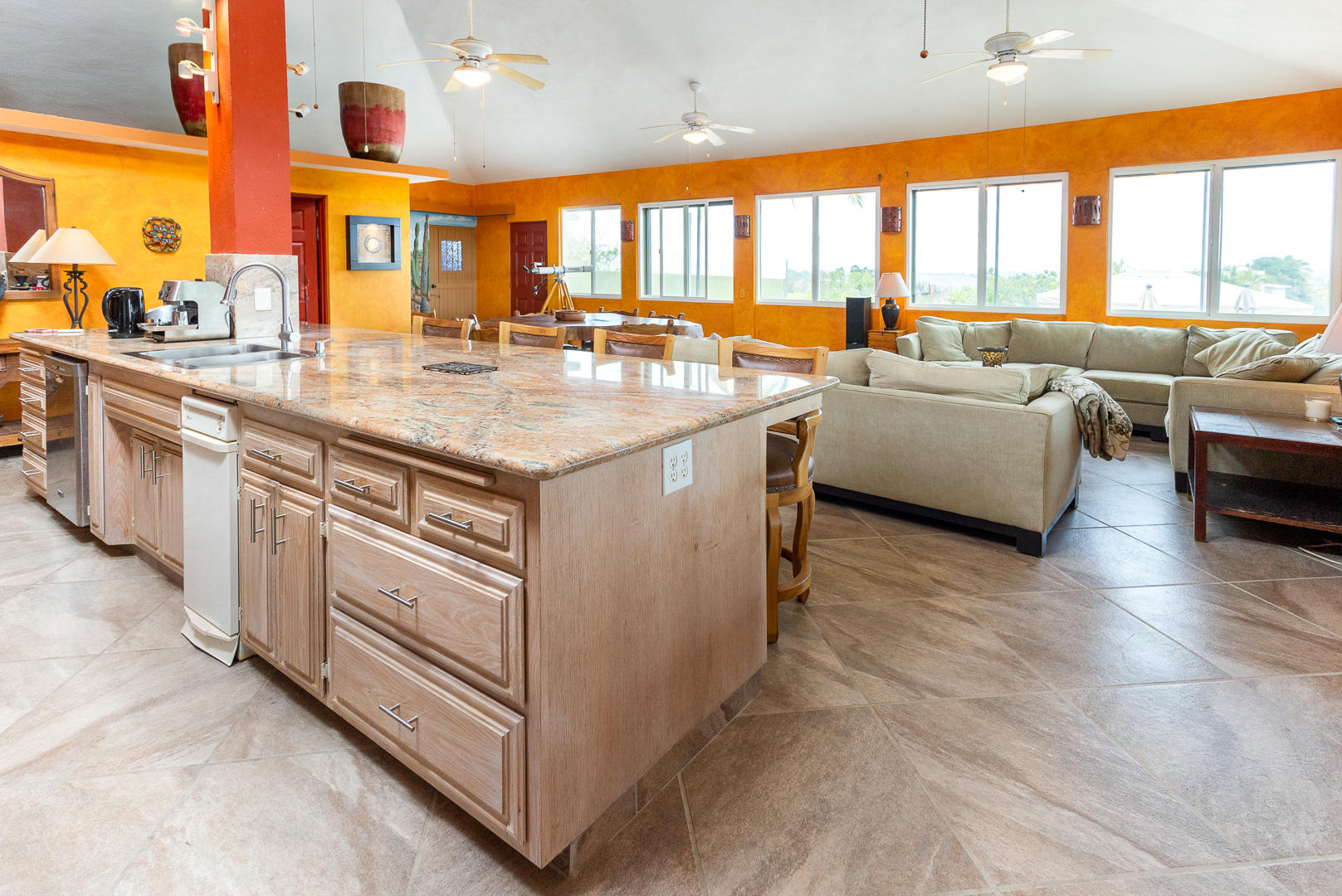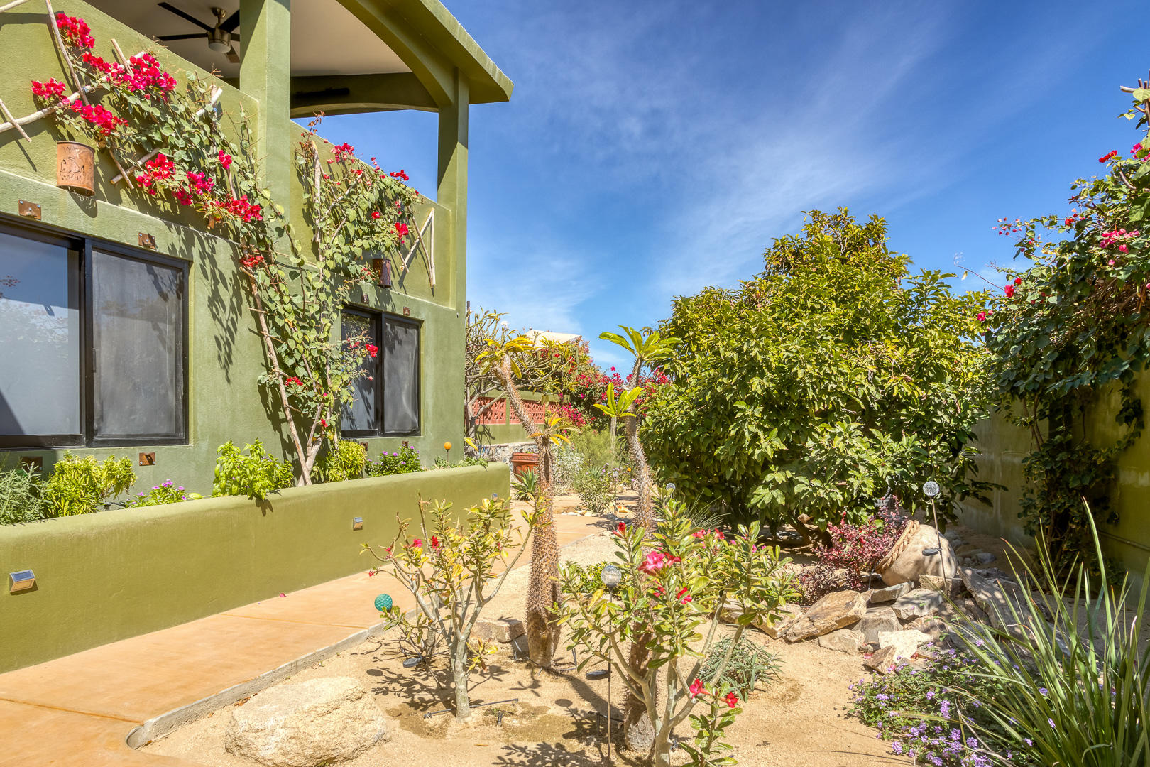 Casa Brisas is the perfect family or entertainment home perched on a hill and benefiting from stunning views of the ocean and mountains all around. Located in central Los Barriles in a much sought-after quiet neighborhood, the views from the house resemble those of Hawaii rather than a desert thanks to the myriad of palm trees. This four bedroom house has been lovingly expanded since it was bought to include a well-designed open plan main living area with more than three separate decks and patios as well as an expansive pool patio with outdoor kitchen and sitting area as well as heated pool. Gardens are designed by well-known local expert Christine Edge (Edge of the Sea). A large garage can accommodate a boat or several ‘toys’ and cars. A garage roof terrace delivers even better views!