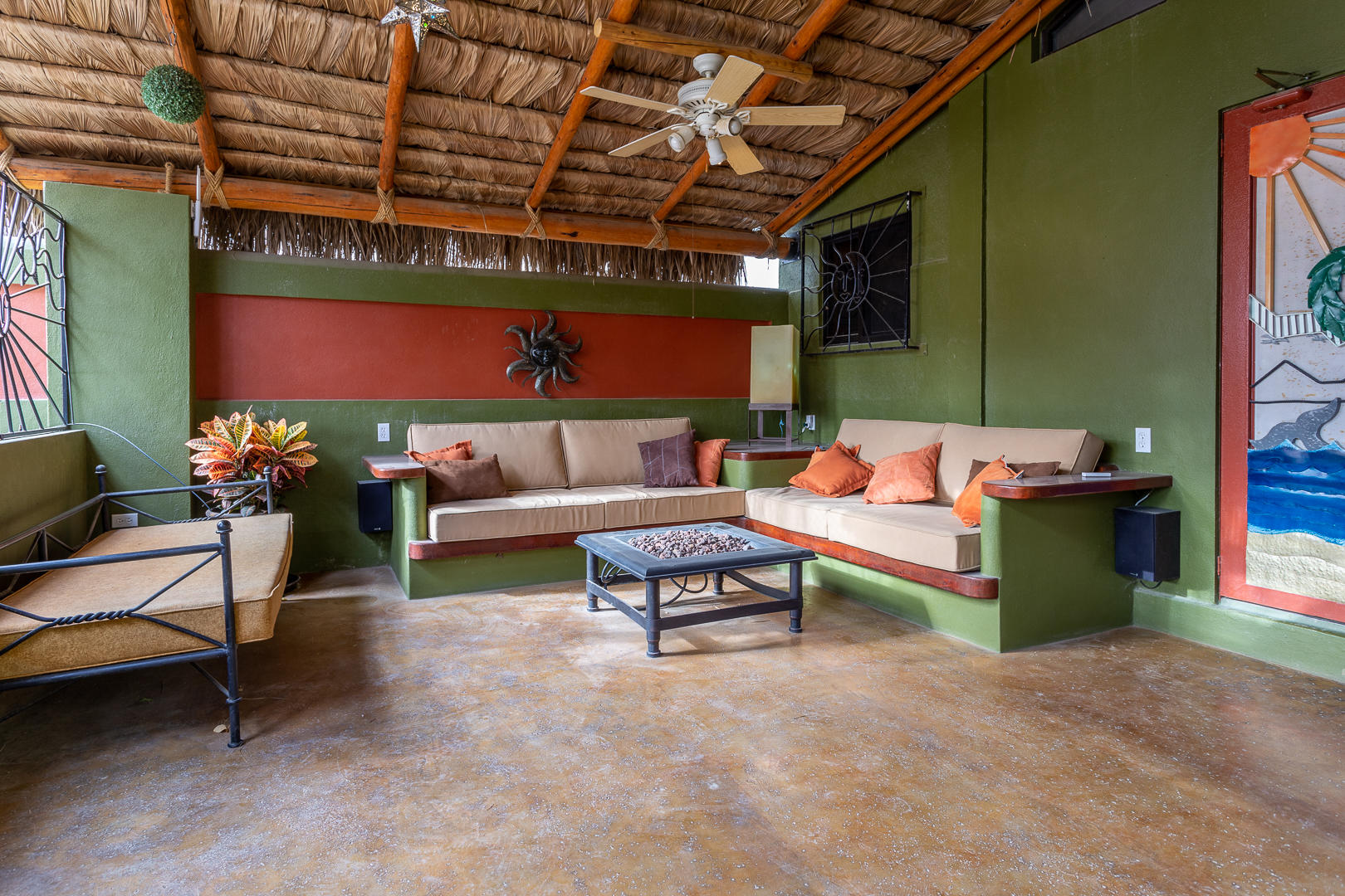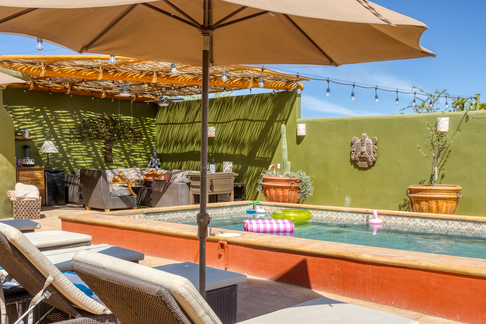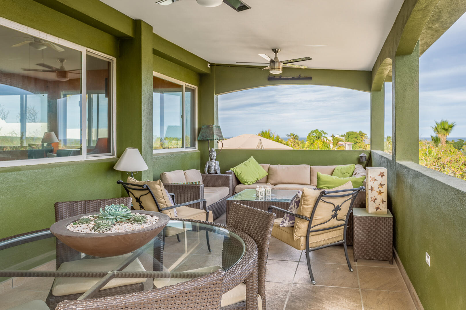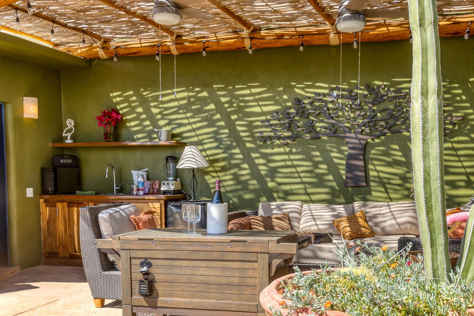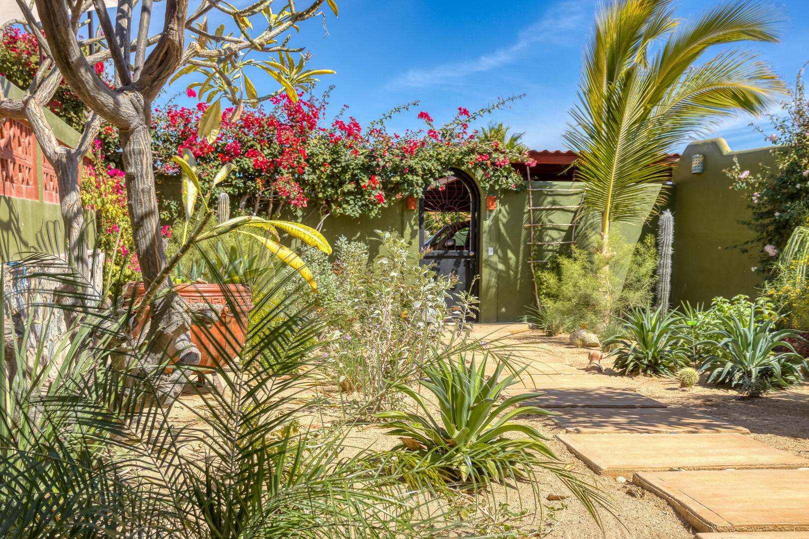 Casa Brisas is the perfect family or entertainment home perched on a hill and benefiting from stunning views of the ocean and mountains all around. Located in central Los Barriles in a much sought-after quiet neighborhood, the views from the house resemble those of Hawaii rather than a desert thanks to the myriad of palm trees. This four bedroom house has been lovingly expanded since it was bought to include a well-designed open plan main living area with more than three separate decks and patios as well as an expansive pool patio with outdoor kitchen and sitting area as well as heated pool. Gardens are designed by well-known local expert Christine Edge (Edge of the Sea). A large garage can accommodate a boat or several ‘toys’ and cars. A garage roof terrace delivers even better views!