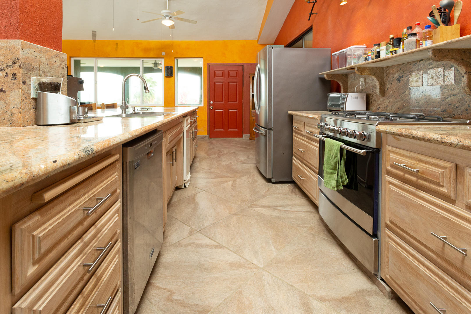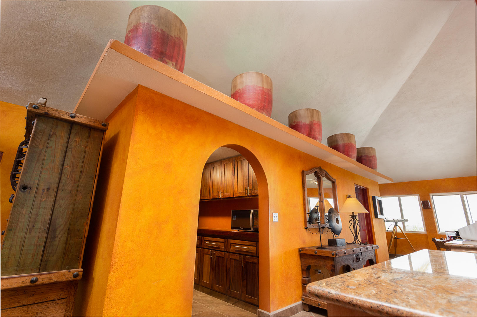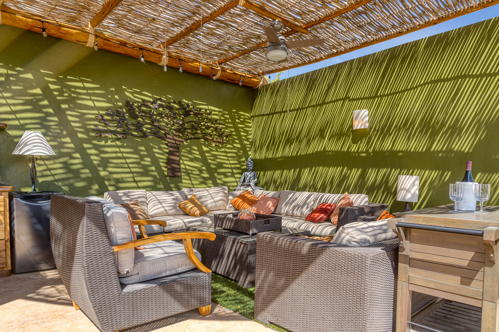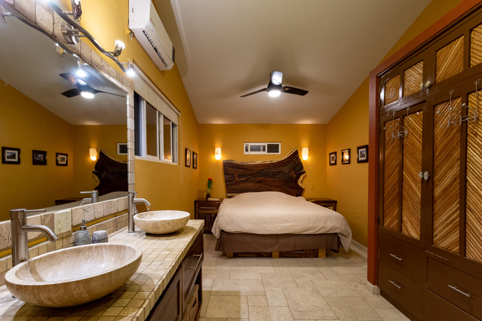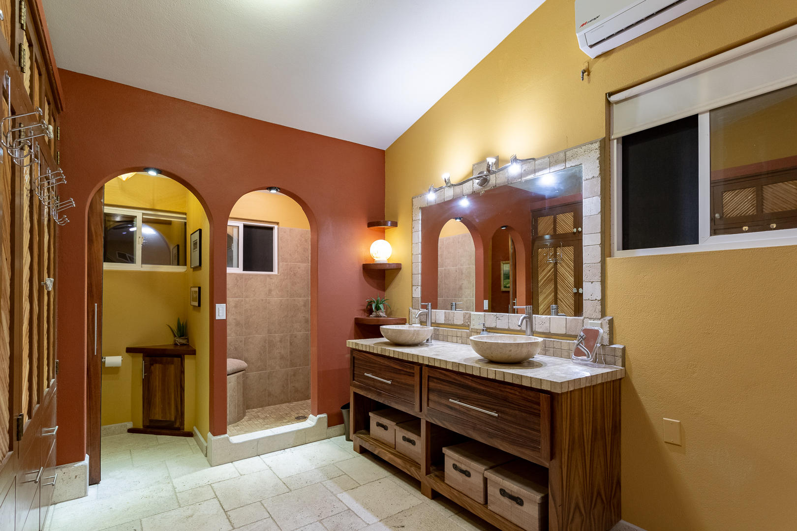 Casa Brisas is the perfect family or entertainment home perched on a hill and benefiting from stunning views of the ocean and mountains all around. Located in central Los Barriles in a much sought-after quiet neighborhood, the views from the house resemble those of Hawaii rather than a desert thanks to the myriad of palm trees. This four bedroom house has been lovingly expanded since it was bought to include a well-designed open plan main living area with more than three separate decks and patios as well as an expansive pool patio with outdoor kitchen and sitting area as well as heated pool. Gardens are designed by well-known local expert Christine Edge (Edge of the Sea). A large garage can accommodate a boat or several ‘toys’ and cars. A garage roof terrace delivers even better views!