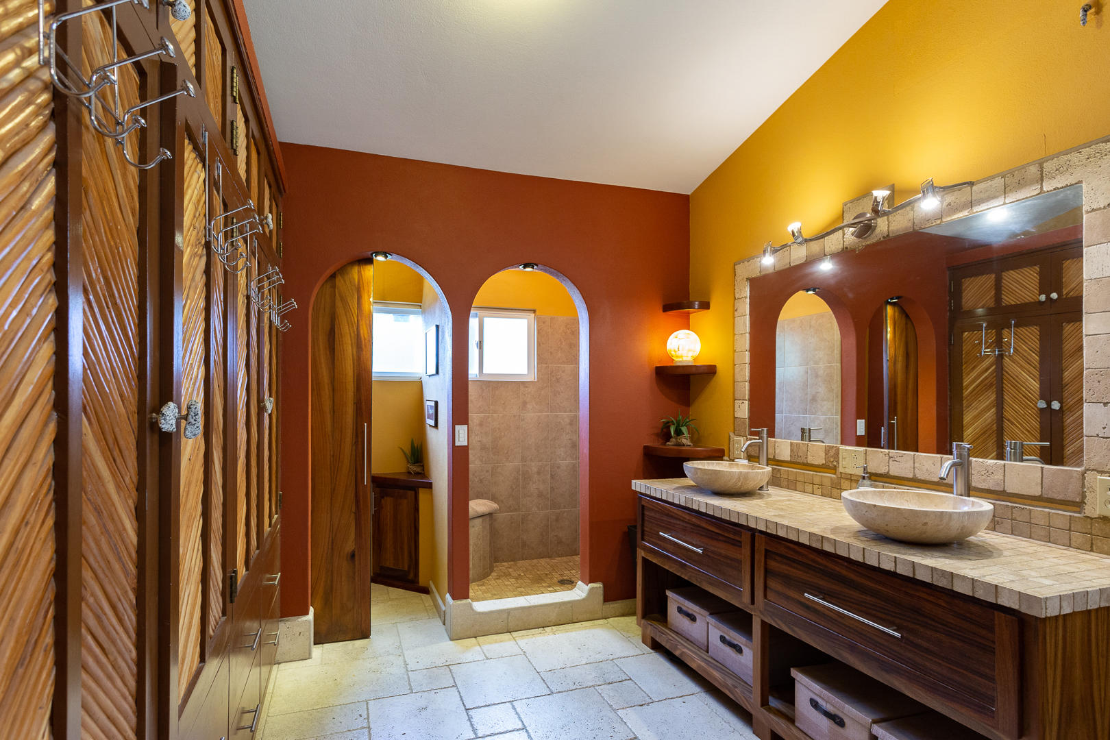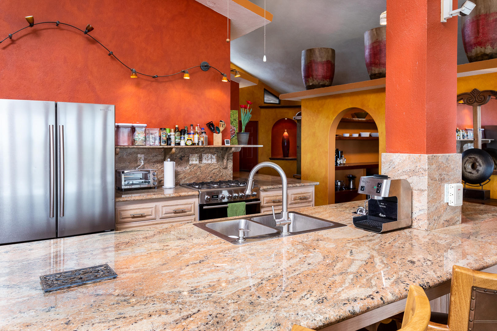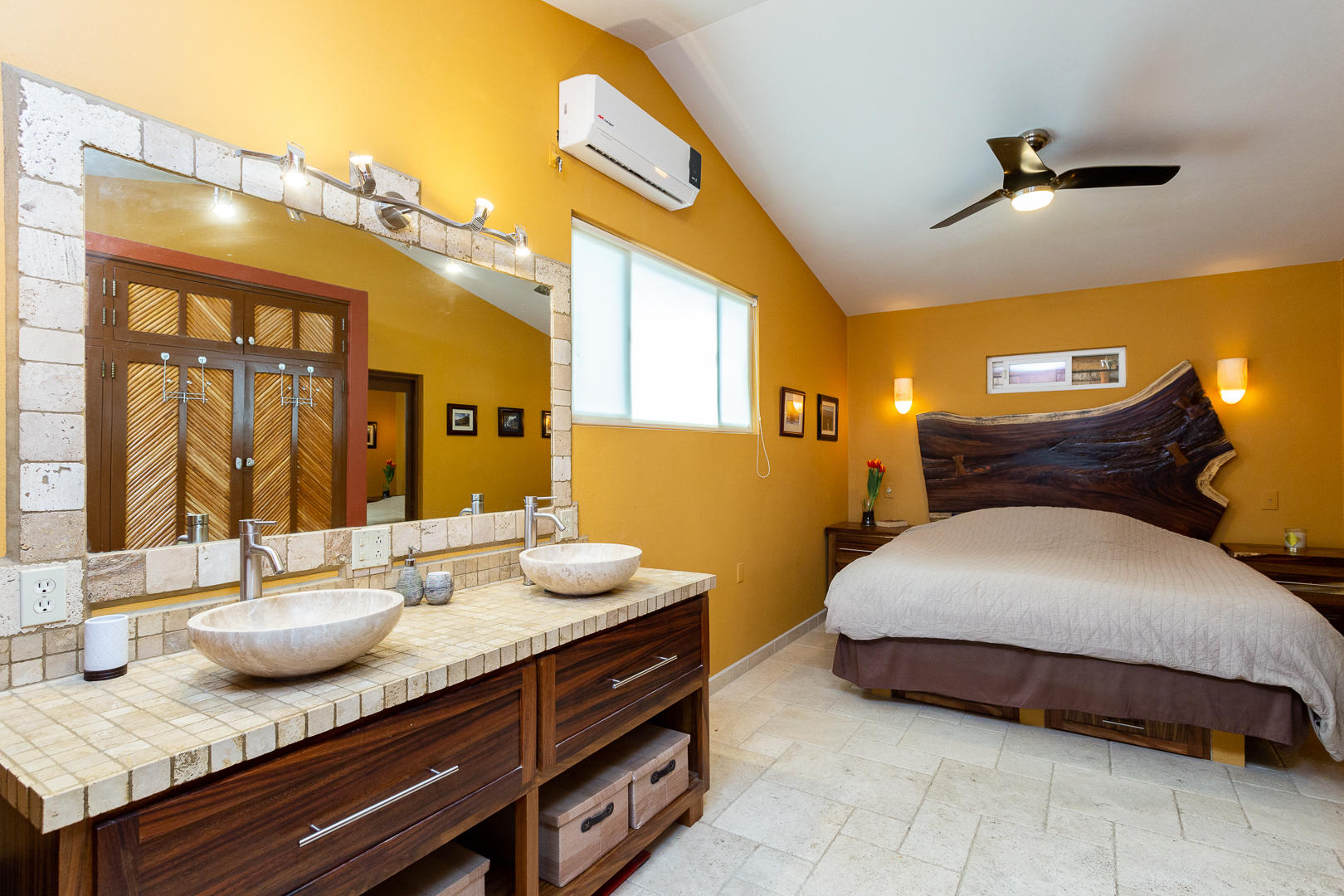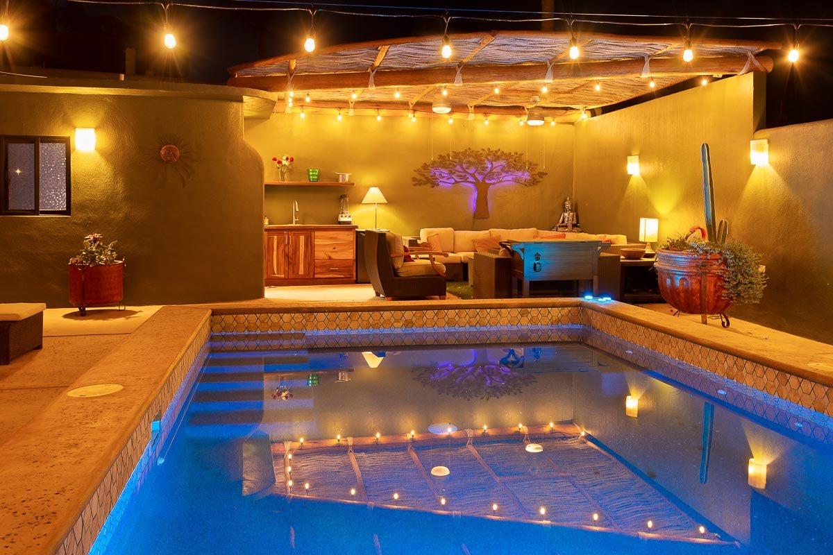 Casa Brisas is the perfect family or entertainment home perched on a hill and benefiting from stunning views of the ocean and mountains all around. Located in central Los Barriles in a much sought-after quiet neighborhood, the views from the house resemble those of Hawaii rather than a desert thanks to the myriad of palm trees. This four bedroom house has been lovingly expanded since it was bought to include a well-designed open plan main living area with more than three separate decks and patios as well as an expansive pool patio with outdoor kitchen and sitting area as well as heated pool. Gardens are designed by well-known local expert Christine Edge (Edge of the Sea). A large garage can accommodate a boat or several ‘toys’ and cars. A garage roof terrace delivers even better views!