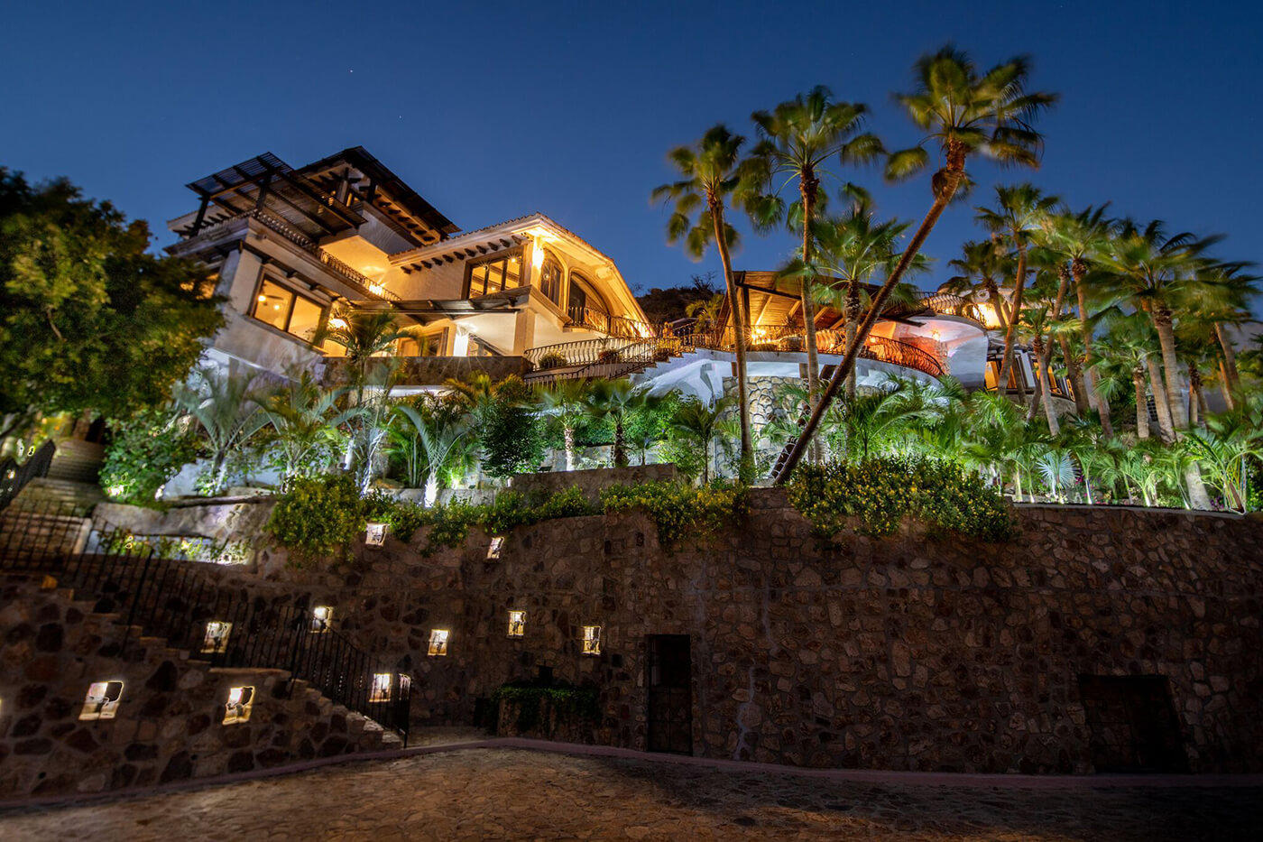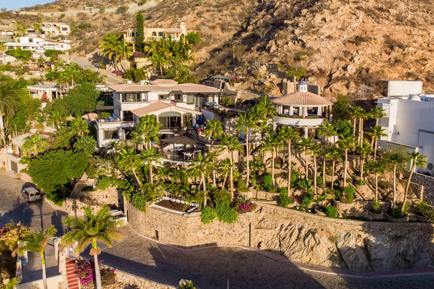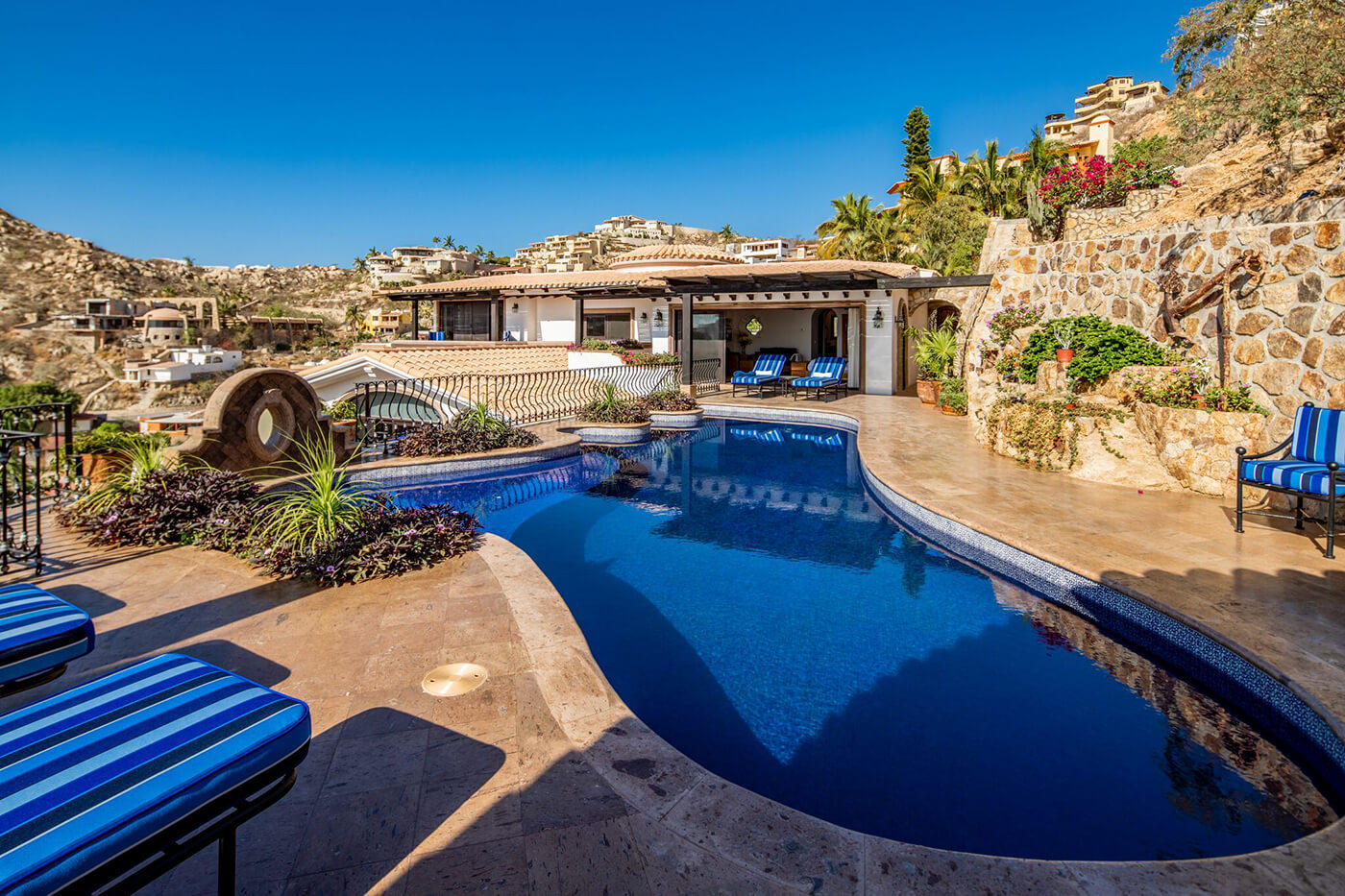 Perched on a knoll, at the end of a private lane, and above the Cabo San Lucas marina in one of Cabo’s most known and respected communities, El Pedregal, Casa Connie is a faithfully eclectic collection of intimate gathering places, sun-drenched pools, and shaded private gardens. Meticulously maintained, Casa Connie is a true move-in ready, turn-key listing, hard to find in any other offering in Pedregal. In the last 2 years, this property was completely gutted, renovated, and brought current including the installation of solar energy for all electricity, keeping monthly expenses at a bare minimum. This Spanish Colonial showpiece truly softens the divide over 3 distinct levels in the main building, and again in the private casita hidden within the cooling gardens. *SEE SUPPLEMENT