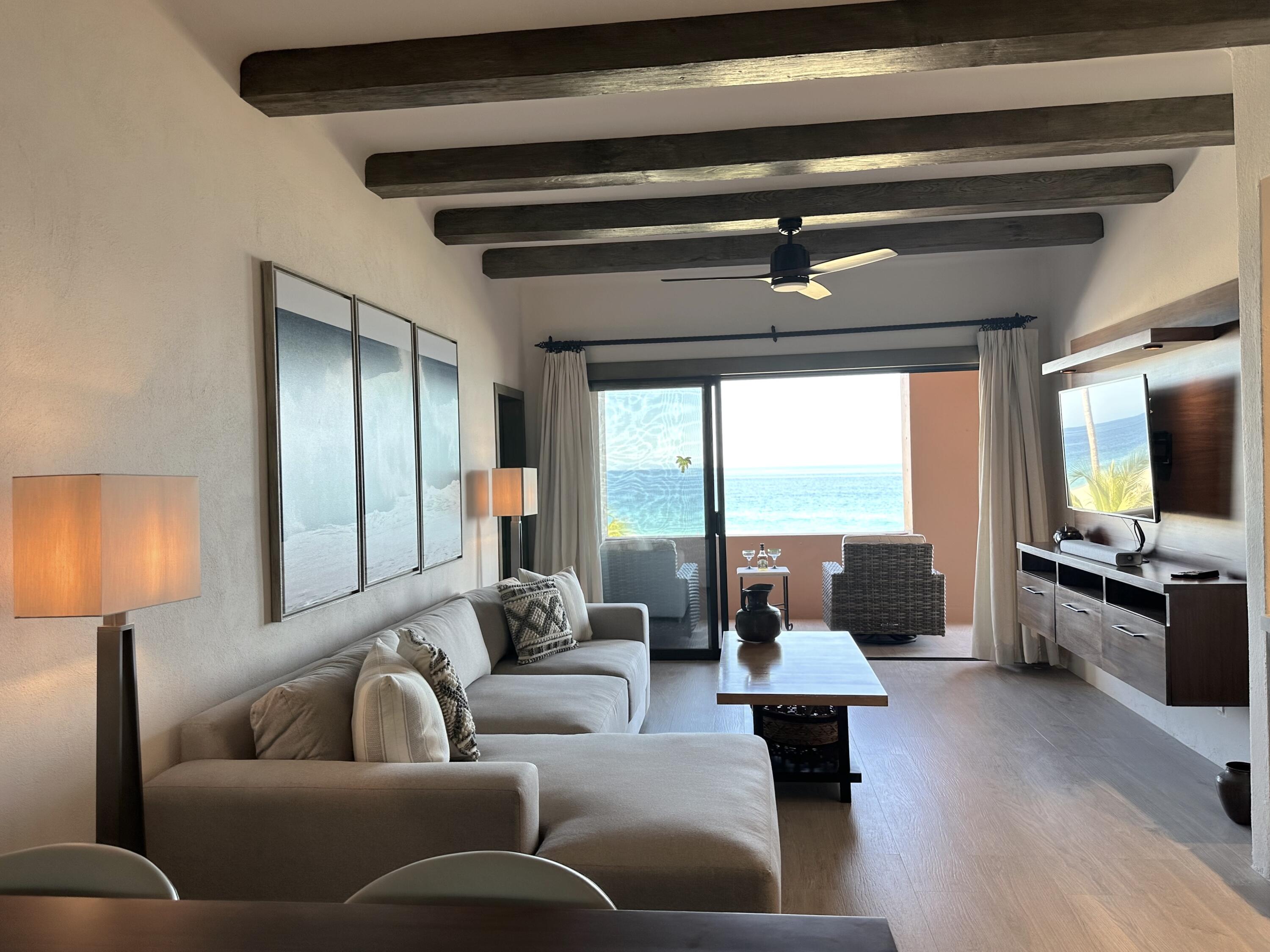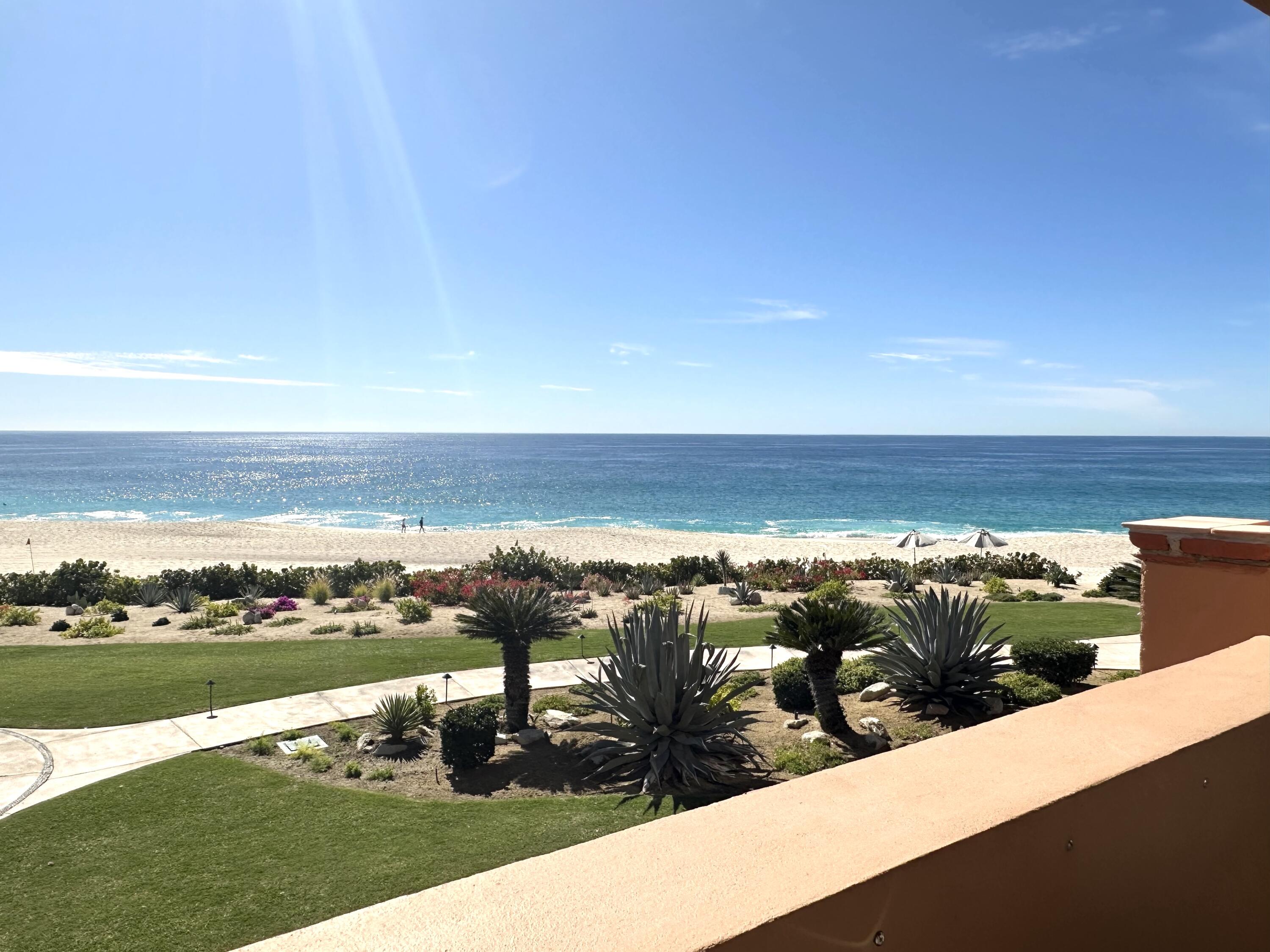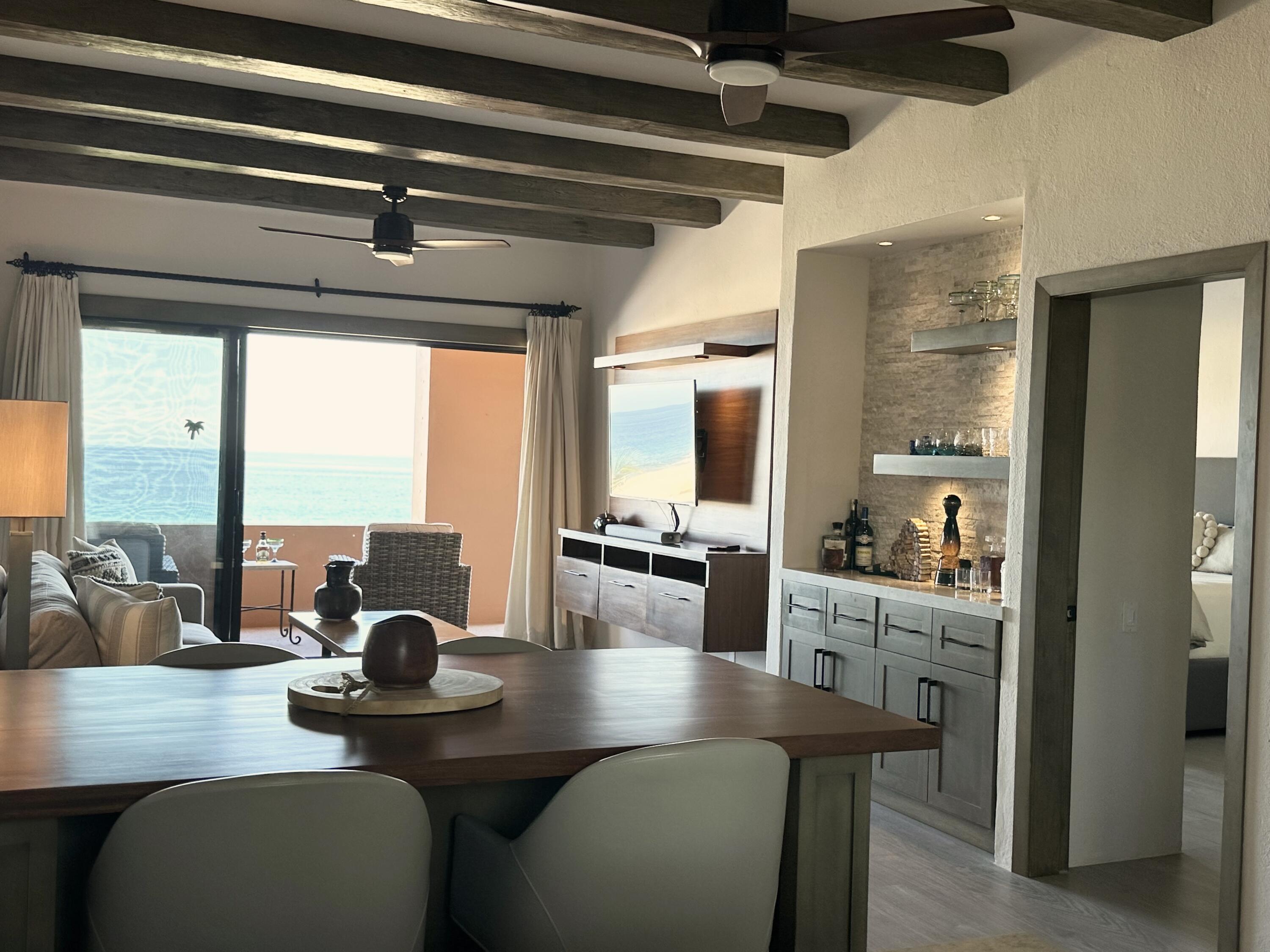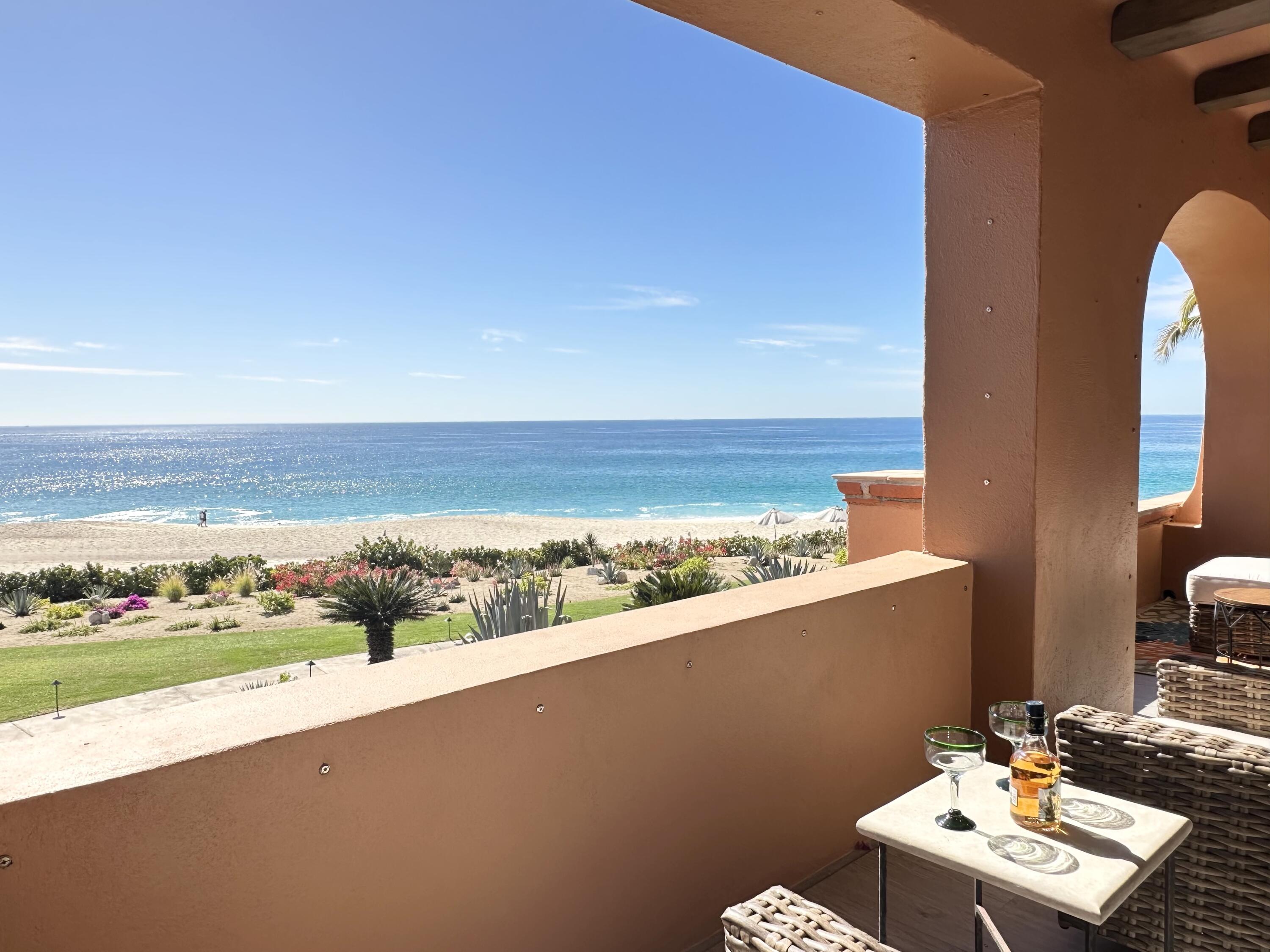 The Oceanfront Estrella 201 is a one-of-a-kind living experience. The fully renovated property boasts a modern and contemporary design and offers breathtaking views of the Sea of Cortes. The large living and dining areas, as well as both bedrooms, open onto a spacious terrace where you can watch whales and dolphins, enjoy beautiful sunrises and take walks on the beach to Chileno Bay or El Dorado. Residents of Casa del Mar and Zoetry Resort & Spa have access to amenities like a beach club, 7 pools, 4 tennis courts, a pickle ball court, fire pits, 3 restaurants, a sports bar, a swim-up bar, gym and a spa. Additionally, there is a separate garage available for purchase for $46,000. This is the perfect blend of relaxation and adventure with stunning views and luxurious amenities.