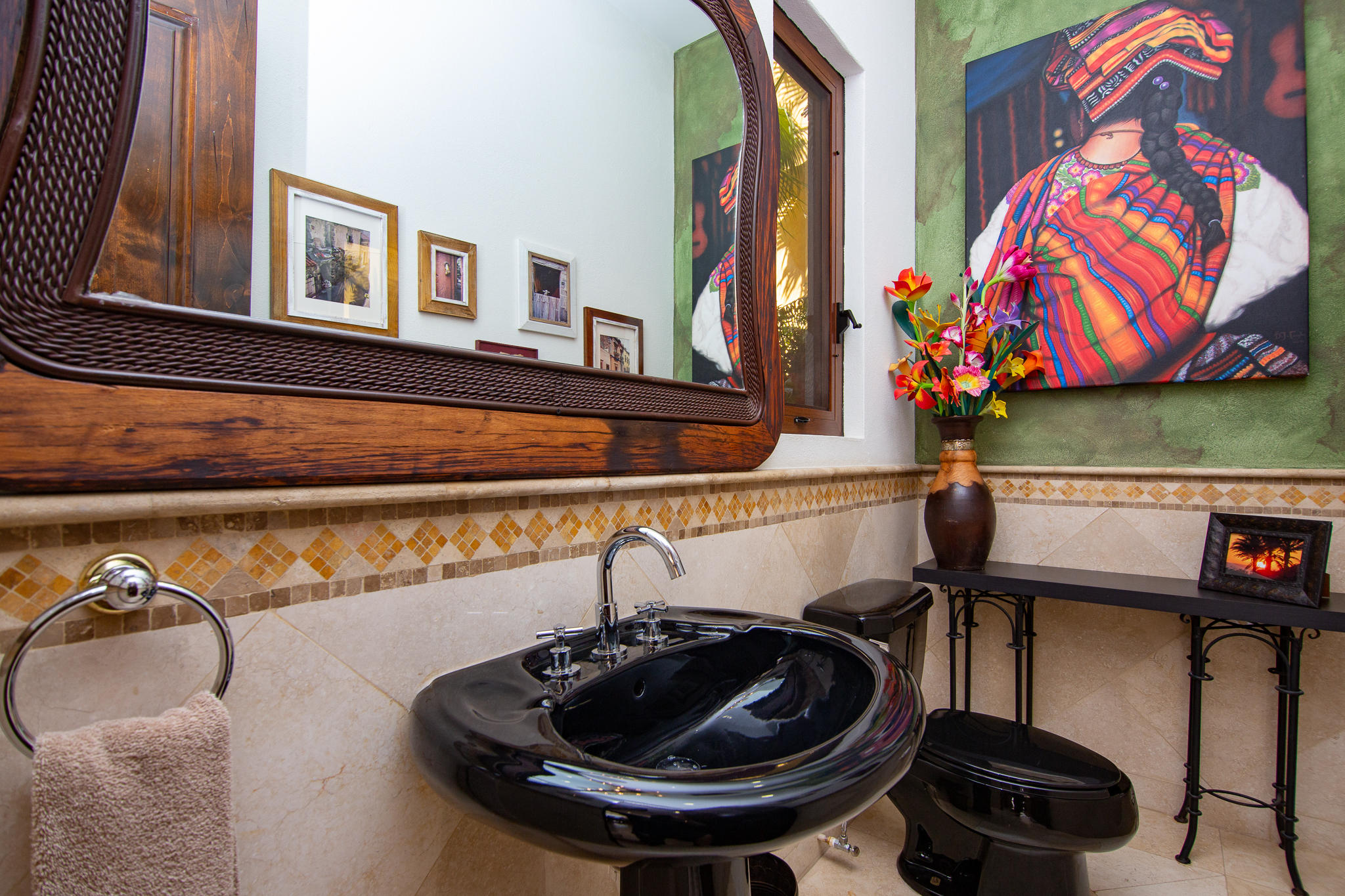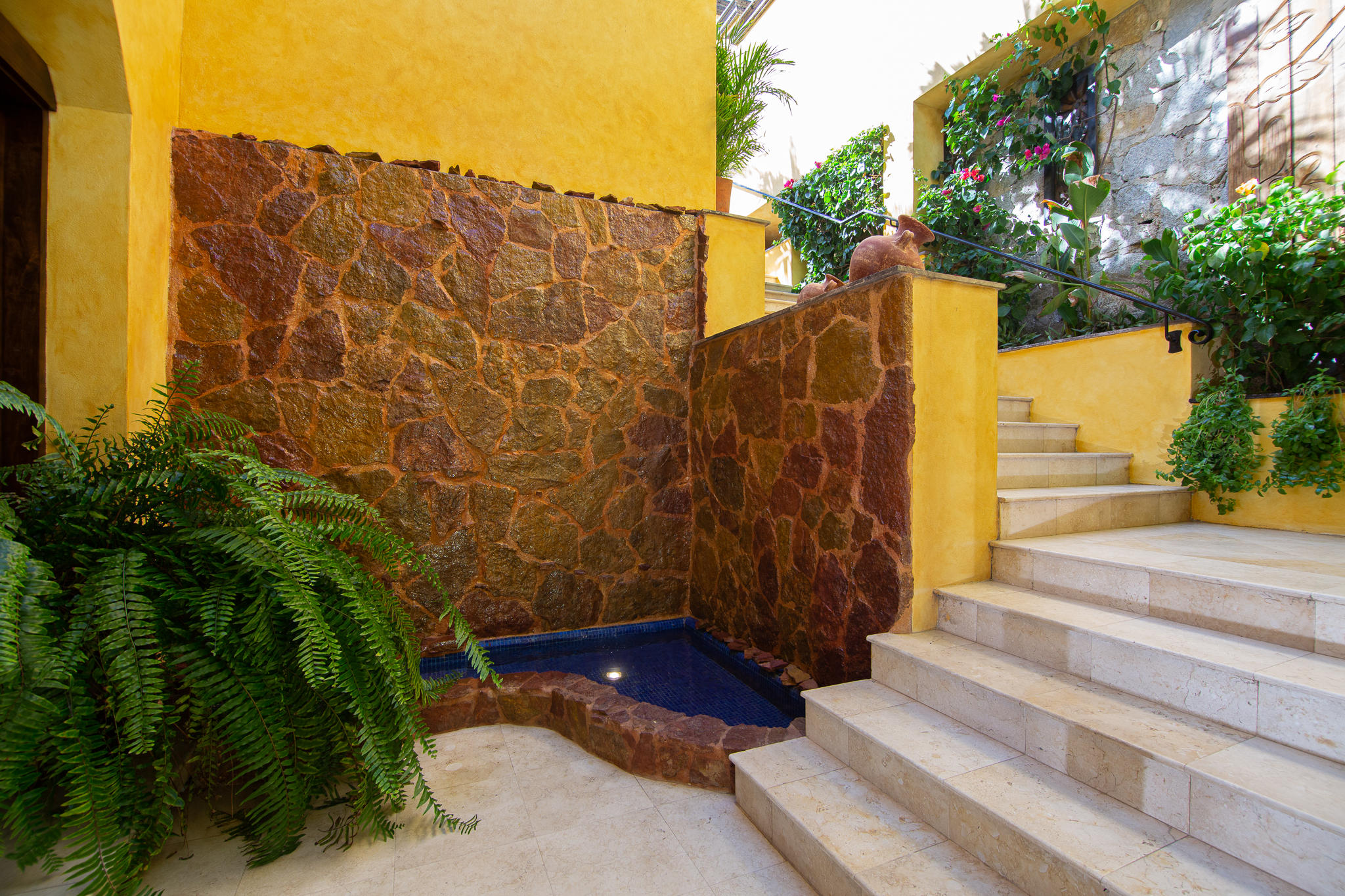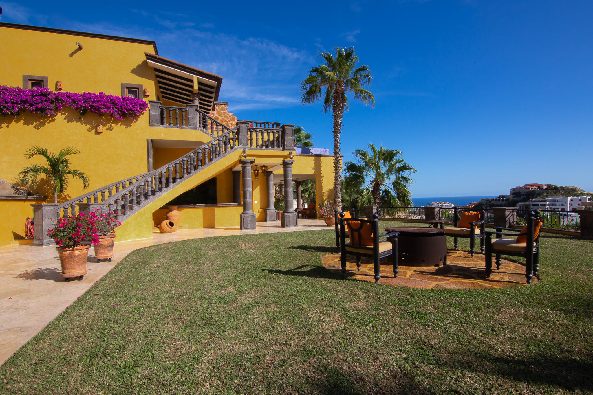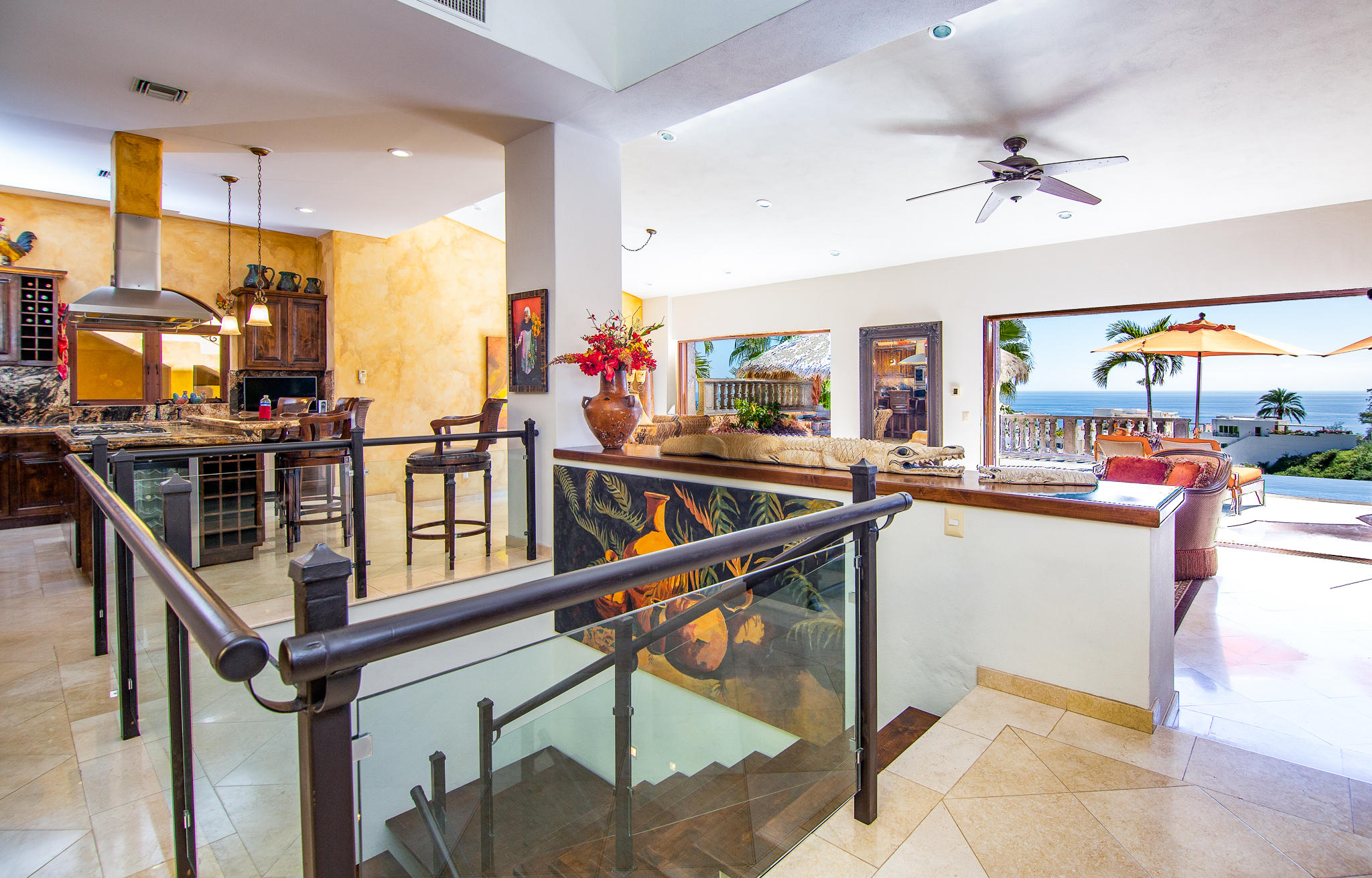 This two story home is located on a double lot with ocean views. Details are perfectly placed and accentuated upon entering the front gate, to the waterfall at the main entrance, to the grand staircase leading to the immaculately landscaped yard with custom fire pit and 5 tiered orchard. Stunning palapa has a full kitchen by the infinity edge pool and jacuzzi. This is a four bedroom home with four and a half baths. The master bedroom upstairs has an outdoor shower. Very well maintained. Priced to sell.