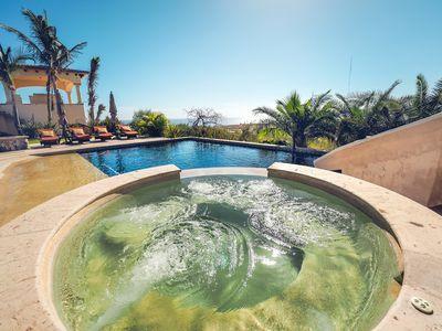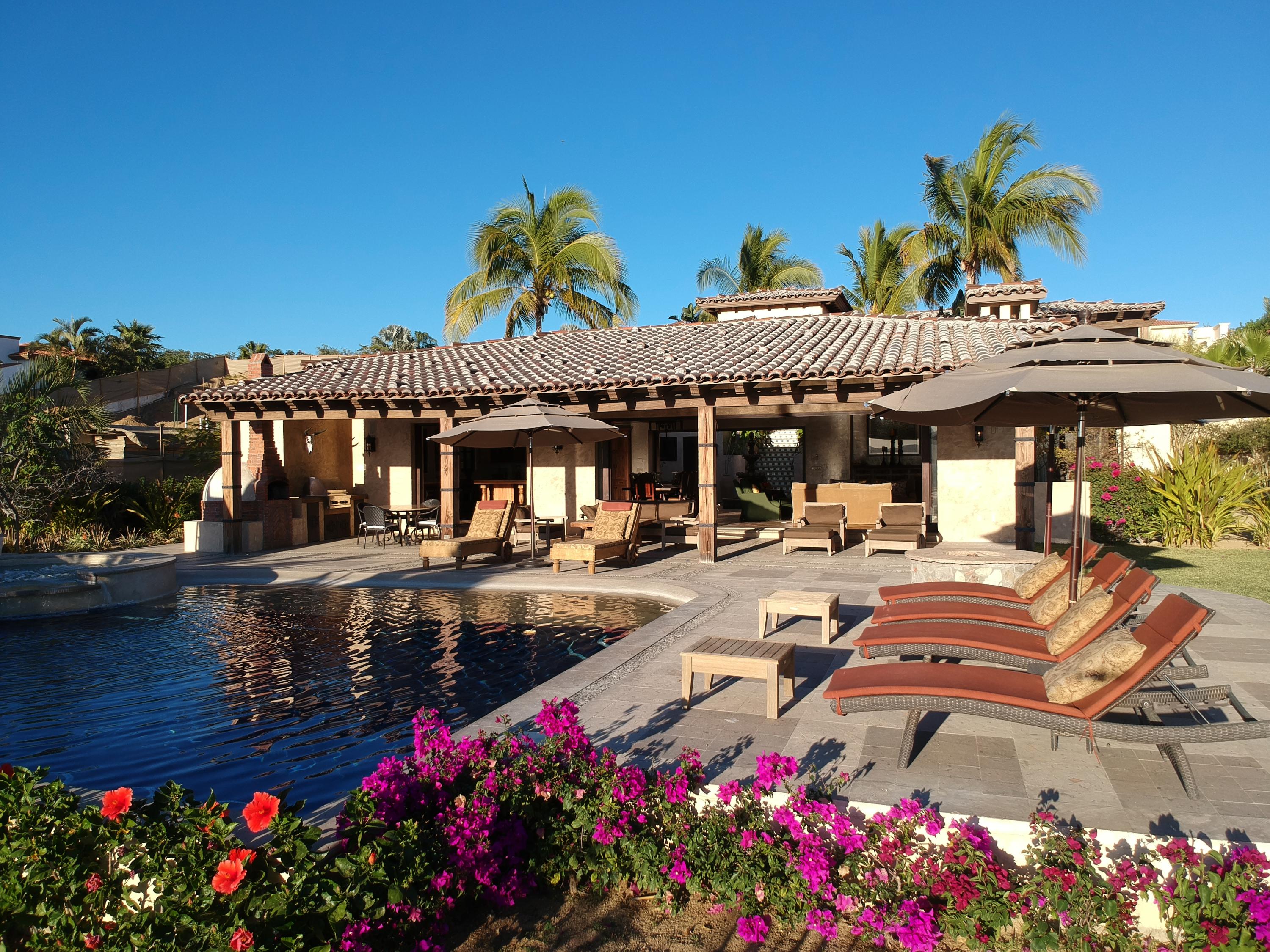 This ocean view 7 bedroom sprawling hacienda-style villa overlooks the 12th fairway of the prestigious Jack Nicklaus/Greg Norman golf course in Puerto Los Cabos. The fabulous outdoor patio with magnificent pool accompanied with pool slide, spa, wood burning oven and fire pit makes this the perfect villa for entertaining while watching the sunset over the marina and sparkle of downtown San Jose. Great rental potential. Golf and beach club memberships are available
