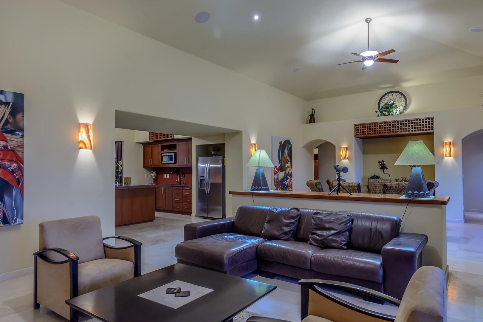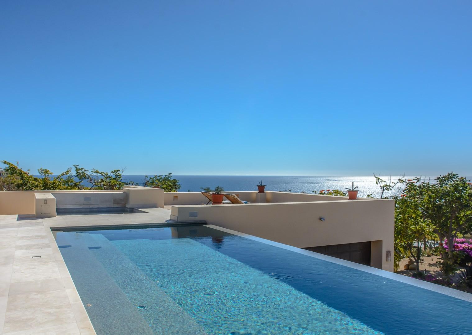 Big Sea of Cortez views and expansive indoor/outdoor living mark this modern home in the gated Fundadores community in Puerto Los Cabos. An open concept floor plan includes a Master Suite wing with ensuite bath and a large private office. On the opposite side of the great room, two guest suites, one with ocean views both include indoor/outdoor showers. Through a separate entrance on a lower level, a one bedroom apartment, complete with kitchen, bedroom, sitting room, bath and laundry may be used for guests or live-in caretakers. Pool, Jacuzzi and a pool / patio with plenty of room for enjoying the sun by day and the stars by night. Barbecue cook center and two car garage plus all the amenities of Puerto Los Cabos including membership to the private Fundadores Beach Club.