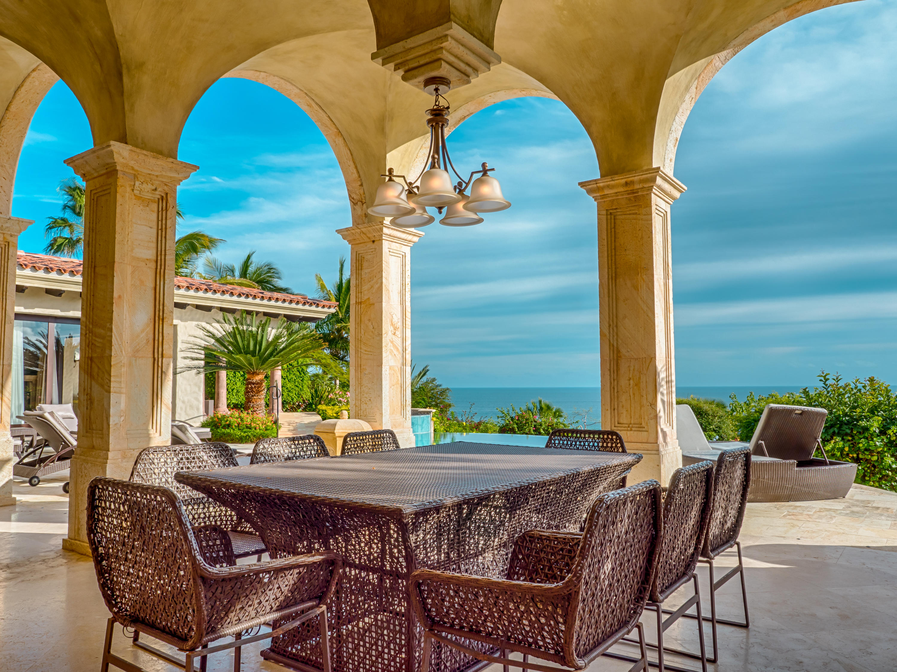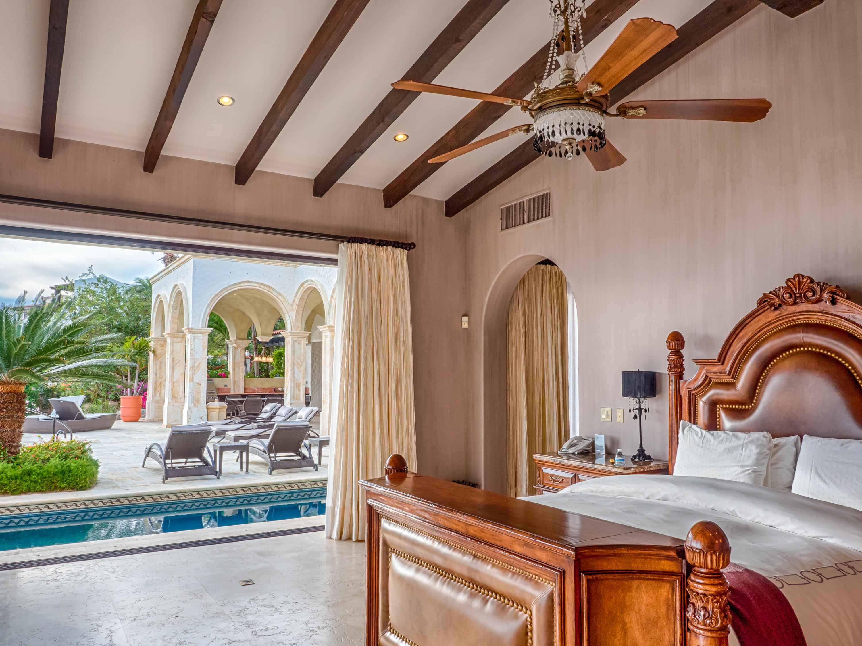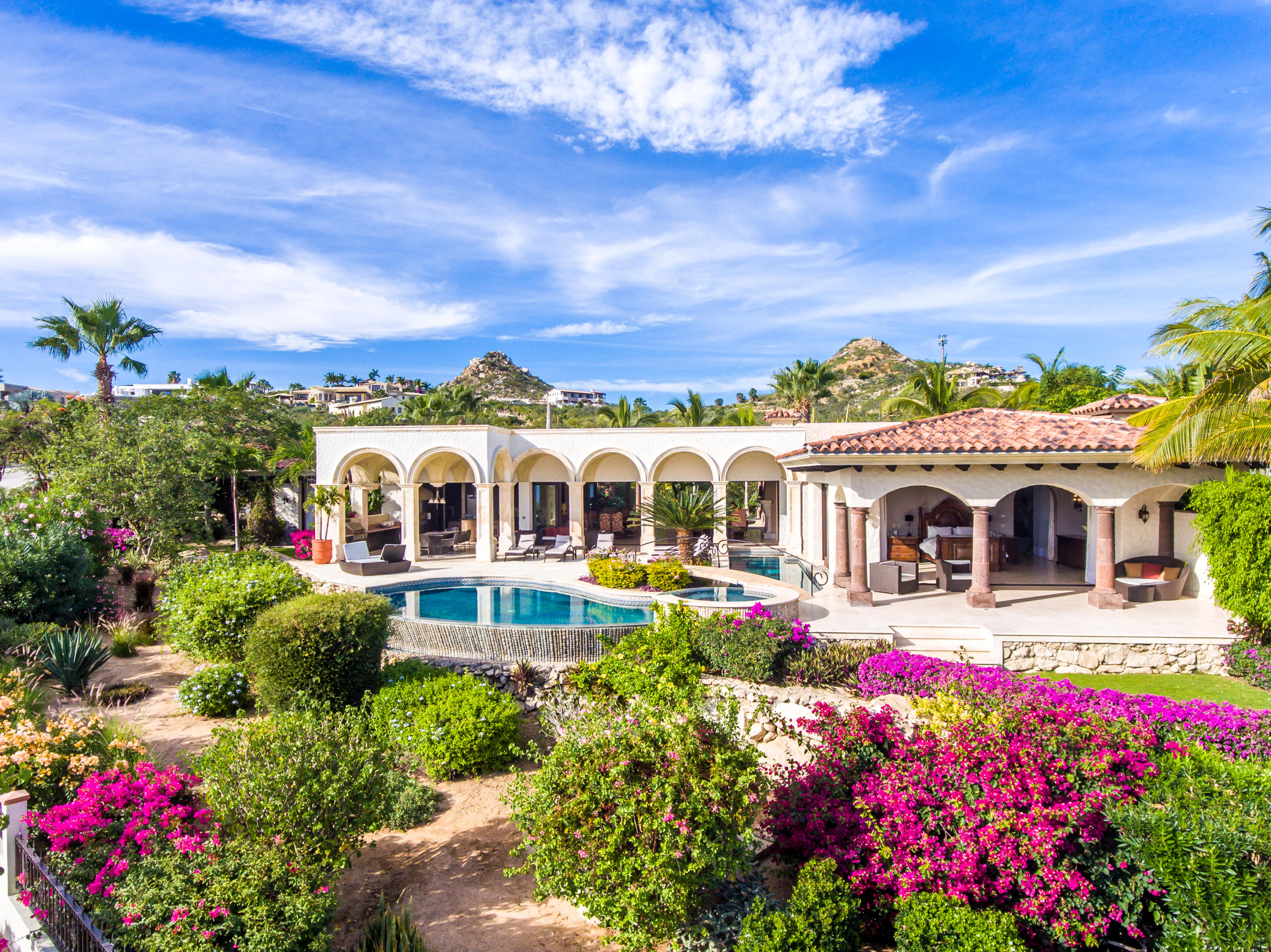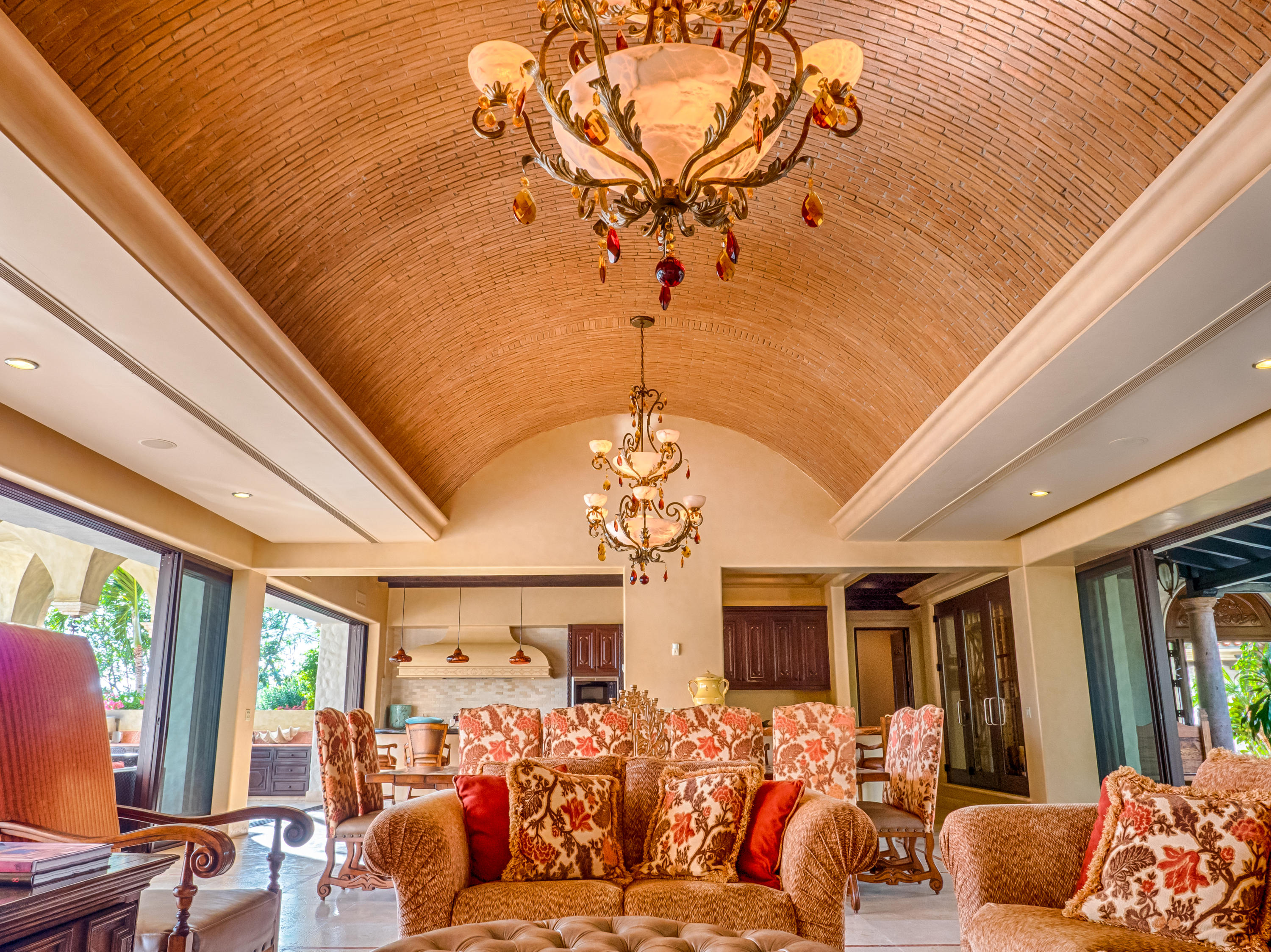 Casa Lieber, located in Fundadores – Puerto Los Cabos, sits on over half of an acre of lush landscaping, second row from the beach. A palatial living wall at the entry sets a distinctive tone that this 4-bedroom, 4-bathroom, 12,000-square-foot villa. Double master suites set the tone for relaxation; customized en-suite bathrooms with floor-to-ceiling Sicis mosaics and rainfall shower in one and a vintage copper bathtub in the other. The indoor-outdoor Baja lifestyle is showcased with fully retracting sliding pocket doors that reveal an elegant dining room with Terra Cota marble throughout and gorgeous fireplace under a grand brick barrel-vault ceiling. A stunning arcade veranda expands the living space with steps that lead directly into the infinity-edge lap pool and spa.