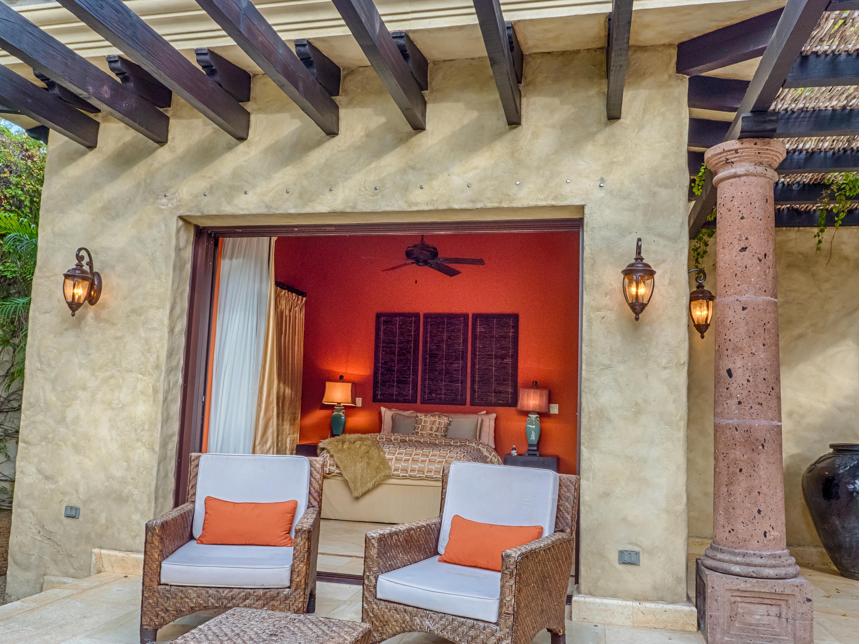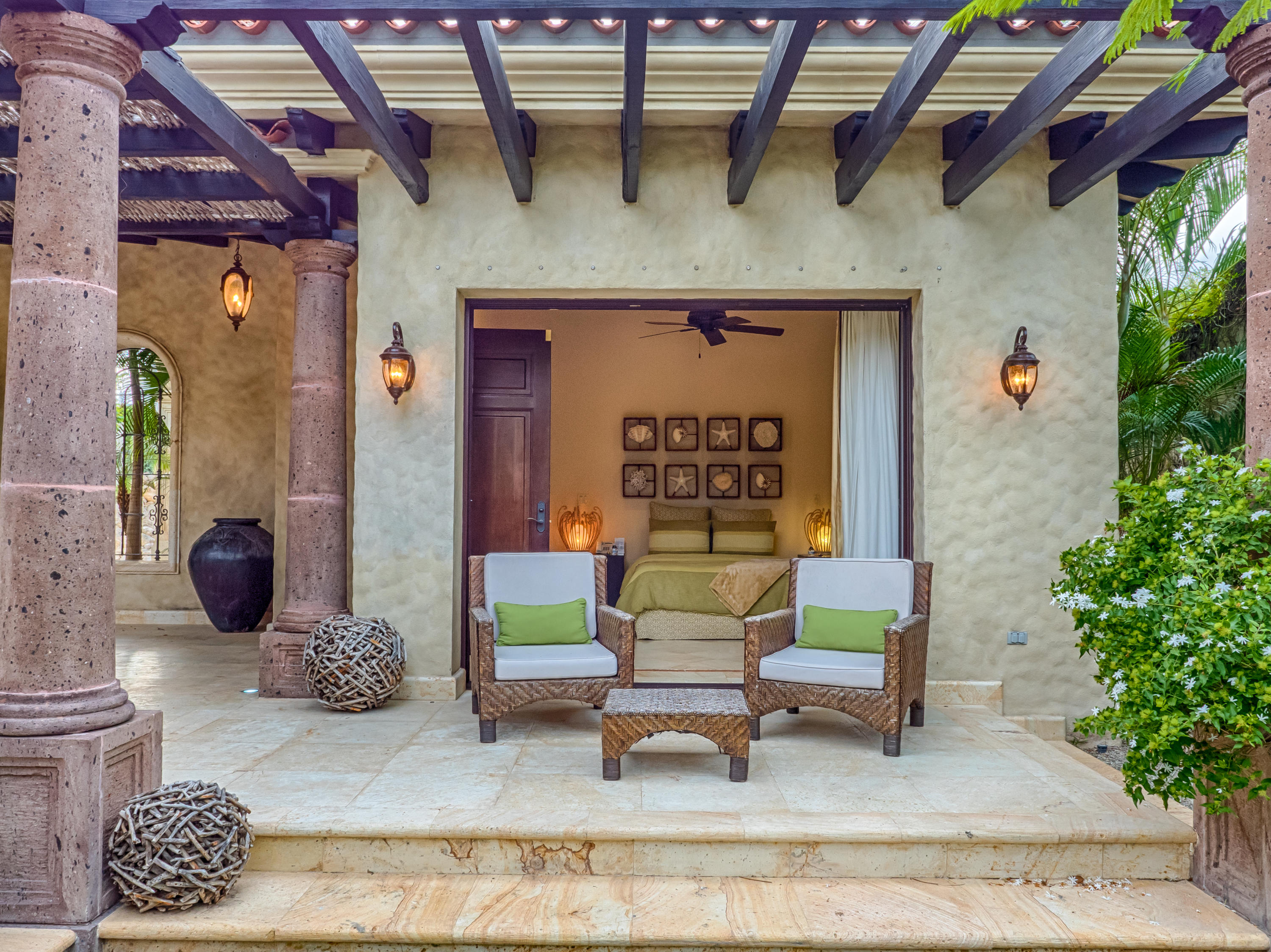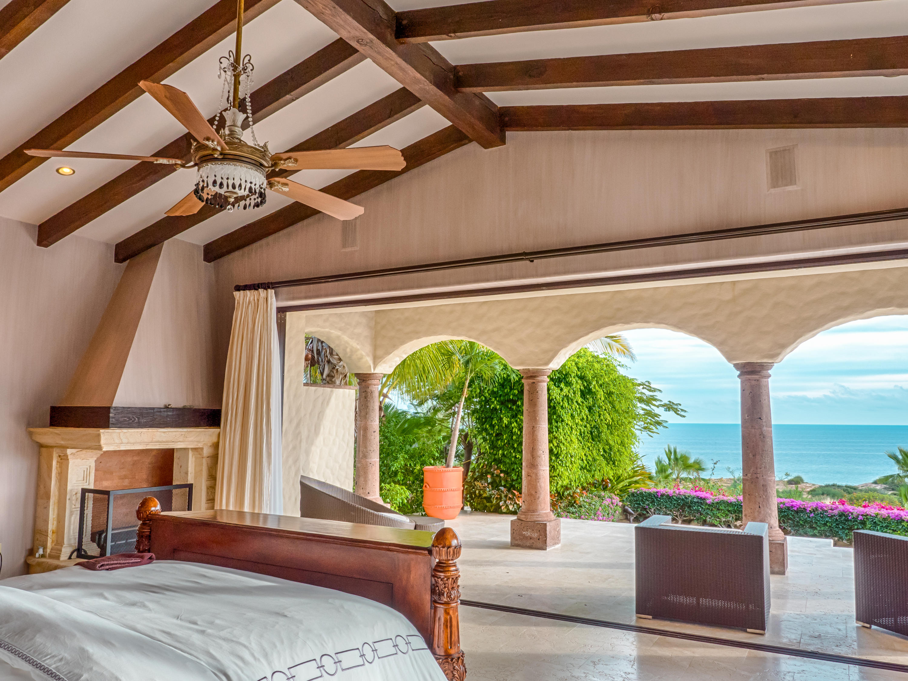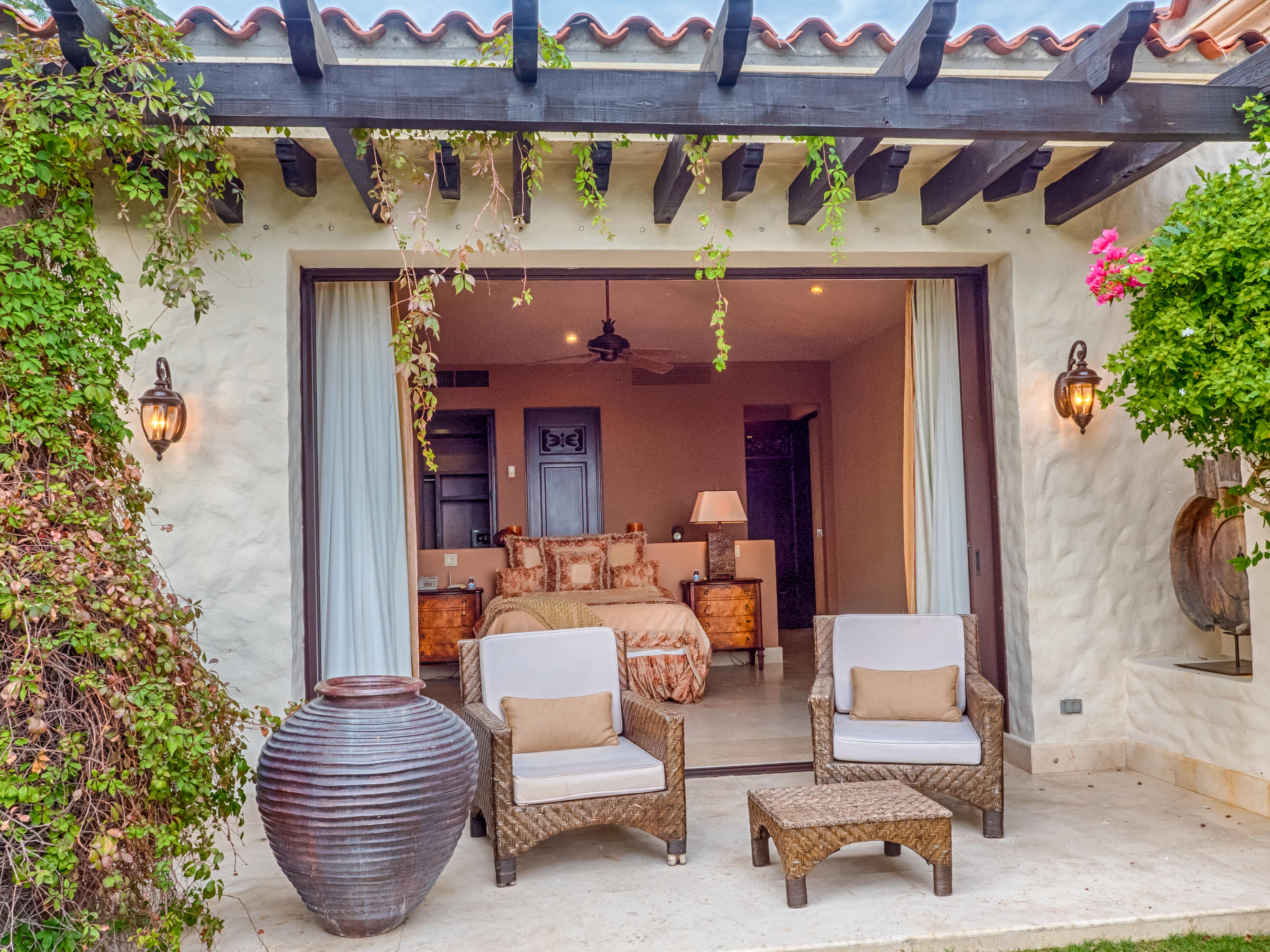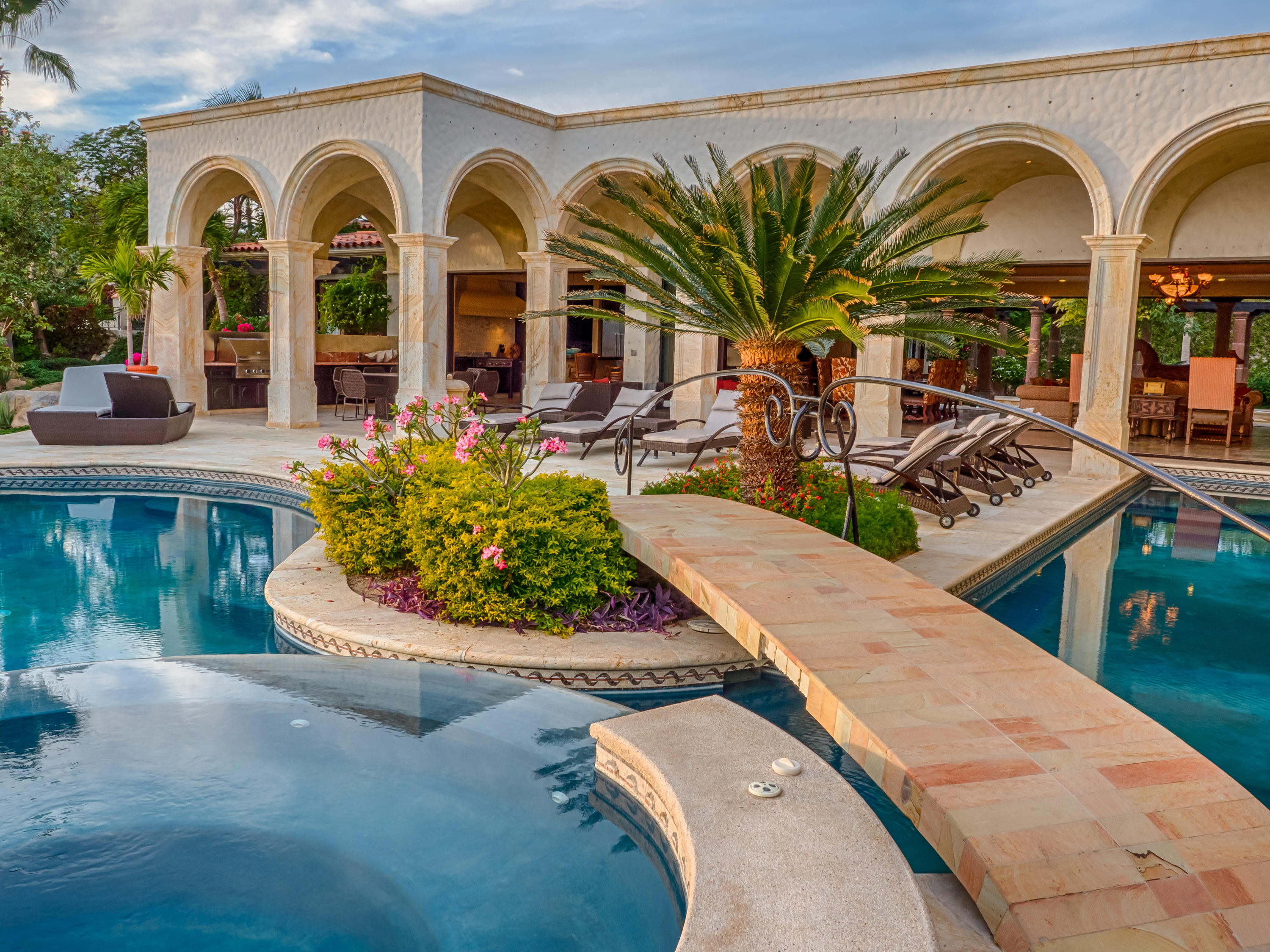 Casa Lieber, located in Fundadores – Puerto Los Cabos, sits on over half of an acre of lush landscaping, second row from the beach. A palatial living wall at the entry sets a distinctive tone that this 4-bedroom, 4-bathroom, 12,000-square-foot villa. Double master suites set the tone for relaxation; customized en-suite bathrooms with floor-to-ceiling Sicis mosaics and rainfall shower in one and a vintage copper bathtub in the other. The indoor-outdoor Baja lifestyle is showcased with fully retracting sliding pocket doors that reveal an elegant dining room with Terra Cota marble throughout and gorgeous fireplace under a grand brick barrel-vault ceiling. A stunning arcade veranda expands the living space with steps that lead directly into the infinity-edge lap pool and spa.