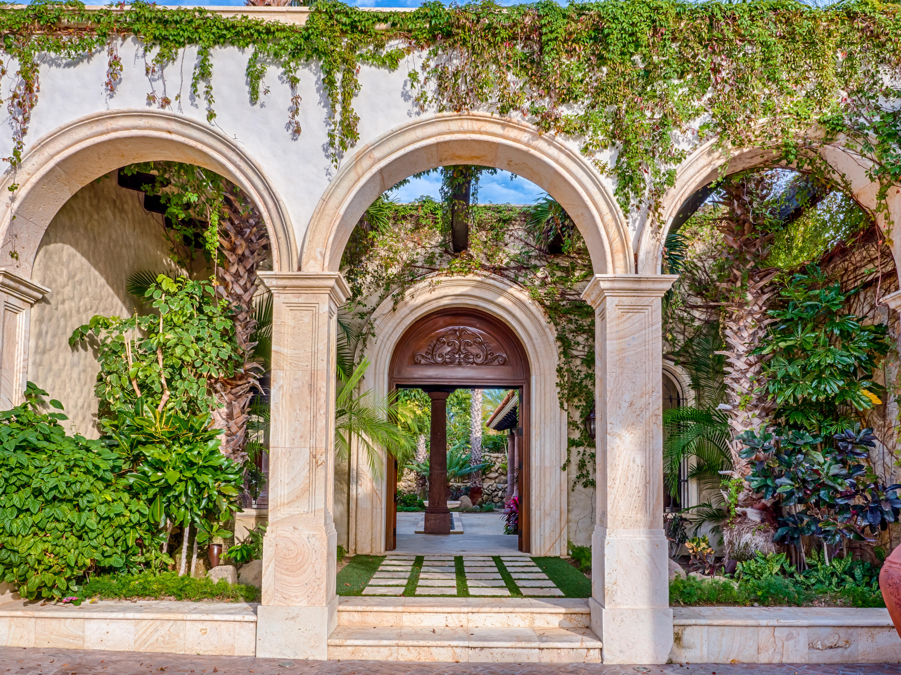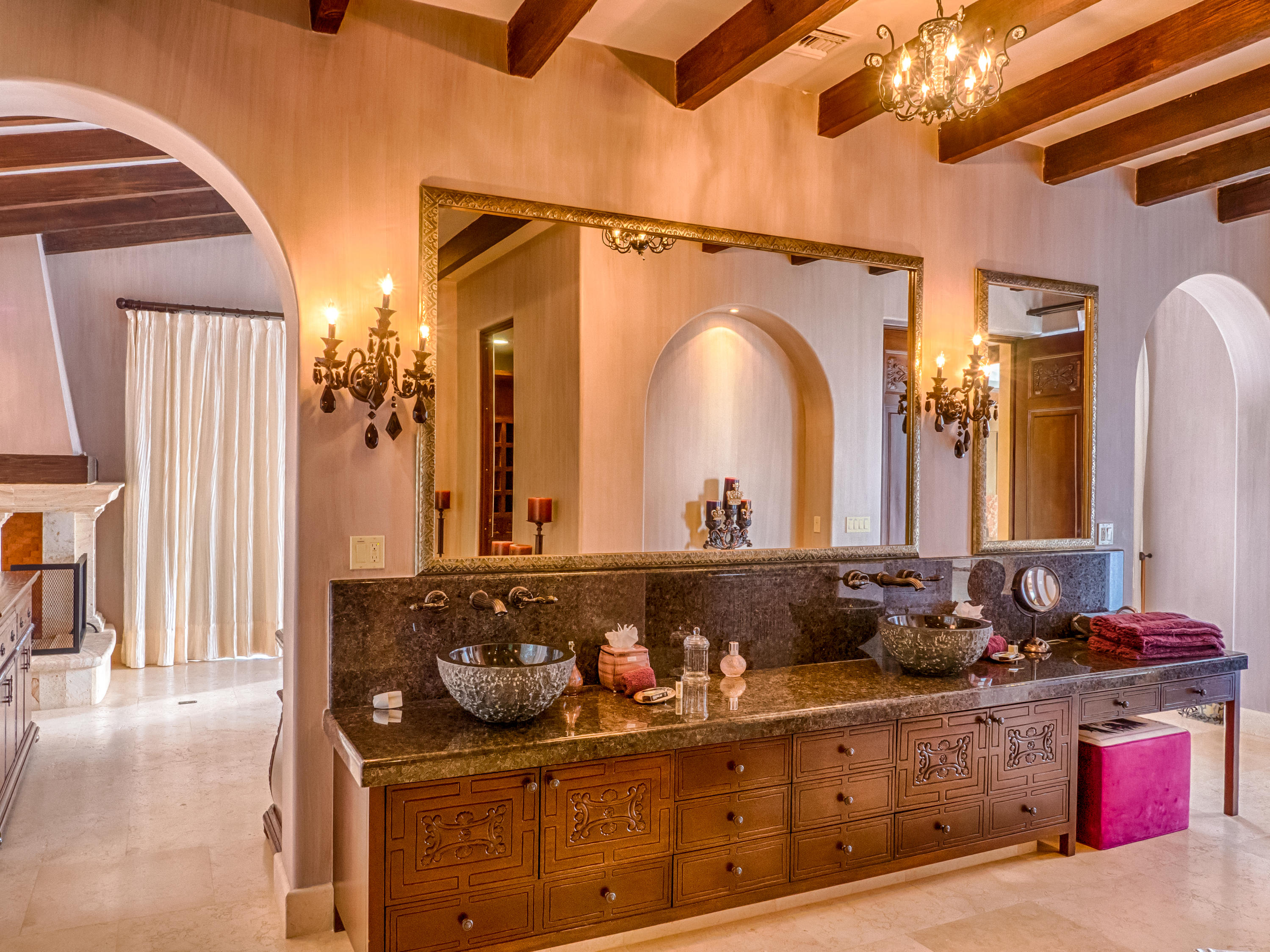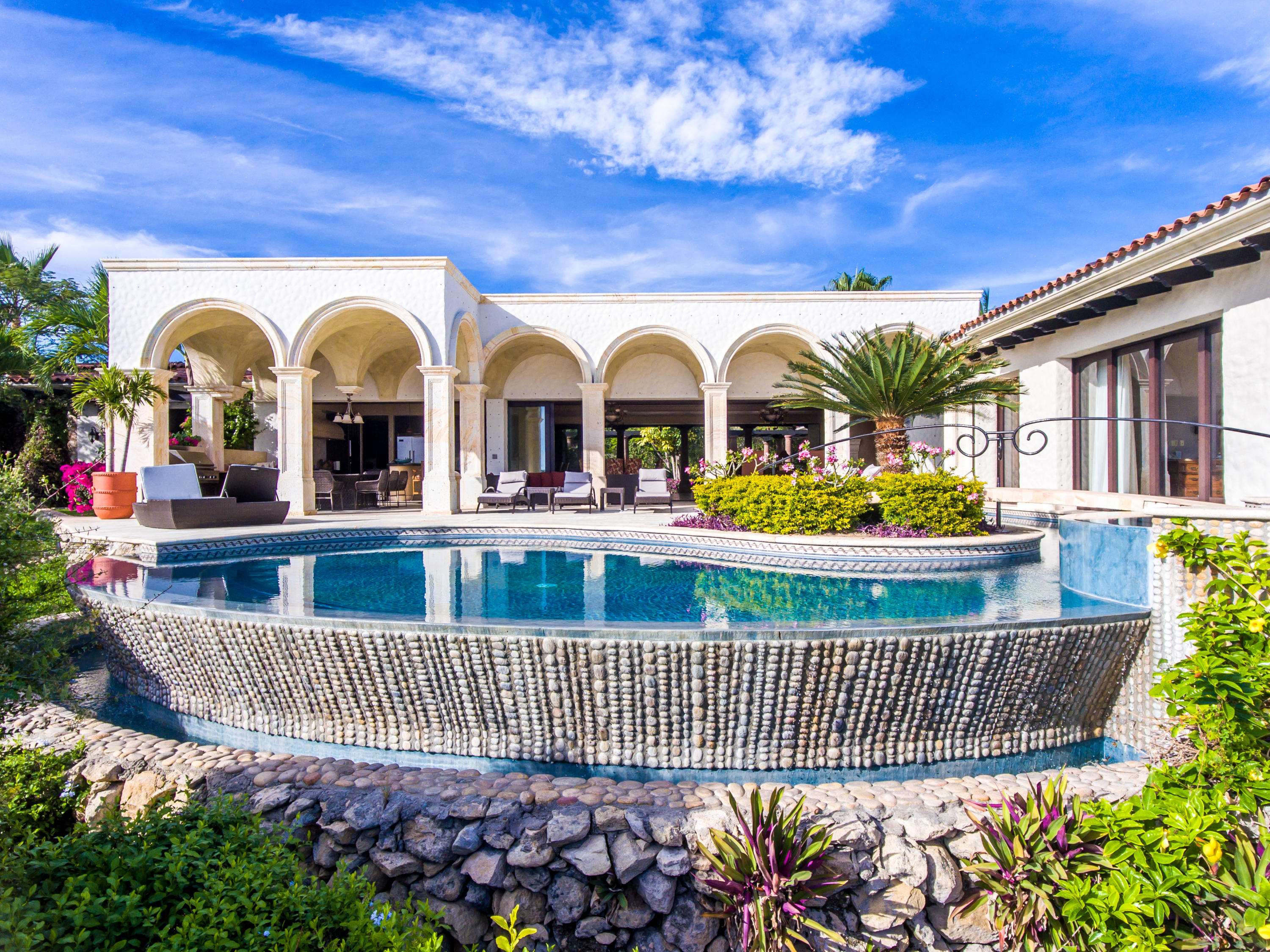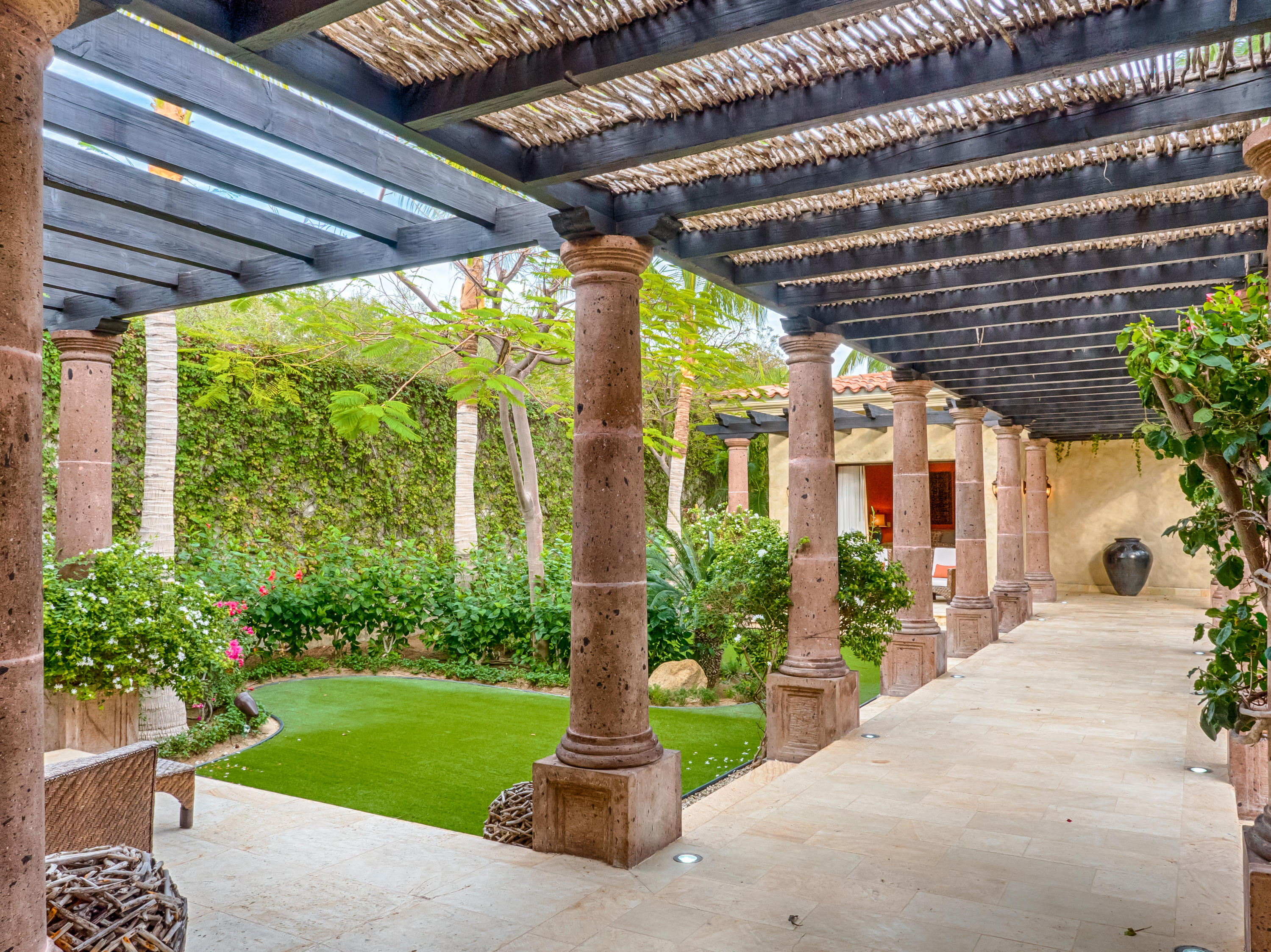Casa Lieber, located in Fundadores – Puerto Los Cabos, sits on over half of an acre of lush landscaping, second row from the beach. A palatial living wall at the entry sets a distinctive tone that this 4-bedroom, 4-bathroom, 12,000-square-foot villa. Double master suites set the tone for relaxation; customized en-suite bathrooms with floor-to-ceiling Sicis mosaics and rainfall shower in one and a vintage copper bathtub in the other. The indoor-outdoor Baja lifestyle is showcased with fully retracting sliding pocket doors that reveal an elegant dining room with Terra Cota marble throughout and gorgeous fireplace under a grand brick barrel-vault ceiling. A stunning arcade veranda expands the living space with steps that lead directly into the infinity-edge lap pool and spa.