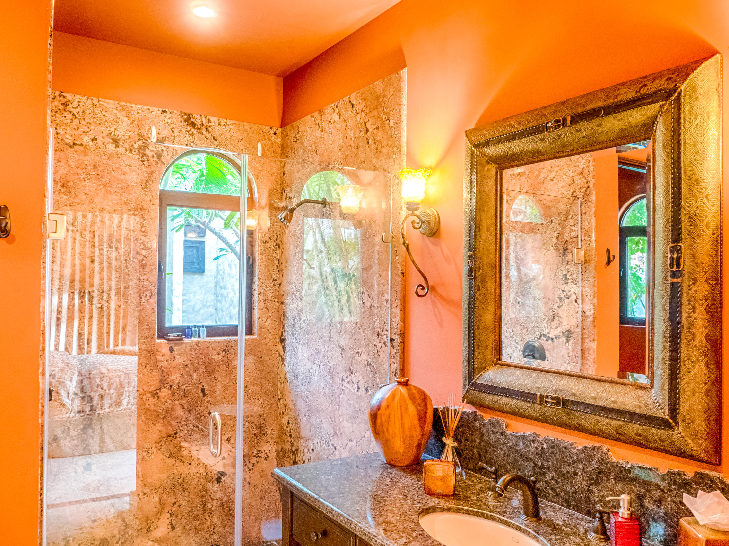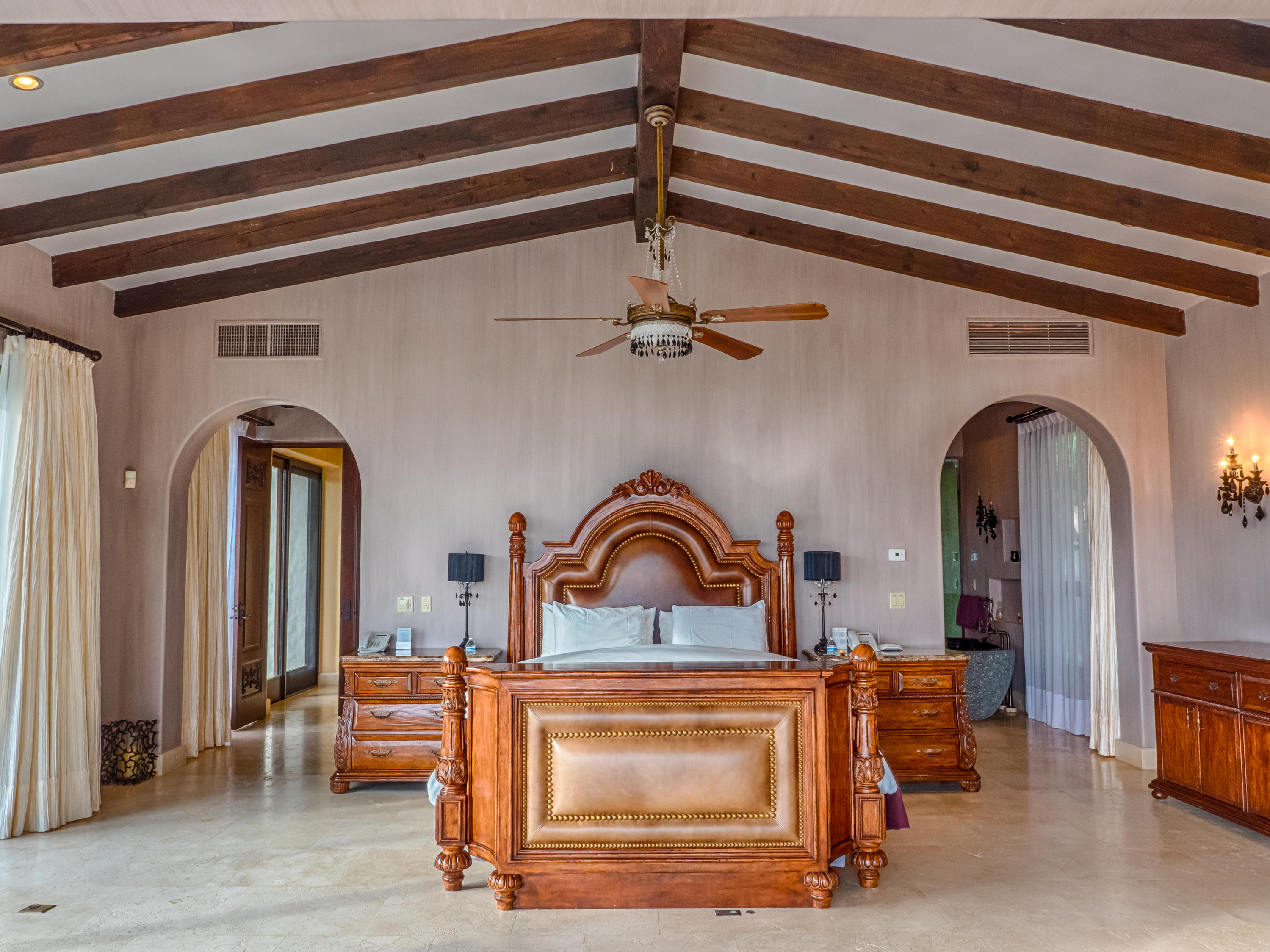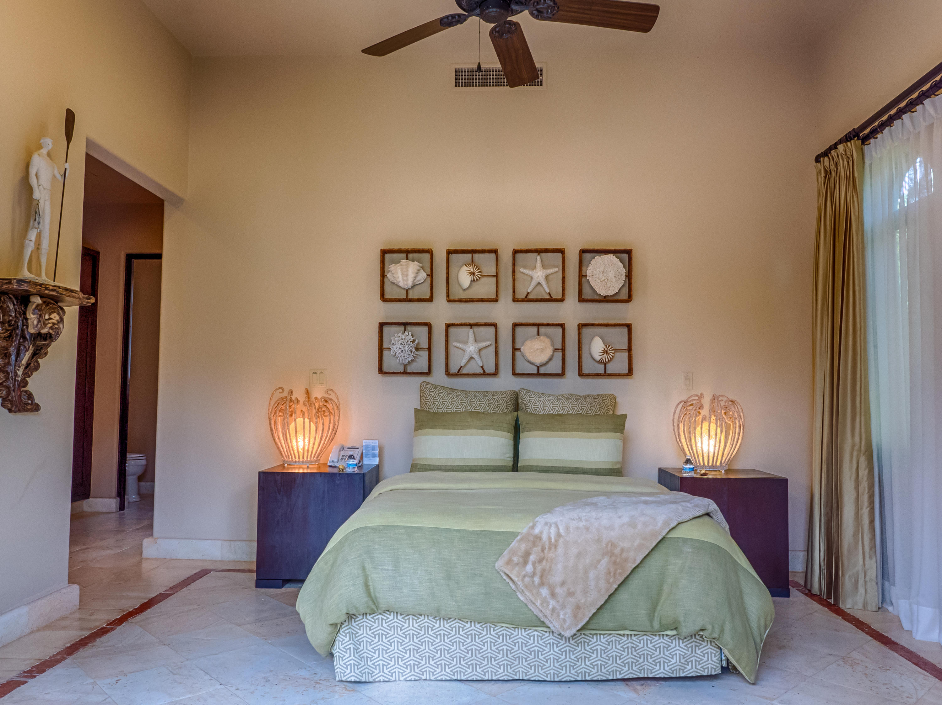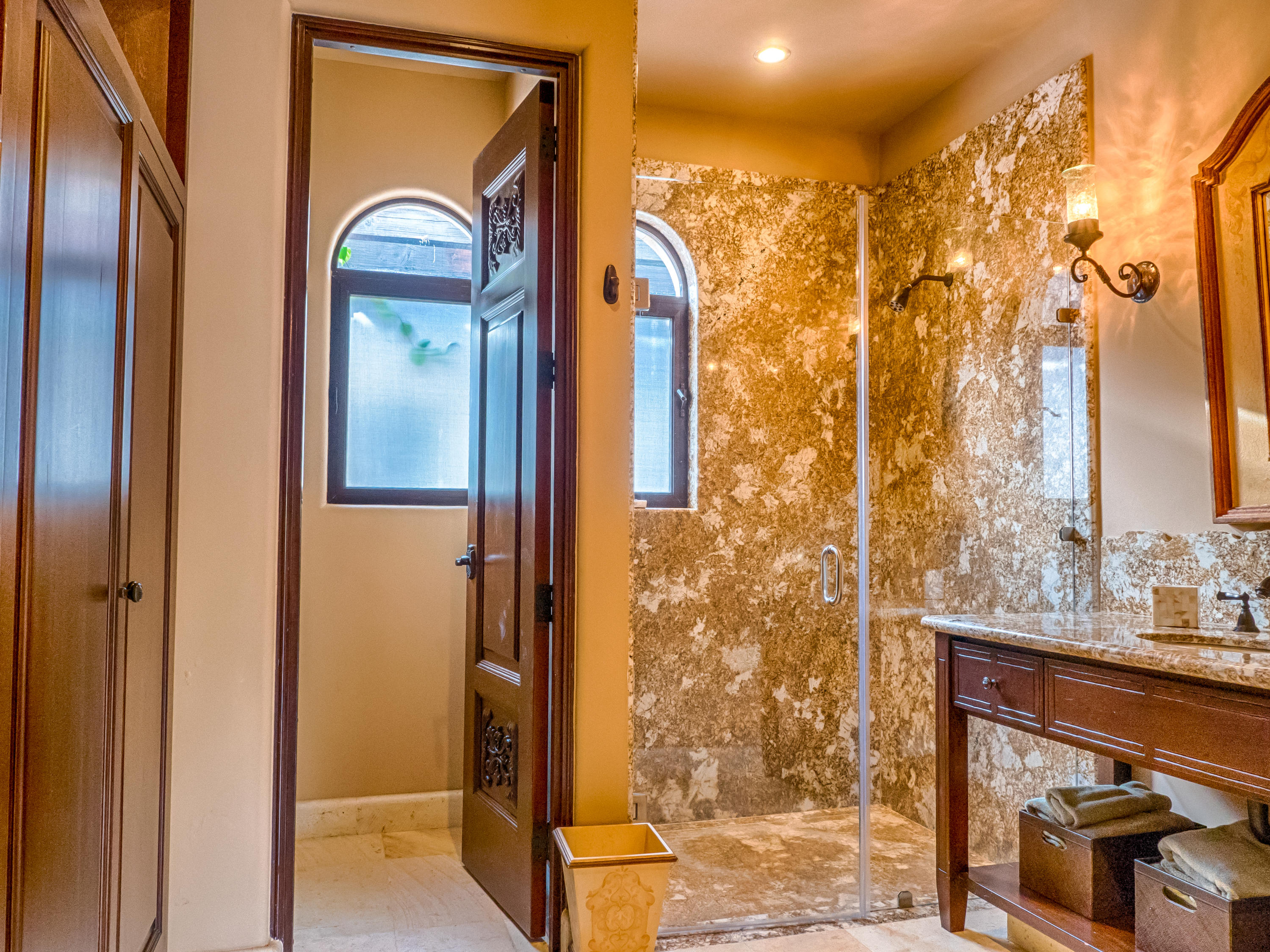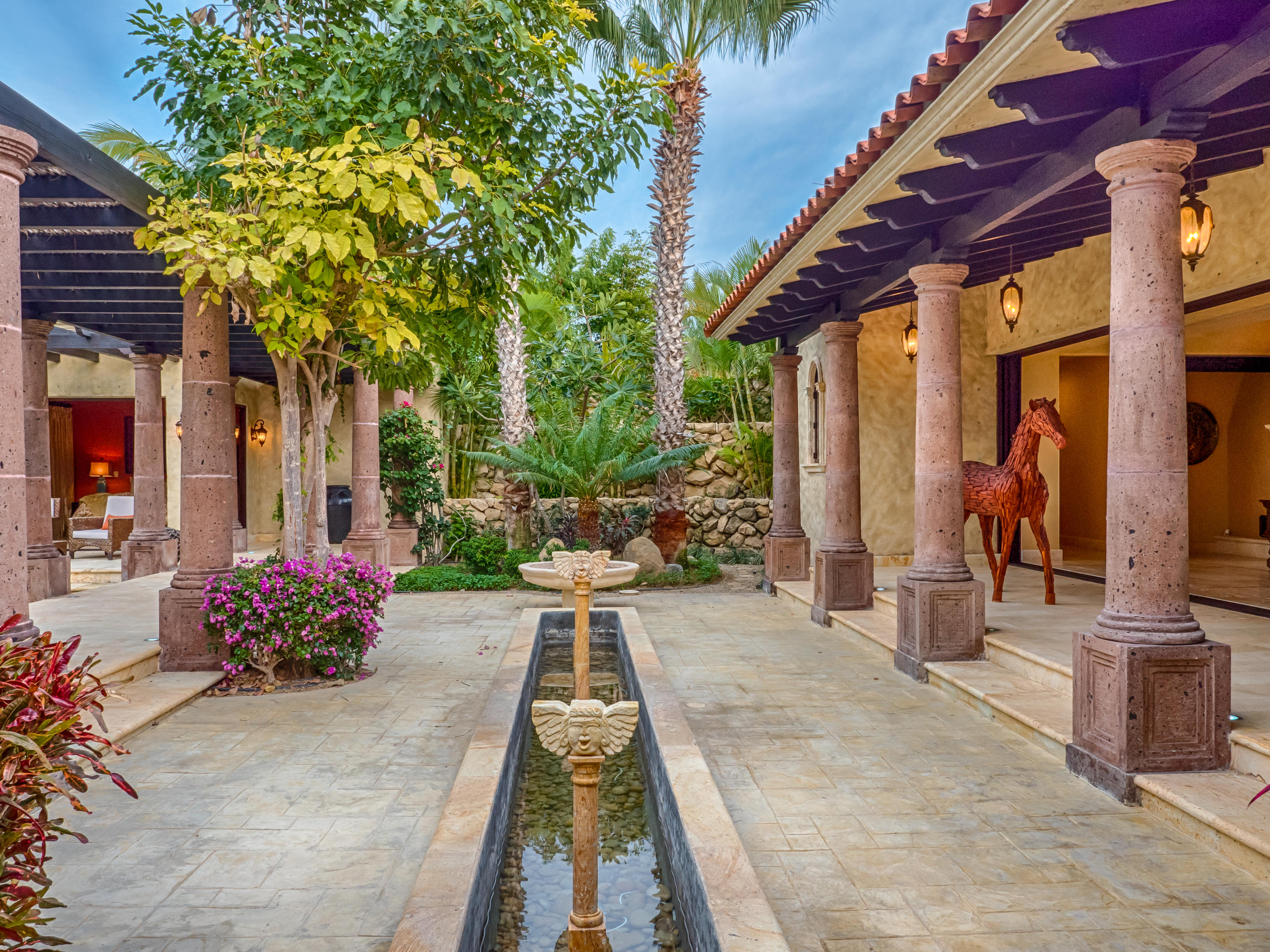 Casa Lieber, located in Fundadores – Puerto Los Cabos, sits on over half of an acre of lush landscaping, second row from the beach. A palatial living wall at the entry sets a distinctive tone that this 4-bedroom, 4-bathroom, 12,000-square-foot villa. Double master suites set the tone for relaxation; customized en-suite bathrooms with floor-to-ceiling Sicis mosaics and rainfall shower in one and a vintage copper bathtub in the other. The indoor-outdoor Baja lifestyle is showcased with fully retracting sliding pocket doors that reveal an elegant dining room with Terra Cota marble throughout and gorgeous fireplace under a grand brick barrel-vault ceiling. A stunning arcade veranda expands the living space with steps that lead directly into the infinity-edge lap pool and spa.