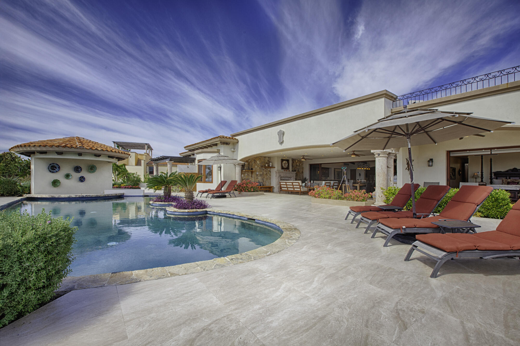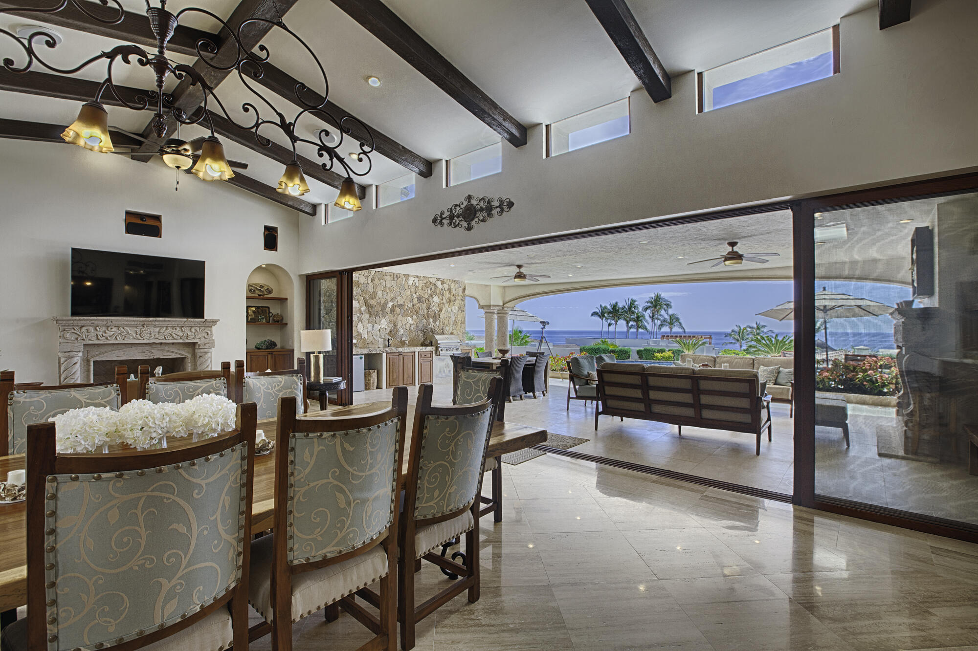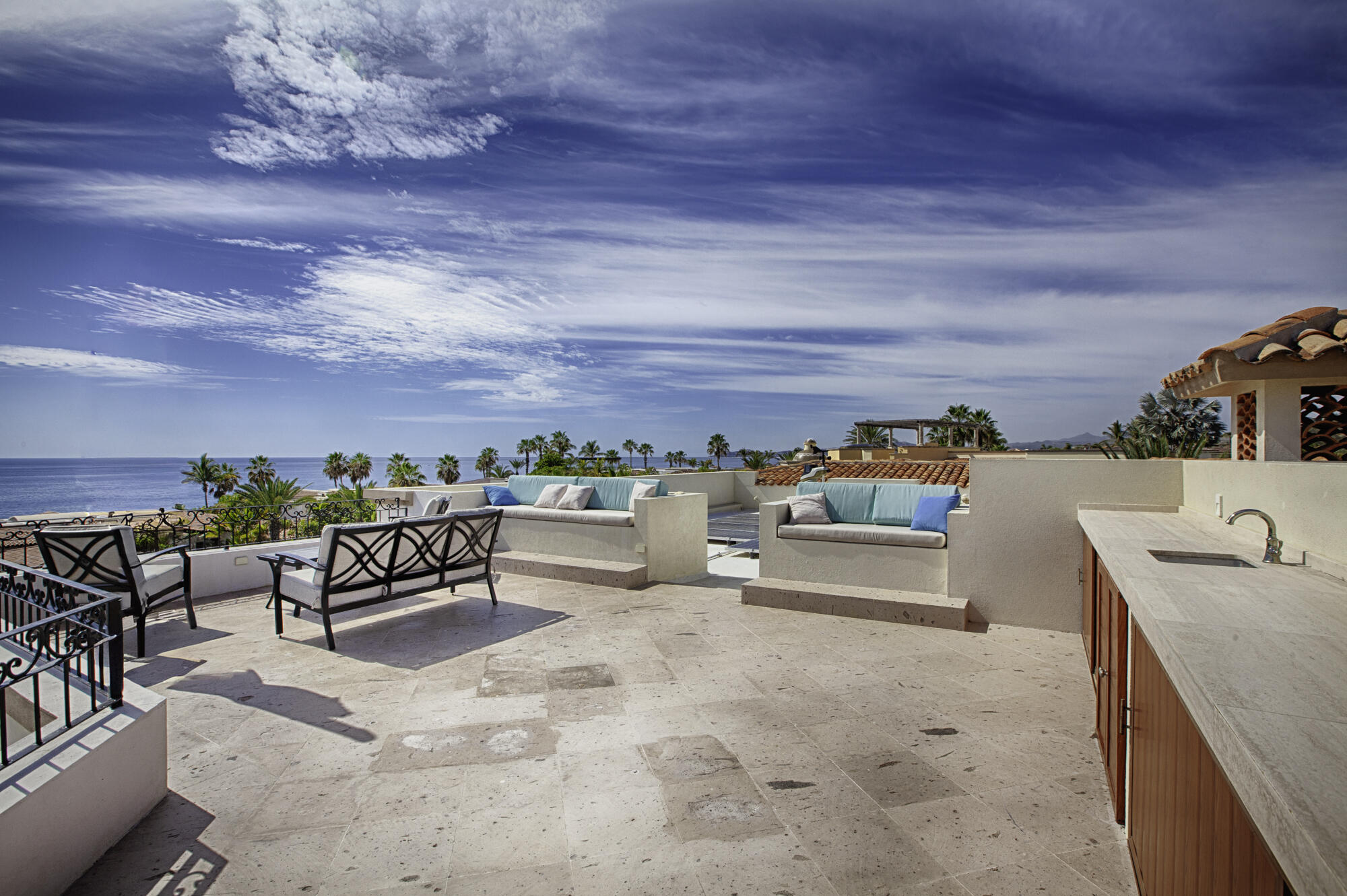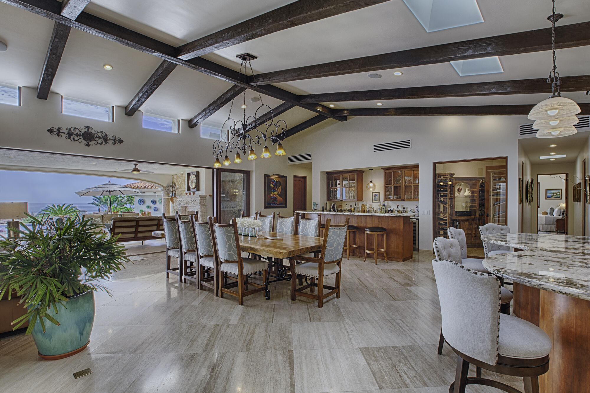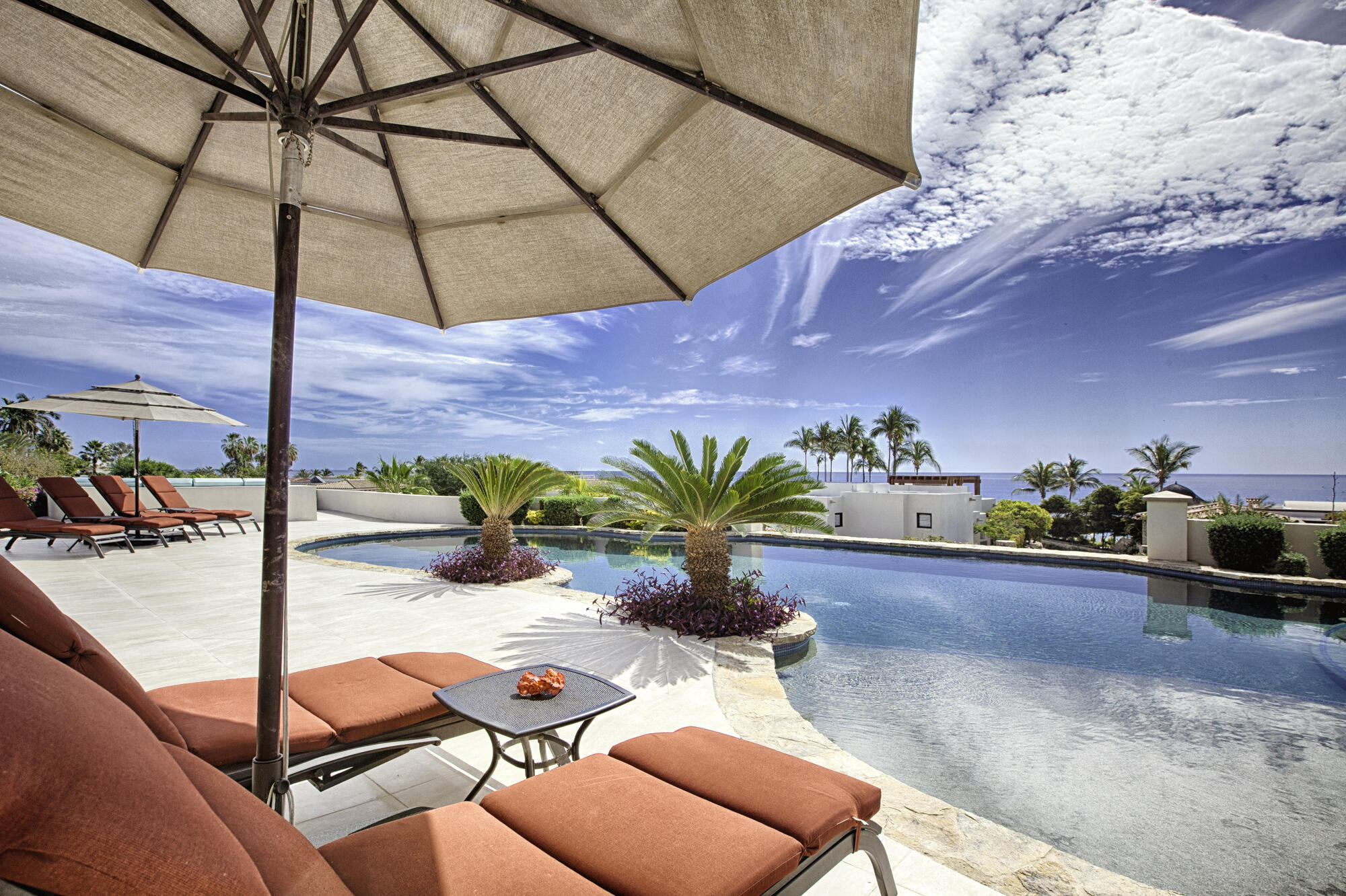 A private coastal sanctuary is this newer 2nd row oceanfront villa meticulously maintained for supreme privacy & luxury. Tranquil cul-de-sac, no thru traffic, beach access across street, easy walk to private Beach Club. 5 bedrooms w/ en-suite baths (one serves as office), 2 half baths, big ocean views from nearly every room. Epic outdoor retreat: expansive terraces with large pool and swim-up bar, Jacuzzi, firepit, rooftop terrace offering 360 ocean & mountain views. Large-shaded outdoor living/dining w/fireplace, gourmet outdoor BBQ kitchen. Home features breathtaking Custom Parota wood wine room, premium 4K theater, elegant custom bar w/appliances. Single-story, flooded with natural light via windows & skylights, 29 solar panels, ultra-low bills, on-demand water heaters, and more.