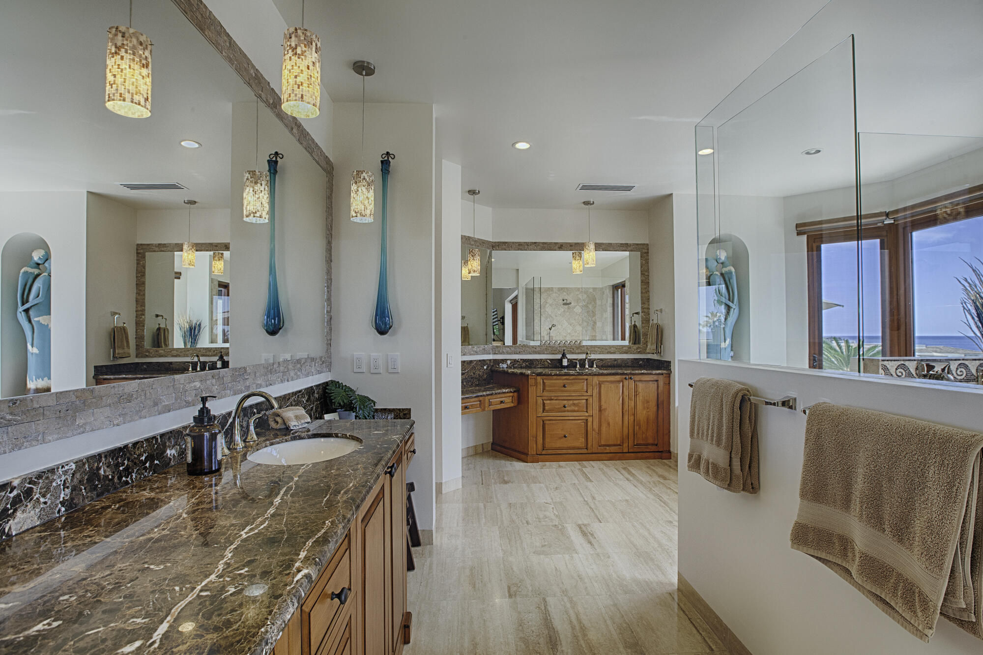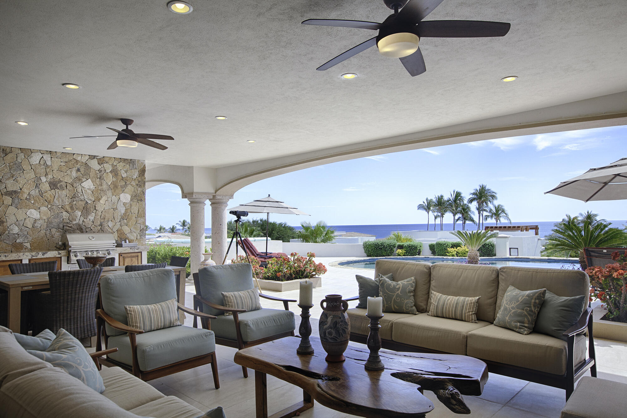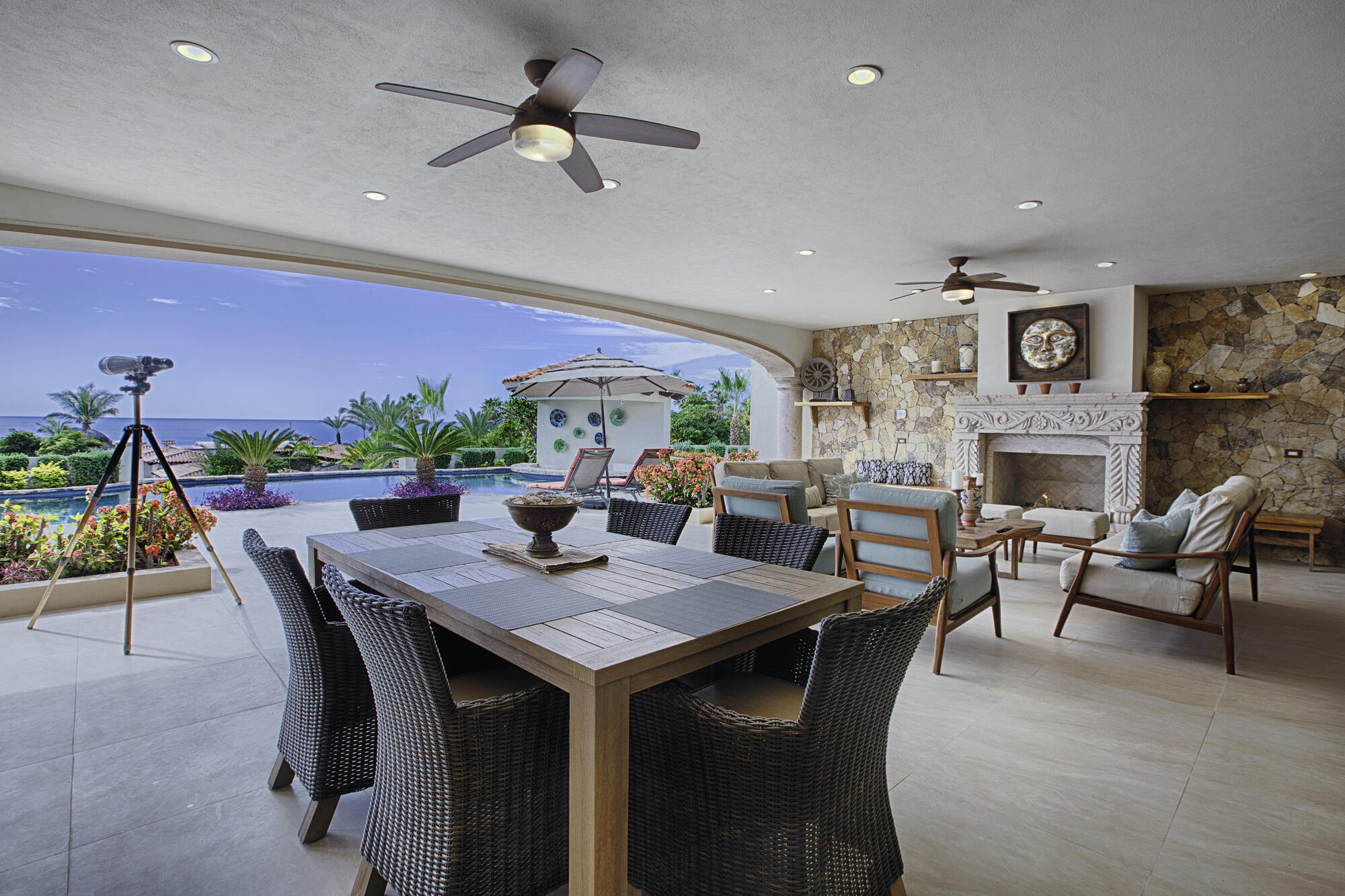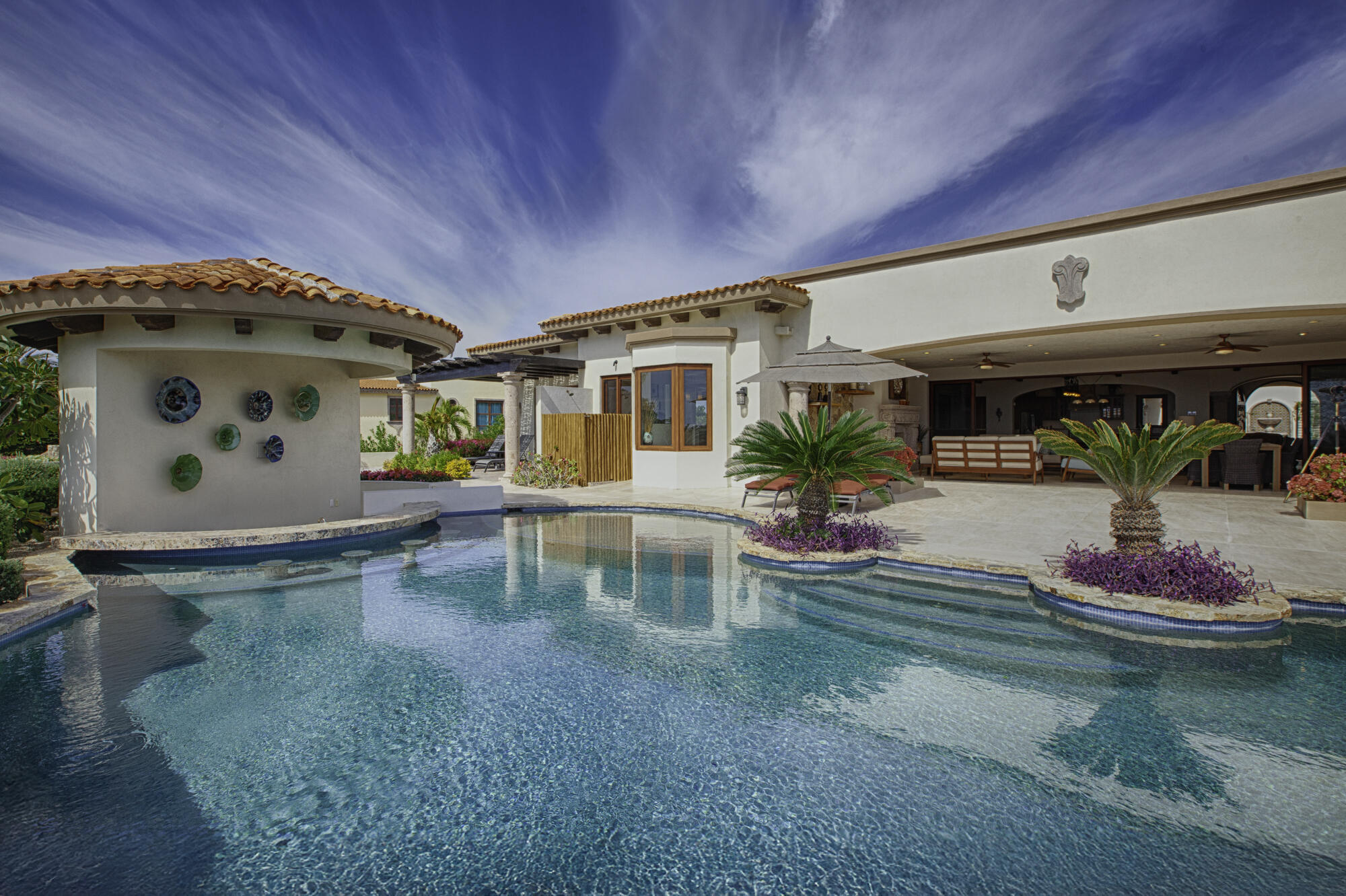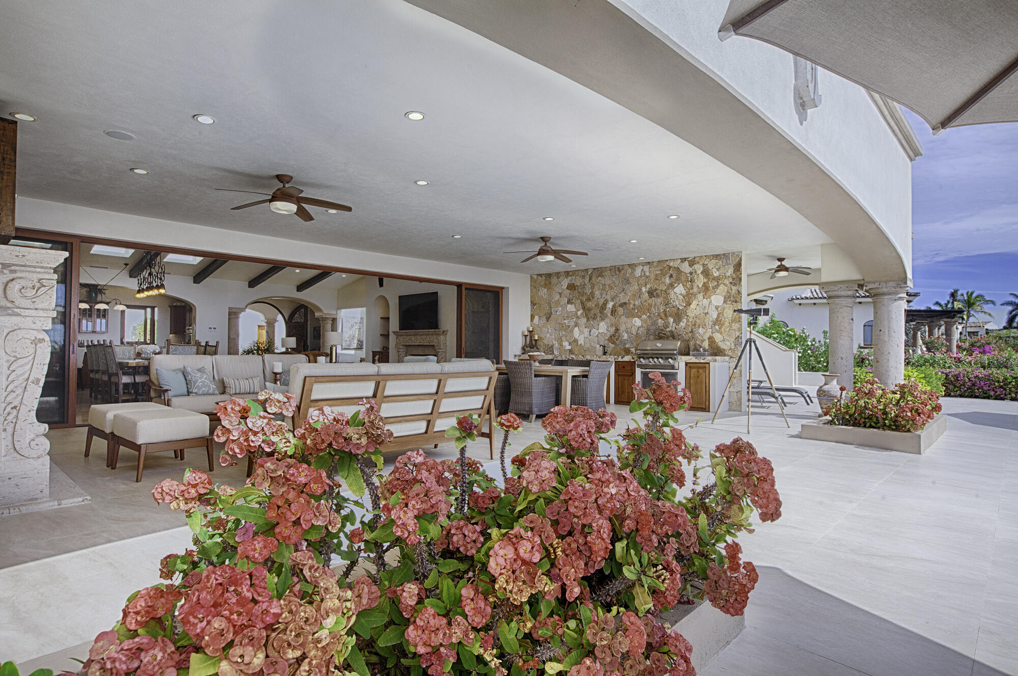 A private coastal sanctuary is this newer 2nd row oceanfront villa meticulously maintained for supreme privacy & luxury. Tranquil cul-de-sac, no thru traffic, beach access across street, easy walk to private Beach Club. 5 bedrooms w/ en-suite baths (one serves as office), 2 half baths, big ocean views from nearly every room. Epic outdoor retreat: expansive terraces with large pool and swim-up bar, Jacuzzi, firepit, rooftop terrace offering 360 ocean & mountain views. Large-shaded outdoor living/dining w/fireplace, gourmet outdoor BBQ kitchen. Home features breathtaking Custom Parota wood wine room, premium 4K theater, elegant custom bar w/appliances. Single-story, flooded with natural light via windows & skylights, 29 solar panels, ultra-low bills, on-demand water heaters, and more.