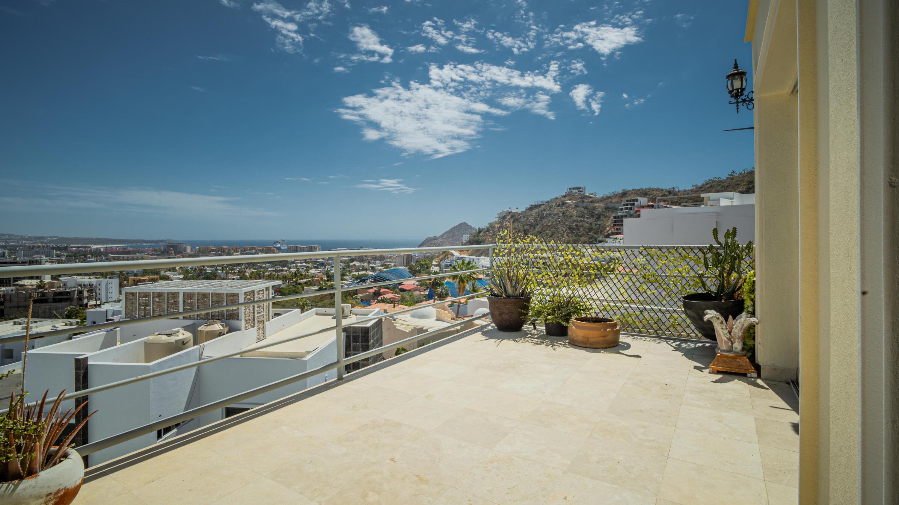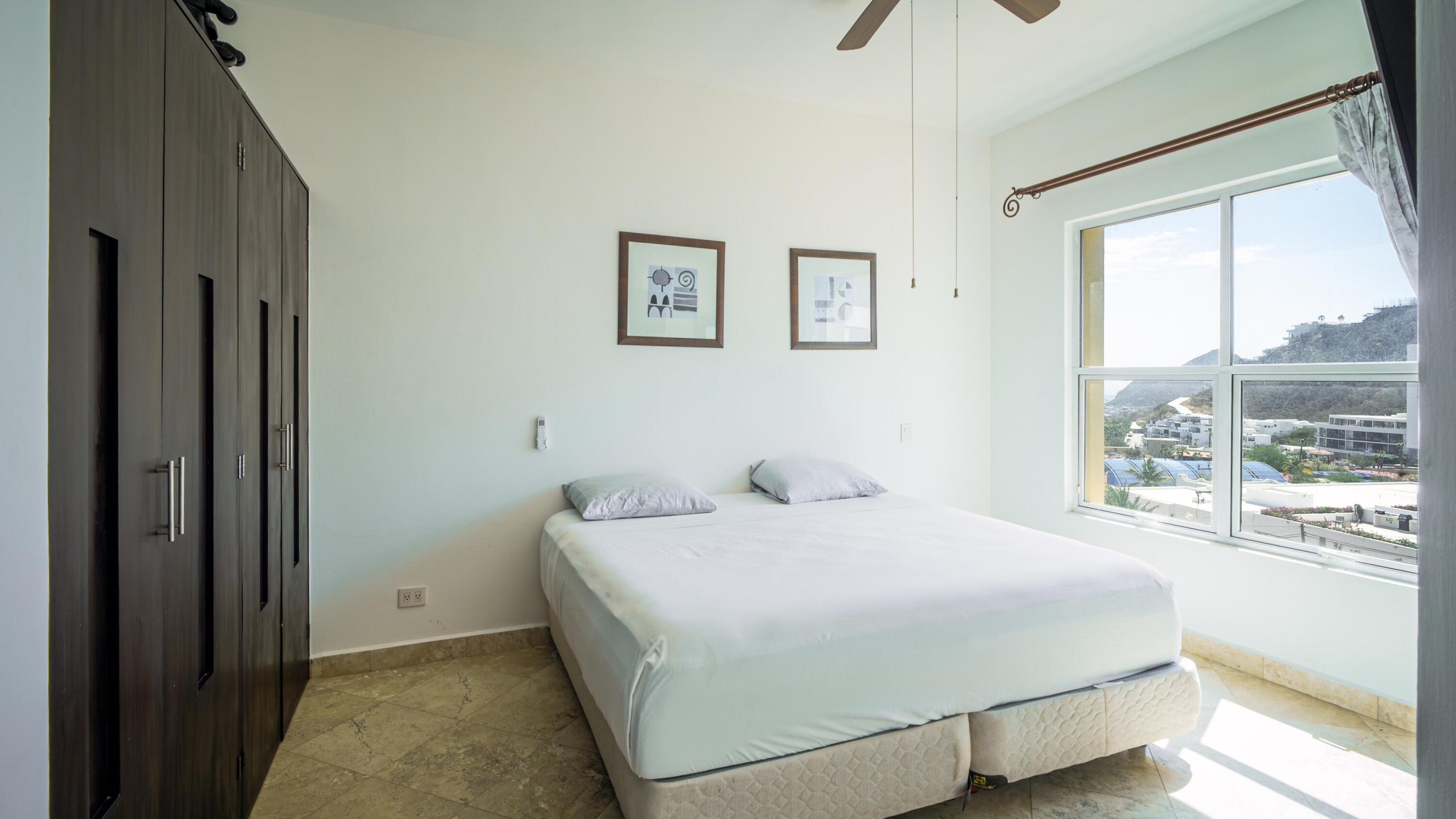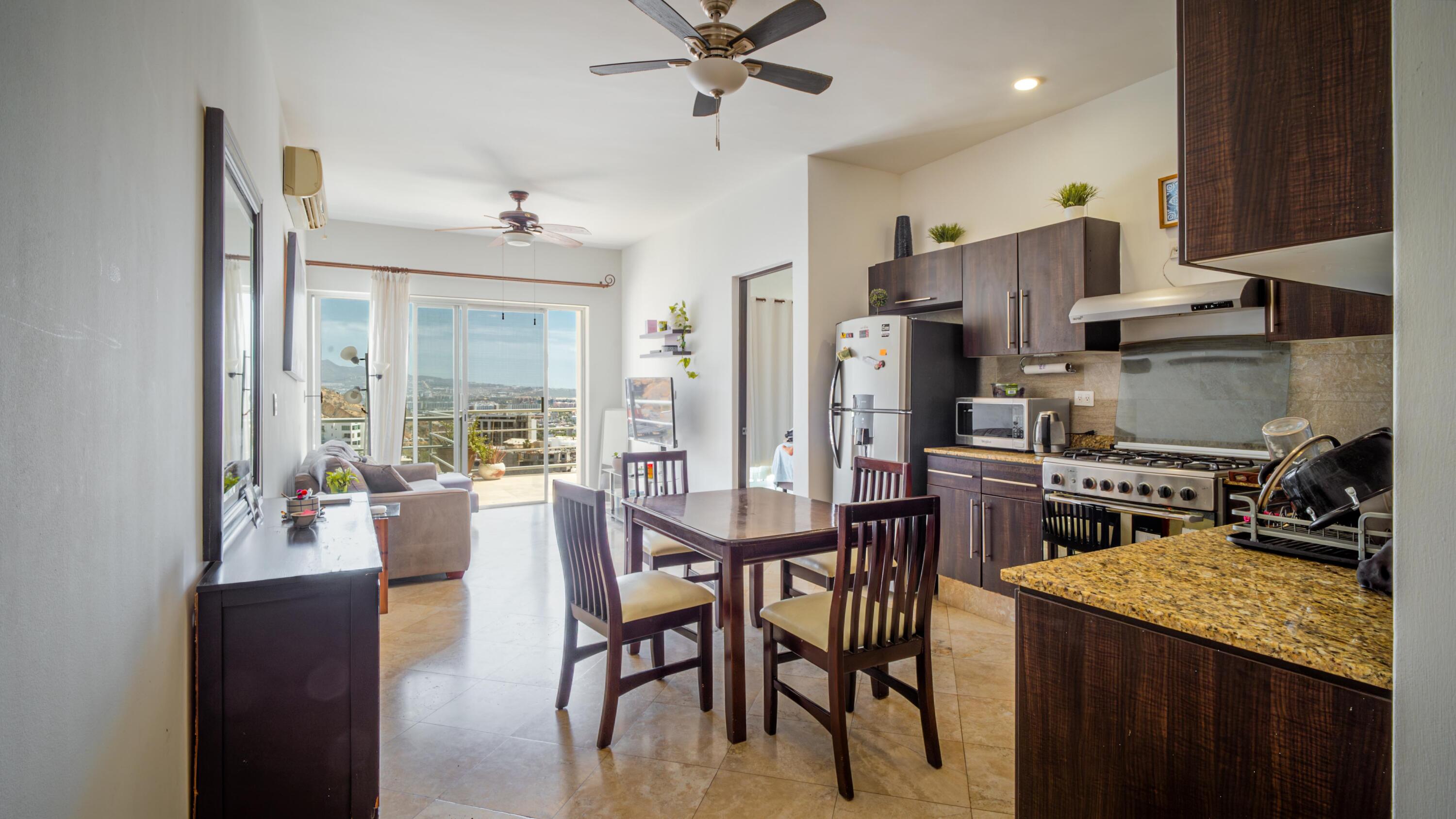 Priced to sell fast!!! Oceanview two bedroom two bathroom condo at San Charbel Cabo San Lucas. The condo is located on the second floor of the complex southern building, giving great panoramic ocean and city views from both bedrooms and from the ample terrace. The condo has beautiful marble floors throughout the condo, wooden cabinets, closets and doors, AC mini splits and fans in each room. Primary bedroom with direct access to terrace, king size bed, tv, enclosed bathroom with closet and marble tiles finishes; the spacious living/kitchen area with access to terrace through sliding window doors, living with tv and couch, the L shape kitchen is equipped with granite countertops, marble splash tiles, 4 seat dine table, buffet with mirror plus, fridge, range, hood, microwave… NO ELEVATOR