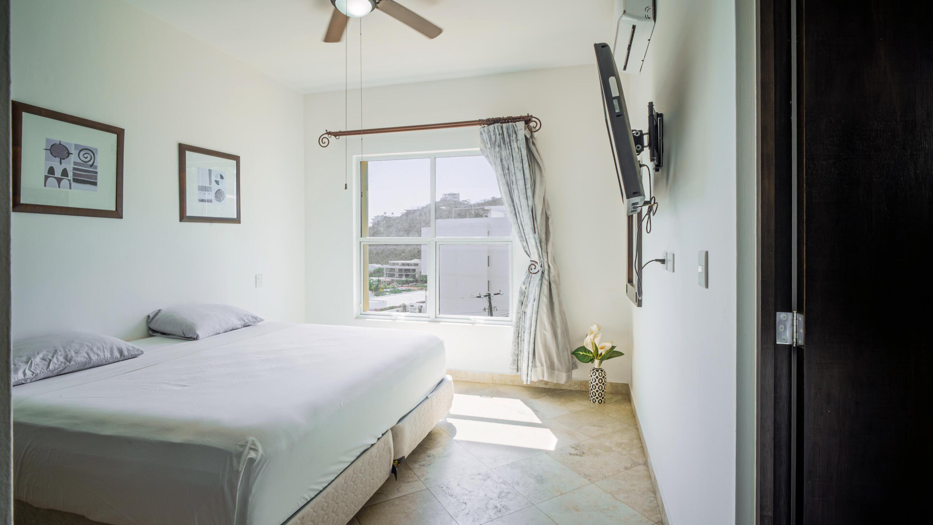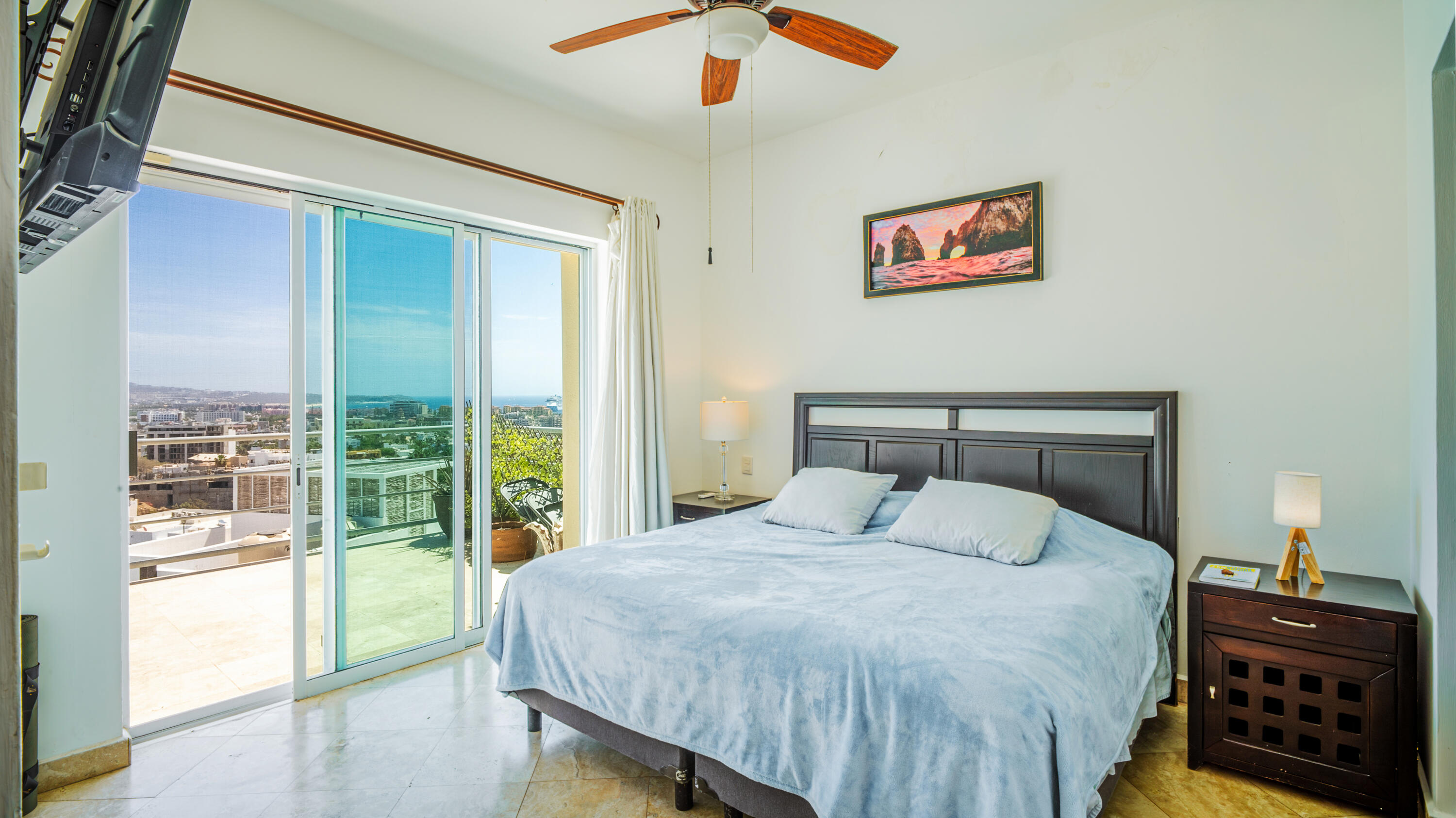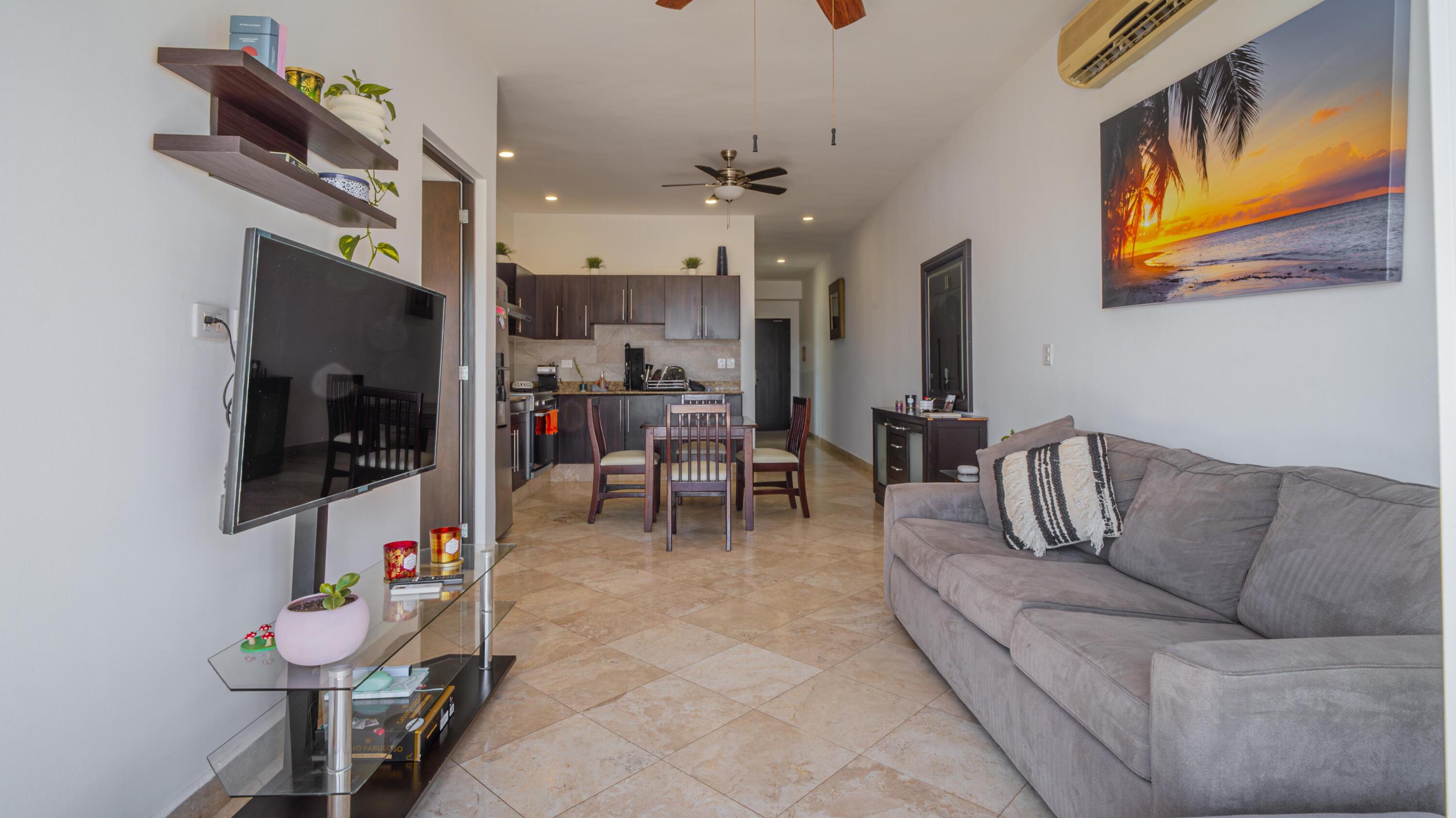 Priced to sell fast!!! Oceanview two bedroom two bathroom condo at San Charbel Cabo San Lucas. The condo is located on the second floor of the complex southern building, giving great panoramic ocean and city views from both bedrooms and from the ample terrace. The condo has beautiful marble floors throughout the condo, wooden cabinets, closets and doors, AC mini splits and fans in each room. Primary bedroom with direct access to terrace, king size bed, tv, enclosed bathroom with closet and marble tiles finishes; the spacious living/kitchen area with access to terrace through sliding window doors, living with tv and couch, the L shape kitchen is equipped with granite countertops, marble splash tiles, 4 seat dine table, buffet with mirror plus, fridge, range, hood, microwave… NO ELEVATOR