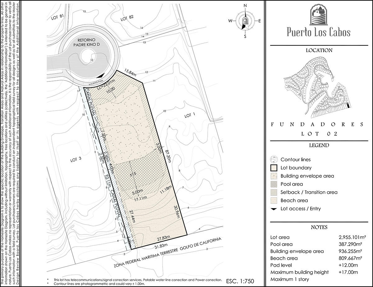 Set beachfront amidst the Greg Norman Signature golf course, the exclusive 25 estate lots of Puerto Los Cabos Fundadores neighborhood are the most private and spacious in the entire master planned community. Beach front with 31,807 sqft / 2,955 m2 lot with 31m /101 ft of beach frontage at the end of a very private Cul-de-Sac. The platform of lot #2 is ready for your dream home to be built and can accommodate a spacious home of up to 12,000 sqft / 1,115 m2. Enjoy the exhilarating sounds and views of the Sea of Cortez from your home and then take a short trip to the newly remodeled Fundadores beach Club to enjoy the upgraded restaurant, spa, gym, pool and beach with family and friends for years to come.