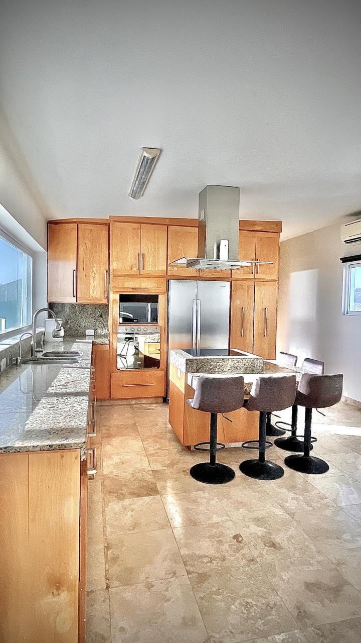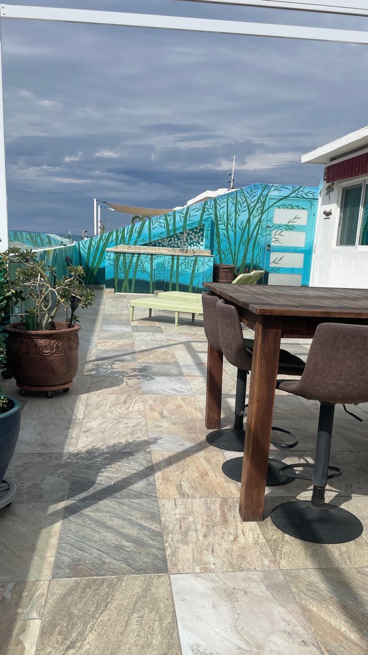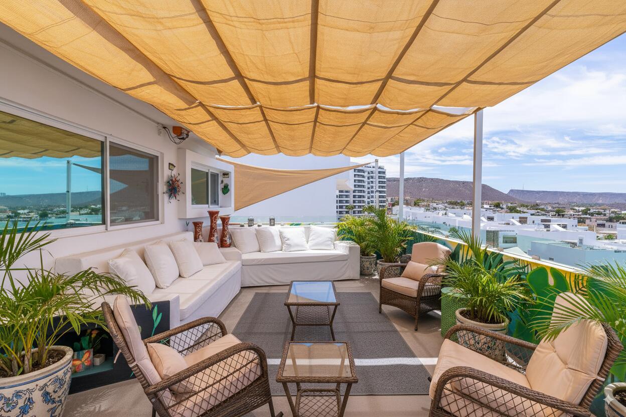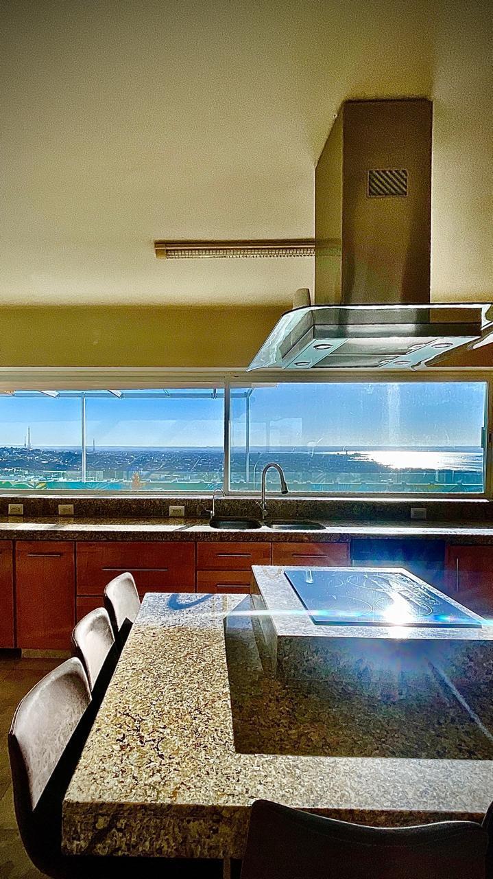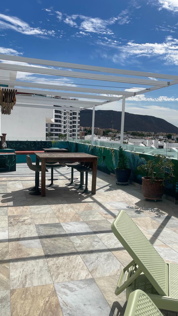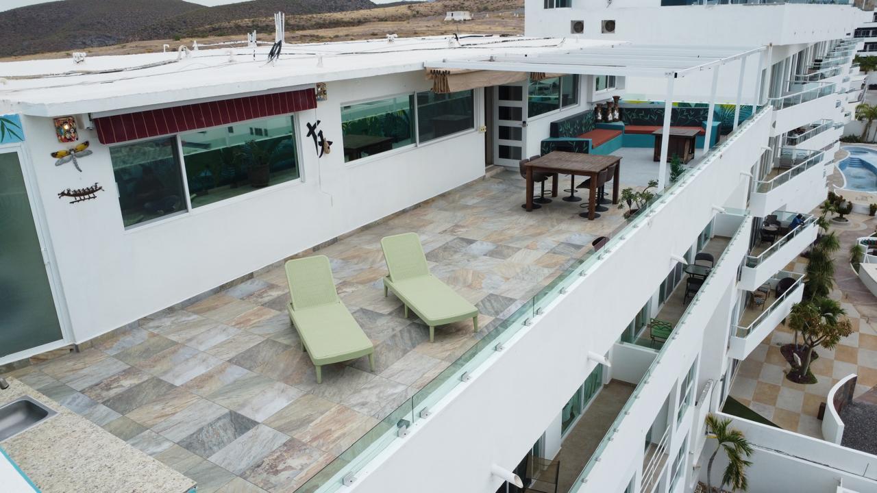 Unparalleled unobstructed views of La Paz City, Bay, Mountains, and sunsets from this Penthouse 900 sqf Terrace, Indoor and Outdoor living space meet a full-equipped Kitchen, granite countertops, and solid wood cabinets. Living room space with a Suite on each side, the Master Suite overlooking La Paz comes with a walk-in solid wood closet and plenty of storage space, separate toilet and shower, and his and hers vanities. The second bedroom includes a built-in desk, bathroom also includes a view through a large window. Outside a built-in bench, kitchen countertop, laundry and storage, and 20 meter 20-meter-long roof-top terrace