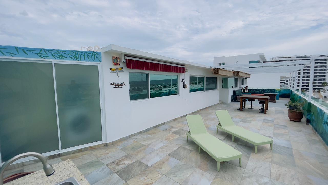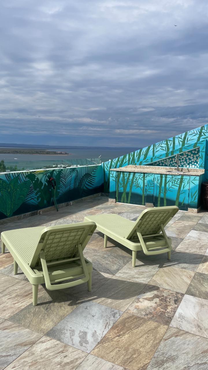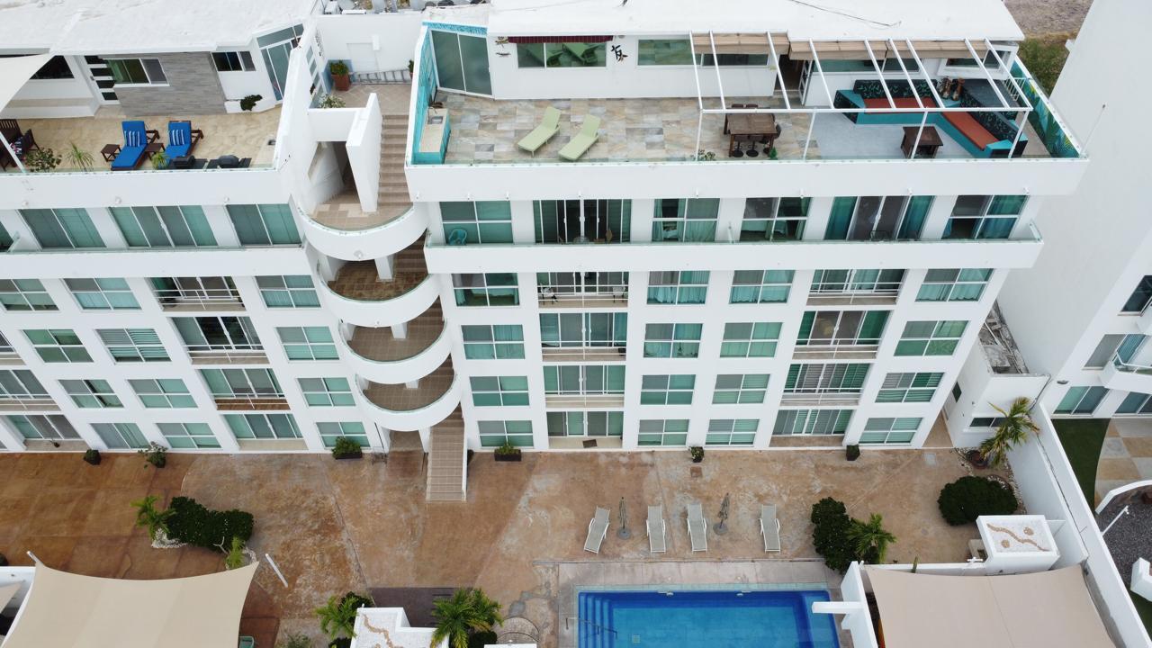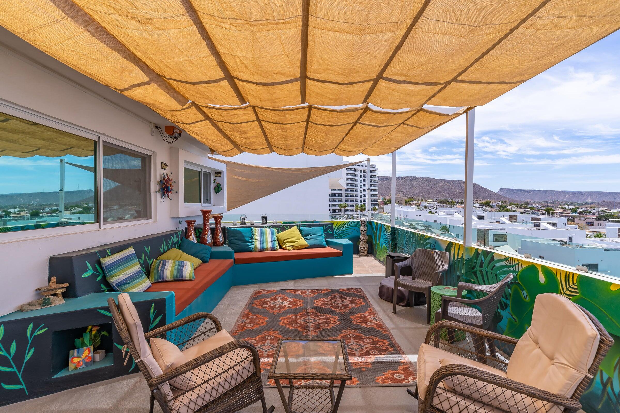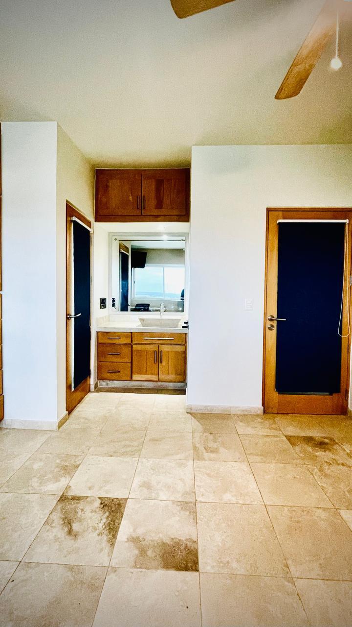 Unparalleled unobstructed views of La Paz City, Bay, Mountains, and sunsets from this Penthouse 900 sqf Terrace, Indoor and Outdoor living space meet a full-equipped Kitchen, granite countertops, and solid wood cabinets. Living room space with a Suite on each side, the Master Suite overlooking La Paz comes with a walk-in solid wood closet and plenty of storage space, separate toilet and shower, and his and hers vanities. The second bedroom includes a built-in desk, bathroom also includes a view through a large window. Outside a built-in bench, kitchen countertop, laundry and storage, and 20 meter 20-meter-long roof-top terrace