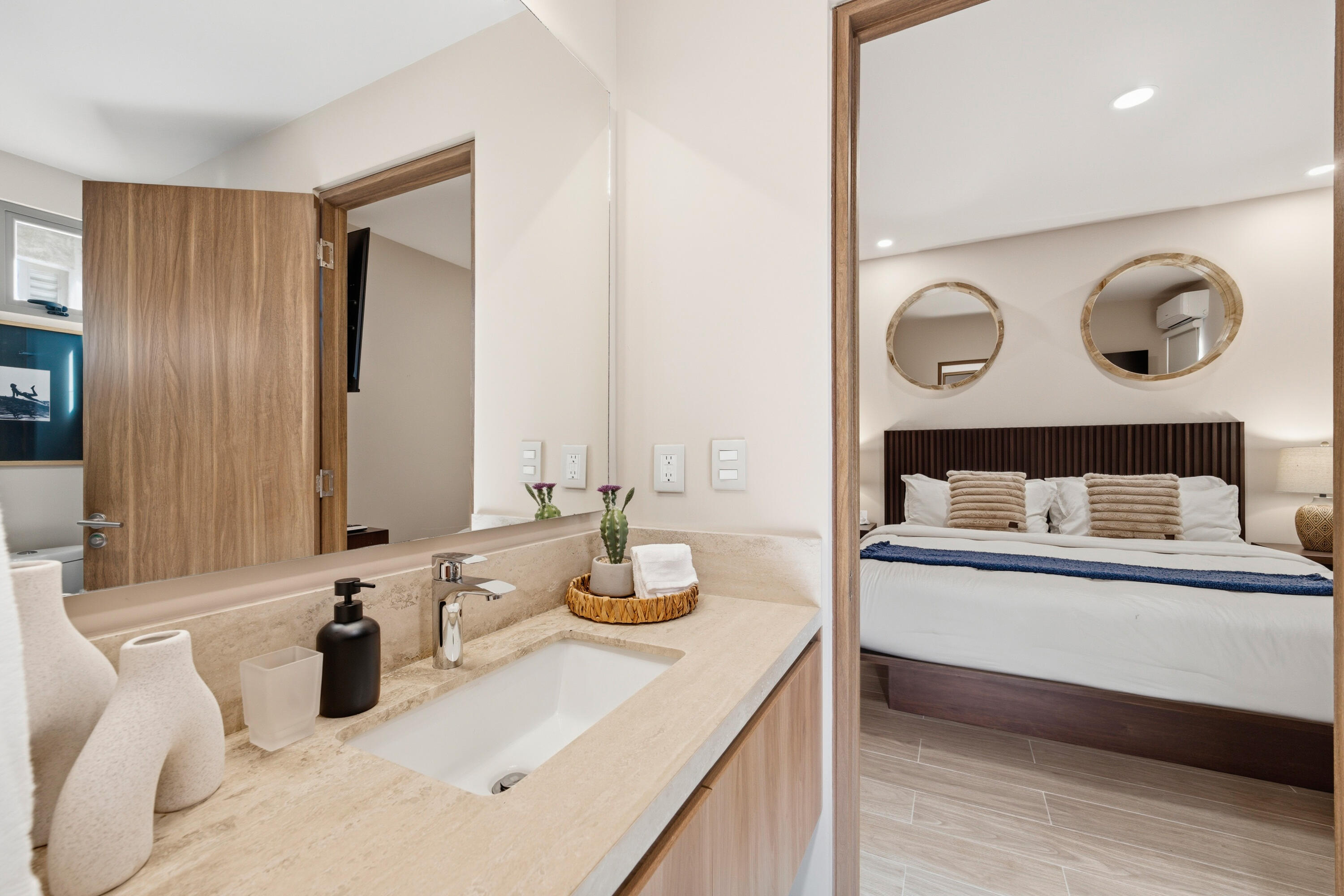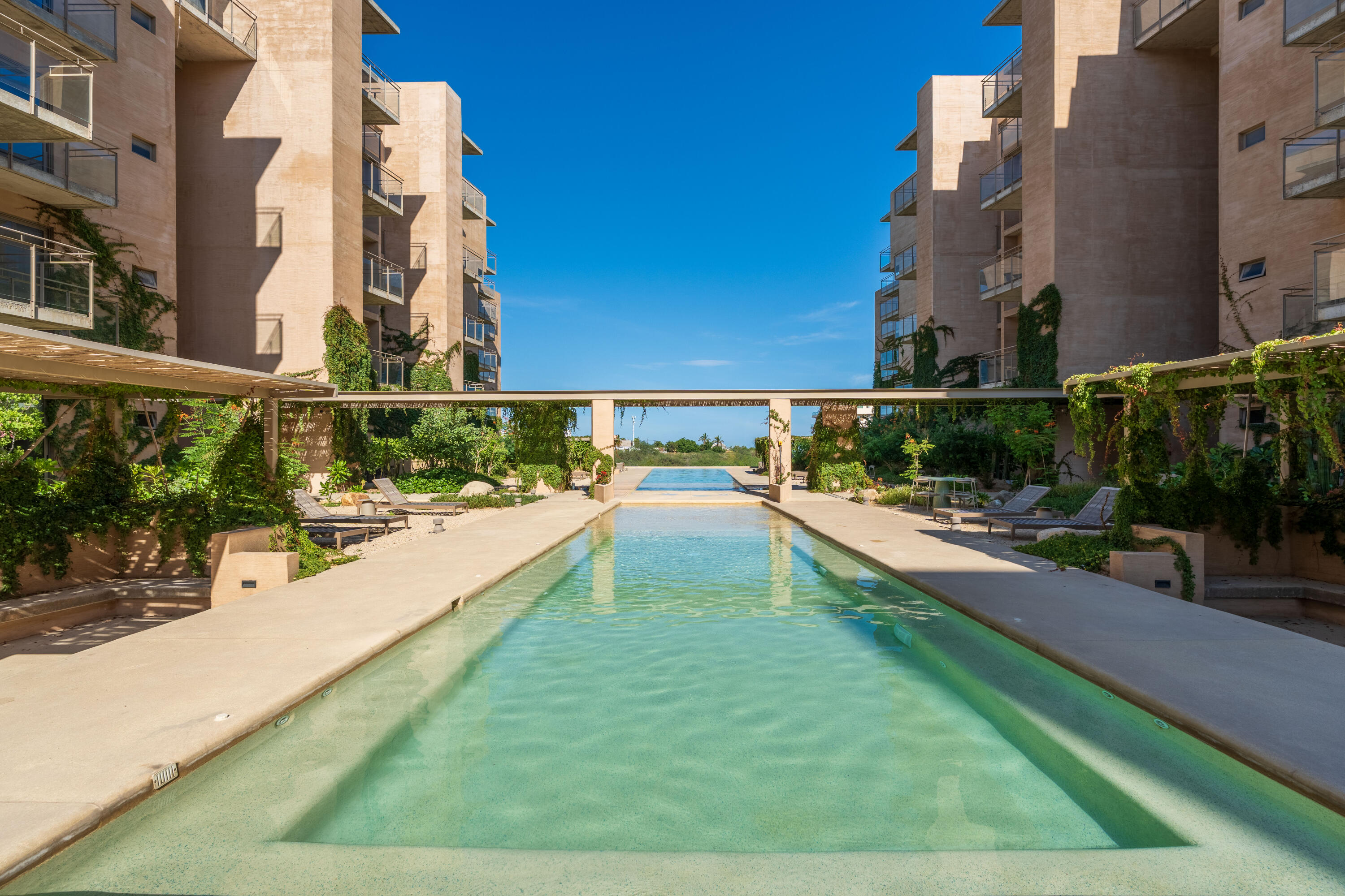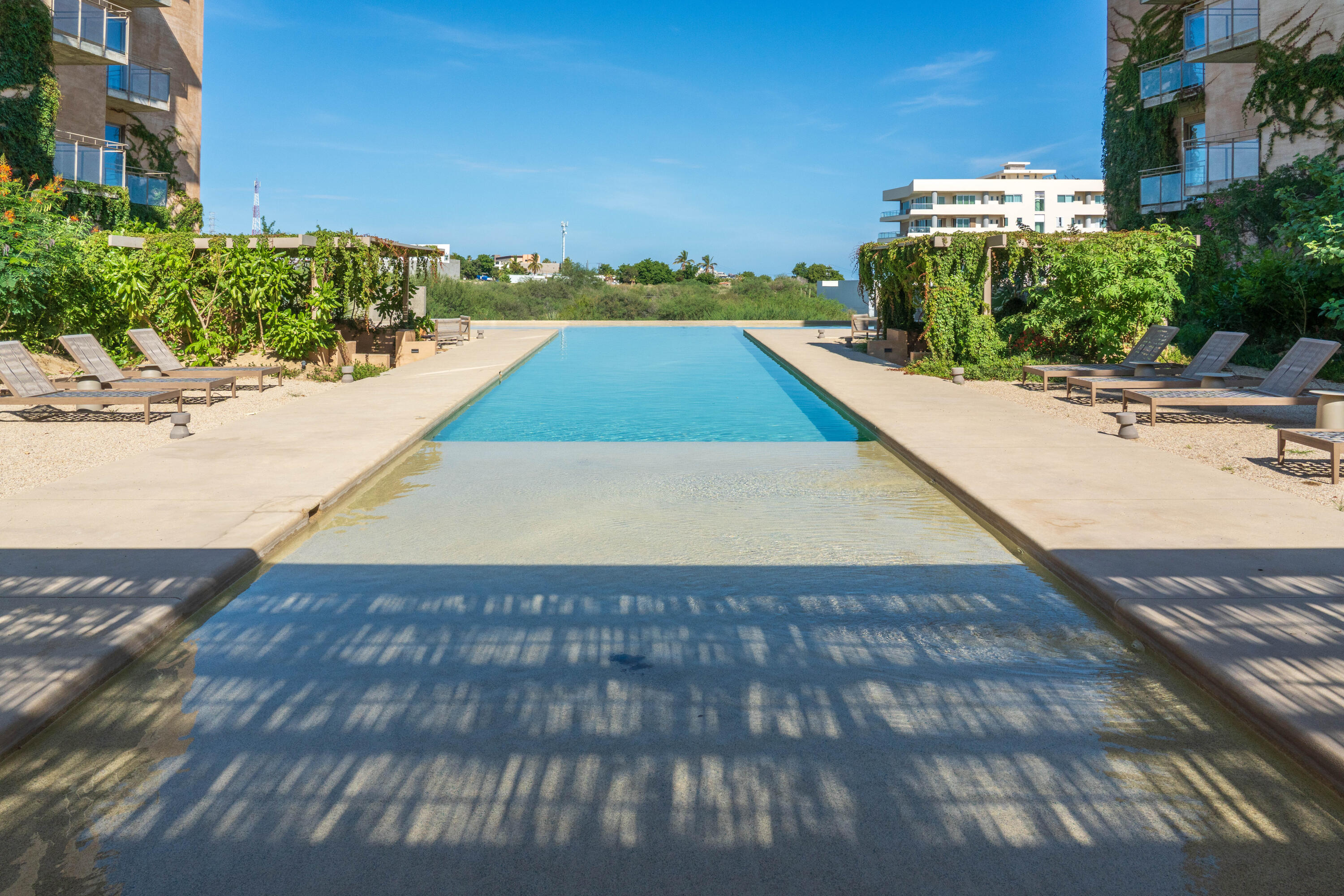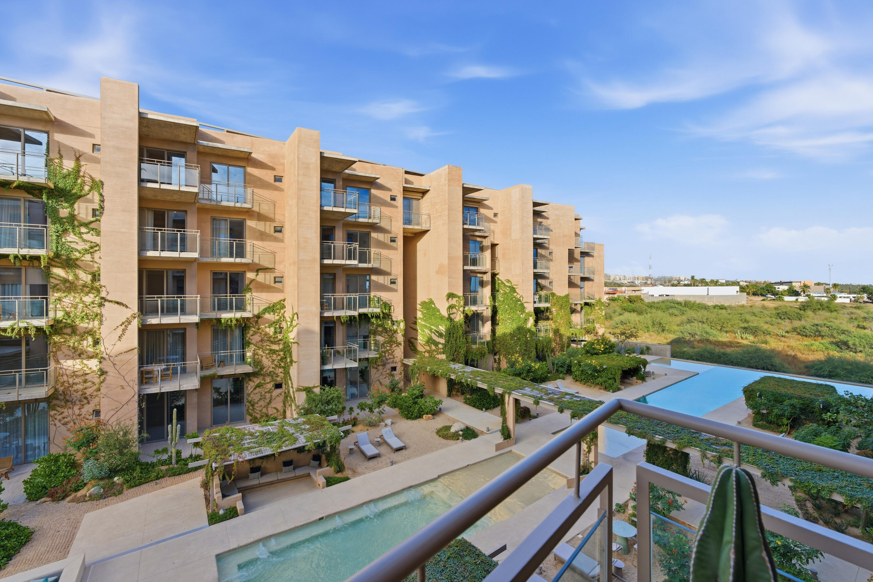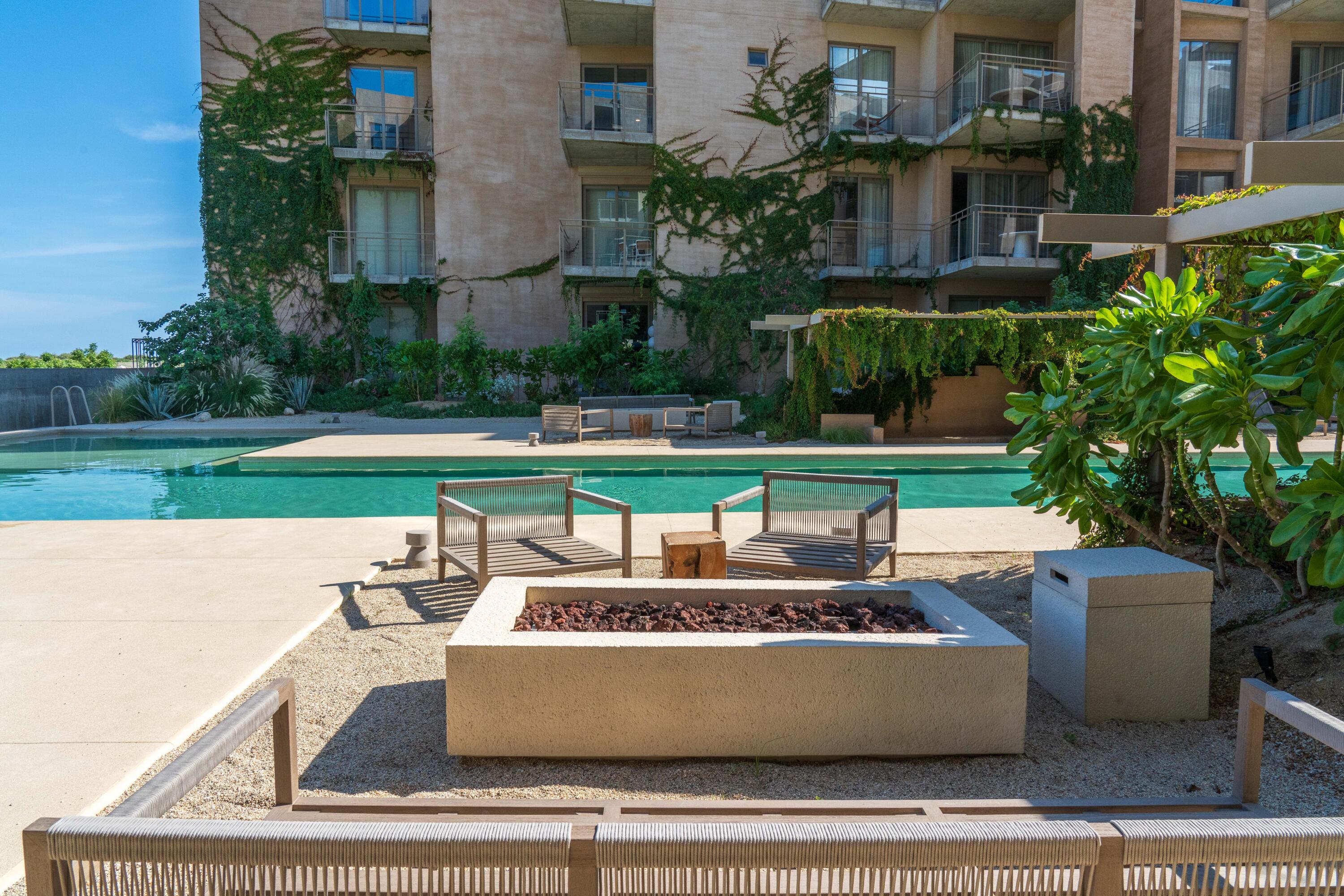 This contemporary 99 m condo in Cabo San Lucas features an efficient layout with 2 bedrooms and 2 bathrooms. The open-concept living area combines the kitchen, dining, and living spaces, creating a seamless flow. The kitchen boasts wood cabinetry, stainless steel appliances, and sleek countertops. Both bedrooms offer ample space, with the primary bedroom measuring 11.1 m. The bathrooms are modern and well-appointed. A balcony provides outdoor living space with scenic views. The interior design showcases a neutral color, creating a serene coastal ambiance. High-quality finishes and thoughtful details throughout enhance the overall aesthetic and functionality of this compact yet stylish residence.