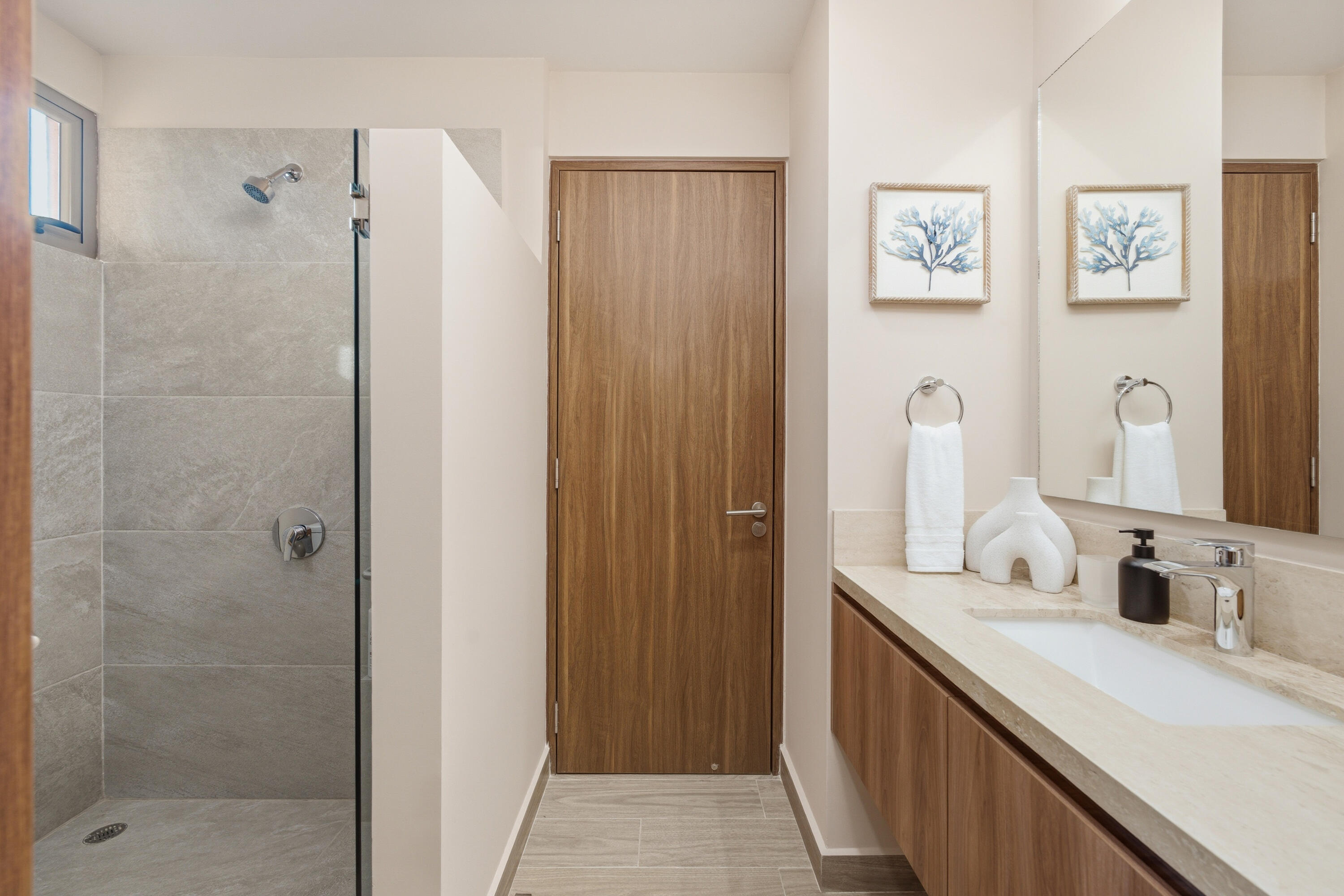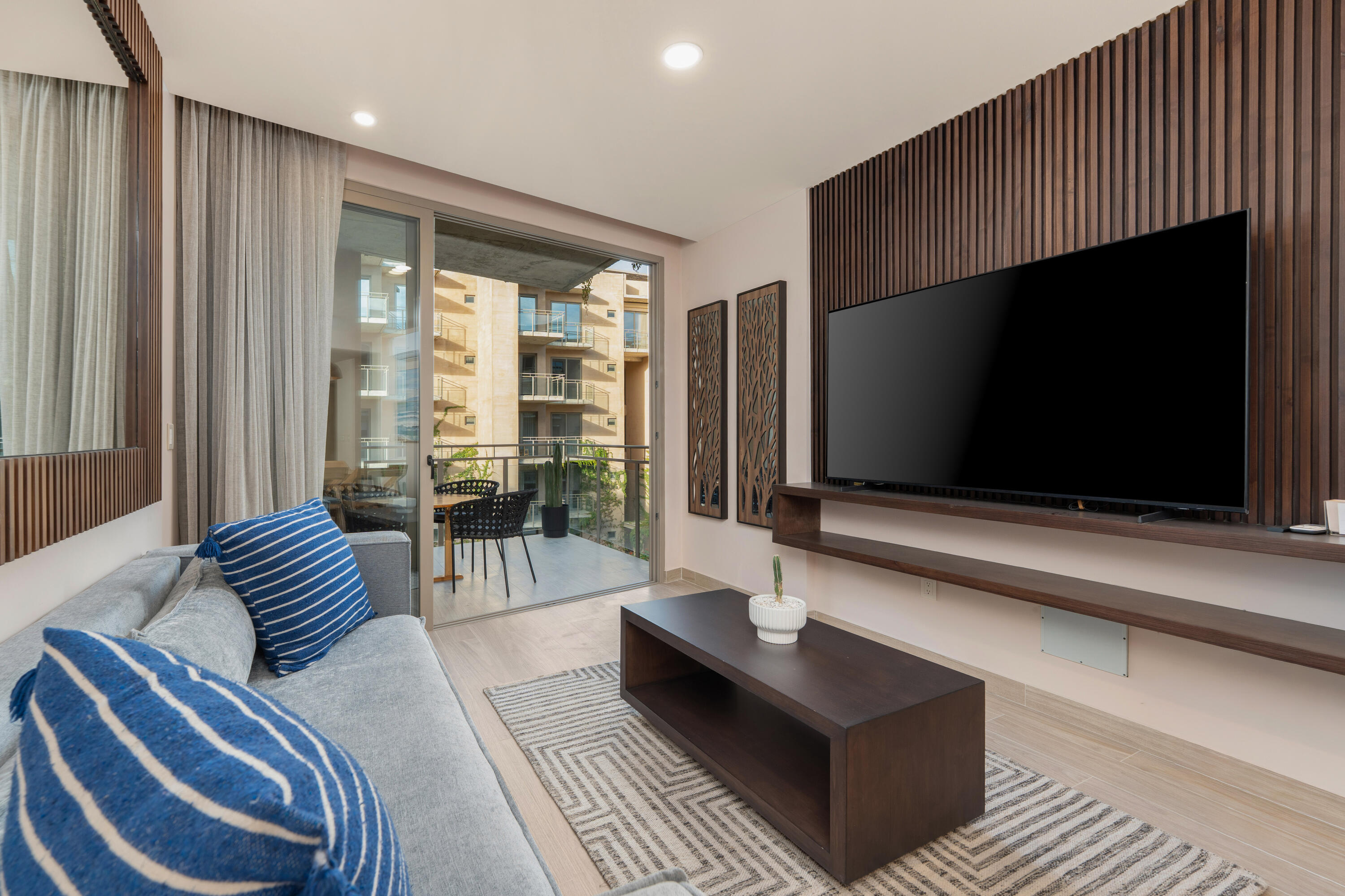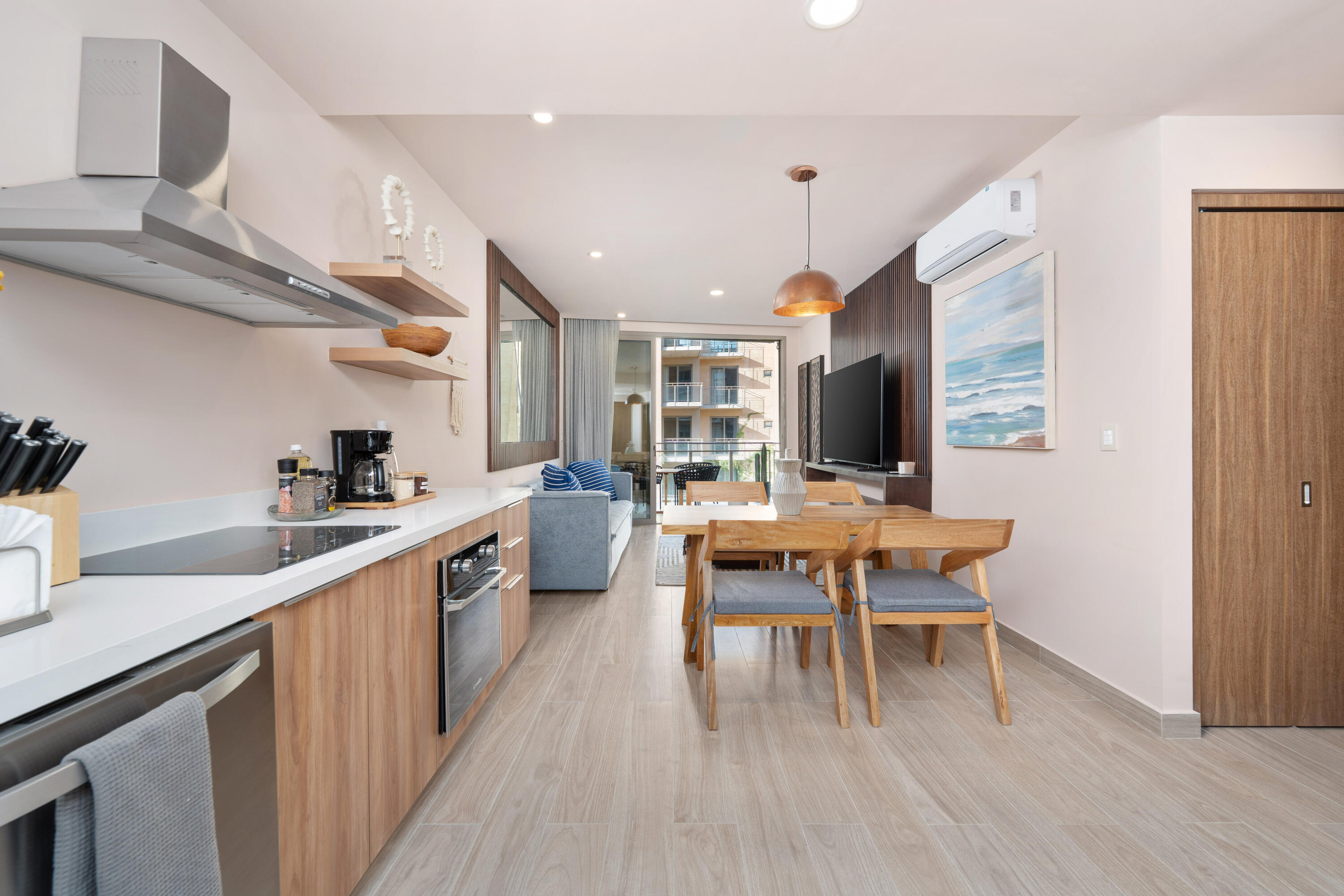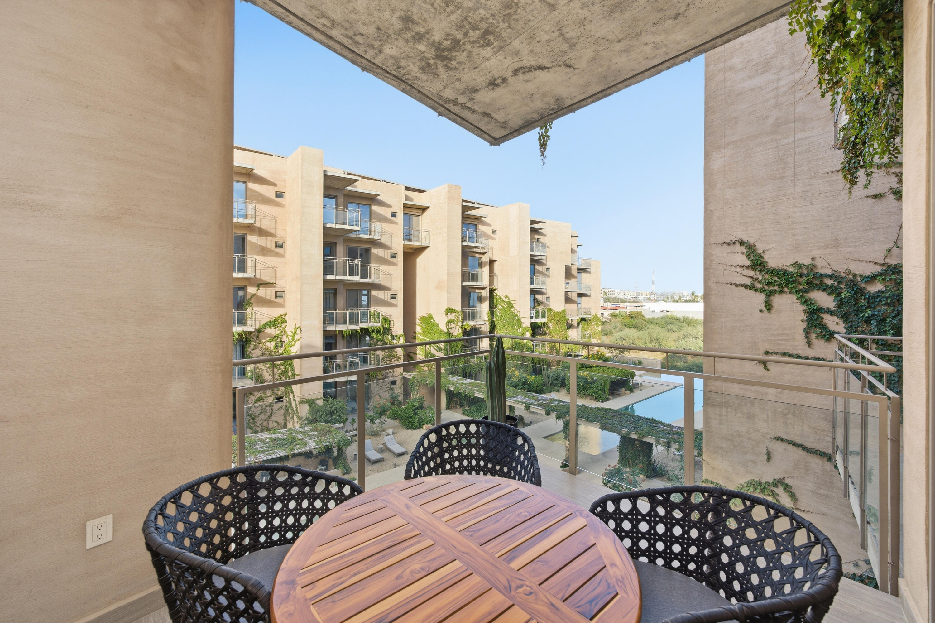 This contemporary 99 m condo in Cabo San Lucas features an efficient layout with 2 bedrooms and 2 bathrooms. The open-concept living area combines the kitchen, dining, and living spaces, creating a seamless flow. The kitchen boasts wood cabinetry, stainless steel appliances, and sleek countertops. Both bedrooms offer ample space, with the primary bedroom measuring 11.1 m. The bathrooms are modern and well-appointed. A balcony provides outdoor living space with scenic views. The interior design showcases a neutral color, creating a serene coastal ambiance. High-quality finishes and thoughtful details throughout enhance the overall aesthetic and functionality of this compact yet stylish residence.