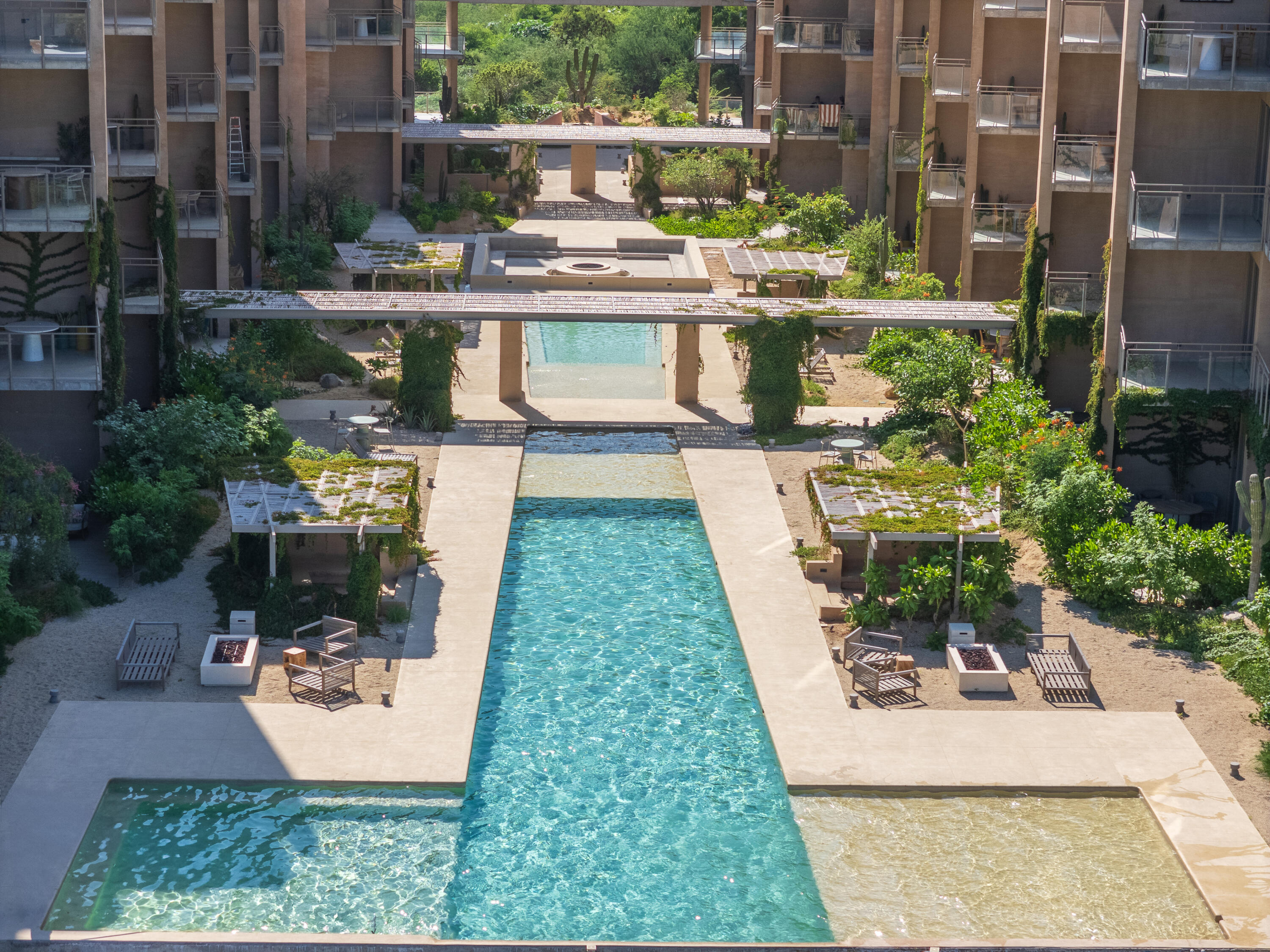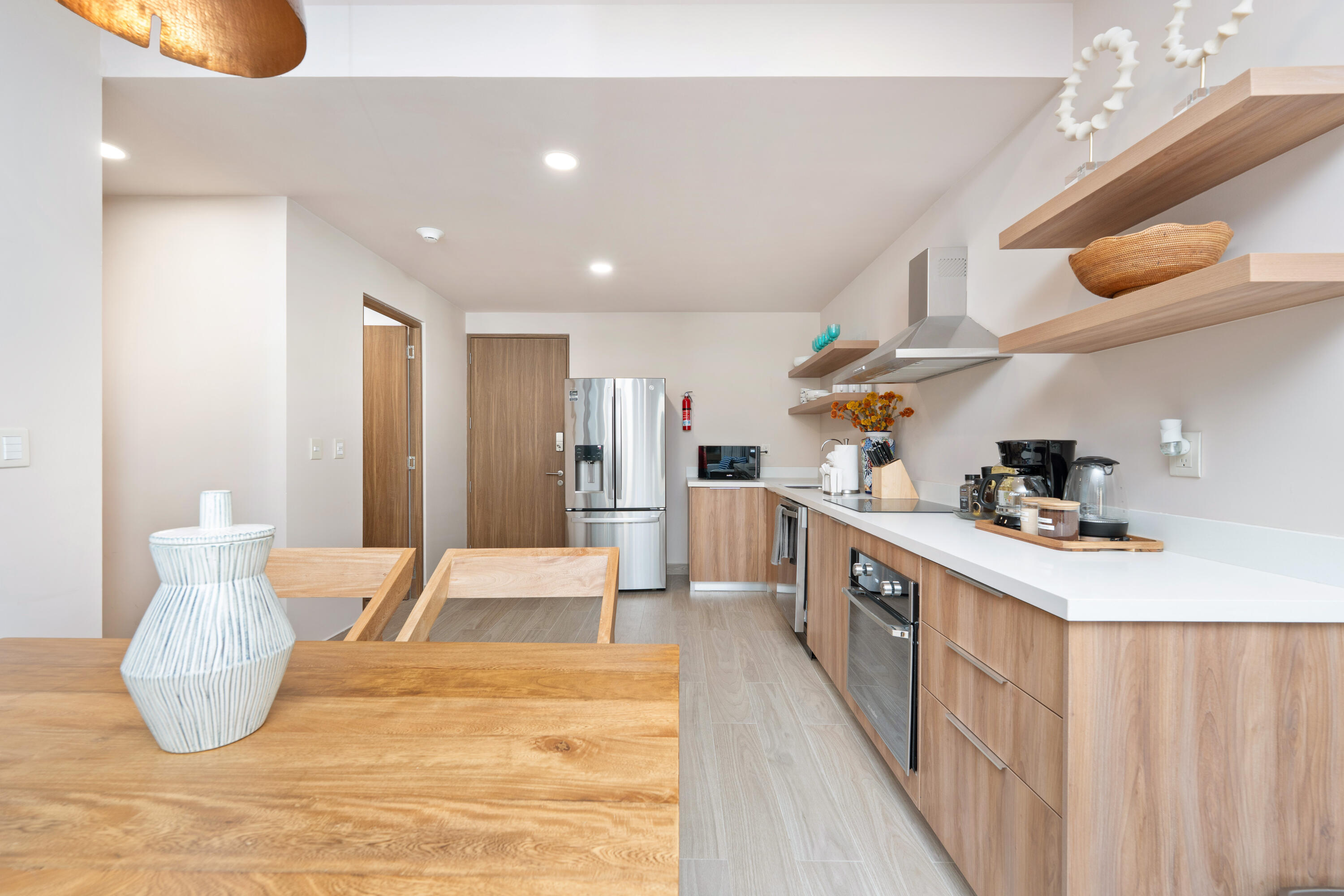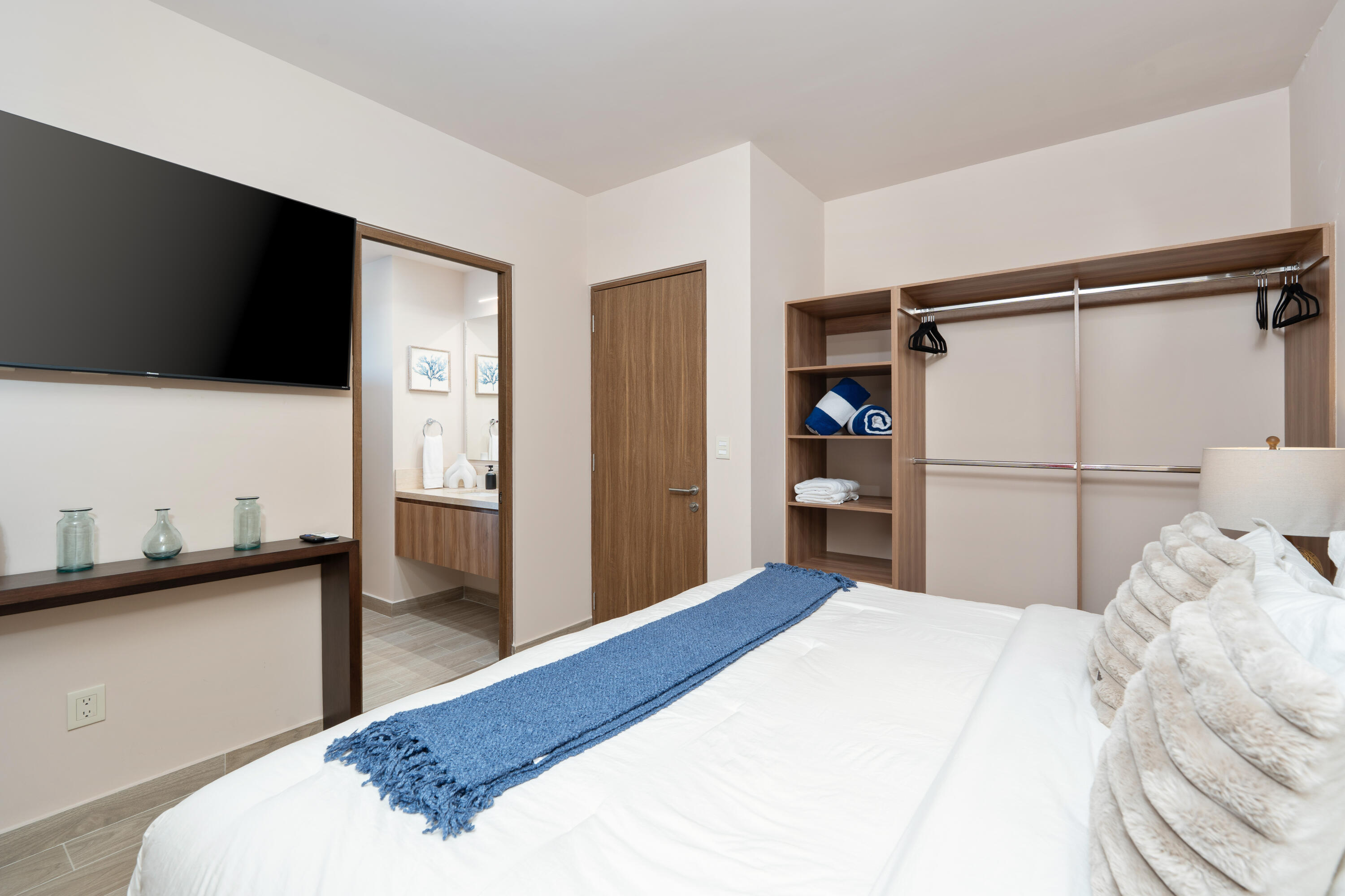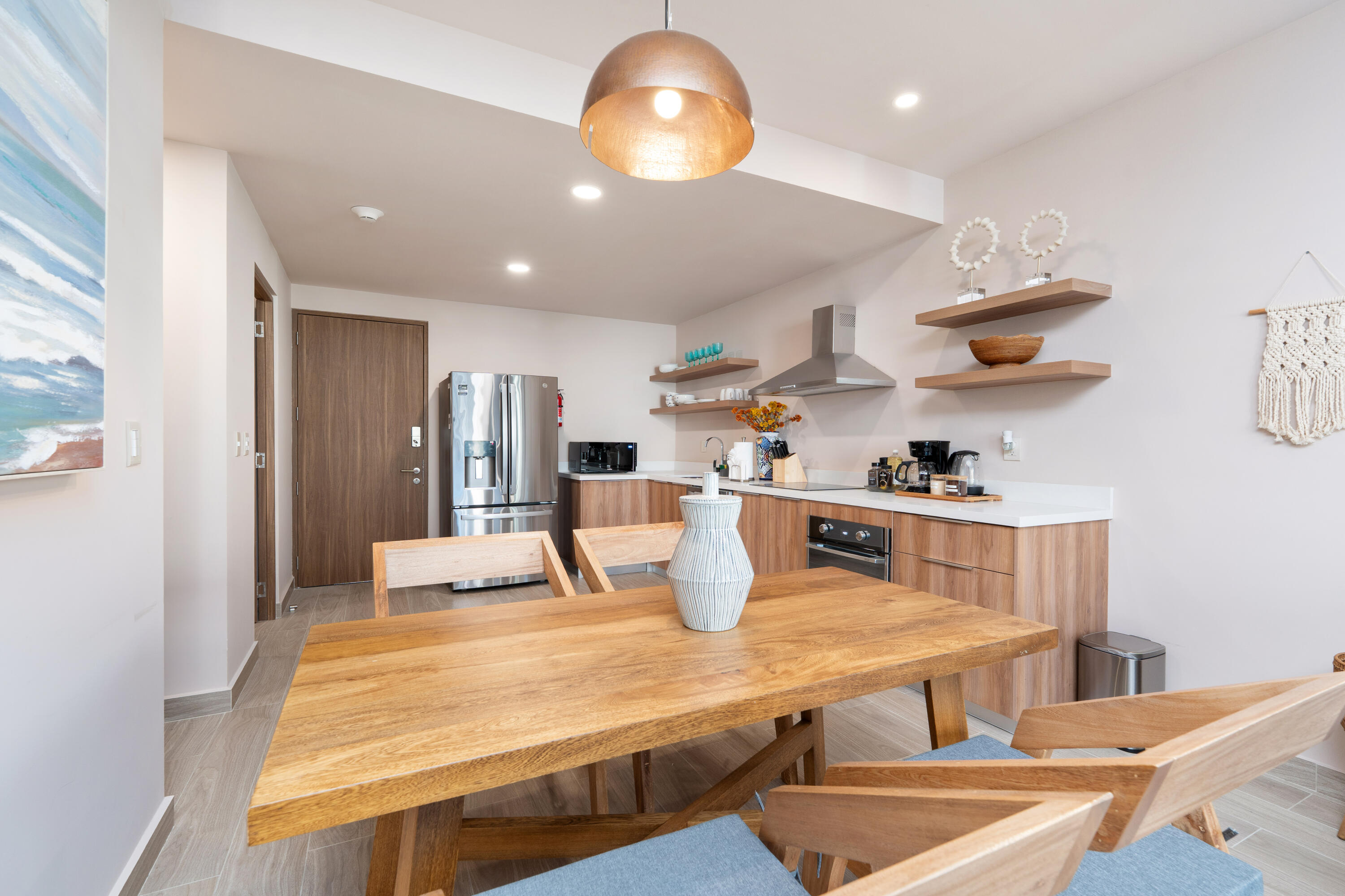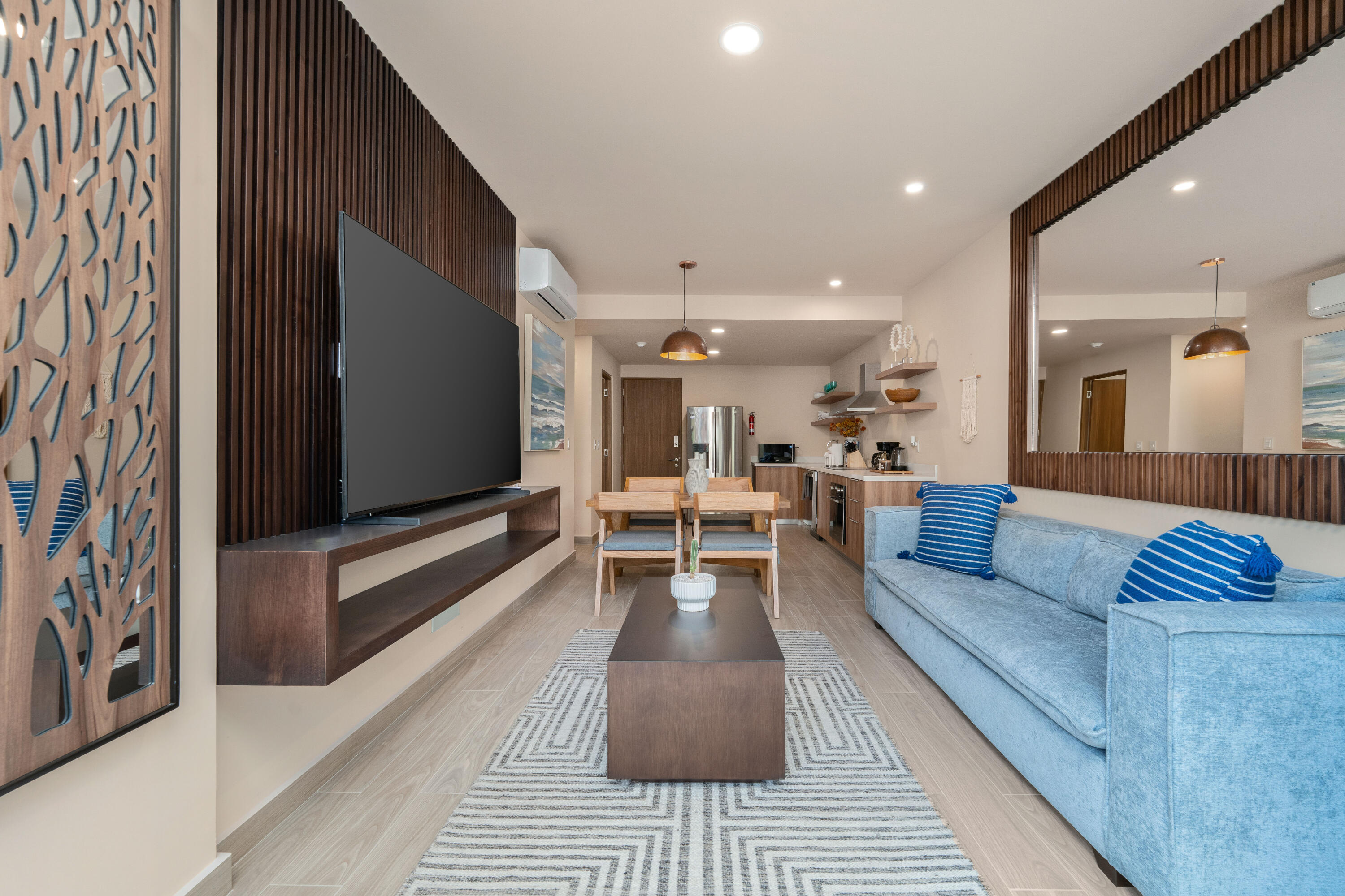 This contemporary 99 m condo in Cabo San Lucas features an efficient layout with 2 bedrooms and 2 bathrooms. The open-concept living area combines the kitchen, dining, and living spaces, creating a seamless flow. The kitchen boasts wood cabinetry, stainless steel appliances, and sleek countertops. Both bedrooms offer ample space, with the primary bedroom measuring 11.1 m. The bathrooms are modern and well-appointed. A balcony provides outdoor living space with scenic views. The interior design showcases a neutral color, creating a serene coastal ambiance. High-quality finishes and thoughtful details throughout enhance the overall aesthetic and functionality of this compact yet stylish residence.