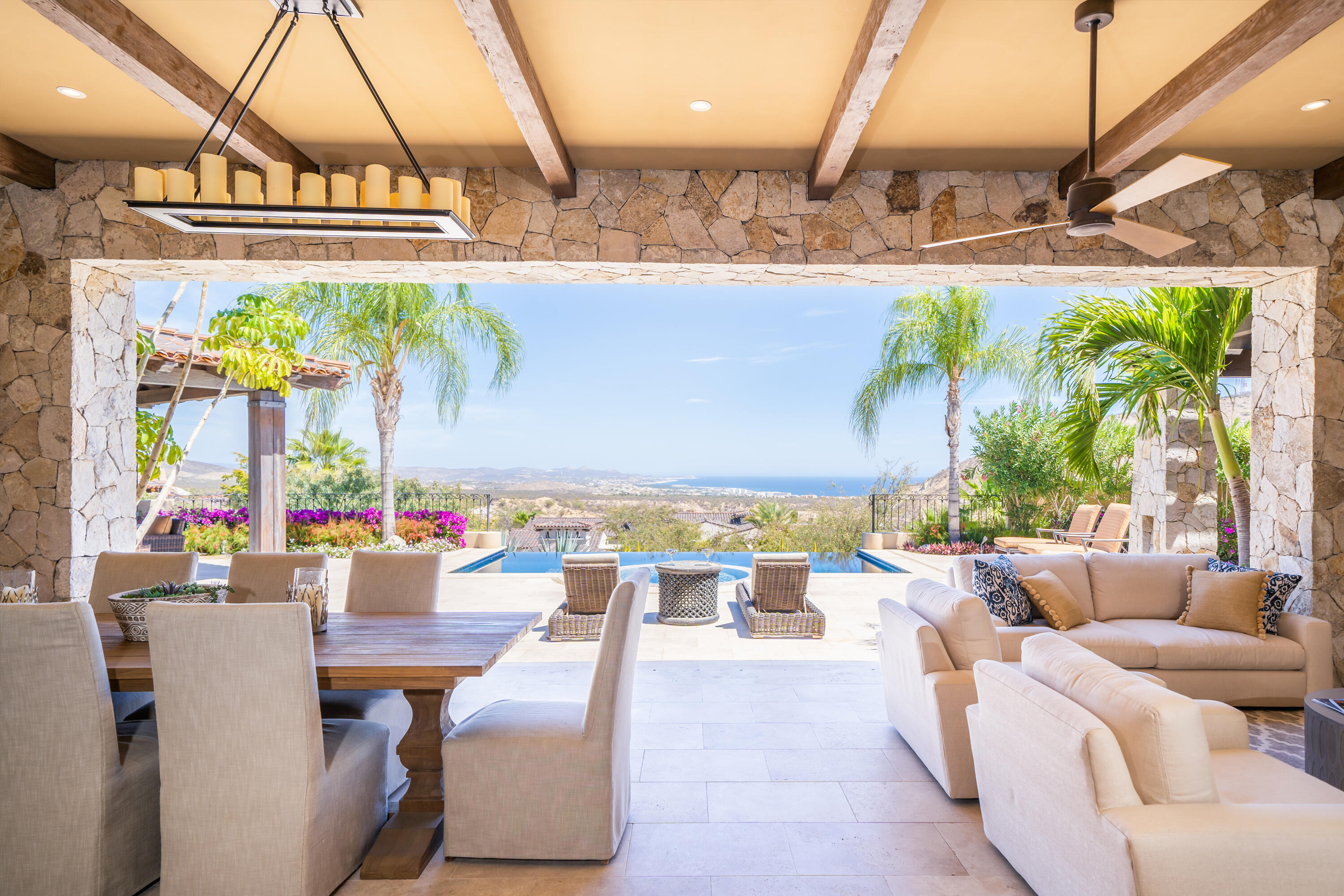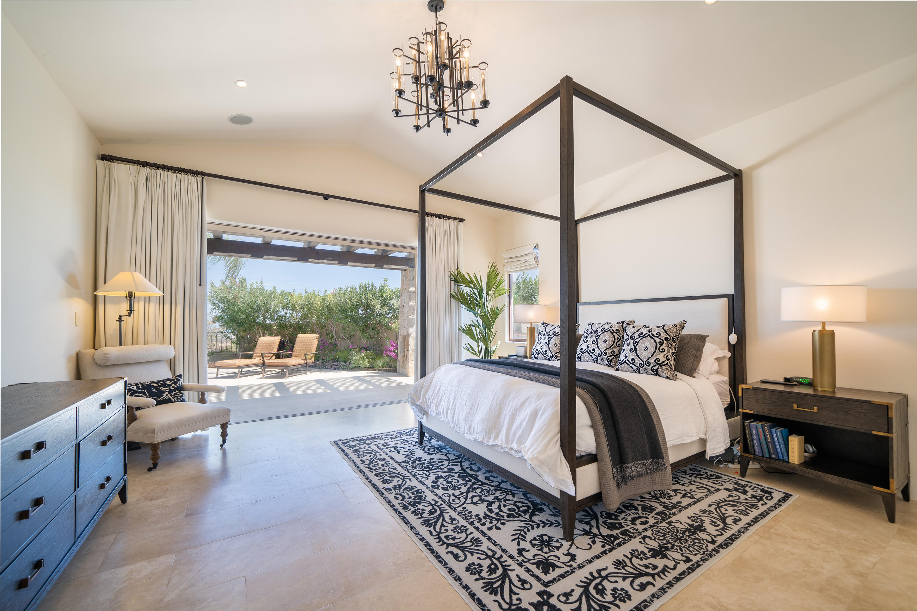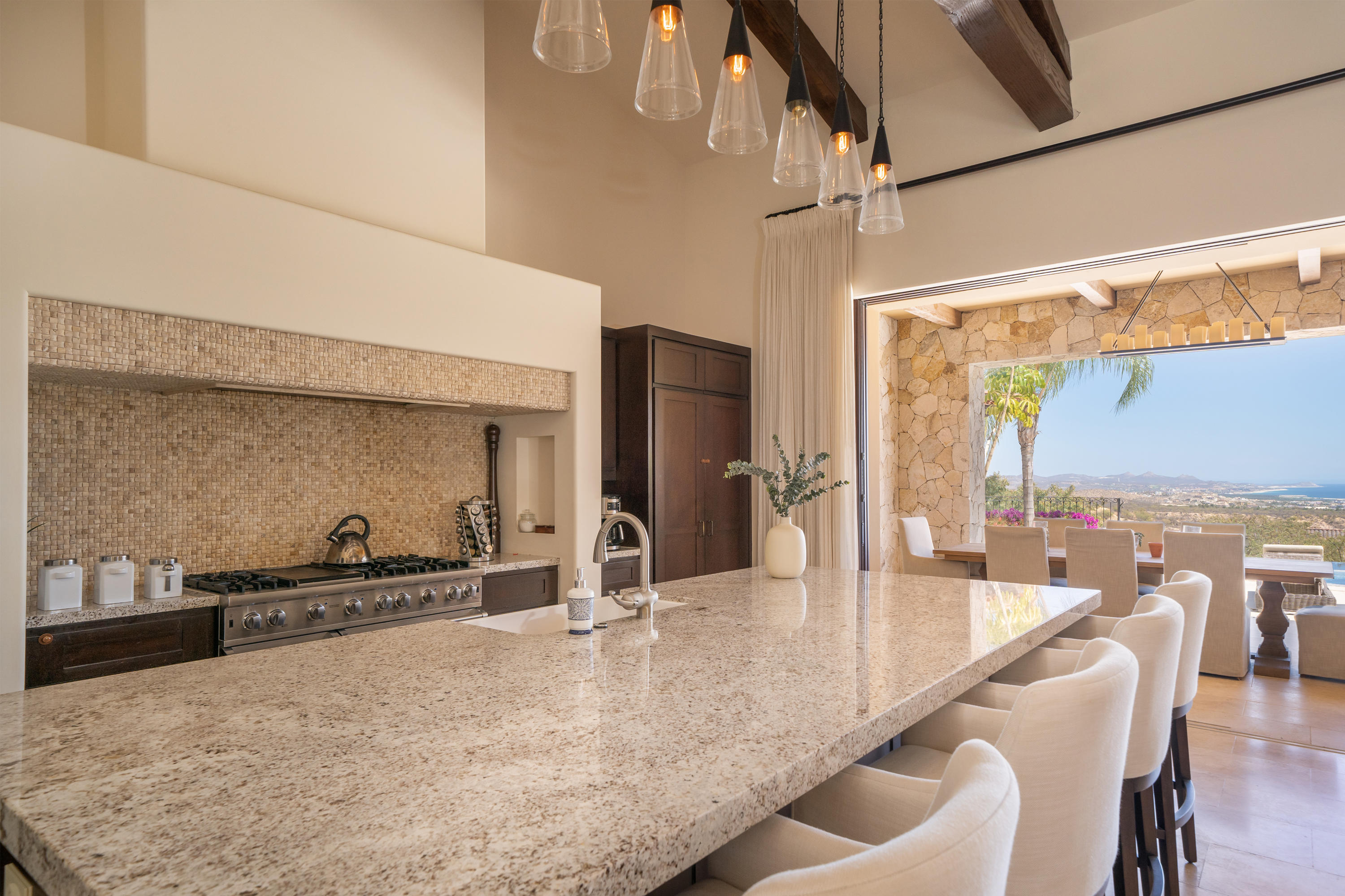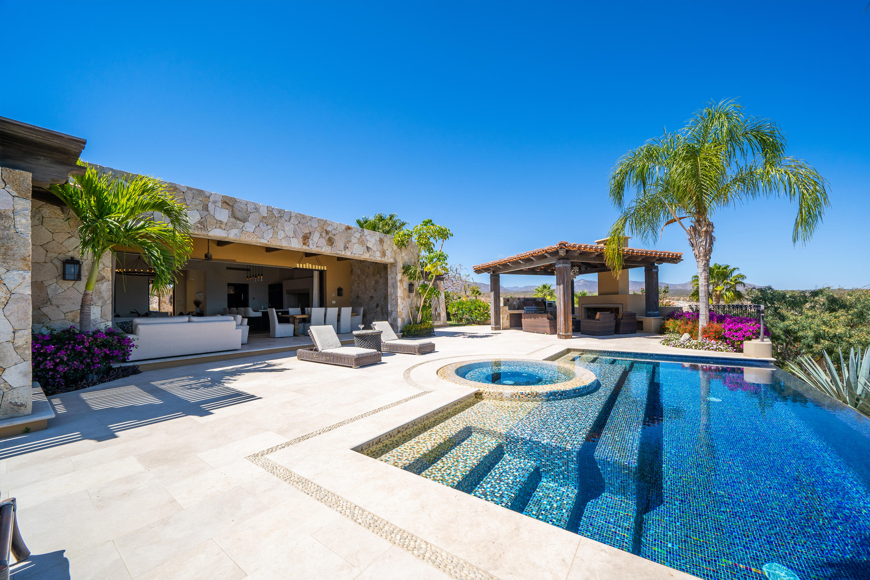 Magnificent Turnkey single level home perched high on the canyon ridgeline offering stunning ocean and city light views. Located in the highly desirable neighborhood of Las Canadas in Querencia, this modern home is just a short walk or golf cart ride from the Q-Club Village which offers the world class Tom Fazio Golf course, Spa, Fitness Facility, Restaurants, Bar, Pools, Tennis Courts, and children’s activities. This home features an open floor plan with indoor/outdoor living concept, cascading water feature and 2 gas fireplaces perfect for entertaining. The spacious great room extends into the gourmet kitchen with views of the infinity pool and Sea of Cortez. The master suite offers indoor/outdoor showers and a standing soaker tub perfect for relation.