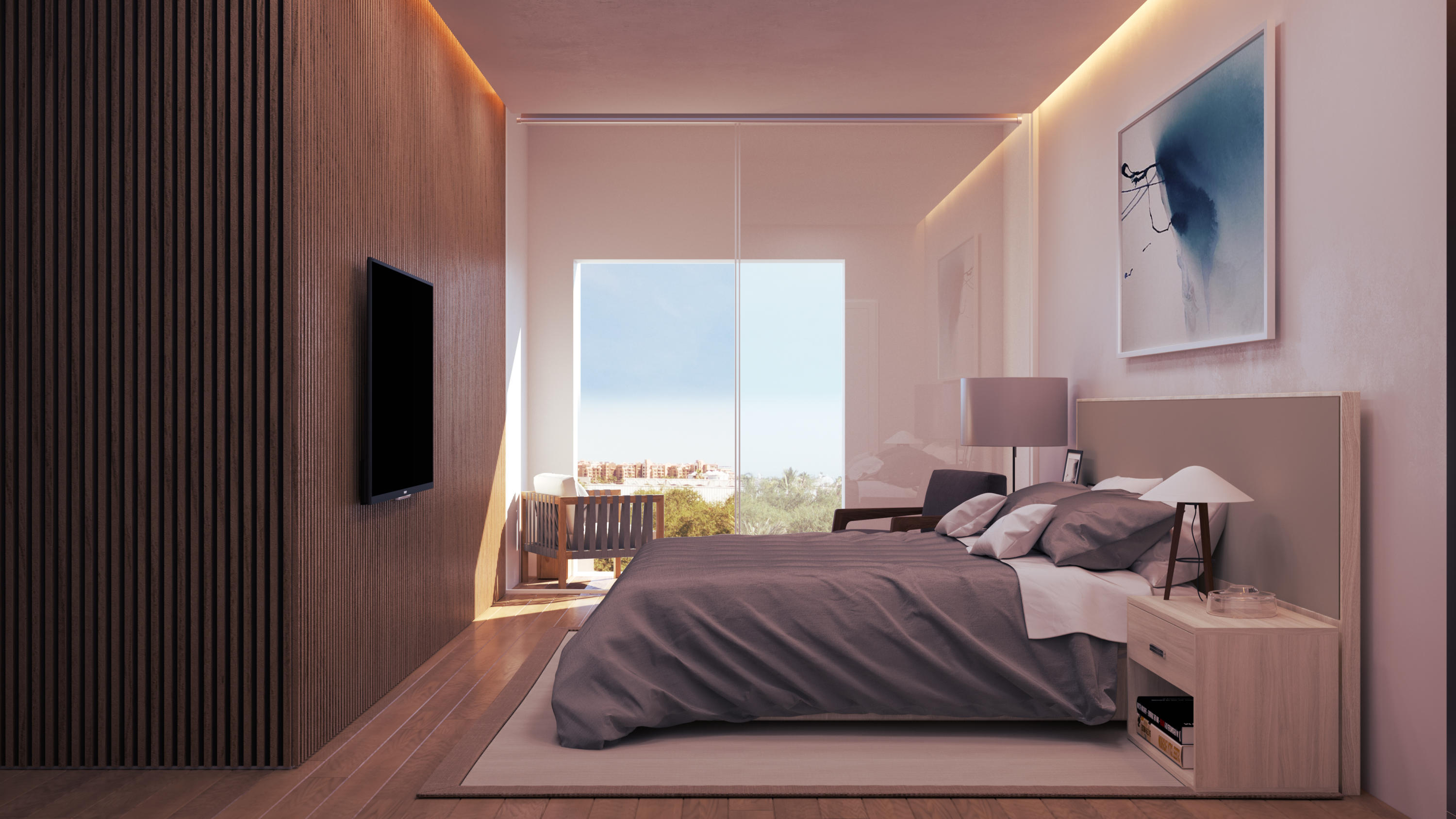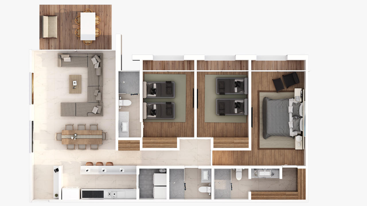 3 Bedroom Condo.3 Full Bathrooms. Double sink and Walk-in closet in Master Bedroom, Kitchen, Breakfast Bar, Dinning room, Living room, Laundry center, Terrace, Balconies and a Covered Parking Space.1,558.62 sq ft (Interior living and terraces & balconies)