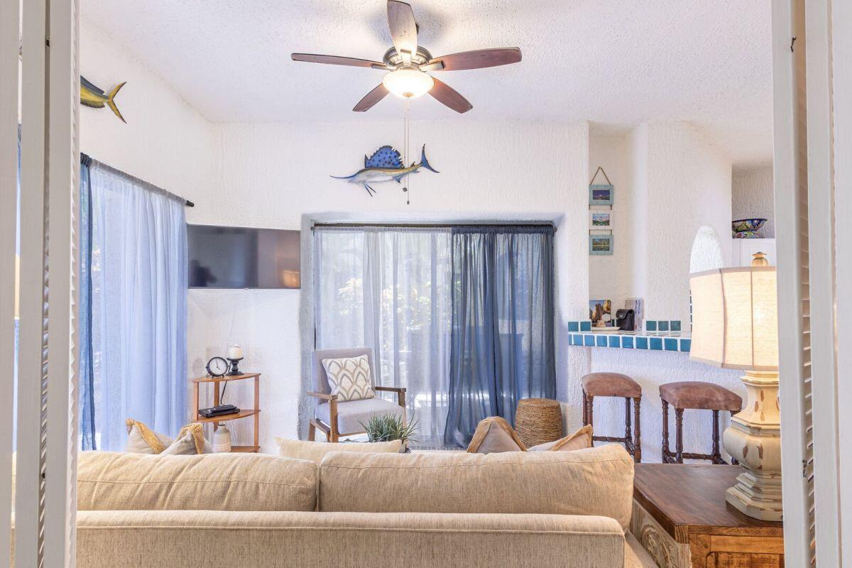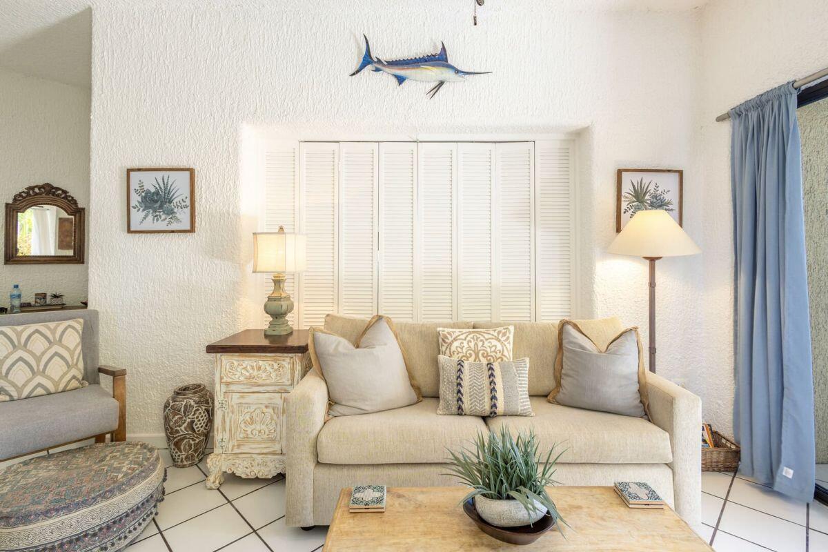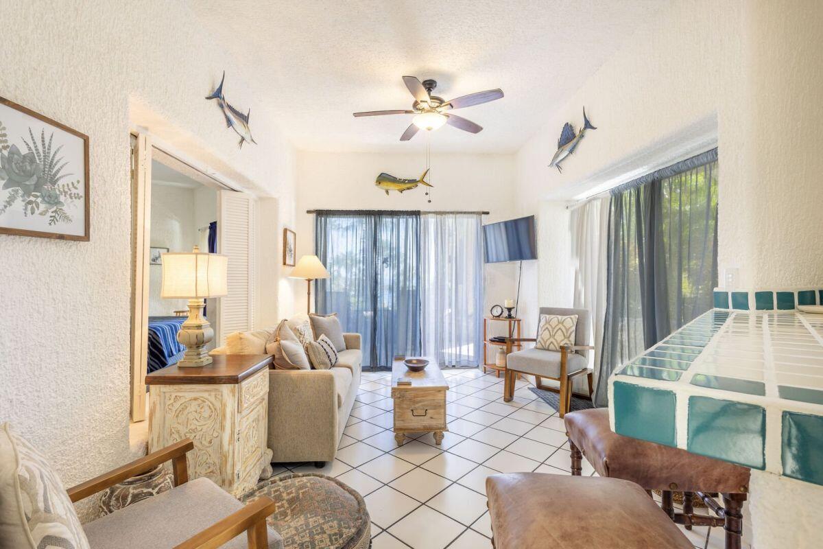 A rare ground level 2 bedroom/2 bath fully furnished condo in Misiones with pool and an ocean view. Located in building four on the southern end, this allows for the large wrap around terrace to have East facing views for sun rises and West facing views for the sunsets. This wonderful unit has been freshly painted and is ready for your personal use or for an investment. The community is ideally located on two great beaches (one for swimming and one for surfing). It also has a couple of stores within walking distance to get your necessary items to enjoy the place. A beautiful and friendly pool, with bar and restaurant is also on site. An overall established community that is a short drive/Uber to downtown and the marina.