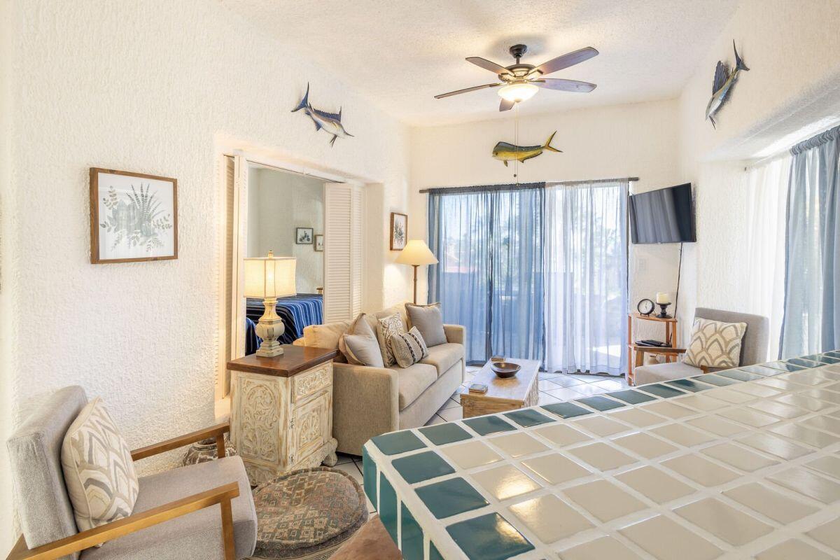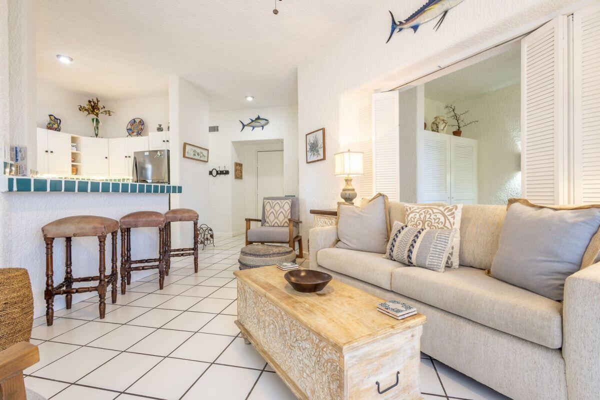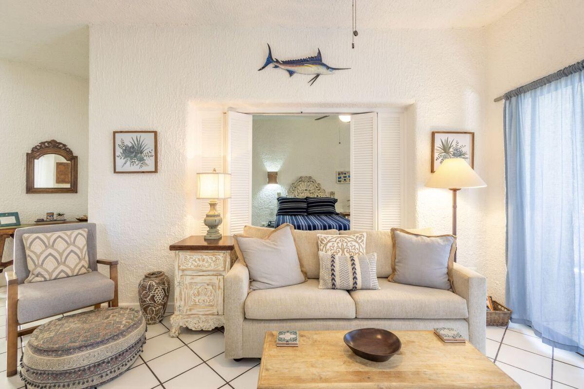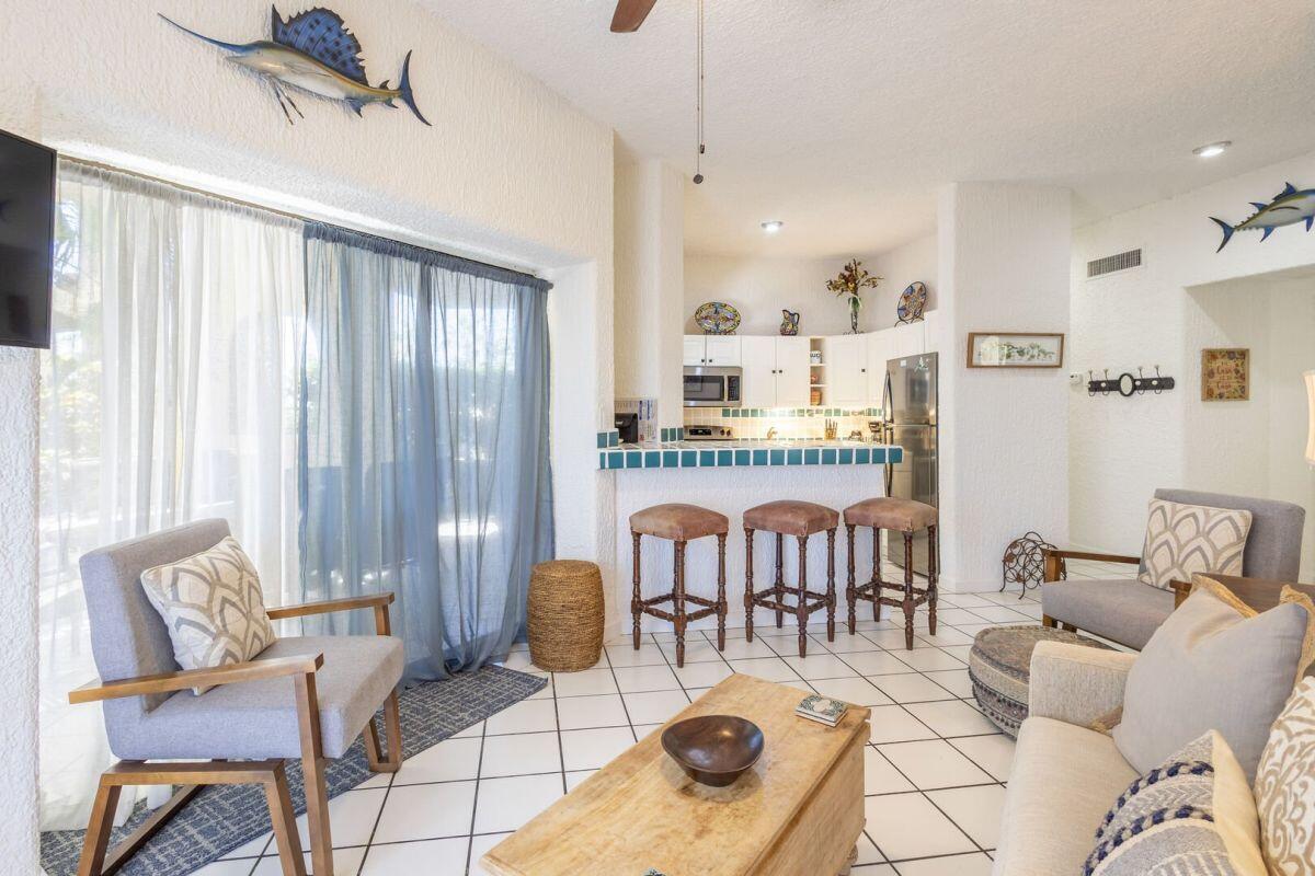 A rare ground level 2 bedroom/2 bath fully furnished condo in Misiones with pool and an ocean view. Located in building four on the southern end, this allows for the large wrap around terrace to have East facing views for sun rises and West facing views for the sunsets. This wonderful unit has been freshly painted and is ready for your personal use or for an investment. The community is ideally located on two great beaches (one for swimming and one for surfing). It also has a couple of stores within walking distance to get your necessary items to enjoy the place. A beautiful and friendly pool, with bar and restaurant is also on site. An overall established community that is a short drive/Uber to downtown and the marina.