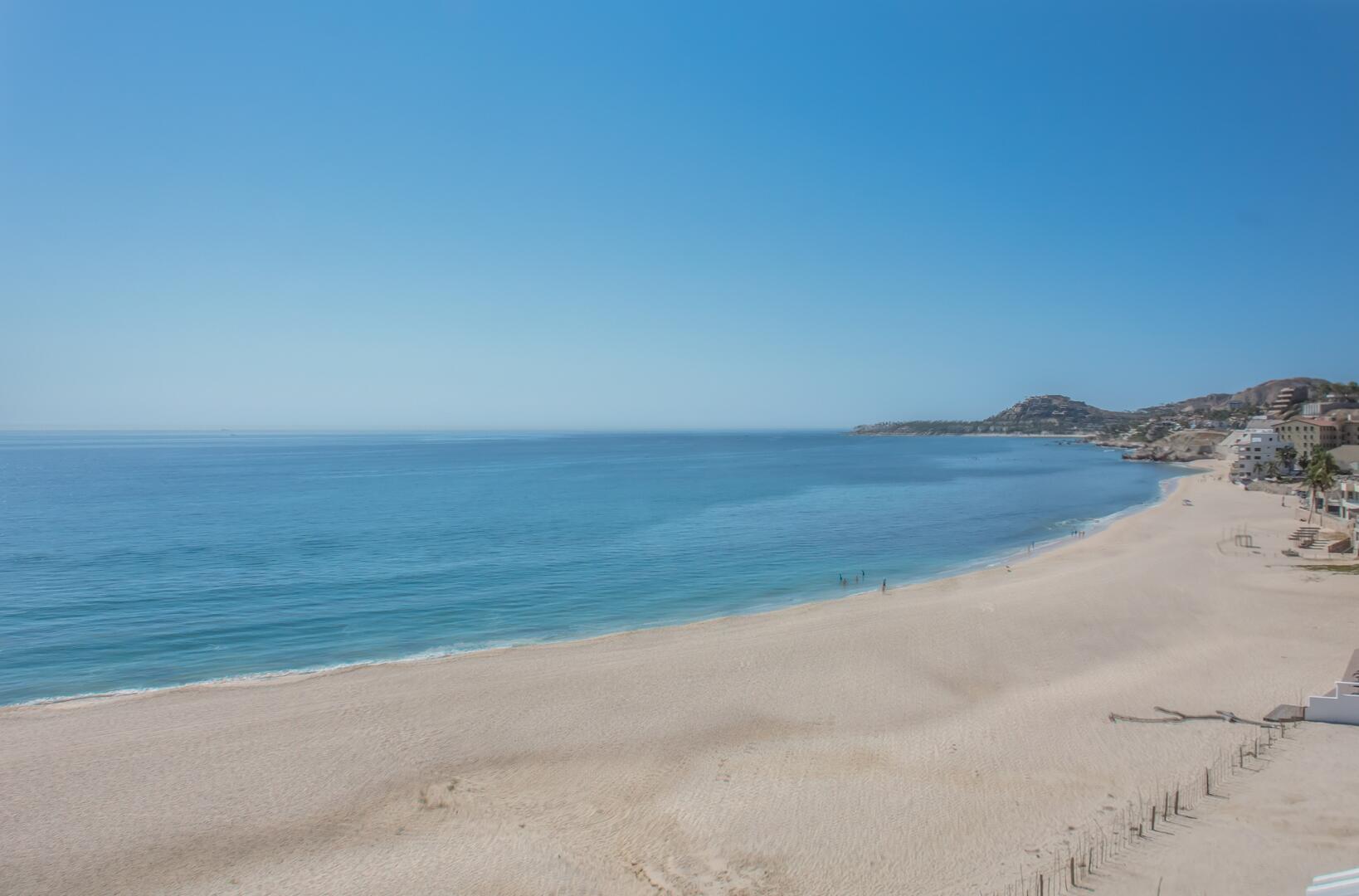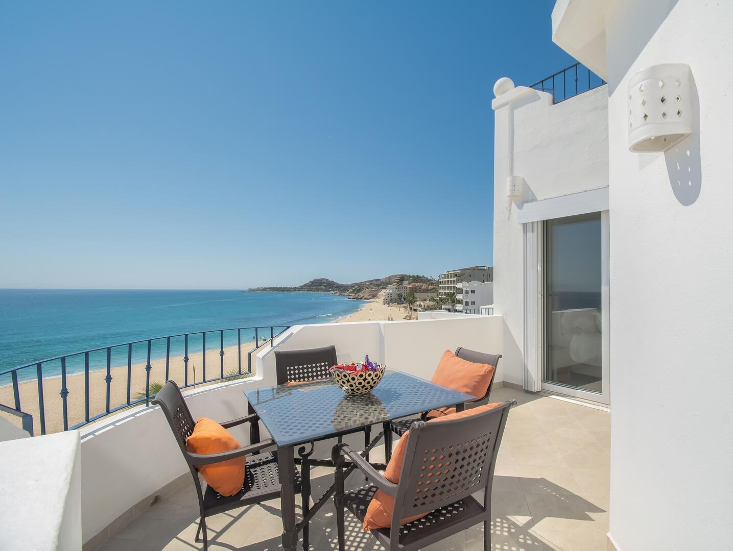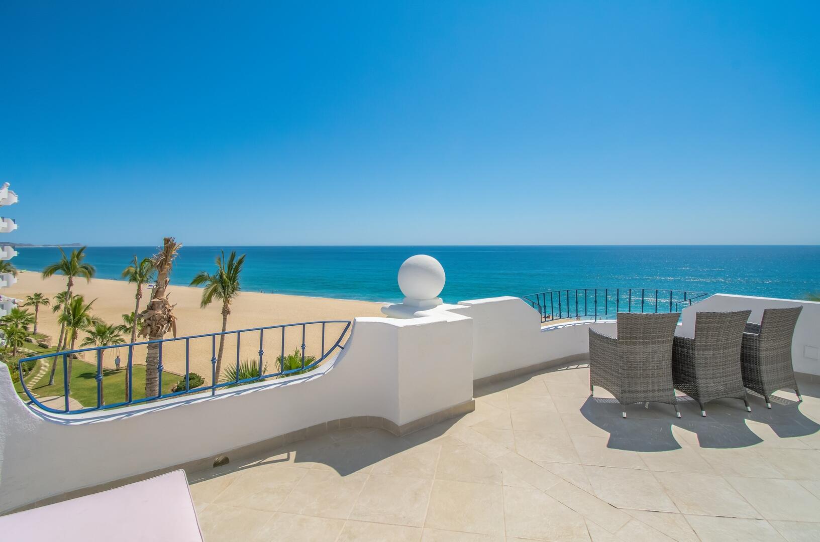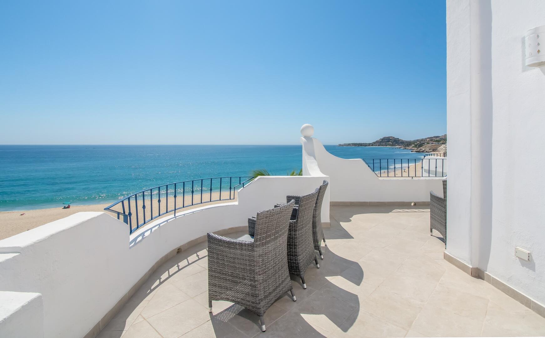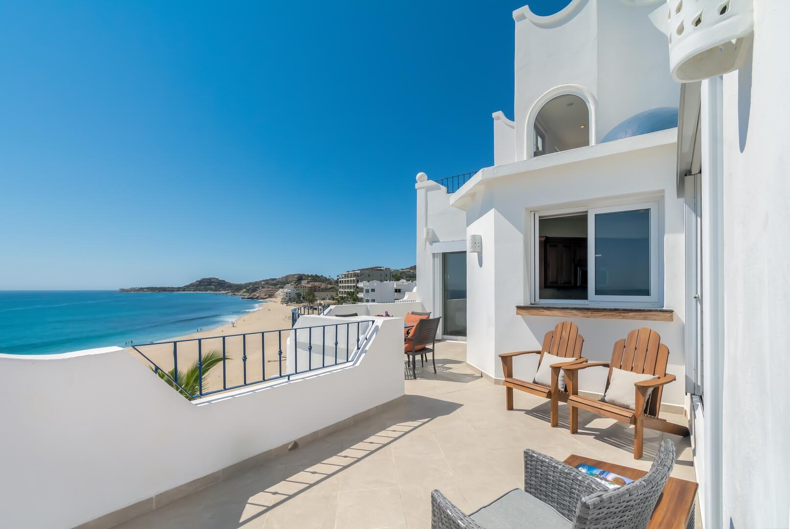 Enjoy unobstructed, 180 degree views from Punta Gorda to Punta Palmilla in this fabulous newly renovated two story 3 BR, 3 BA oceanfront penthouse at Mykonos Bay Resort. Spacious floor plan, sea and surf views from every room, boveda brick cupola domes in ceilings, four terraces including wrap around terrace at great room. Sliders and oversized windows fill the rooms with light and the sounds of the Sea of Cortez lapping the shores below. New high end appliances, furnishings, doors and windows throughout. Mykonos community amenities include 3 oceanfront pools, a well-equipped sea view fitness center and tennis / pickleball court. A hot tub, fire pit and lots of lounging areas, all with a great view and direct access to the beach are shared with only 72 units. Gated and secure grounds are
