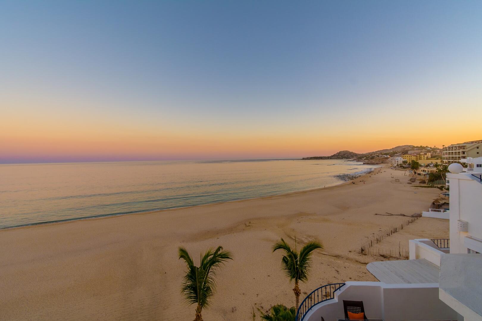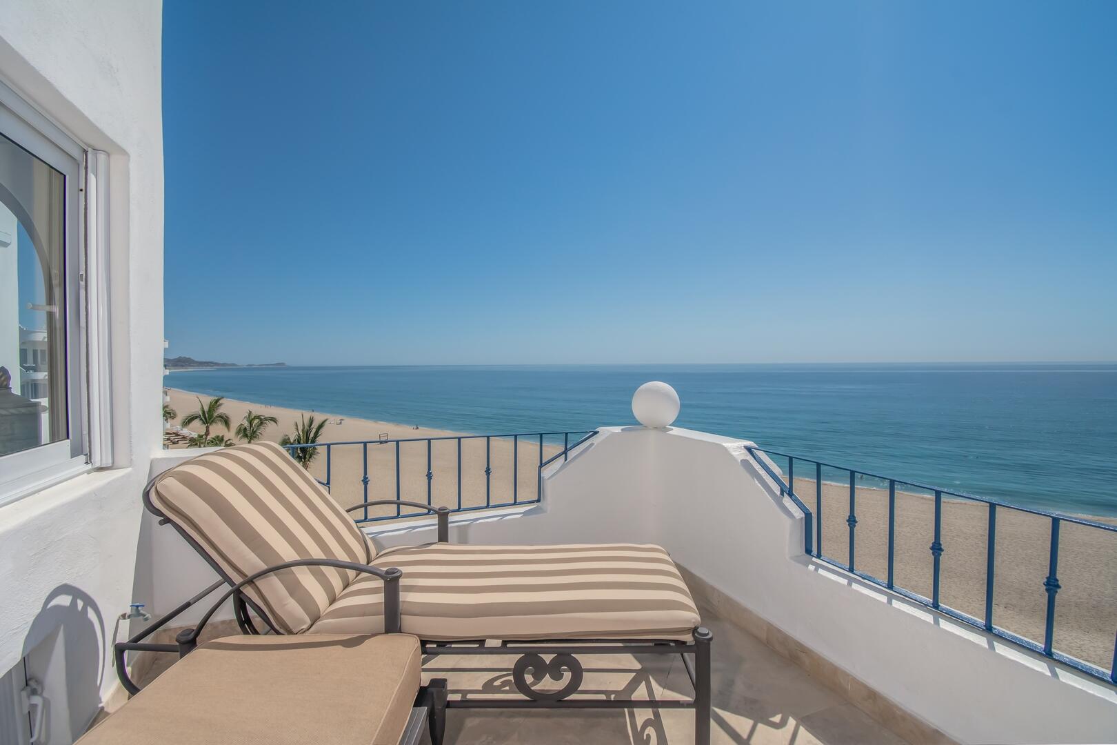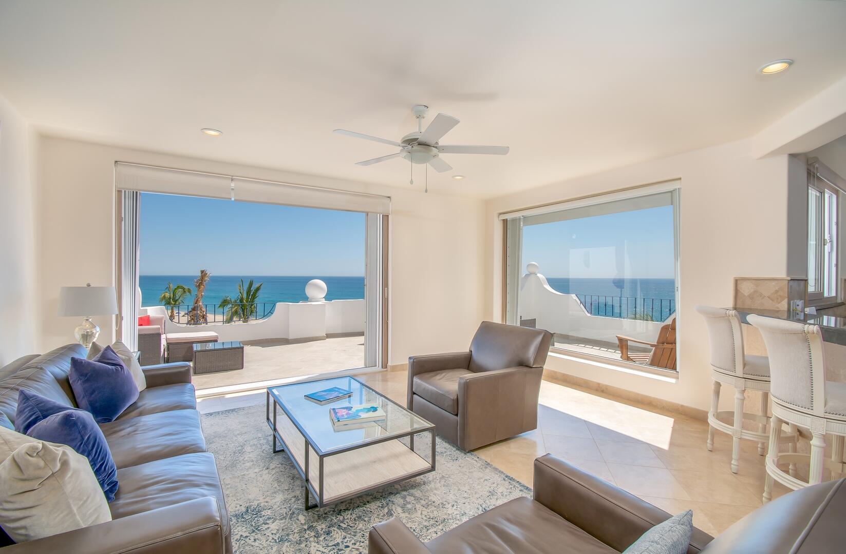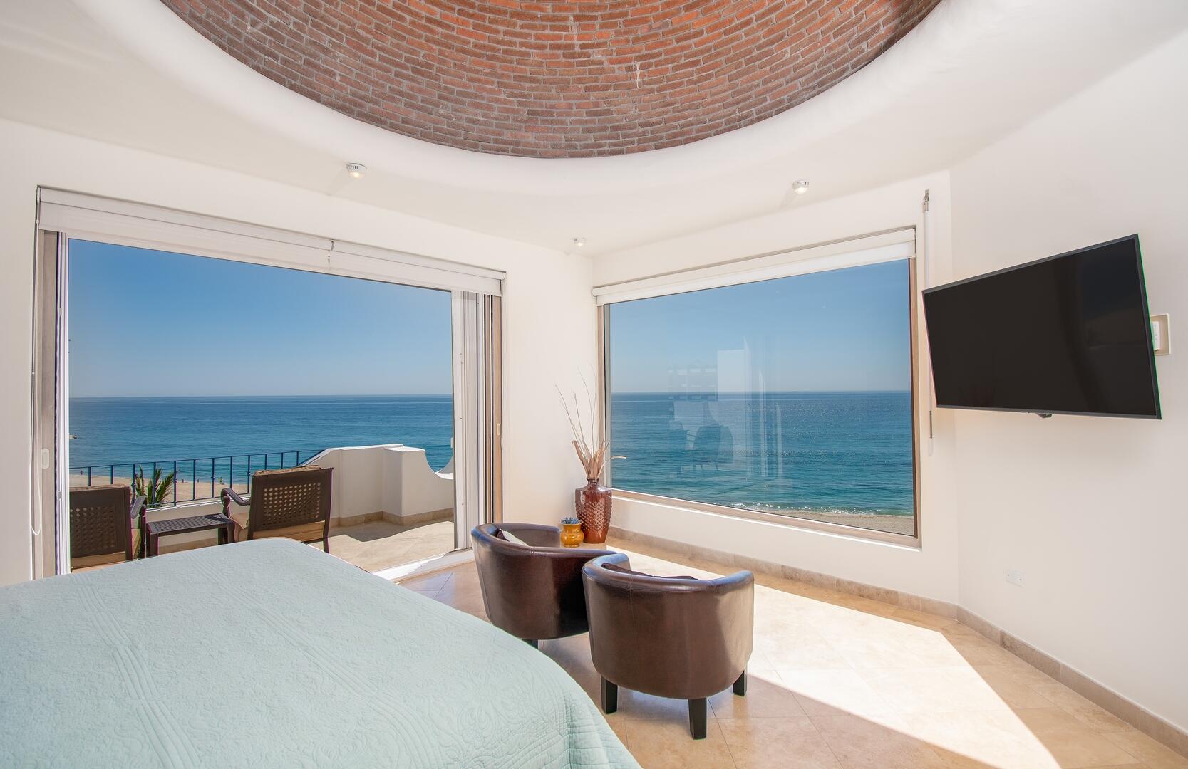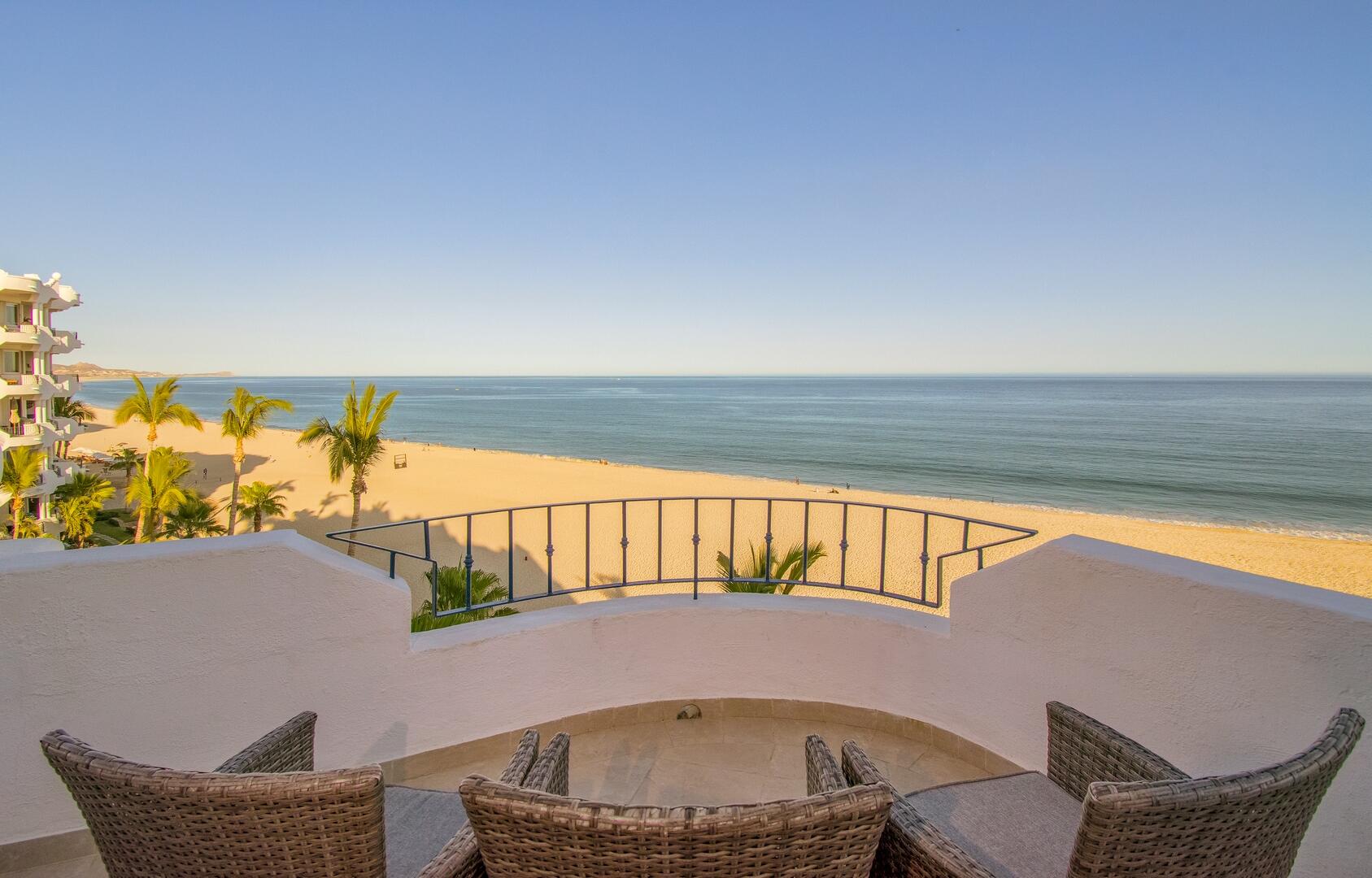 Enjoy unobstructed, 180 degree views from Punta Gorda to Punta Palmilla in this fabulous newly renovated two story 3 BR, 3 BA oceanfront penthouse at Mykonos Bay Resort. Spacious floor plan, sea and surf views from every room, boveda brick cupola domes in ceilings, four terraces including wrap around terrace at great room. Sliders and oversized windows fill the rooms with light and the sounds of the Sea of Cortez lapping the shores below. New high end appliances, furnishings, doors and windows throughout. Mykonos community amenities include 3 oceanfront pools, a well-equipped sea view fitness center and tennis / pickleball court. A hot tub, fire pit and lots of lounging areas, all with a great view and direct access to the beach are shared with only 72 units. Gated and secure grounds are