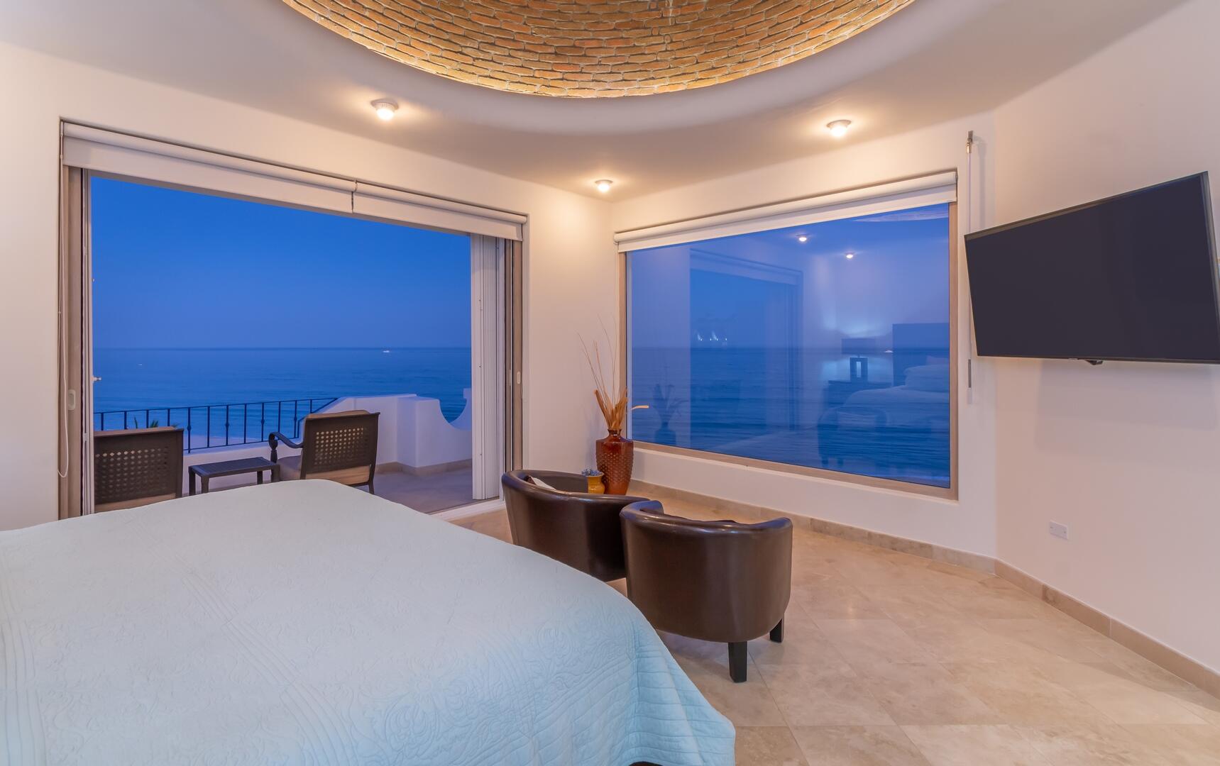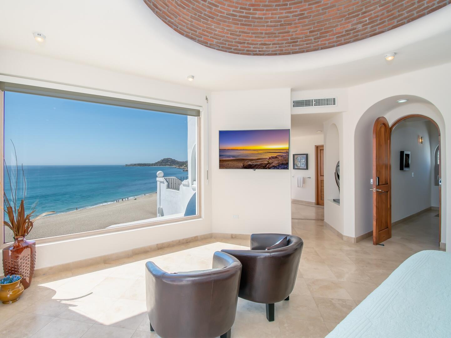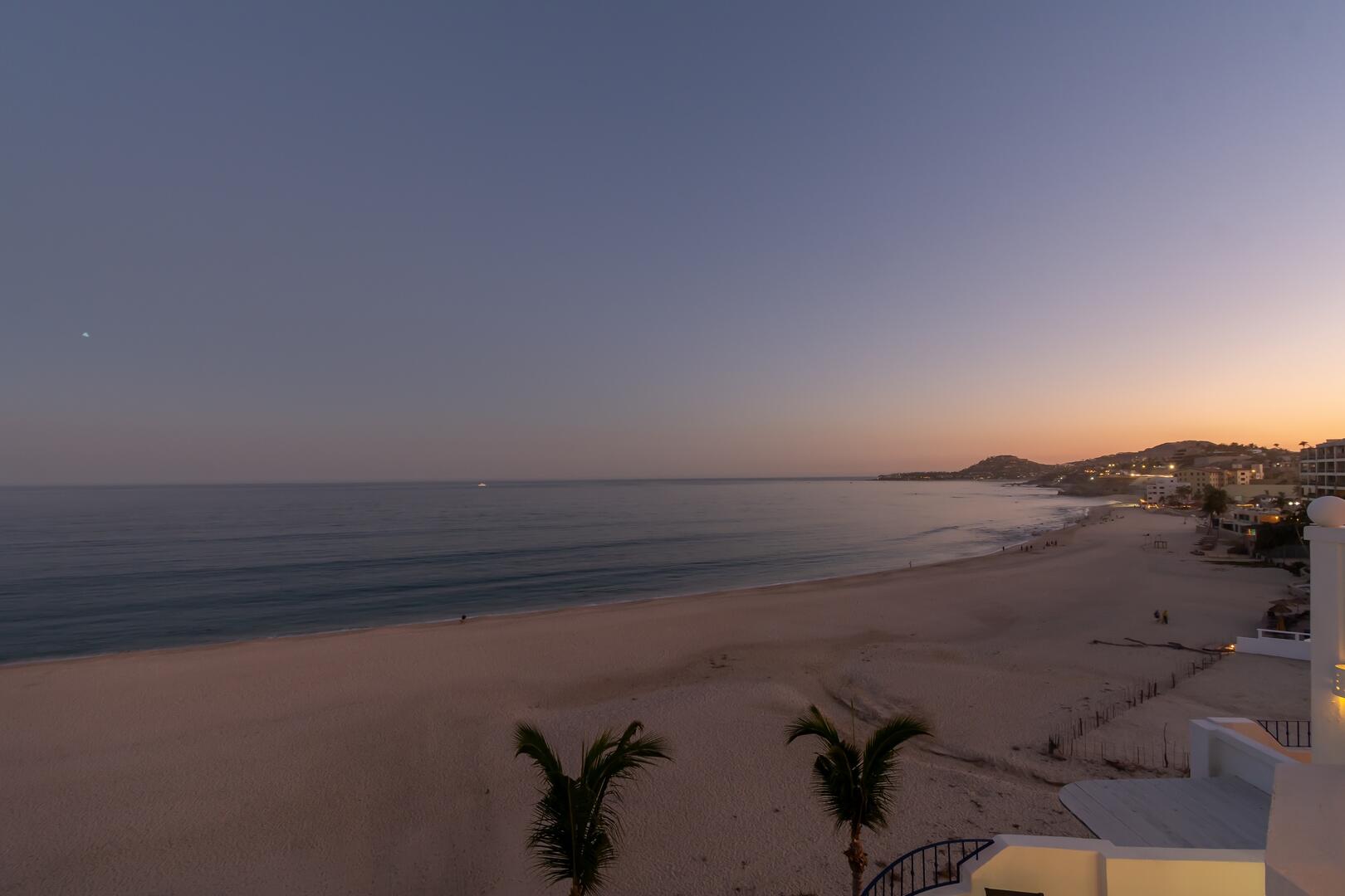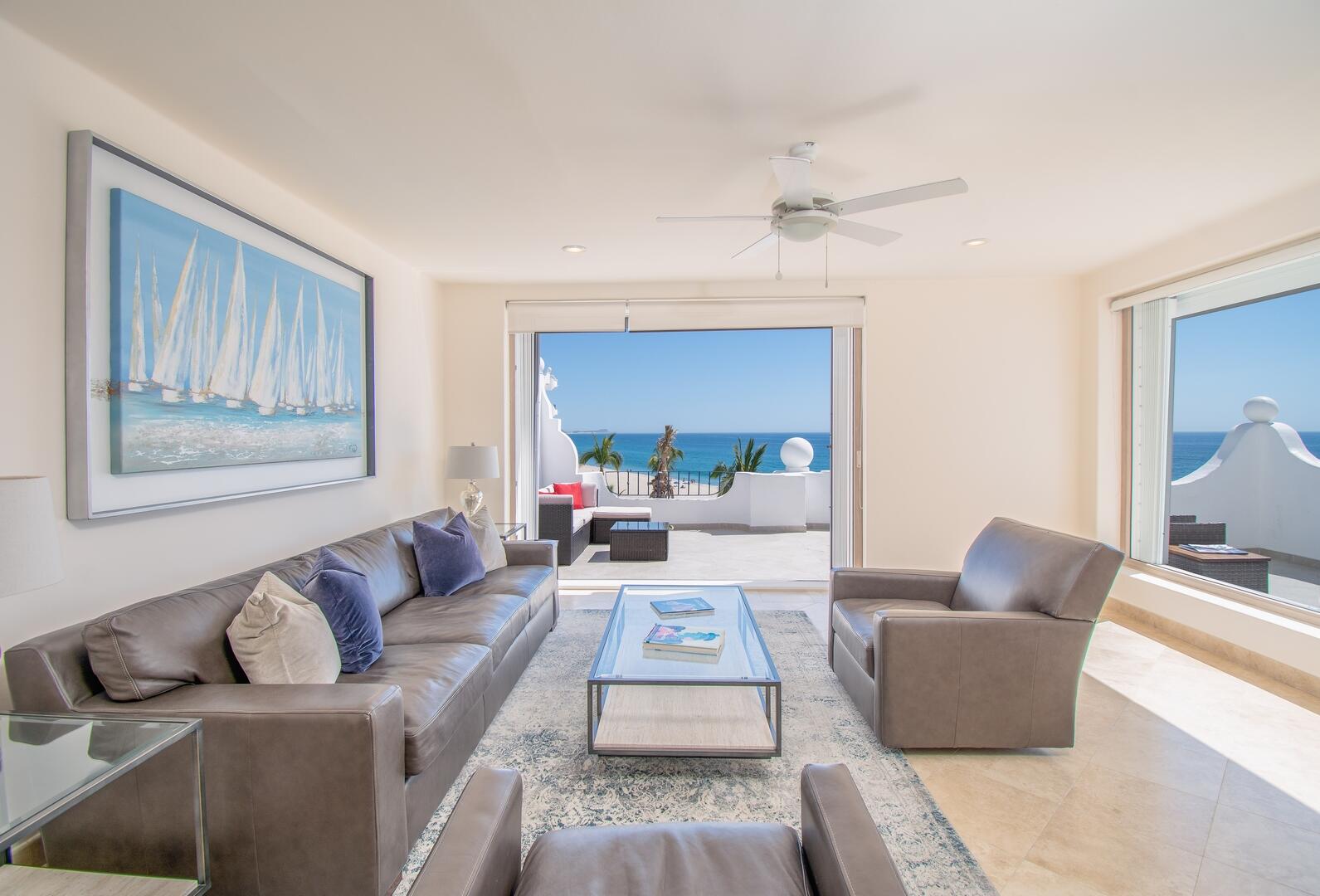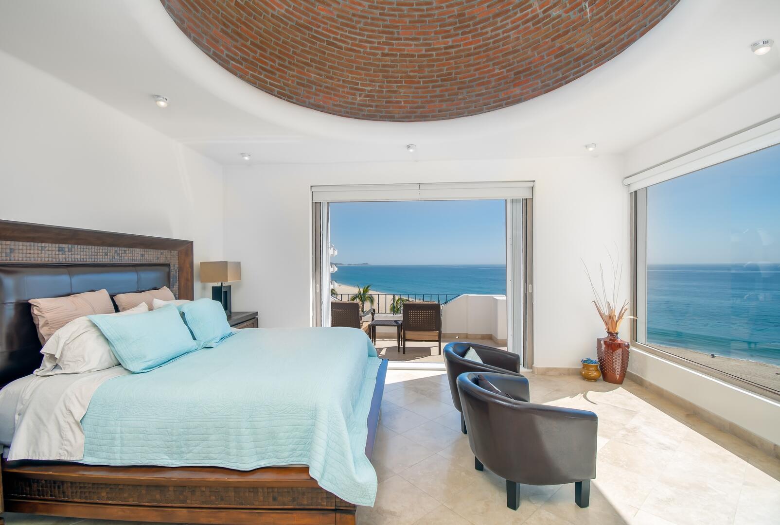 Enjoy unobstructed, 180 degree views from Punta Gorda to Punta Palmilla in this fabulous newly renovated two story 3 BR, 3 BA oceanfront penthouse at Mykonos Bay Resort. Spacious floor plan, sea and surf views from every room, boveda brick cupola domes in ceilings, four terraces including wrap around terrace at great room. Sliders and oversized windows fill the rooms with light and the sounds of the Sea of Cortez lapping the shores below. New high end appliances, furnishings, doors and windows throughout. Mykonos community amenities include 3 oceanfront pools, a well-equipped sea view fitness center and tennis / pickleball court. A hot tub, fire pit and lots of lounging areas, all with a great view and direct access to the beach are shared with only 72 units. Gated and secure grounds are