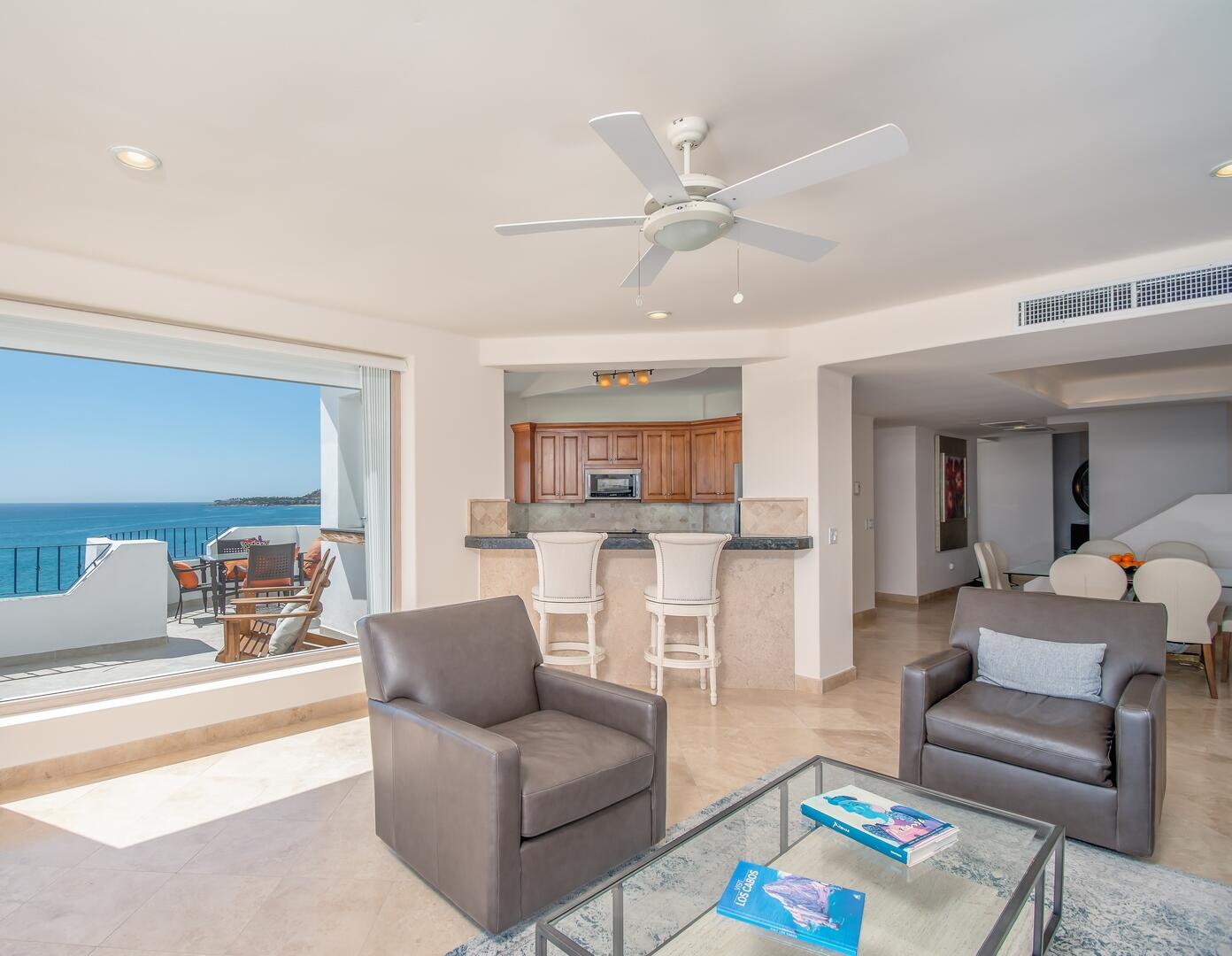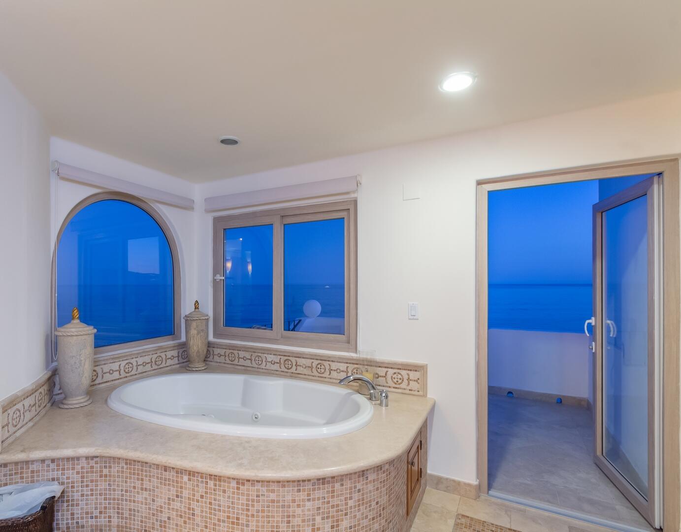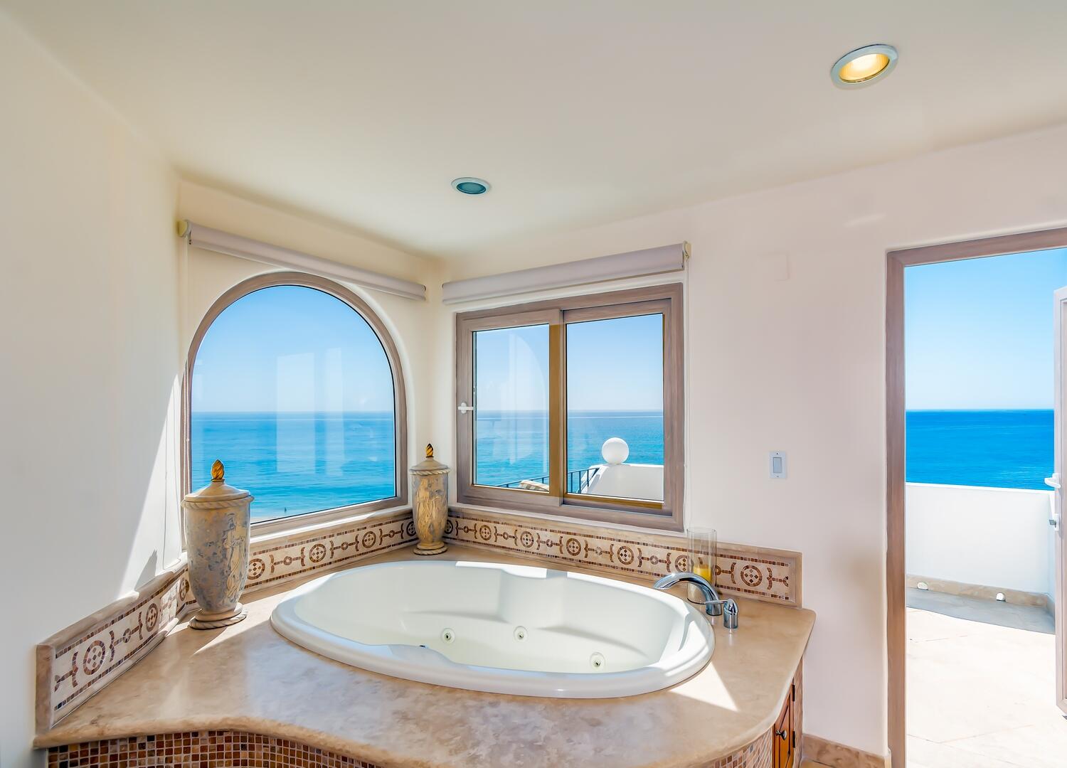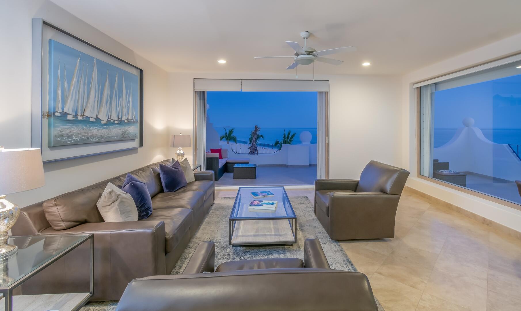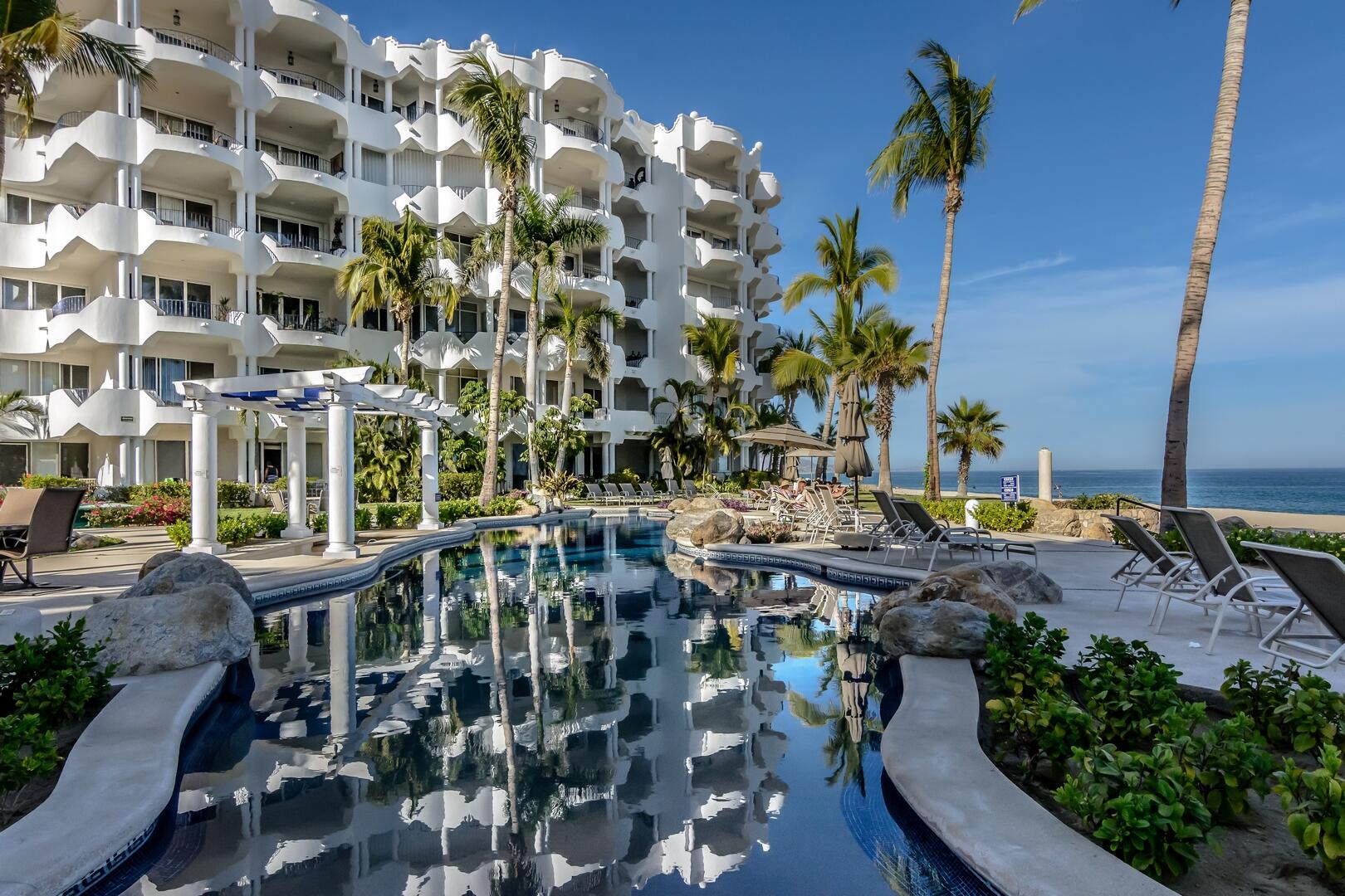 Enjoy unobstructed, 180 degree views from Punta Gorda to Punta Palmilla in this fabulous newly renovated two story 3 BR, 3 BA oceanfront penthouse at Mykonos Bay Resort. Spacious floor plan, sea and surf views from every room, boveda brick cupola domes in ceilings, four terraces including wrap around terrace at great room. Sliders and oversized windows fill the rooms with light and the sounds of the Sea of Cortez lapping the shores below. New high end appliances, furnishings, doors and windows throughout. Mykonos community amenities include 3 oceanfront pools, a well-equipped sea view fitness center and tennis / pickleball court. A hot tub, fire pit and lots of lounging areas, all with a great view and direct access to the beach are shared with only 72 units. Gated and secure grounds are