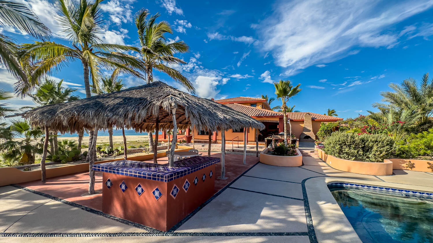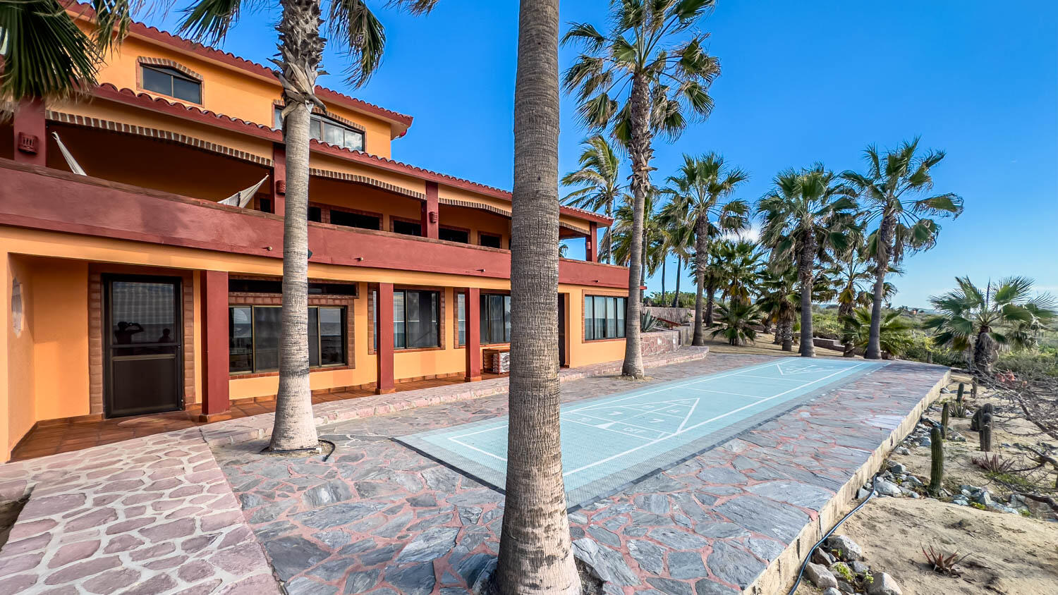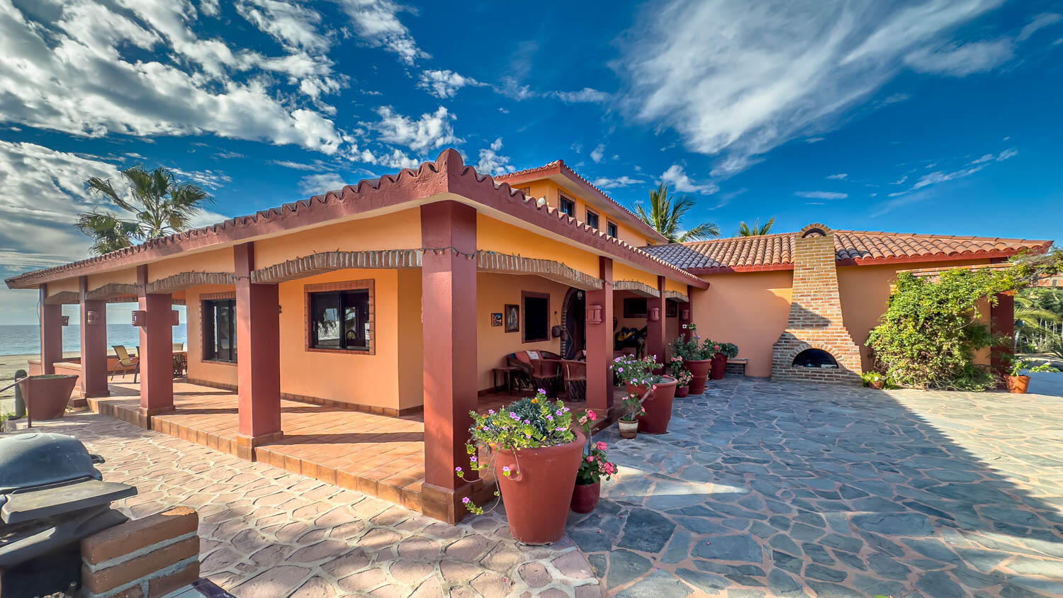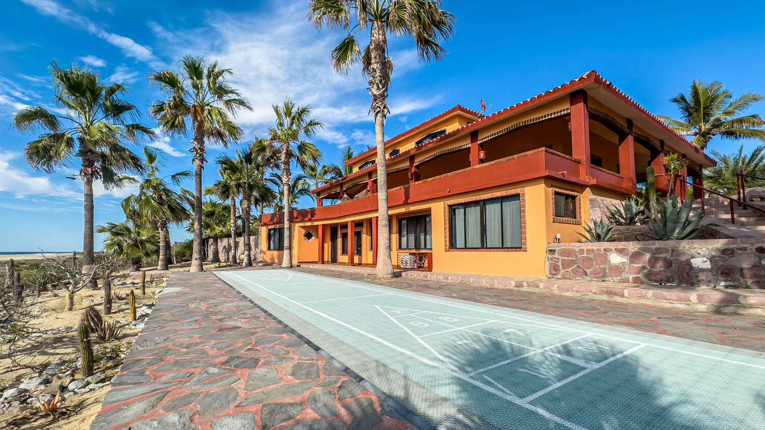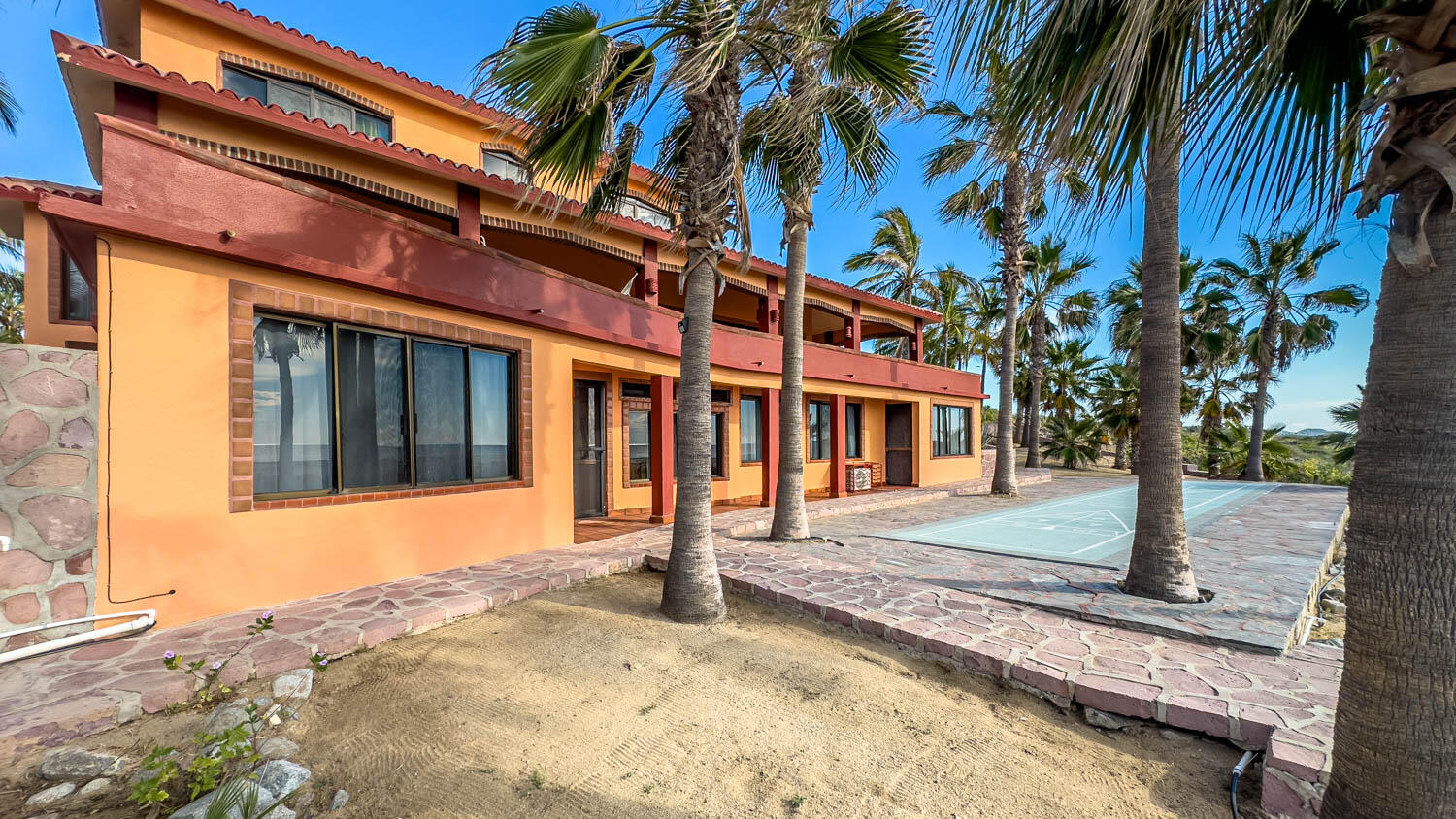 The quintessential Baja beachfront dream home. Enter the welcoming arched electric gates and you enter into the past and the old Baja California Sur before paved roads and gated communities. 2 1/2 acres of total privacy fronting the spectacular white sand beach on the Pacific Ocean in the quaint hamlet of Elias Calles. Bring the kids, families, and friends as there is something to do for everyone here in the charming fully landscaped gardens including a 39 X 17 ft swimming pool with jacuzzi, tennis court, and beachfront shuffle board. The house the master bedroom on the ground floor and the large oversize kitchen/living dining area all with sliders leading out the covered wrap around deck and big picture windows taking in the sea views. The upstairs has 2 guest bedrooms and 1 full bath.