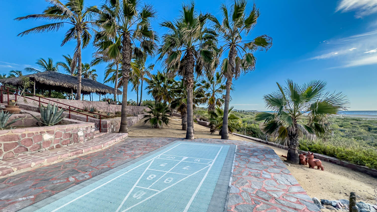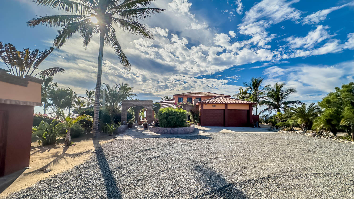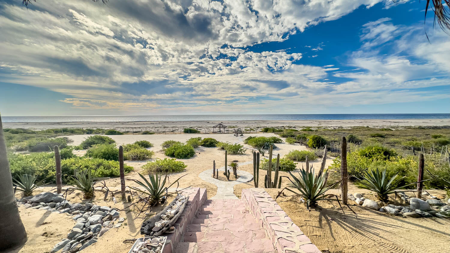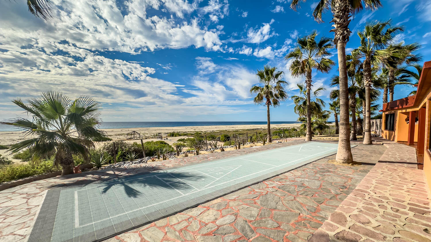 The quintessential Baja beachfront dream home. Enter the welcoming arched electric gates and you enter into the past and the old Baja California Sur before paved roads and gated communities. 2 1/2 acres of total privacy fronting the spectacular white sand beach on the Pacific Ocean in the quaint hamlet of Elias Calles. Bring the kids, families, and friends as there is something to do for everyone here in the charming fully landscaped gardens including a 39 X 17 ft swimming pool with jacuzzi, tennis court, and beachfront shuffle board. The house the master bedroom on the ground floor and the large oversize kitchen/living dining area all with sliders leading out the covered wrap around deck and big picture windows taking in the sea views. The upstairs has 2 guest bedrooms and 1 full bath.