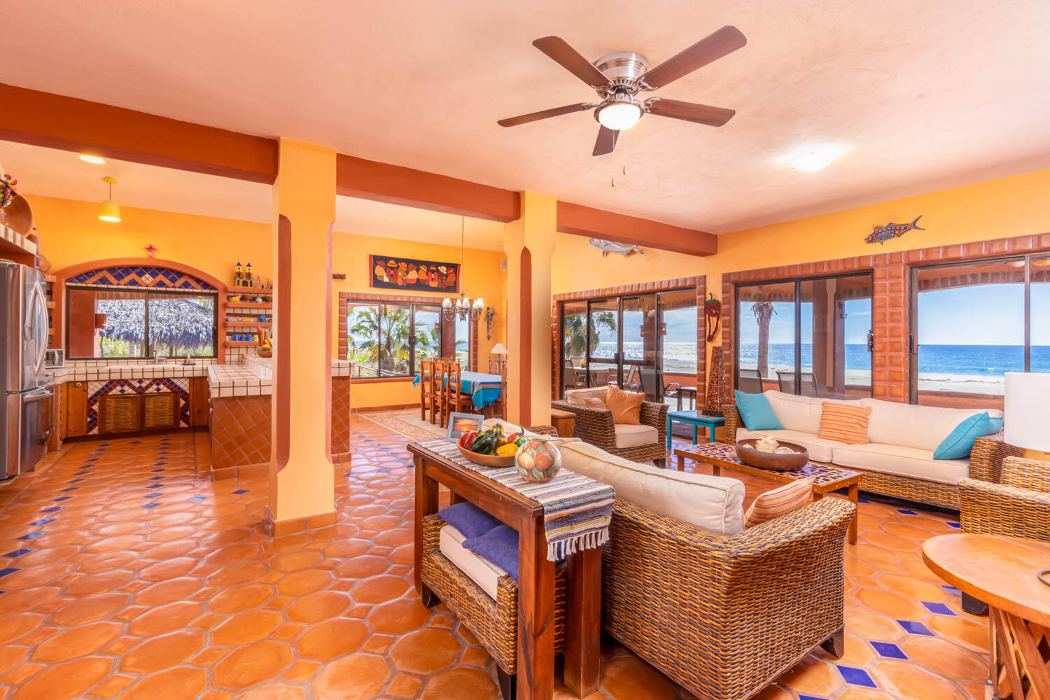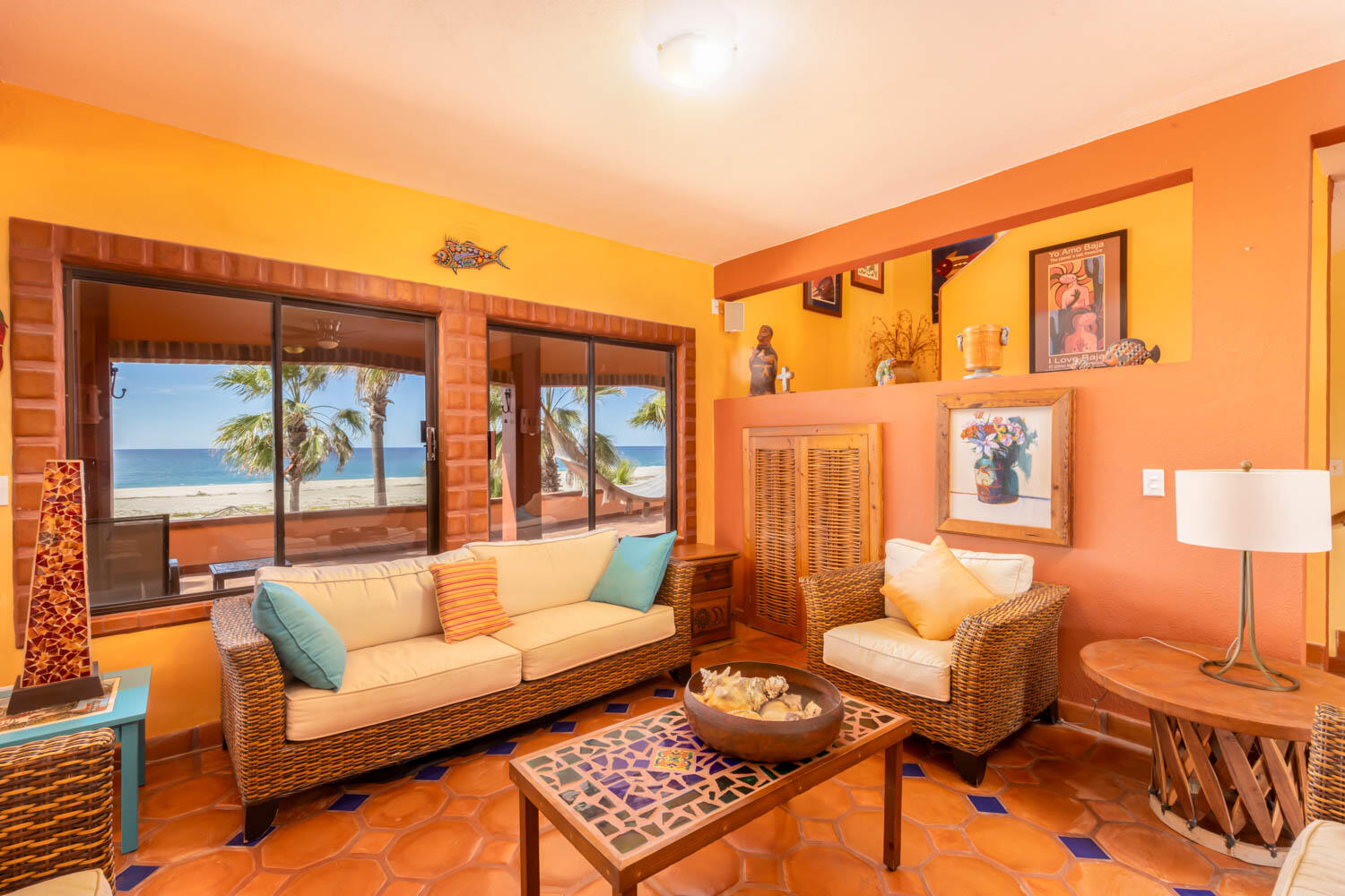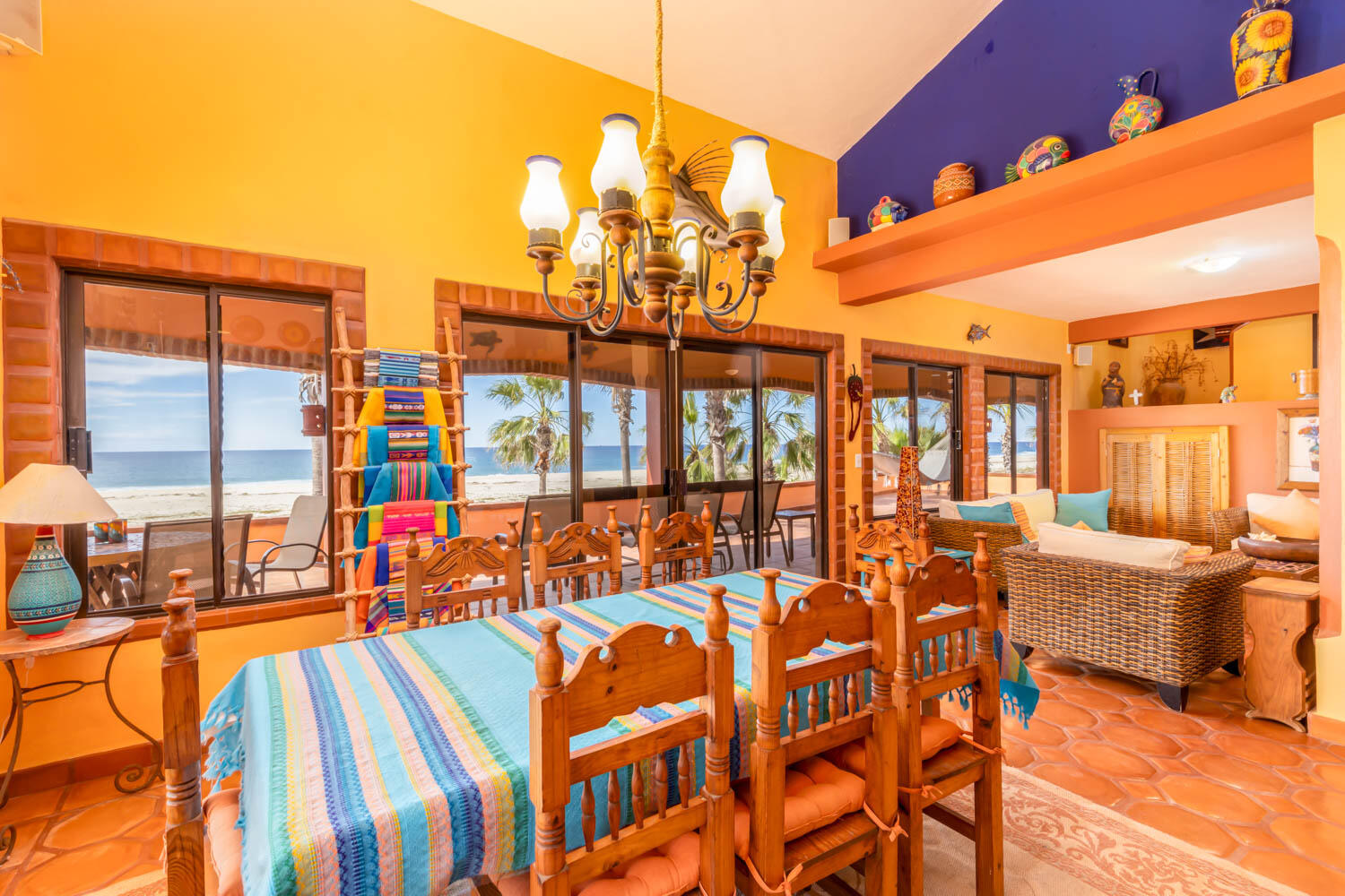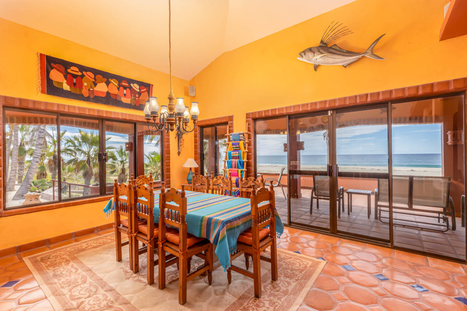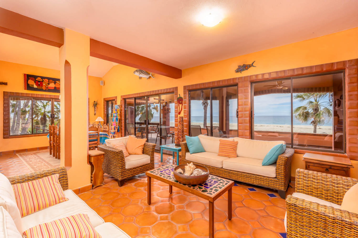 The quintessential Baja beachfront dream home. Enter the welcoming arched electric gates and you enter into the past and the old Baja California Sur before paved roads and gated communities. 2 1/2 acres of total privacy fronting the spectacular white sand beach on the Pacific Ocean in the quaint hamlet of Elias Calles. Bring the kids, families, and friends as there is something to do for everyone here in the charming fully landscaped gardens including a 39 X 17 ft swimming pool with jacuzzi, tennis court, and beachfront shuffle board. The house the master bedroom on the ground floor and the large oversize kitchen/living dining area all with sliders leading out the covered wrap around deck and big picture windows taking in the sea views. The upstairs has 2 guest bedrooms and 1 full bath.