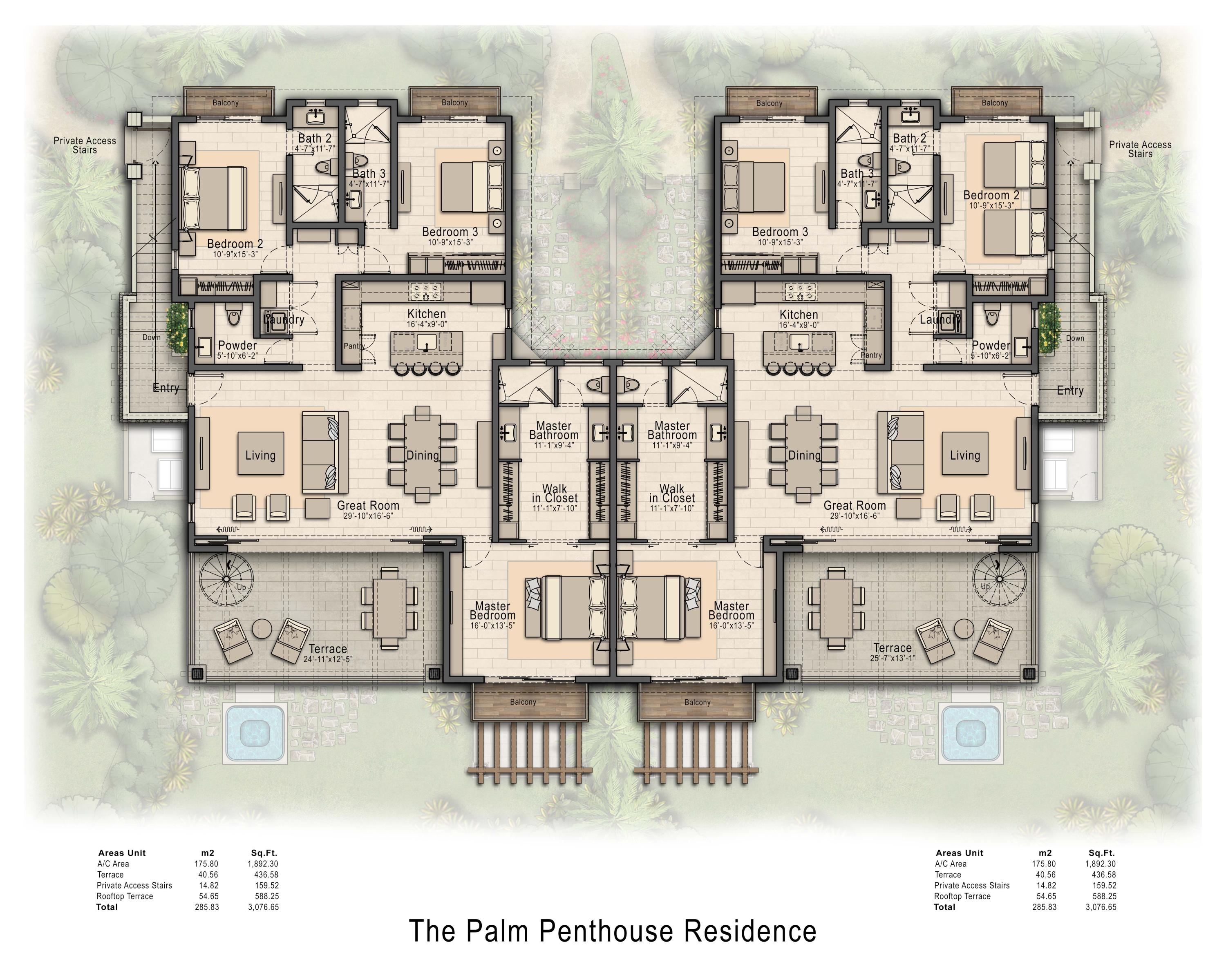 The private staircase entrance introduces the Palm Penthouse residence top-of-the-world penthouse ambiance. The spacious open concept design with its unstinting dining, living and accommodating great rooms, flawlessly unites the indoors with the expansive outdoor terrace through pocket sliders and also to the stunning rooftop terrace by way of the divinely-designed spiral staircase. Amazing unobstructed views, moon and star-gazing highlight this vast terrace which can be optimized with a personal fire pit, barbecue and hot tub. The elegantly-appointed gourmet kitchen, created with the finest accoutrements and exquisite detailing invites unparalleled contentment