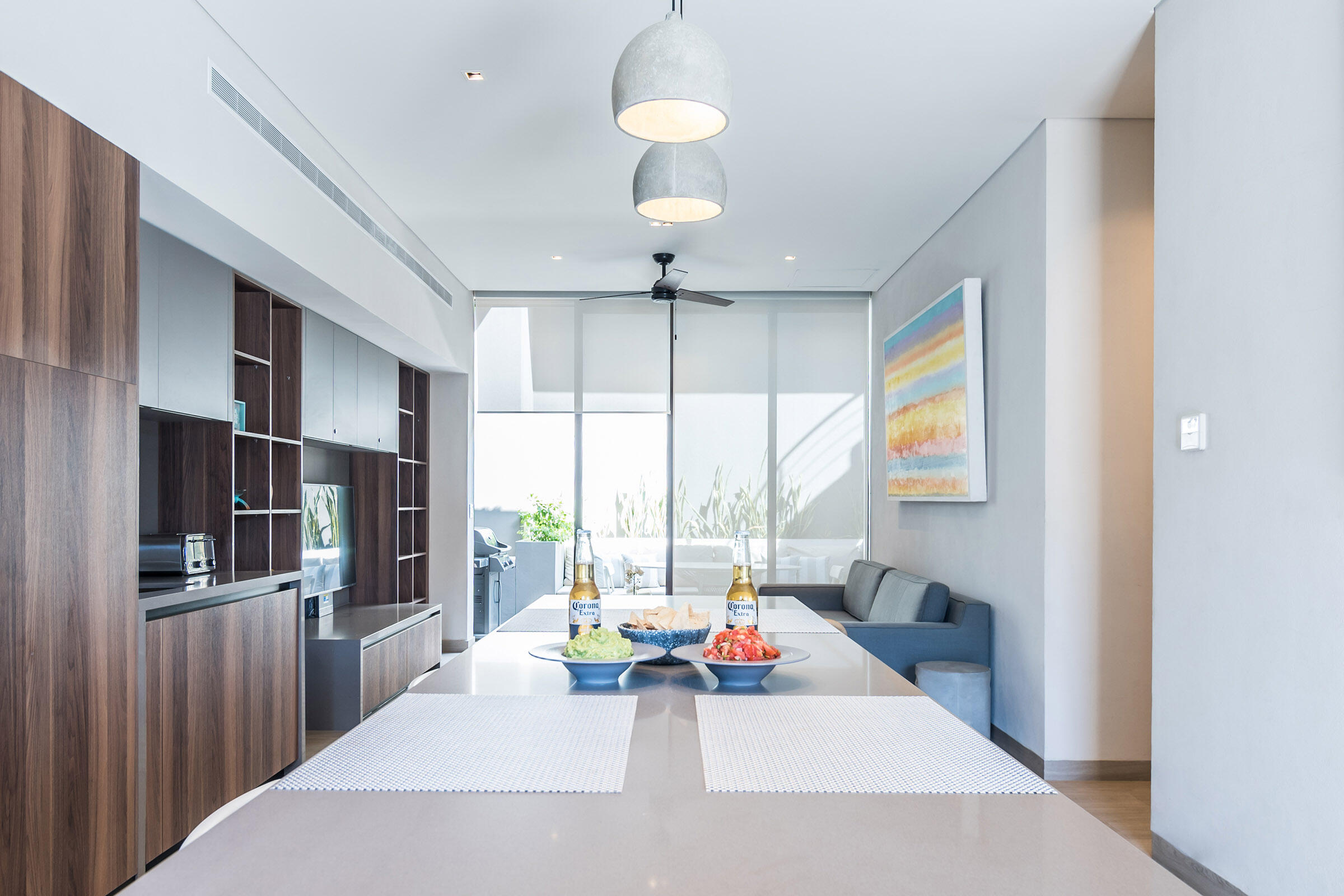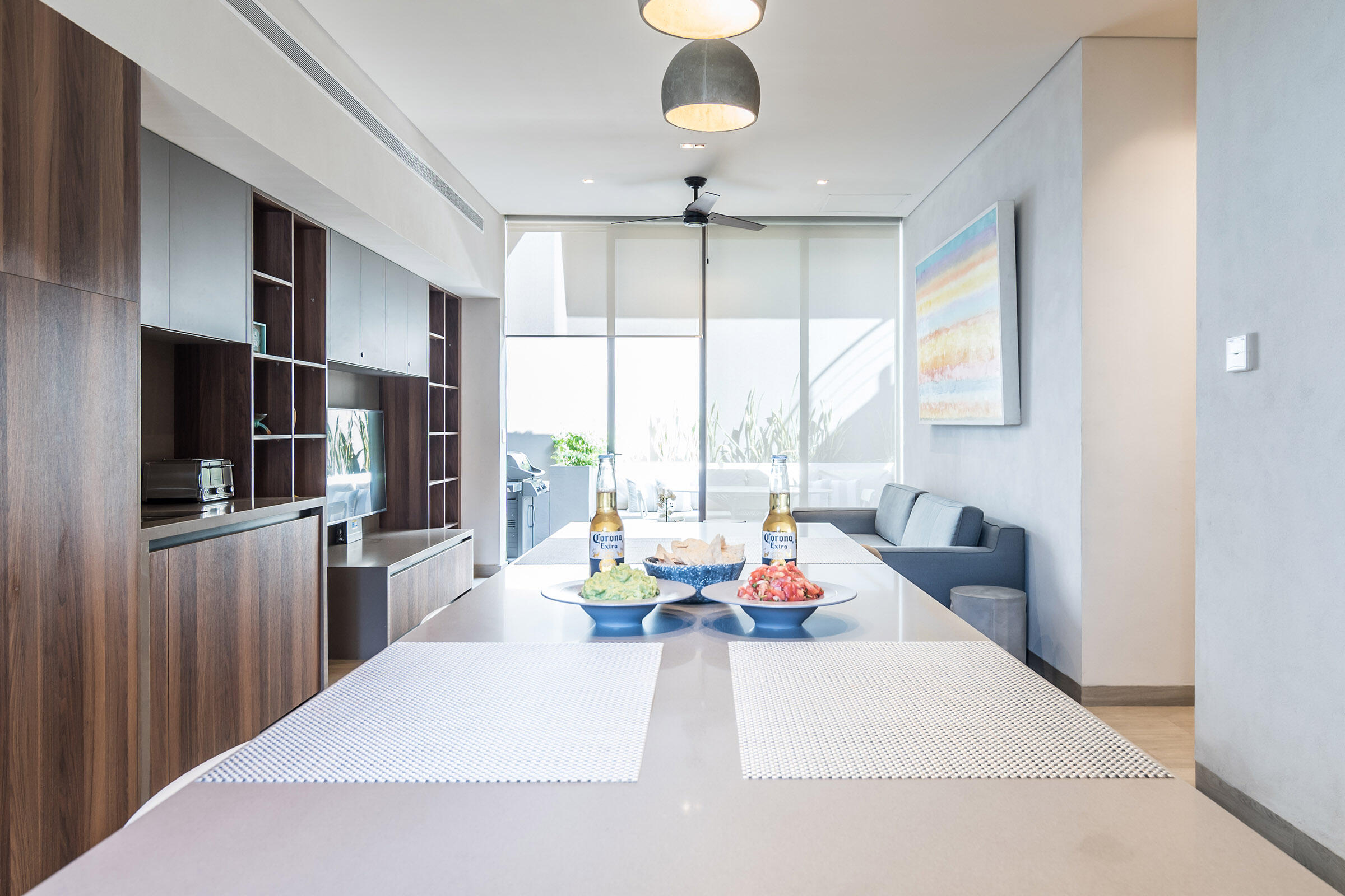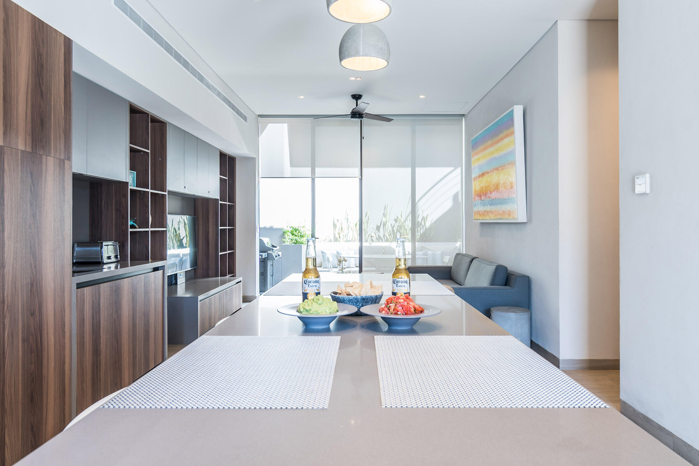 Beautiful Condo located in The Paraiso Residences, a modern new complex of luxury condominiums located at Puerto Paraiso Mall. In the middle of the Cabo San Lucas Marina, known to host ultra luxury yachts, one of the biggest sport fishing annual competitions ”Bisbee’s”, plus plenty of restaurants for early breakfast or fine dining, as well as the top Cabo night spots.This Condo features modern decoration in perfectly illuminated spaces, kitchen fully equipped. A spacious and fun living room perfect to entertain and relax, with a comfortable couch that can make extra sleeping space. Two well sized bedrooms, Master with King size bed and ensuite shower bathroom as well, both with spacious closet space. The living room pocket doors open to extend your social area to the exterior terrace