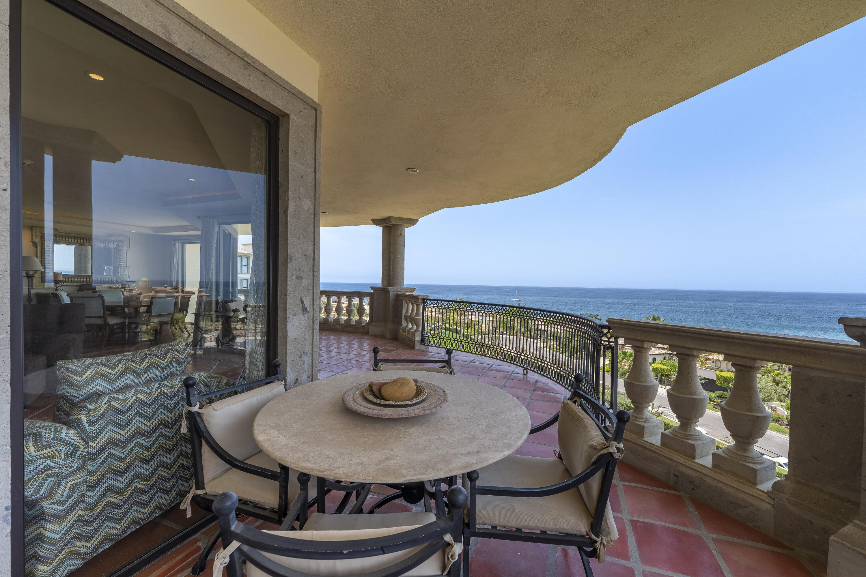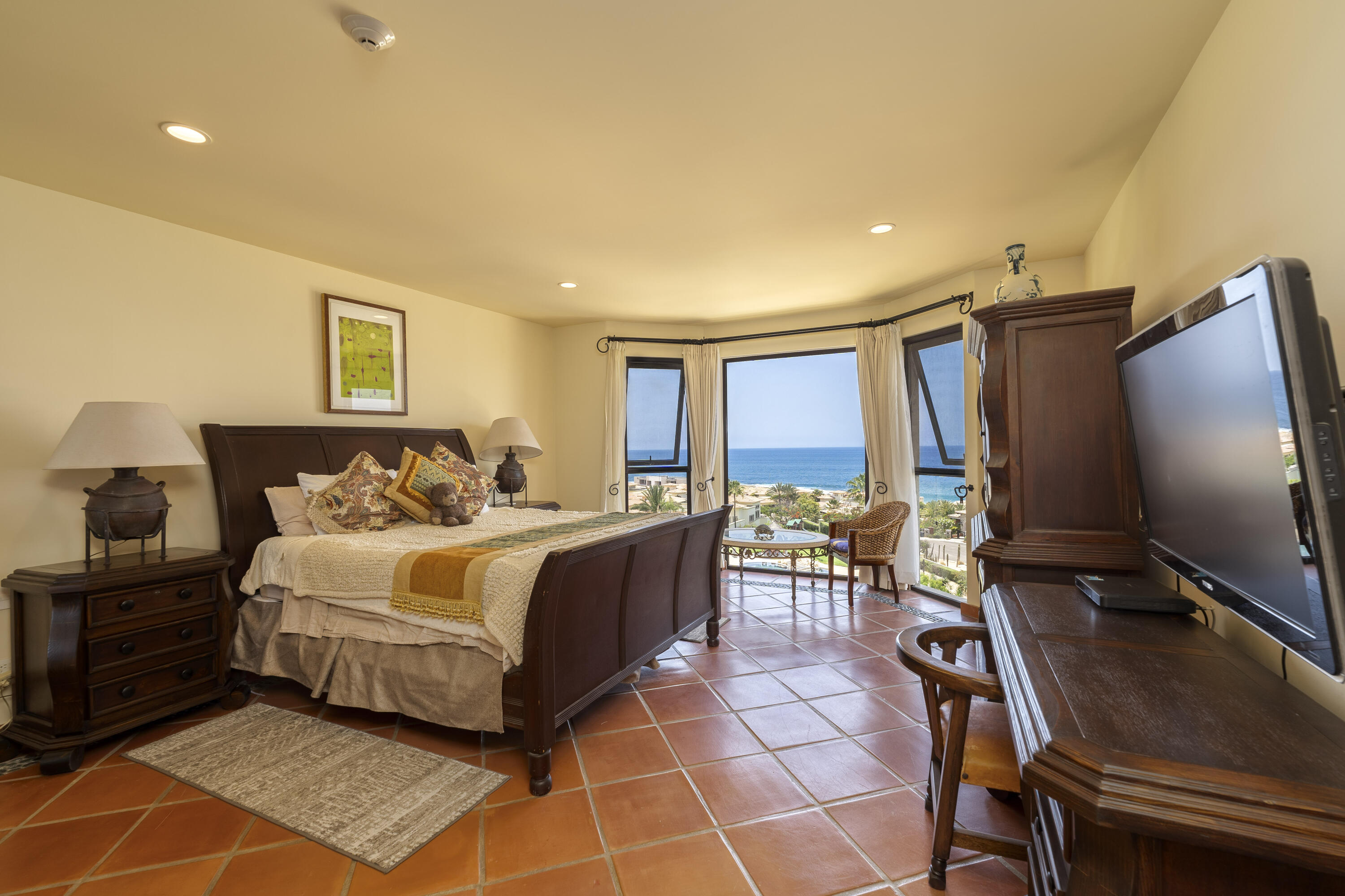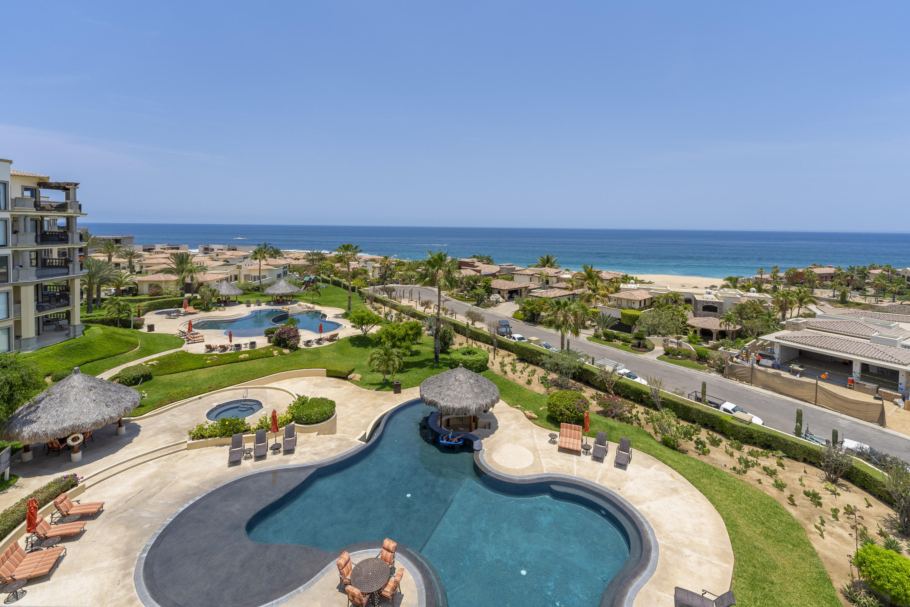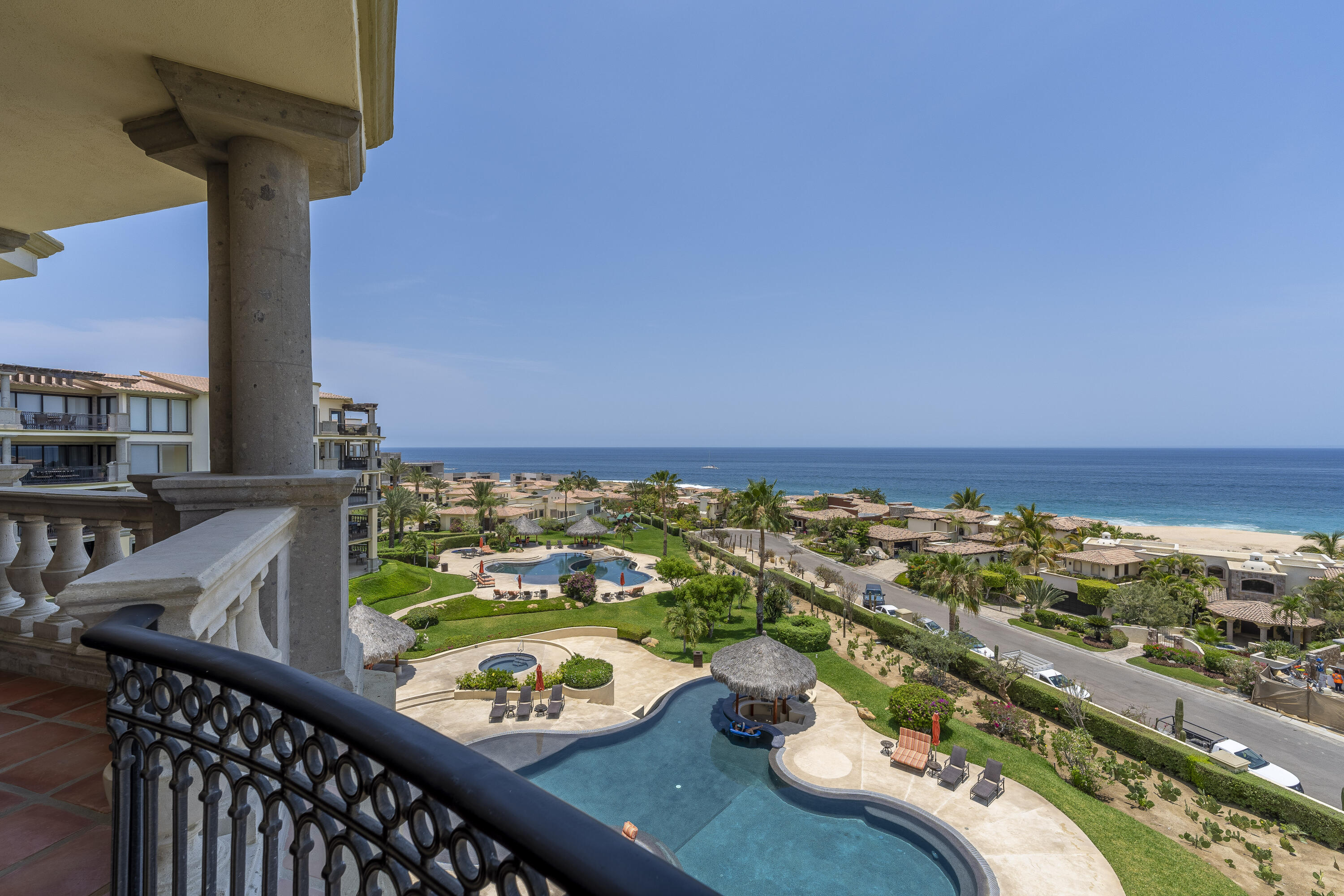 This Lovely 3 Bedroom ocean view home is located in Puerta Del Sol, near the Four Seasons, in the stunning golf resort town of Cabo Del Sol.There are three master suites on this property, each with spacious bathroom and you’ll adore the living room and the vista from the large terrace that overlooks the ocean with BBQ and a jacuzzi.There is a fitness facility, a business center and various pools.The beach is only a few minutes away.This condominium is turn -key and fully furnished with high end furnishings and a single car garage spot assigned to it.This is an excellent full time residence or rental property.