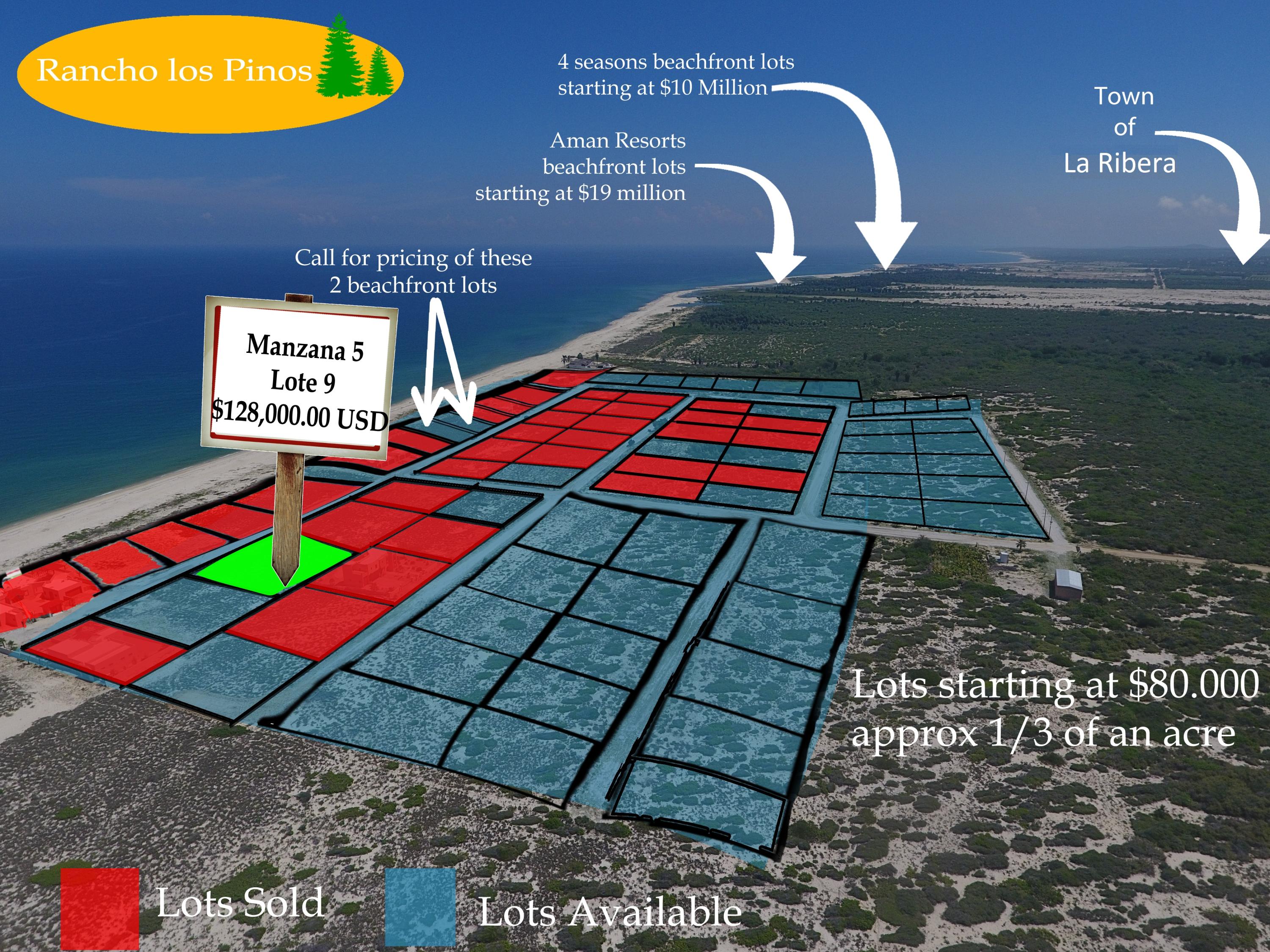 Rancho Los Pinos is one of the best hidden gems of the east Cape. A beautiful master planned community with Power, water, sewer and Internet! Only 1 km on the same Beach as Costa Palmas, the Four Seasons and Aman Resorts! The Rest of the inventory in this 80 lot community wont last long. Not at these prices. These are very large quarter acre lots and perfectly flat. 3 beach access trails to one of the nicest swim-able beaches you have ever laid your eyes on. Amen Resorts beach front lots starting at 18 million dollars. Four seasons beach front lots starting at 10 million. We are on the exact same beach and no flood zones!!!! This is one investment you will be able to count on!!! Give us a call and pick out your lot!!